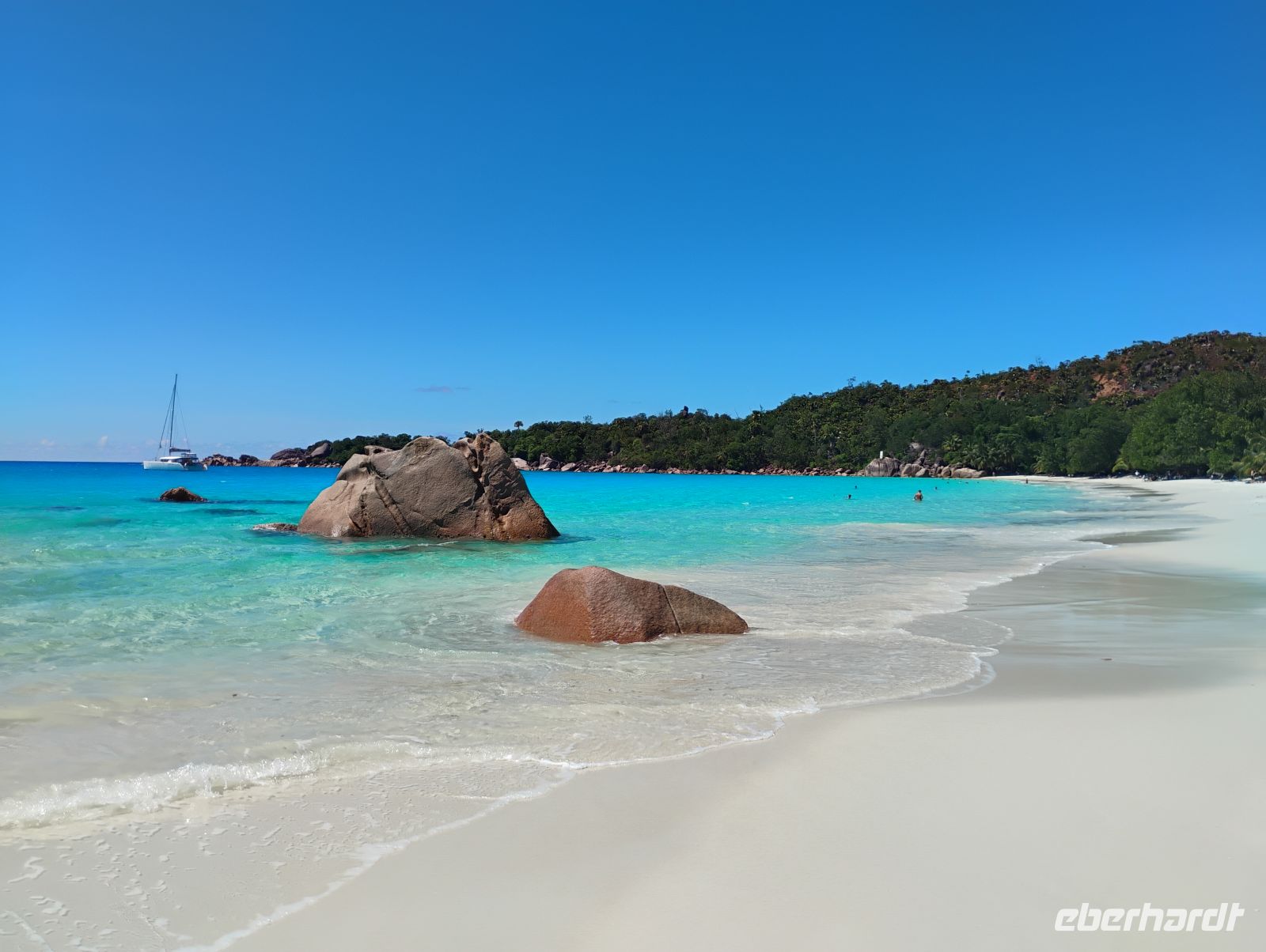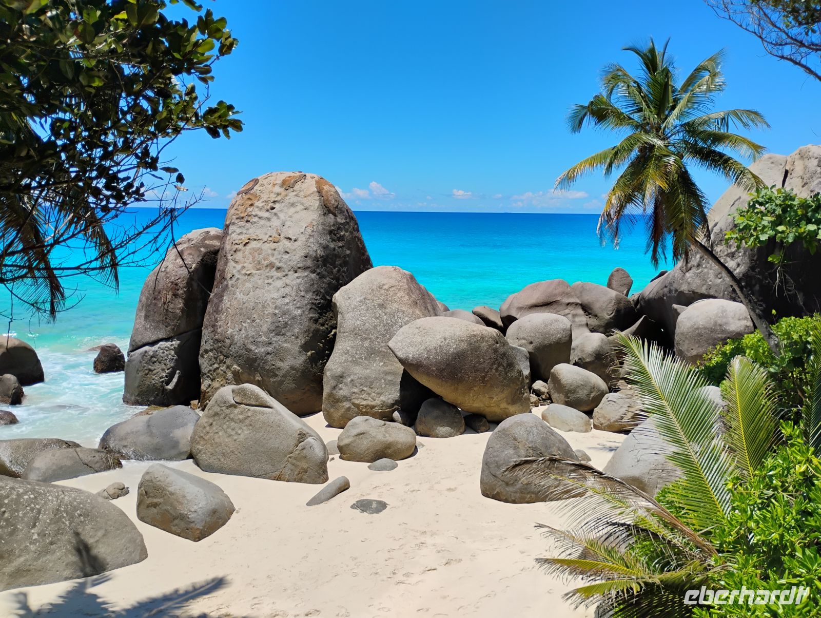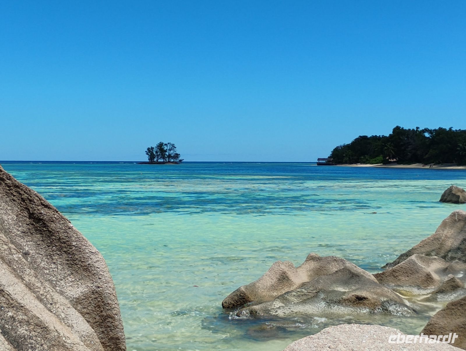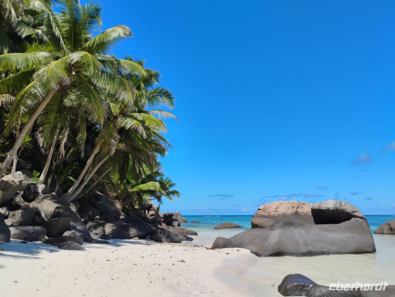 Ganz anders präsentiert sich anschließend der berühmte Anse Source d’Argent. Mit seinen bizarren Granitfelsen, dem hellen Sand und dem flachen Wasser gehört er zu den bekanntesten Stränden der Welt und ist eines der meistfotografierten Motive der Seychellen. Auch wenn das Wasser heute nicht ideal zum Baden oder Schnorcheln ist, begeistert die einzigartige Kulisse.