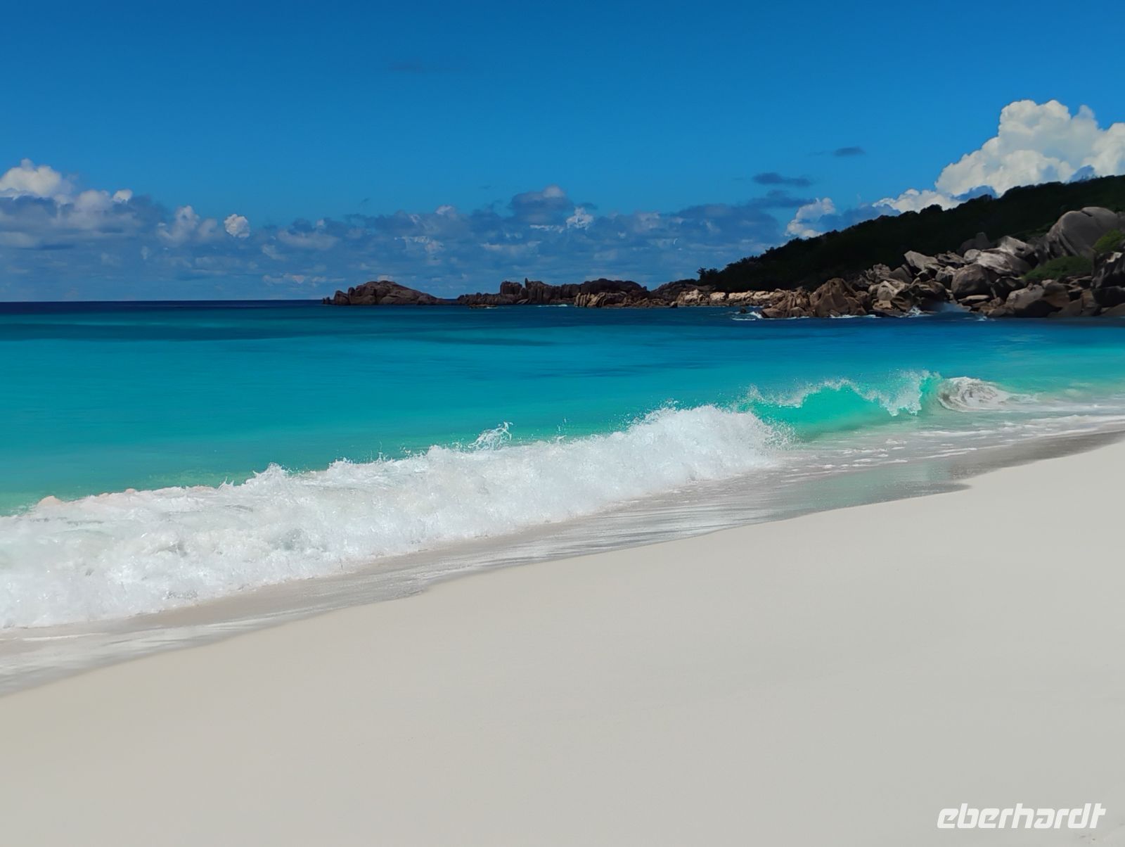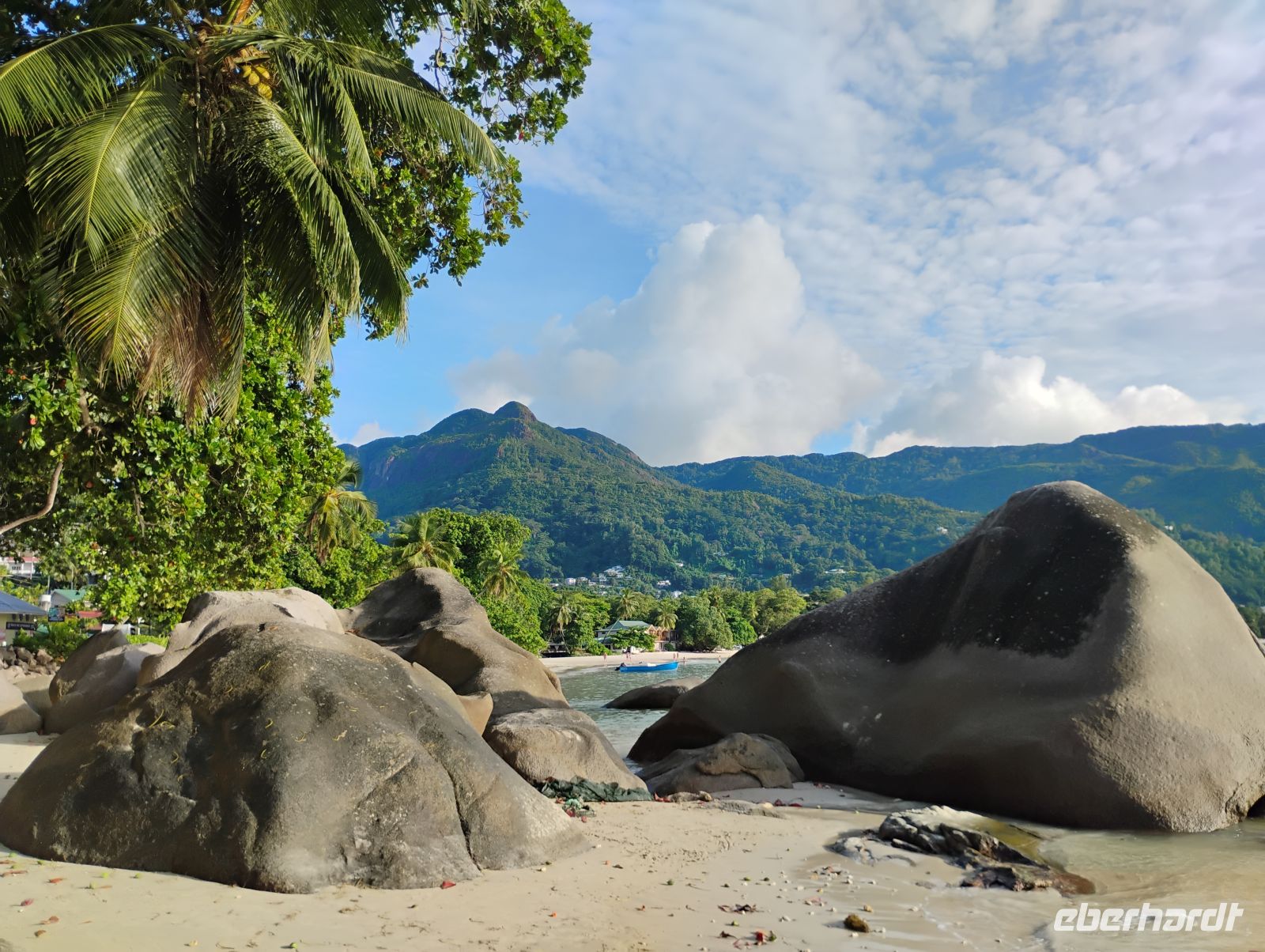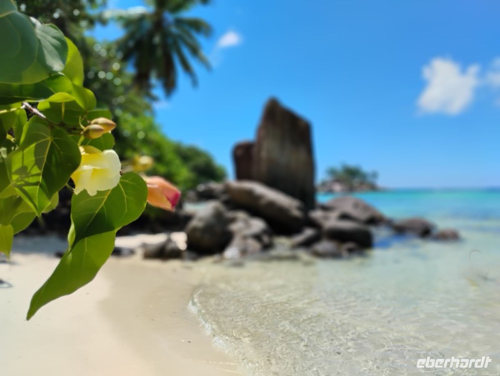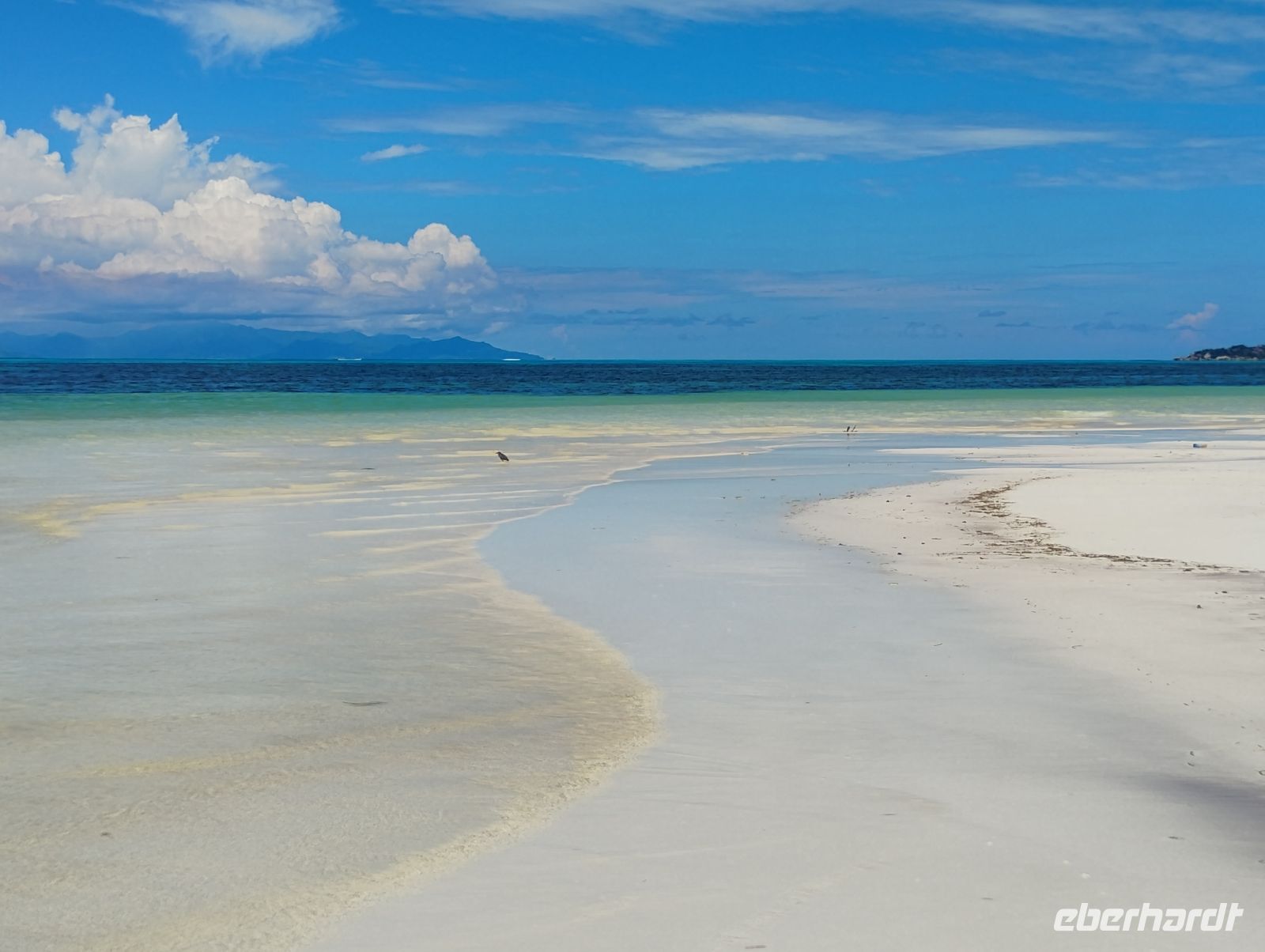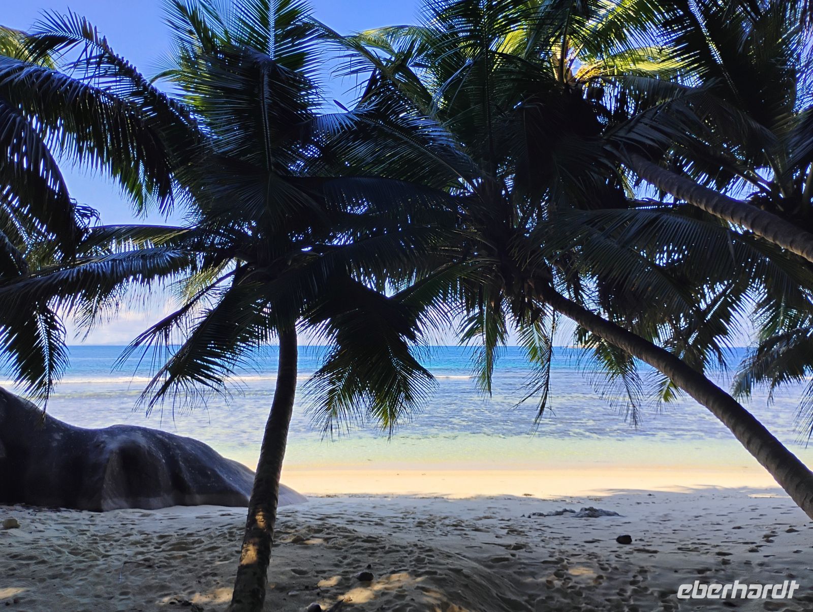 Ganz anders präsentiert sich anschließend der berühmte Anse Source d’Argent. Mit seinen bizarren Granitfelsen, dem hellen Sand und dem flachen Wasser gehört er zu den bekanntesten Stränden der Welt und ist eines der meistfotografierten Motive der Seychellen. Auch wenn das Wasser heute nicht ideal zum Baden oder Schnorcheln ist, begeistert die einzigartige Kulisse.