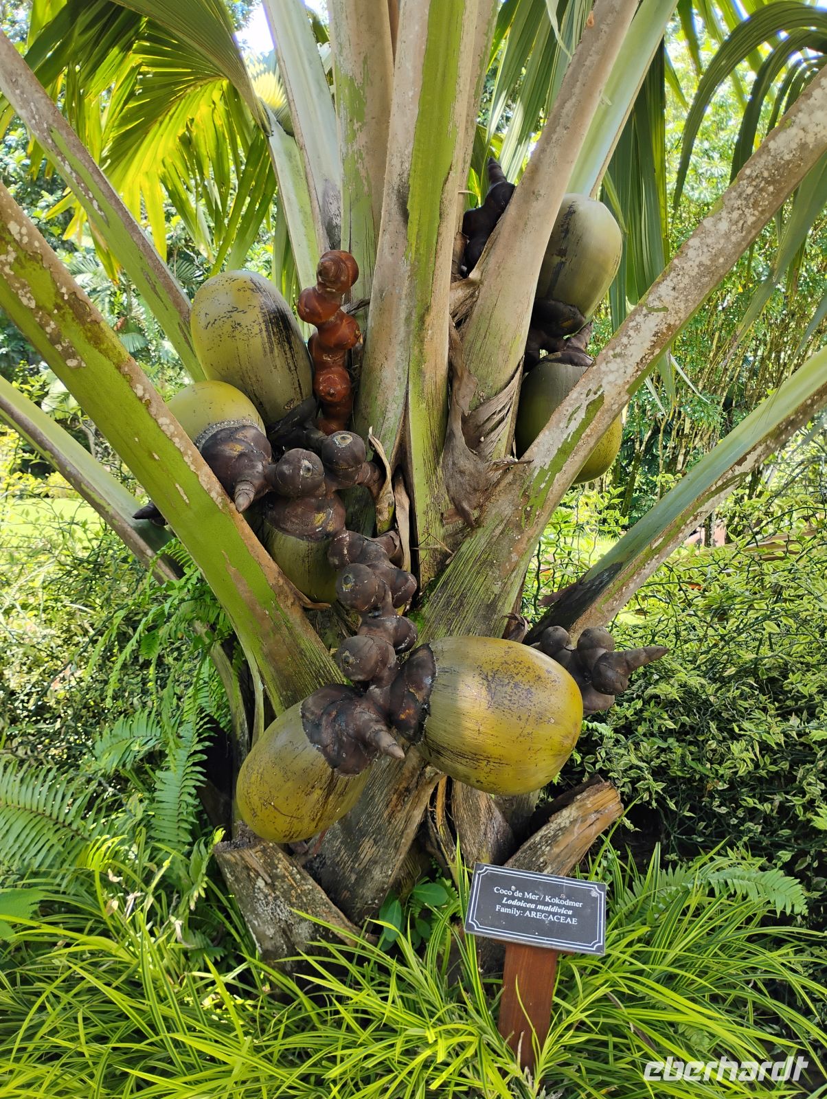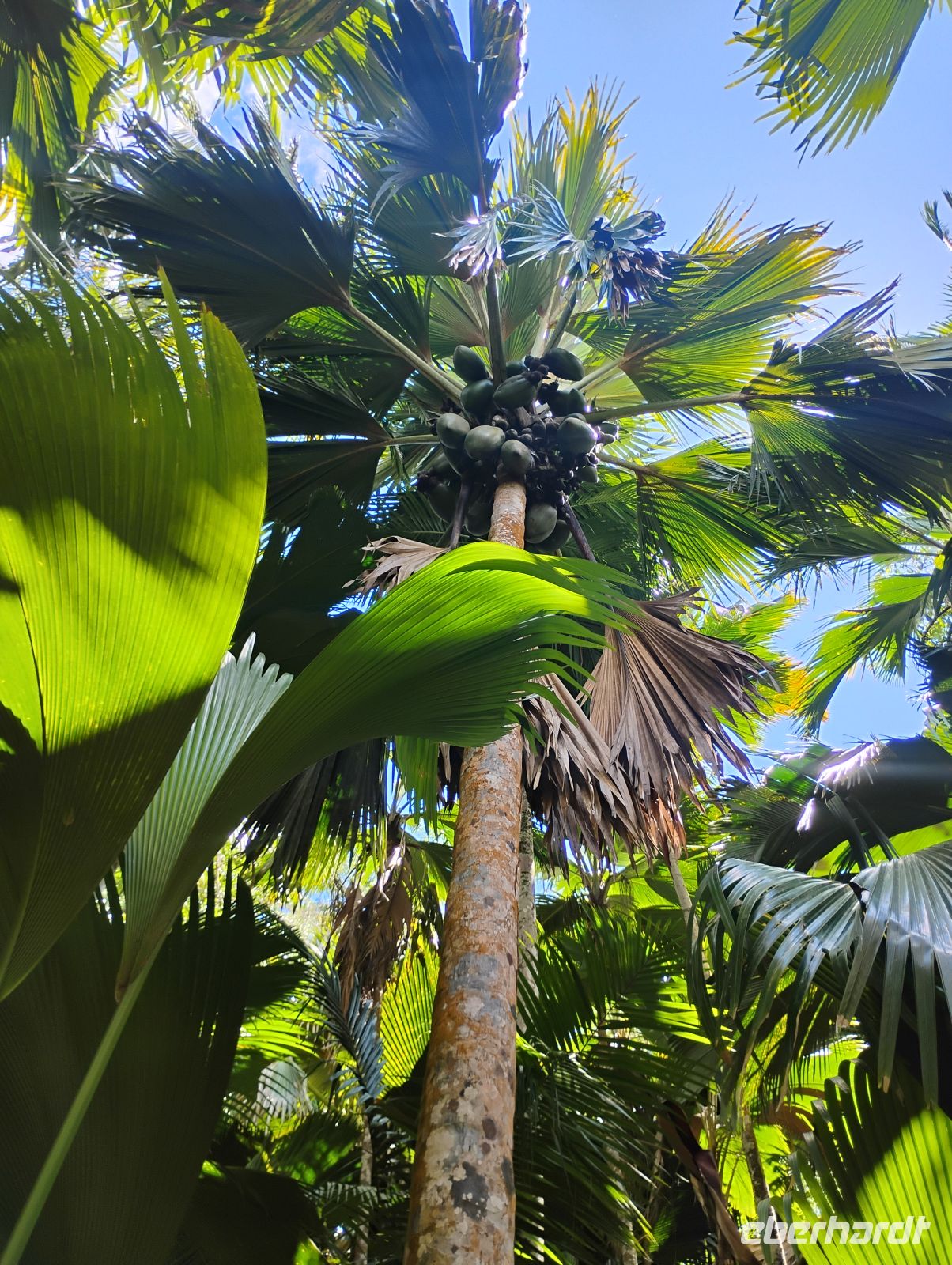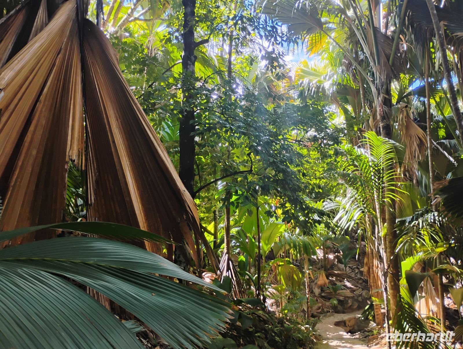 Im Nationalpark angekommen, tauchen wir ein in einen urzeitlich wirkenden Palmenwald. Hier wächst die berühmte Coco de Mer, deren riesige Doppelnüsse zu den größten Samen der Welt gehören. Die Palmen wachsen sehr langsam, oft entsteht nur ein neues Blatt pro Jahr, sodass man ihr Alter an den Blättern ablesen kann. Die Nüsse sind streng geschützt; nur die Regierung darf sie trocknen und kontrolliert für Souvenirs oder den Export nach Japan freigeben. Während unseres Rundgangs hören wir den seltenen schwarzen Papagei, auch wenn er sich nicht zeigt, und staunen über die gewaltigen Palmblätter, die mehrere Meter lang werden können.