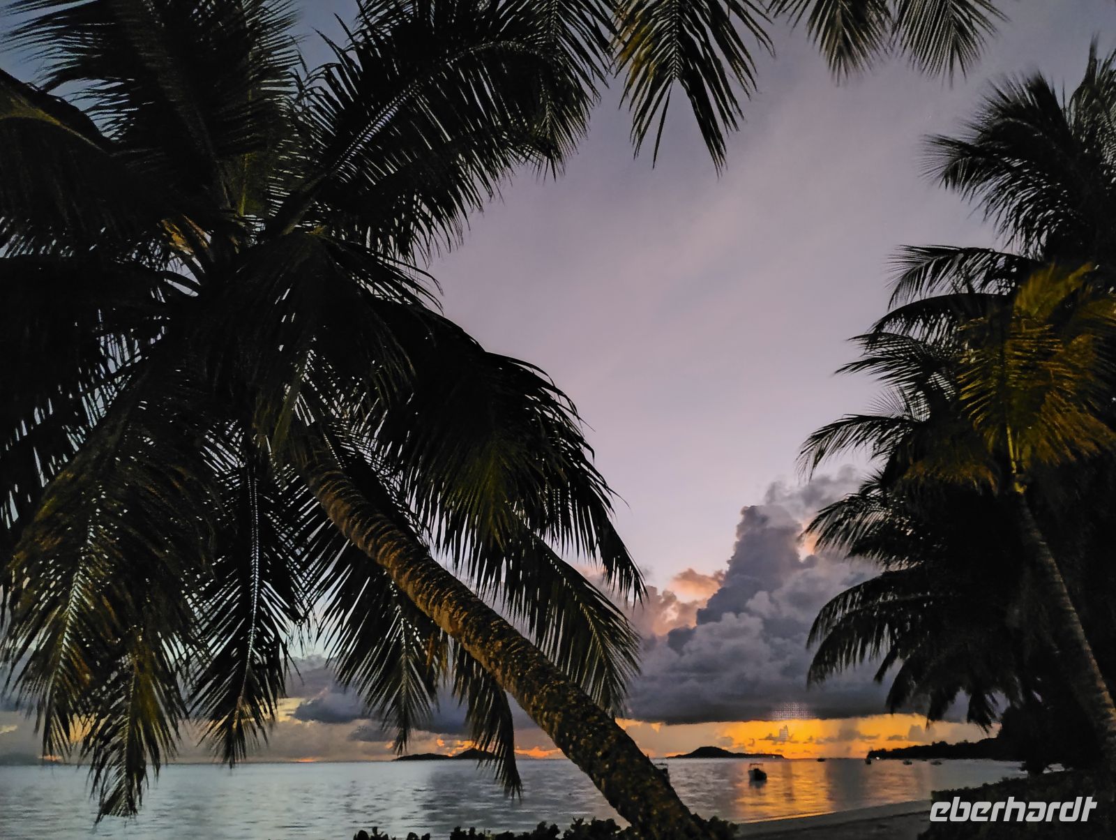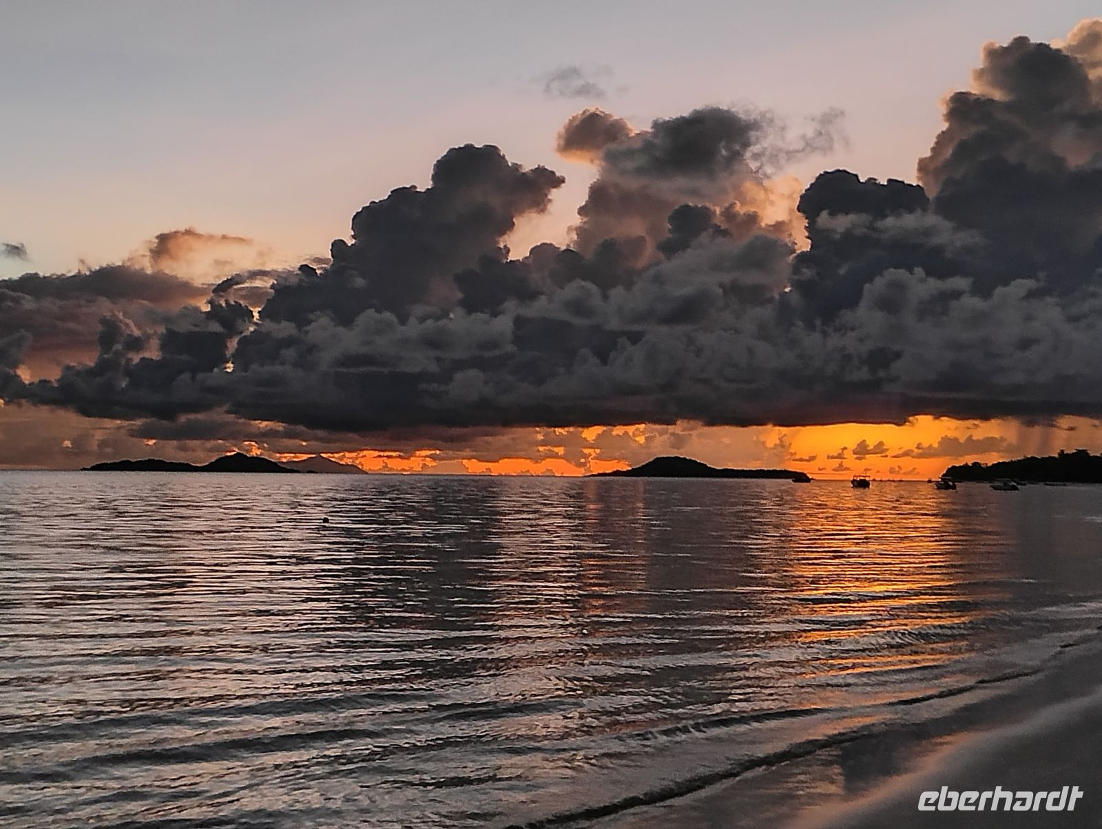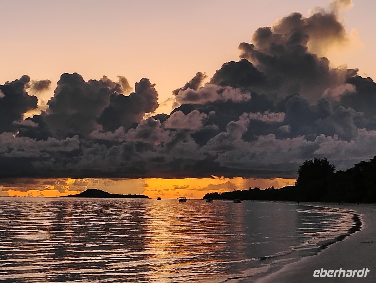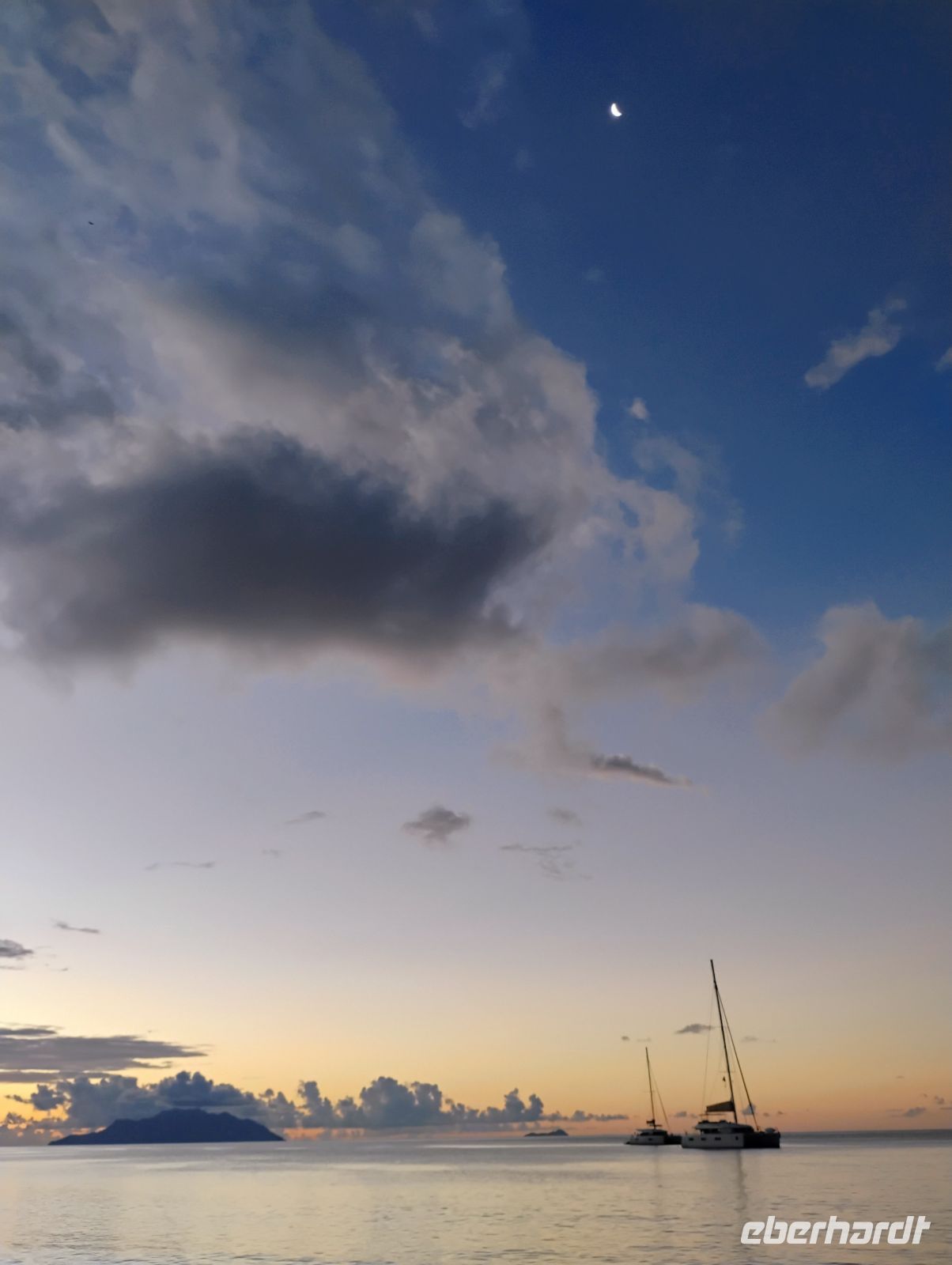Am Abend zieht für kurze Zeit ein Regenschauer über die Insel, sodass die geplanten Fotos vom Sonnenuntergang leider entfallen. Wir treffen uns zum gemeinsamen Abendessen und lassen den ersten Tag auf den Seychellen entspannt ausklingen.
