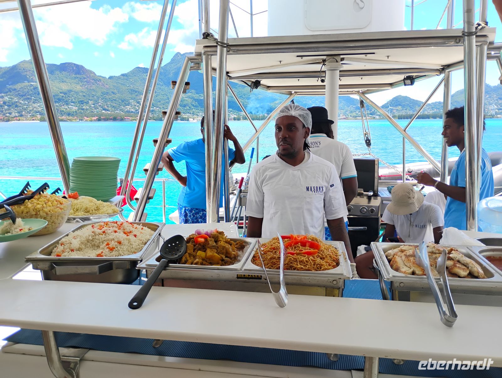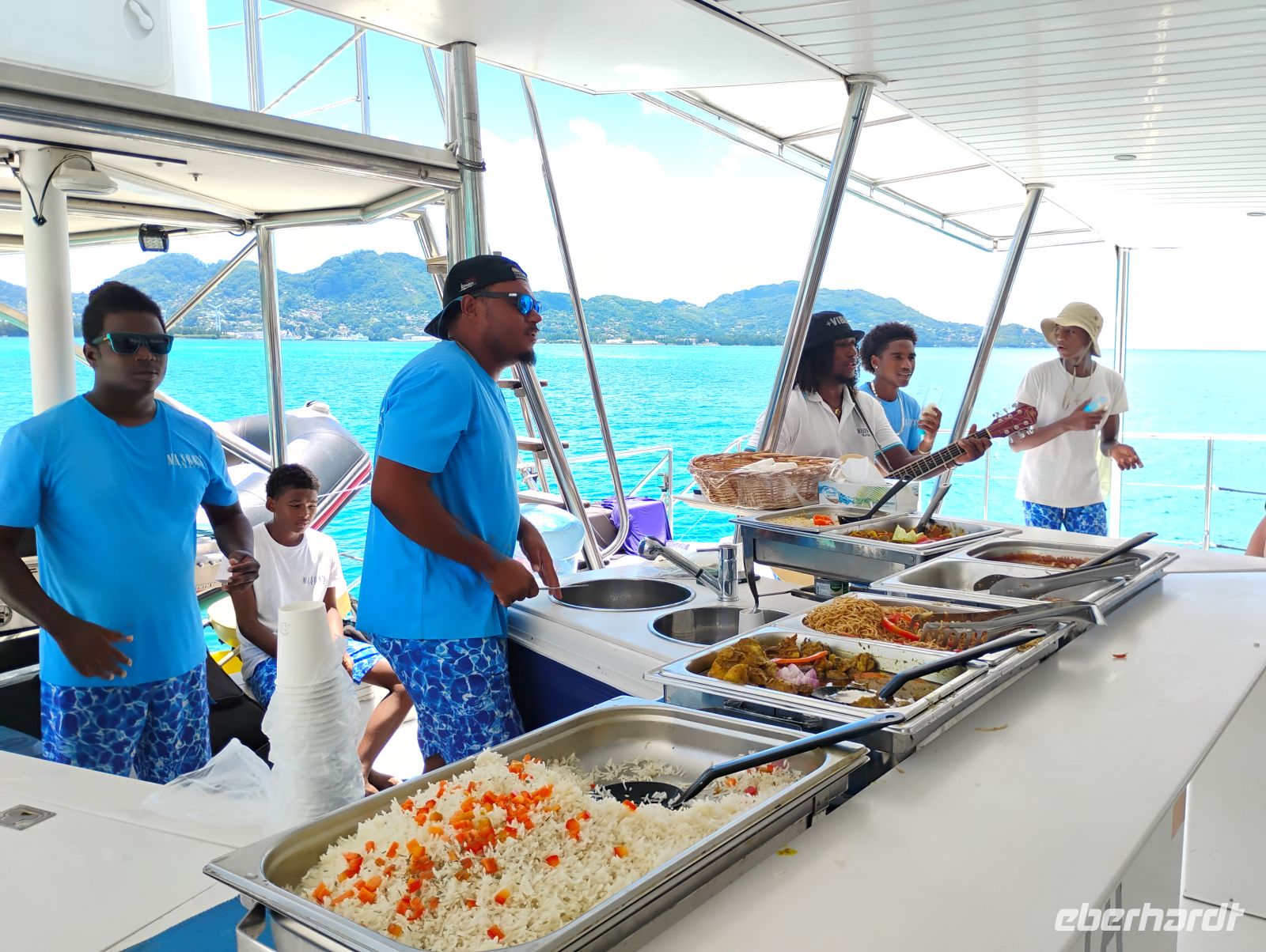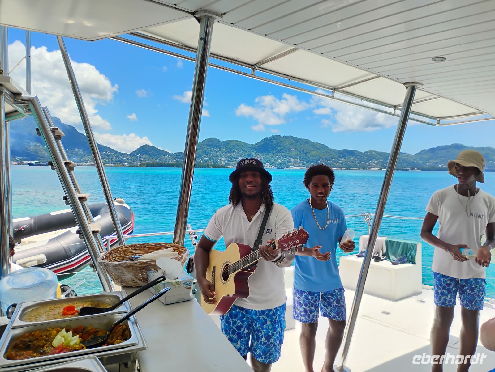 Zur Mittagszeit genießen wir ein kreolisches Essen an Bord, begleitet von Live-Musik der Crew, eine wunderbar entspannte Atmosphäre mitten im türkisblauen Meer.