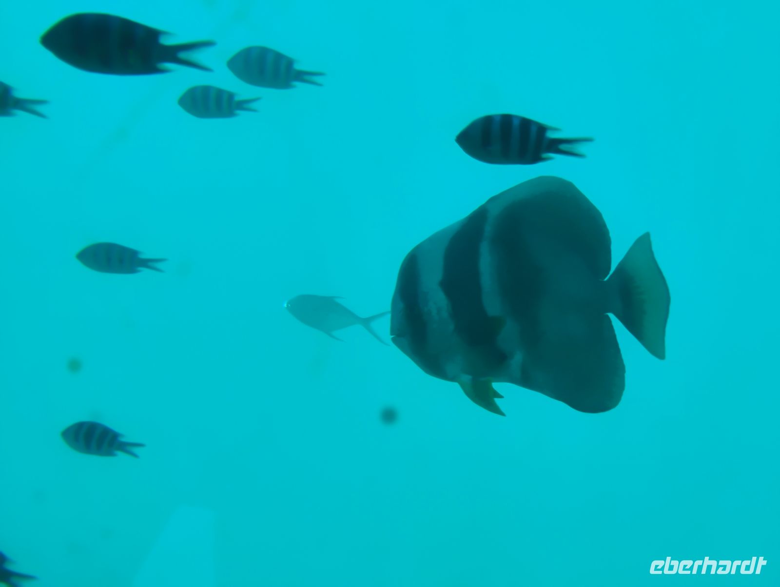 Während der Fahrt genießen wir den Blick auf die umliegenden Inseln, bevor wir in ein Glasbodenboot umsteigen, mit dem wir die Unterwasserwelt erkunden. Durch das klare Wasser entdecken wir verschiedene tropische Fischarten wie Papageienfische, Zebrafische und Batfische sowie unterschiedliche Korallenformationen.