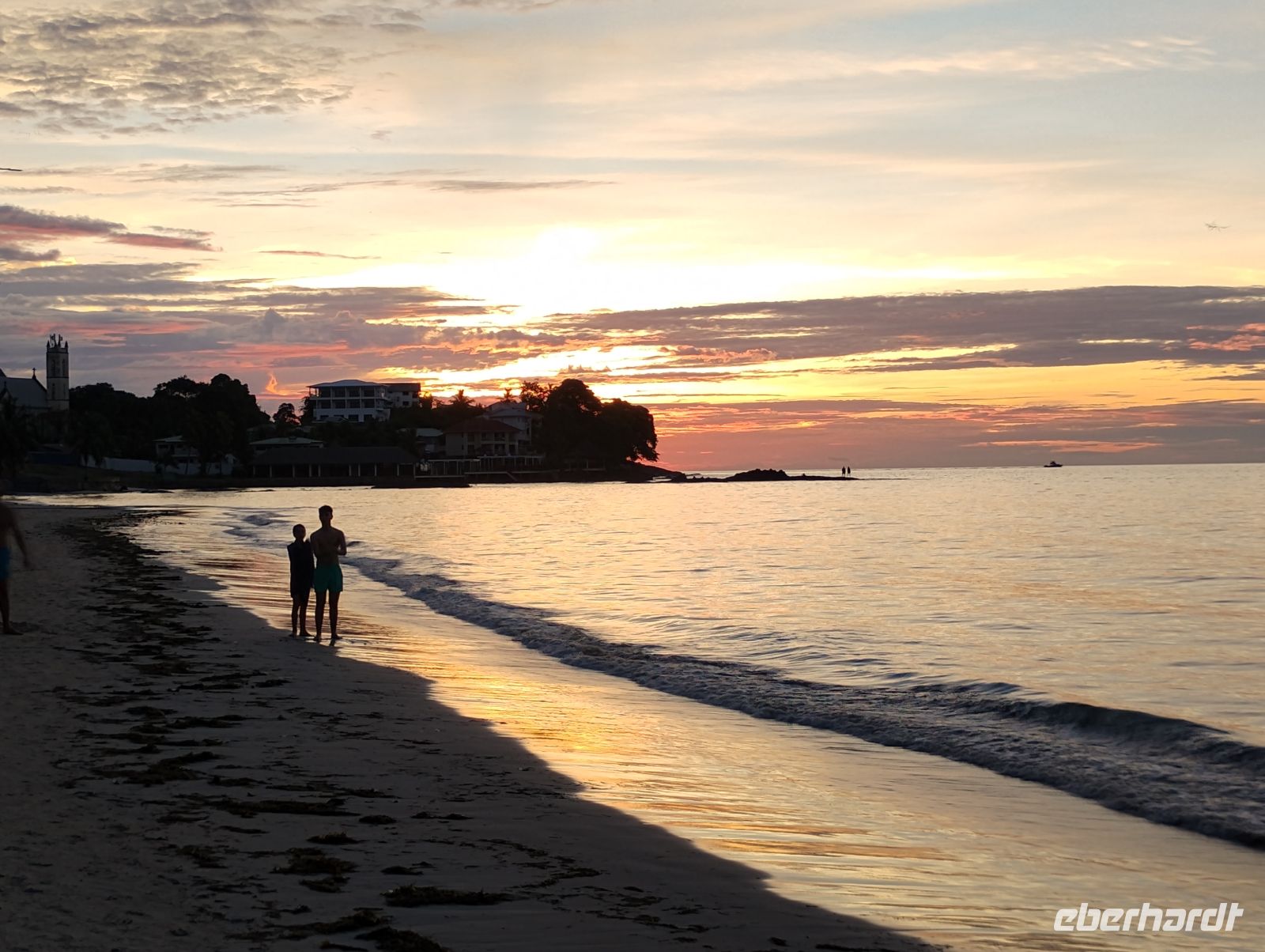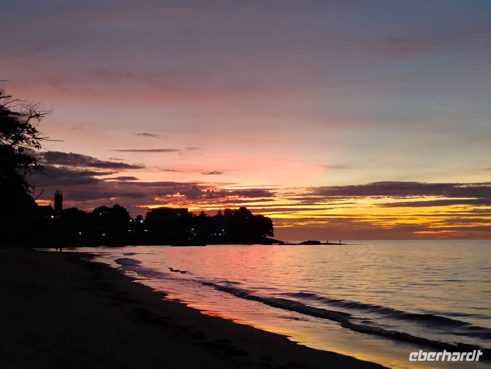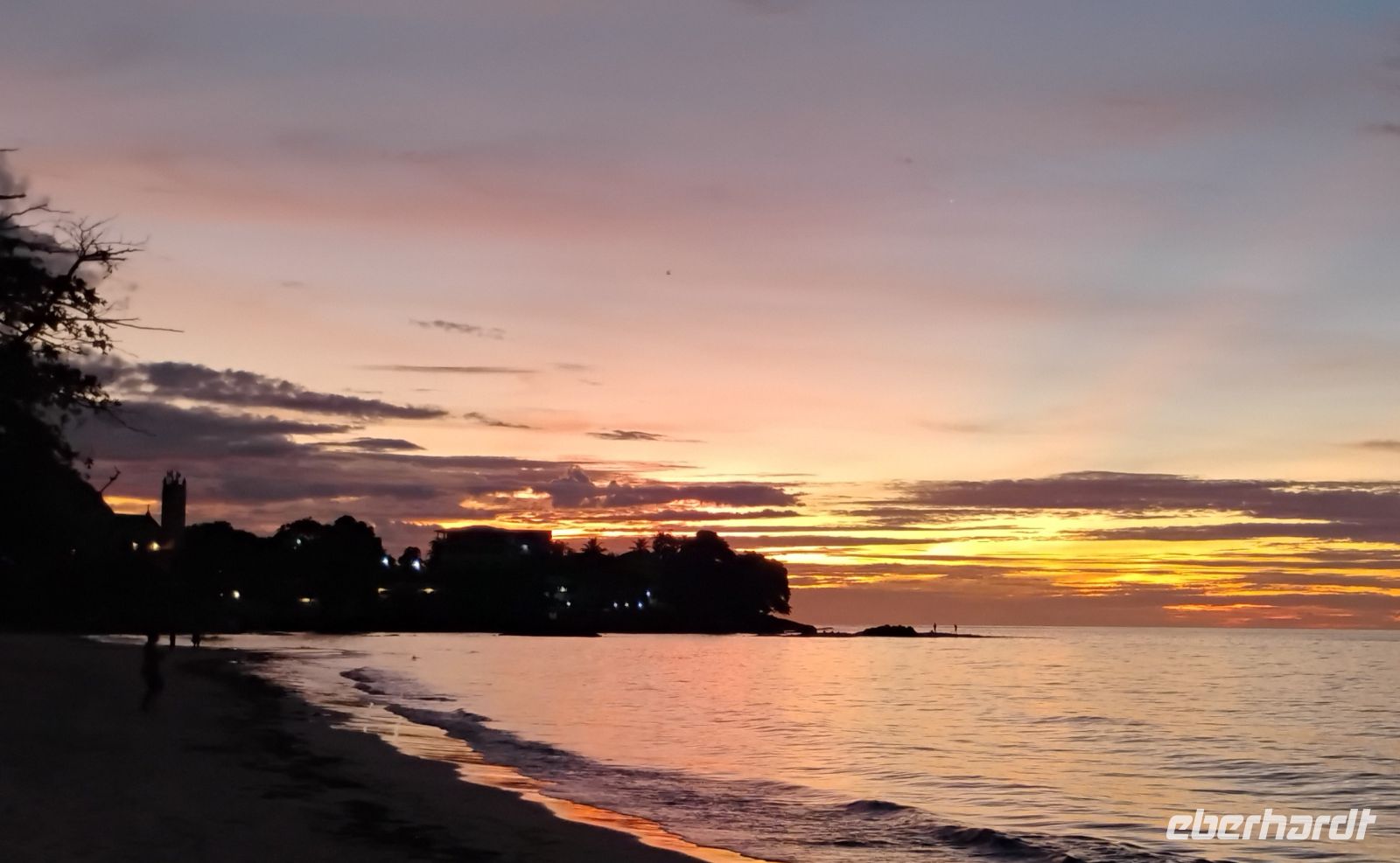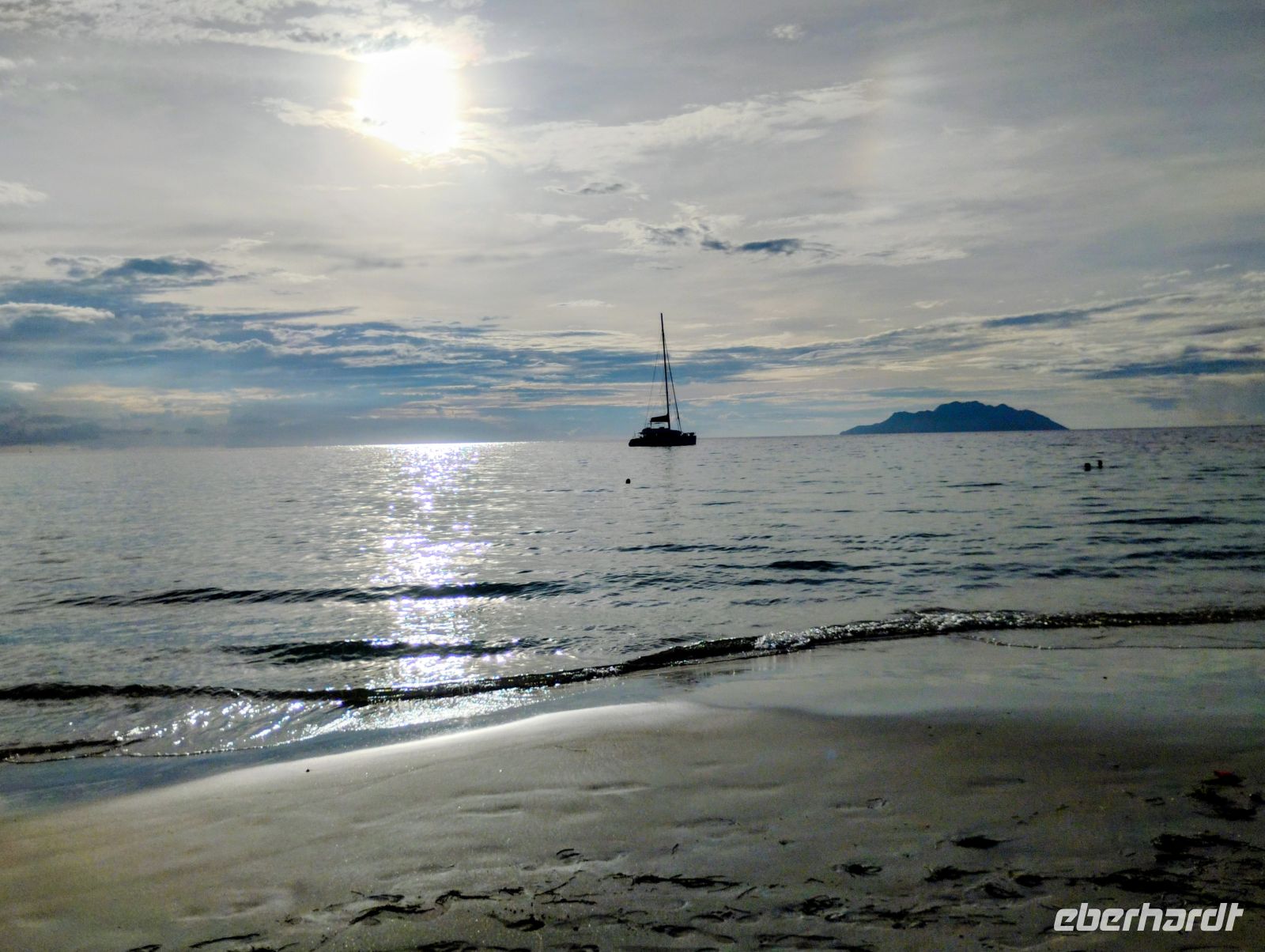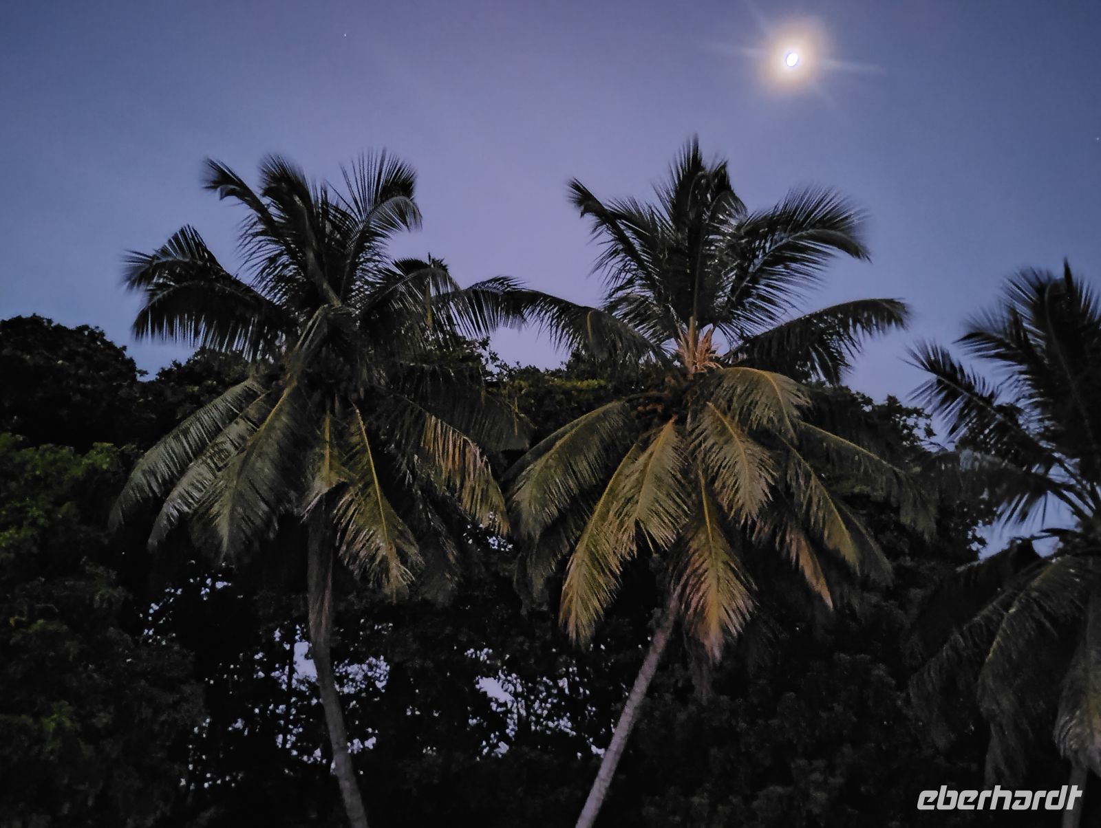 Am Abend lade ich zu einem gemeinsamen Umtrunk ein und wir treffen uns am Strand zu einem Takamaka-Rum. Passend dazu erleben wir einen besonders schönen Sonnenuntergang: Der Himmel färbt sich in warmen Orange- und Rottönen, während große Flughunde darüber hinwegziehen und der Mond bereits am Himmel steht.