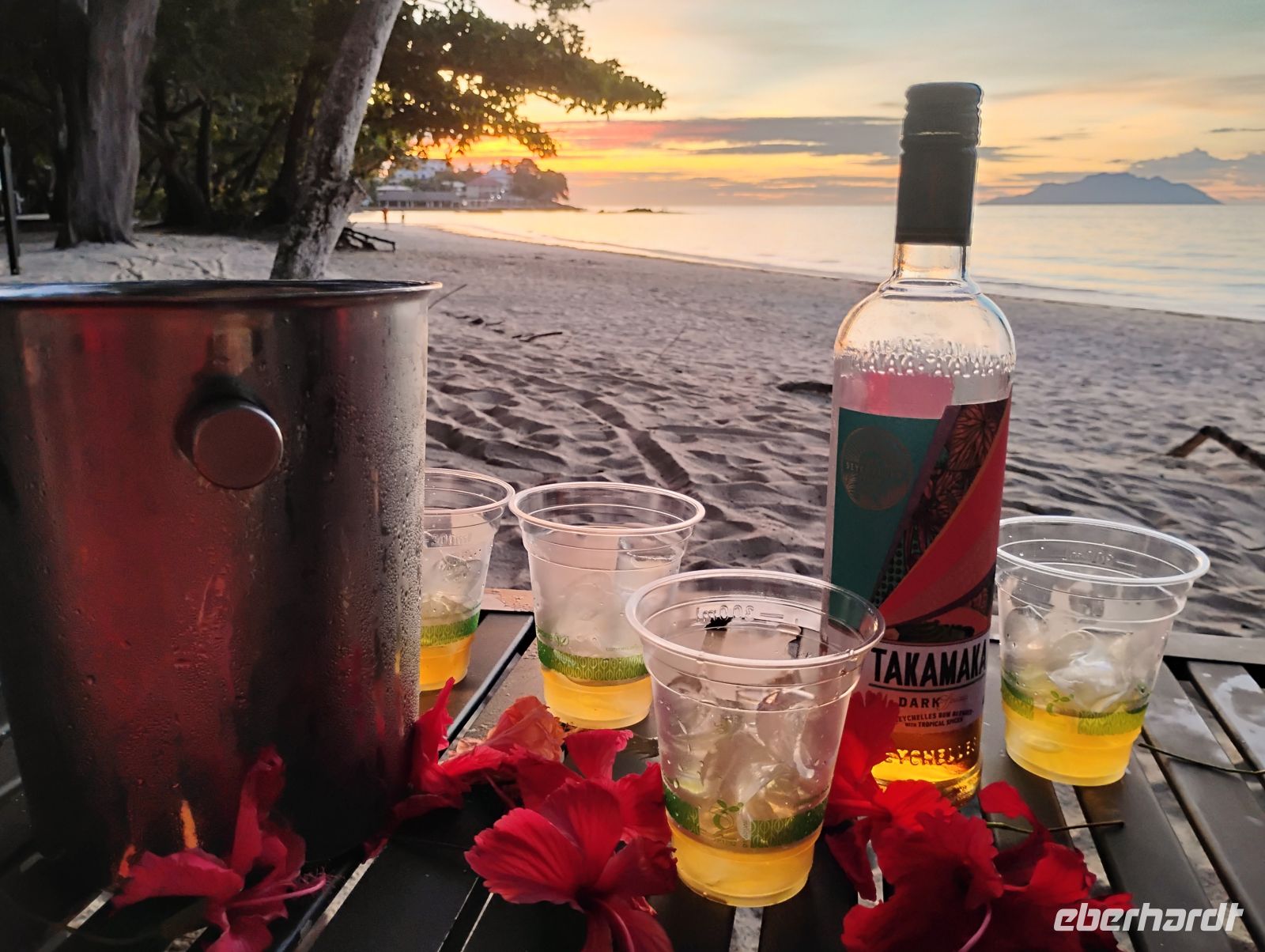 Zurück im Hotel treffen wir uns am Abend noch einmal gemeinsam am Strand. Ich habe noch eine Flasche Takamaka-Rum im Rucksack- diesmal mit Kokosgeschmack - und bei einem kleinen Umtrunk lassen wir den Tag entspannt ausklingen. Dabei verabschieden wir uns auch herzlich von unserem Reiseleiter Cyril.
