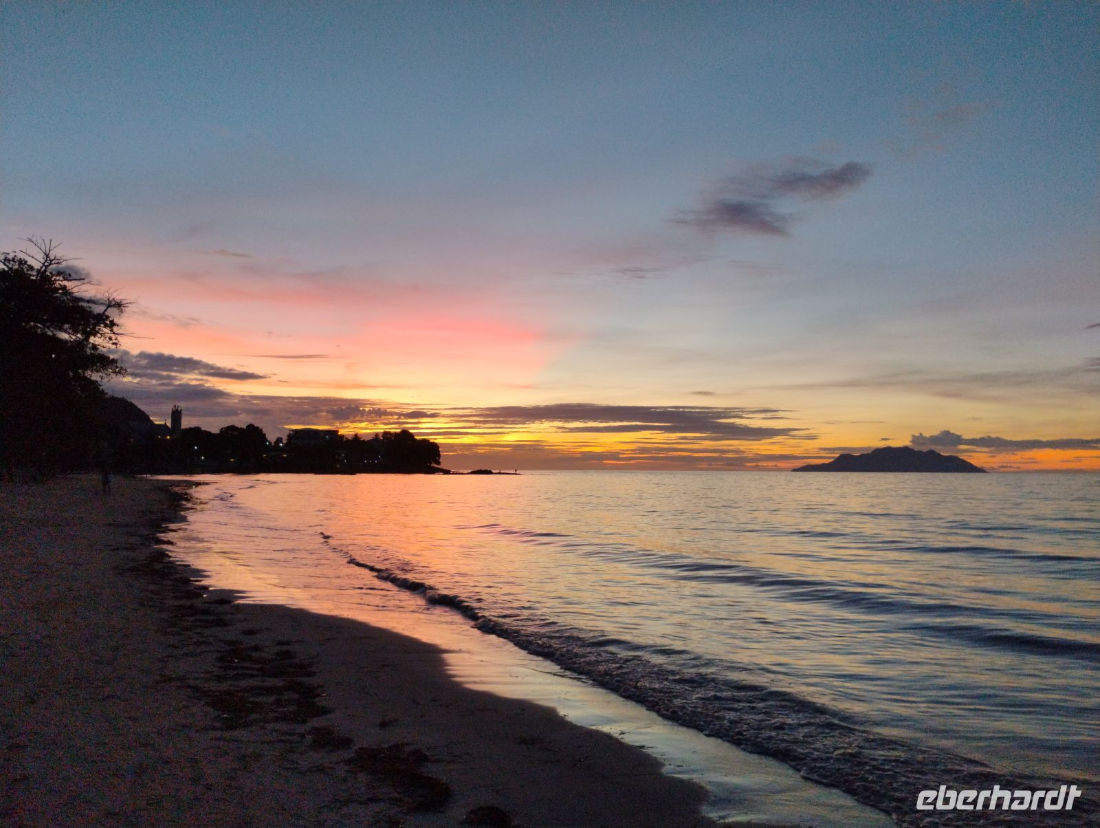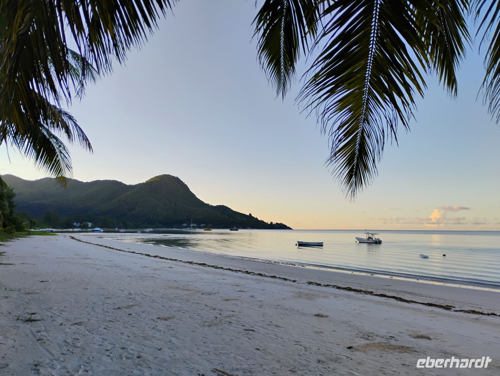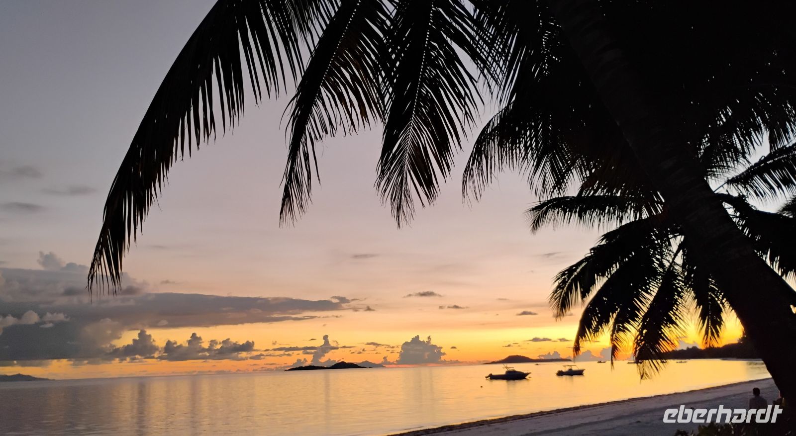 Am frühen Abend kommen wir auf Praslin an, nehmen unser Gepäck entgegen und fahren weiter zu unserem Hotel. Beim Einchecken werden wir von einem besonders schönen Sonnenuntergang begleitet.
