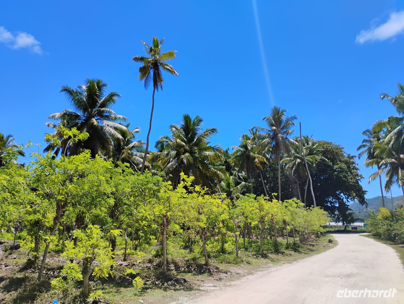 Am Vormittag starten wir zu unserem Ausflug in den Vallée de Mai Nationalpark. Auf der Fahrt erzählt uns Cyril einiges über Praslin: mit rund 7.000 Einwohnern ist sie deutlich ruhiger als Mahé und bekannt für ihre einzigartige Natur. Zudem erfahren wir mehr über den Alltag auf den Seychellen: Frauen nehmen hier eine sehr starke Rolle in der Gesellschaft ein, ob im Berufsleben oder in der Politik. Sie prägen vielerorts das Leben und treten dabei sehr selbstbewusst auf.