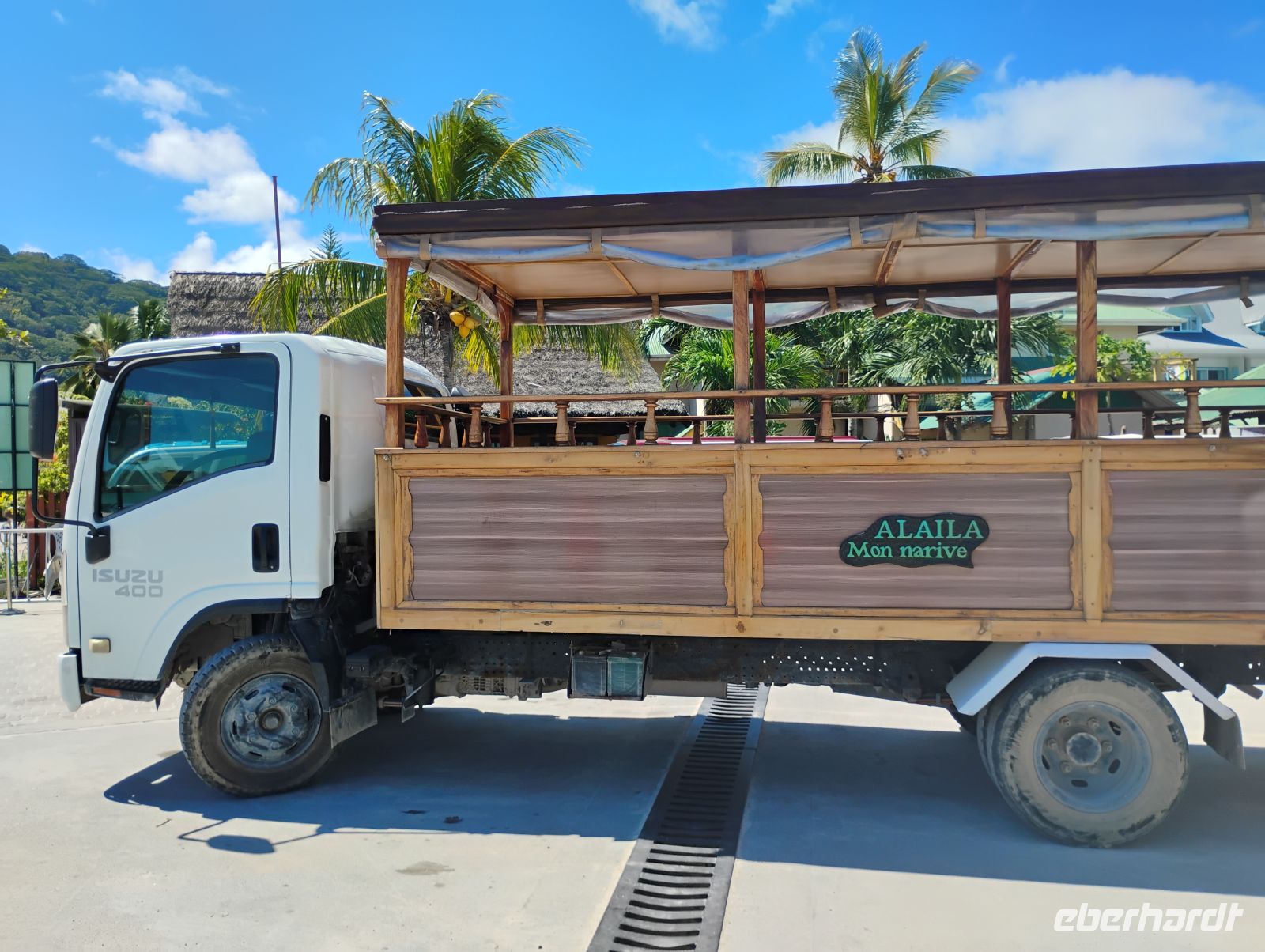 Unsere Erkundung beginnt mit einer Fahrt über die Insel. Dazu steigen wir in einen umgebauten LKW. Die Fahrt ist zwar etwas wackelig, aber gerade das macht den Reiz aus. Wir spüren den Fahrtwind und genießen die Ausblicke, immer wieder unterbrochen von Fotostopps, unter anderem am höchsten Punkt der Insel, dem Nid d’Aigle.