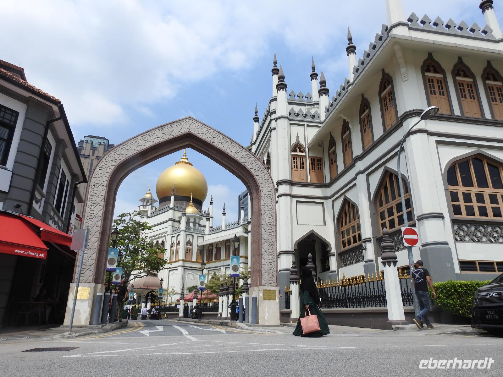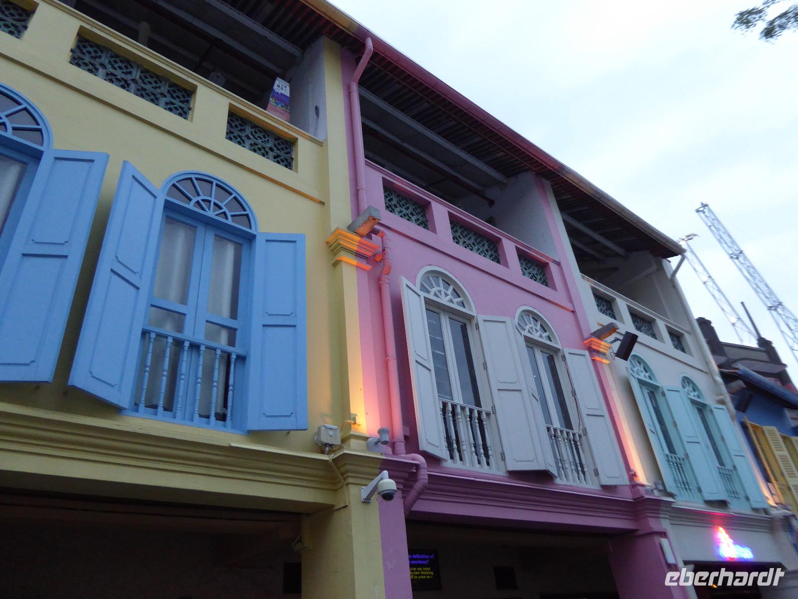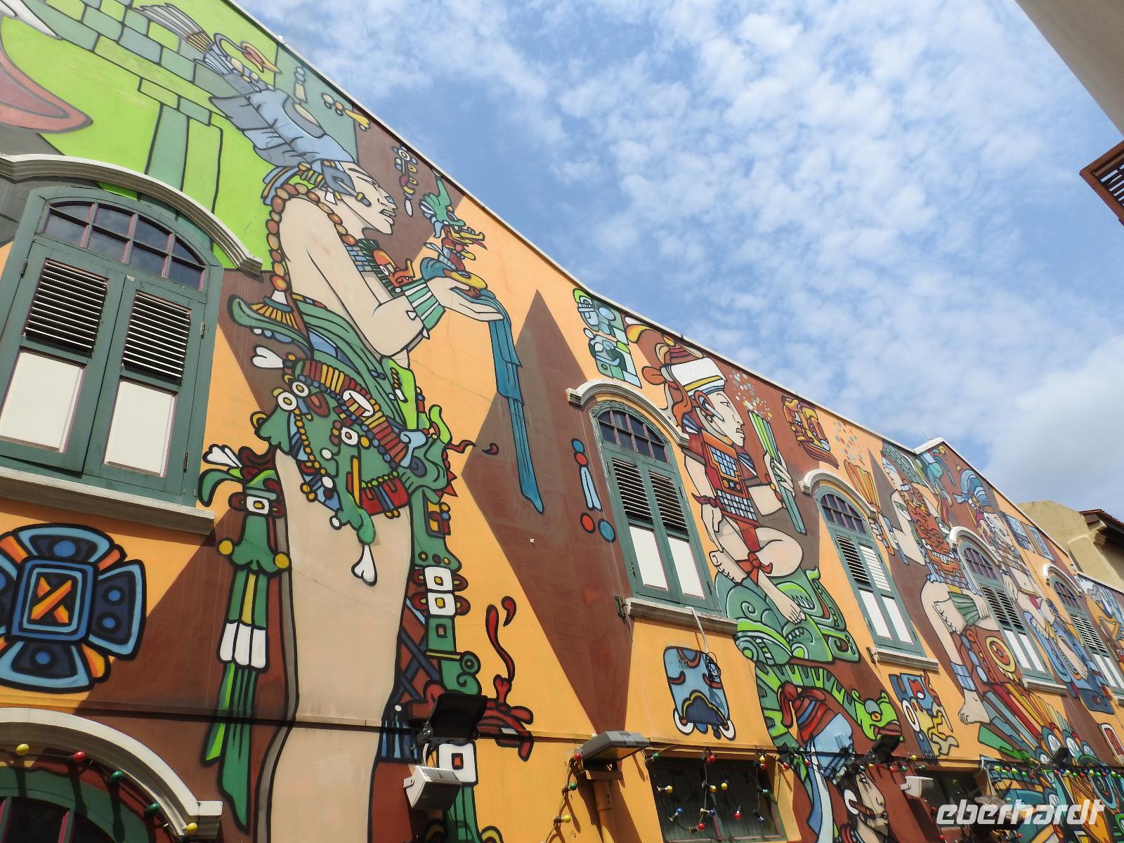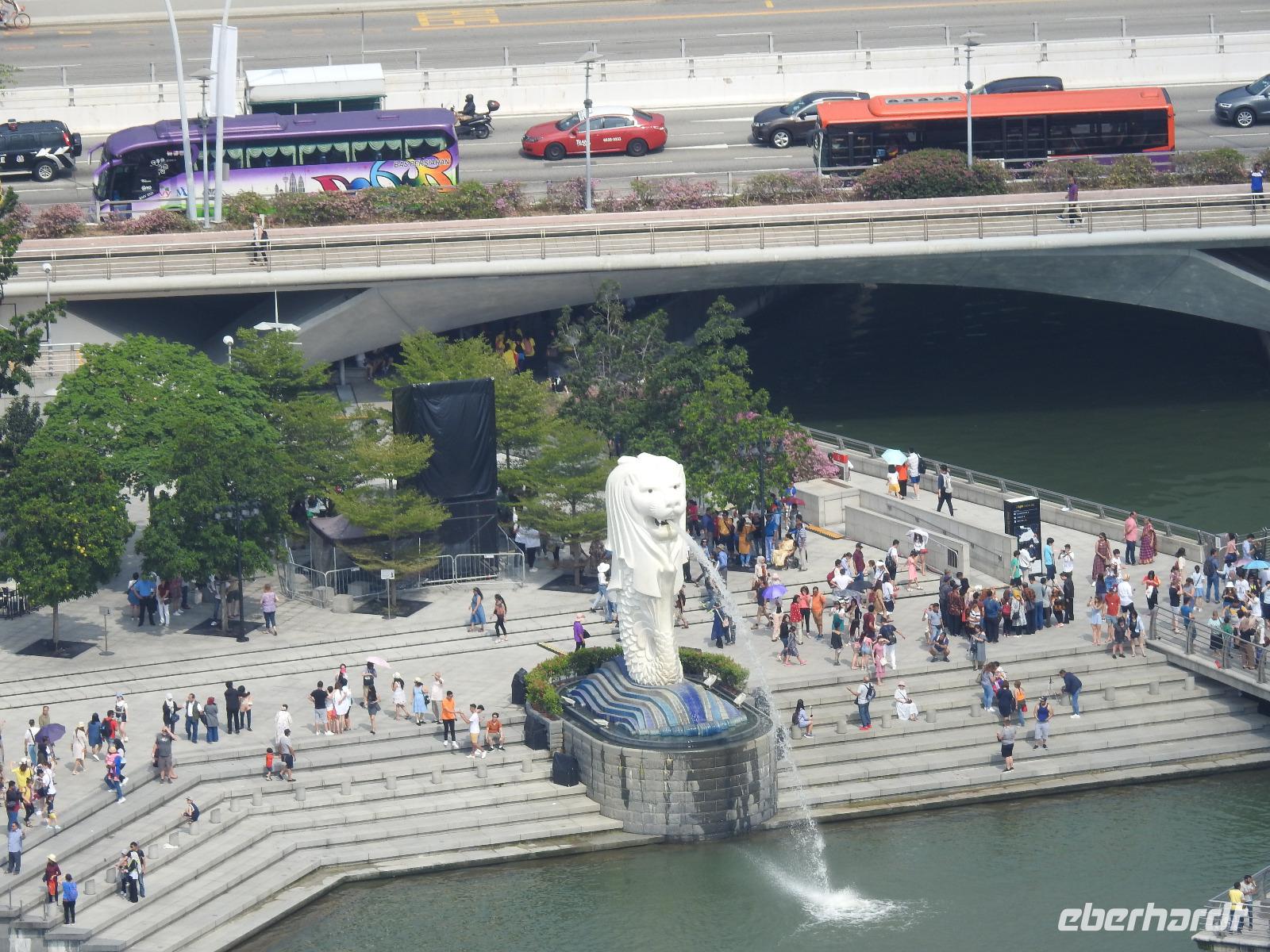 Pünktlich um Zehn holt uns David zur Stadtbesichtigung ab. Habt ihr gestern alles gesehen, fragt er. Dann lasst uns heut etwas anderes machen, damit ihr nicht alles doppelt seht. Unser erstes Ziel ist der Sands Skypark. Dieser befindet sich auf dem Dach des Hotels Marina Bay Sands. Von hier aus haben wir eine tolle Aussicht auf Singapur. Allerdings ist es super heiß. David erklärt uns auf allen Seiten, was es zu sehen gibt und dann schnell wieder runter, bevor wir durchgebraten sind. Wir fahren nach Kampong Glam, in das Arabische Viertel. In der bunten Haji Lane (Straße) beginnt unser Rundgang. Die Straße ist schmal und auf beiden Seiten befinden sich quietschbunt angemalte Häuschen. In den meisten sind Restaurants oder Cafés untergebracht, noch aber geschlossen, denn es ist ja vormittags und die Gäste kommen eher abends. In der Arab Street zeigt uns David ein Café, in dem drei Glückssymbole aus verschiedenen Religionen angebracht sind - ein Zeichen für die Offenheit der hiesigen Bewohner - ein Hufeisen, ein türkisches Auge und ein Spiegel von ? - hab ich leider vergessen. Wir spazieren zur Sultan Moschee, deren goldene Kuppel in der Sonne leuchtet. Wir fahren weiter nach Little India. Hier erklärt uns David verschiedene exotische Früchte. Bemerkenswert sind hier die vielen kleinen Läden, in denen säckeweise Gewürze angeboten werden. Wir wundern uns darüber, dass fast nur Männer zu sehen sind, die hier einkaufen, aber auch dafür hat David eine Erklärung. Es sind indische Gastarbeiter, deren Frauen sich noch in der Heimat befinden. Uns erwartet jetzt der Besuch des Orchideen-Gartens. Wie der Name schon sagt, sind hier Orchideen in all ihrer Pracht, in verschiedenen Farben und Formen zu bewundern. Ein Teil des Gartens ist V(ery) I(mportend) P(erson)s gewidmet. Hier hat unsere Angie eine Blume, und auch Lady Di, und viele andere bekannte Personen. Nun besuchen wir Chinatown. Da uns gestern das einheimische Geld ausgegangen ist, wollen wir hier noch einmal tauschen. Kein Problem, sagt David. Die erste Wechselstube ist geschlossen, die nächste hat nicht genügend Geld vorrätig und die dritte ist nur nach einem anstrengenden Fußmarsch in einem Einkaufszentrum zu finden (so viel zu „kein Problem"), naja, macht nichts, letztendlich sind alle versorgt. Wer möchte, kann jetzt in der Garküche noch einen Happen essen oder an einem der vielen bunten Souvenirstände Andenken einkaufen. Unsere Tour ist beendet und wir fahren zurück zum Hotel. Es ist noch Zeit für eigene Unternehmungen oder zum Mittagsschlaf. Während dessen schauert es heftig. Doch zum Abendspaziergang ist der Regen wieder vorbei. Wir spazieren am Singapur-River entlang und sind nach nicht einmal zehn Minuten am Quay Side Seafood Restaurant. Innerhalb von 25 Minuten sind wir mit einem Fünf-Gänge-Menü durch. Suppe - Prawns - Hühnchen mit Reis aus dem Wok - grünes Gemüse. Zum Schluss eine Obstplatte, von der jeder 2 Stück Melone und 1 Stück Ananas bekommt - genau abgezählt. Das Essen ist ausgezeichnet, die Kellner überaus freundlich - wir sind zwar amüsiert ob der Schnelle, aber dennoch zufrieden. Und so kommt es, dass wir es schaffen, pünktlich zur Lichtshow bei den Gardens of the Bay zu sein. Heute sind wir schlauer und nehmen die U-Bahn. Die Supertrees (Super-Bäume) werden in verschiedenen Farben beleuchtet und dazu erklingt Musik - es ist wunderschön. Nach dem Schauspiel kommen wir gerade recht zu Musik-Licht-Show des Marina Bay Sand Hotels. Beeindruckt verlassen wir die Szene und spazieren nun Richtung Merlion, der uns noch auf unserem Ausflugsprogramm fehlt. So viele Menschen sind heute unterwegs. Bis zum 1. April findet hier ein Festival statt, an dem wir unerwartet teilhaben können. Endlich erreichen wir den Merlion. Auch dieser ist heute Teil des Festivals und wird musikalisch untermalt, angeleuchtet. Wir verweilen einen Moment und stellen fest, dass hier die Geschichte der Welt dargestellt wird. Beeindruckend.