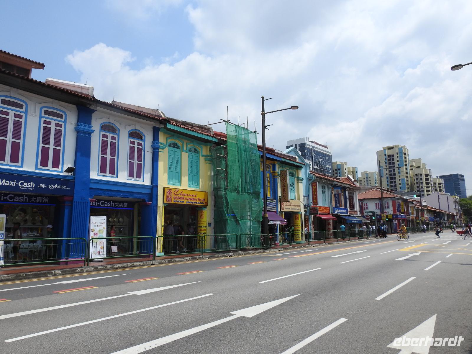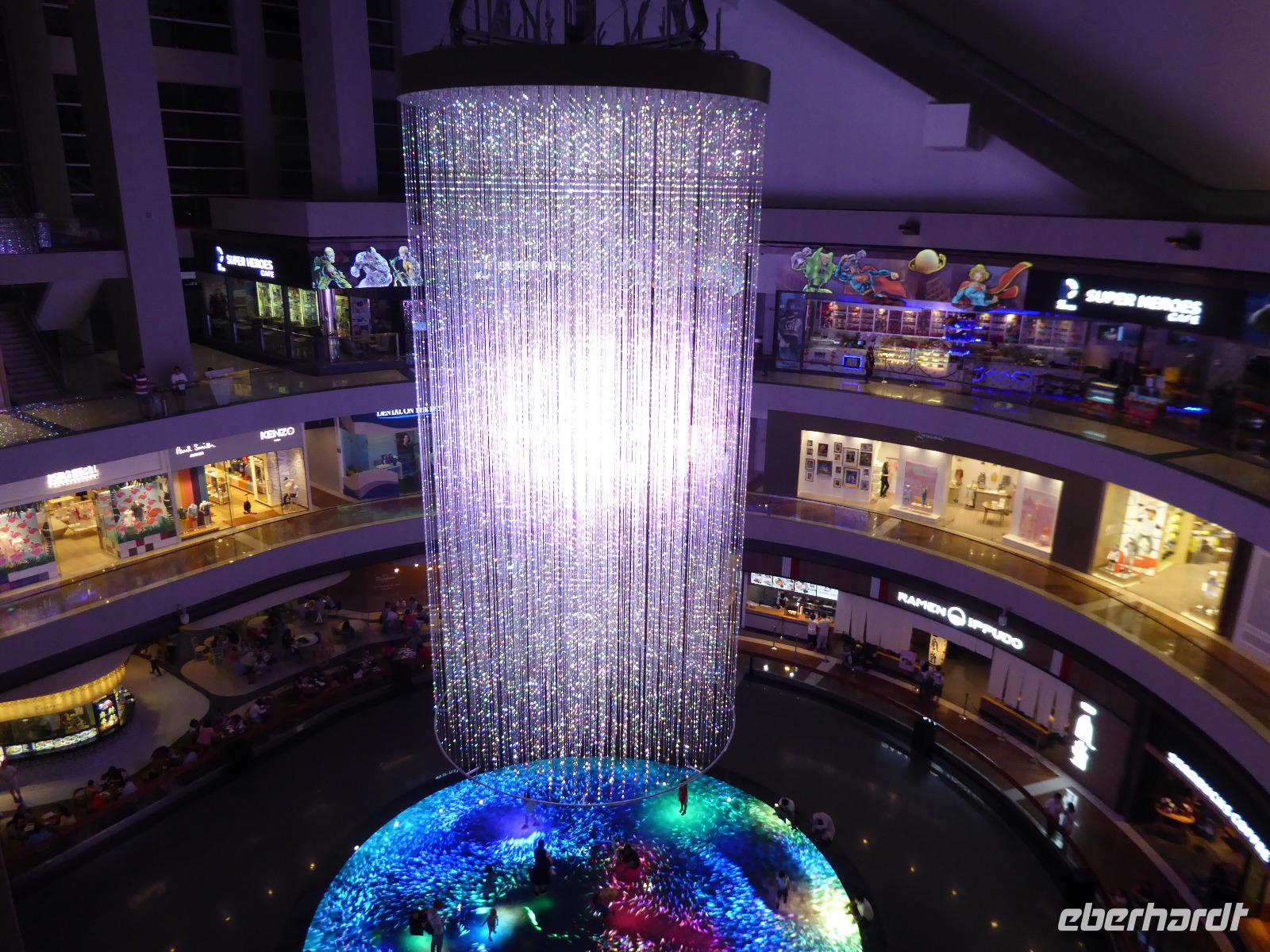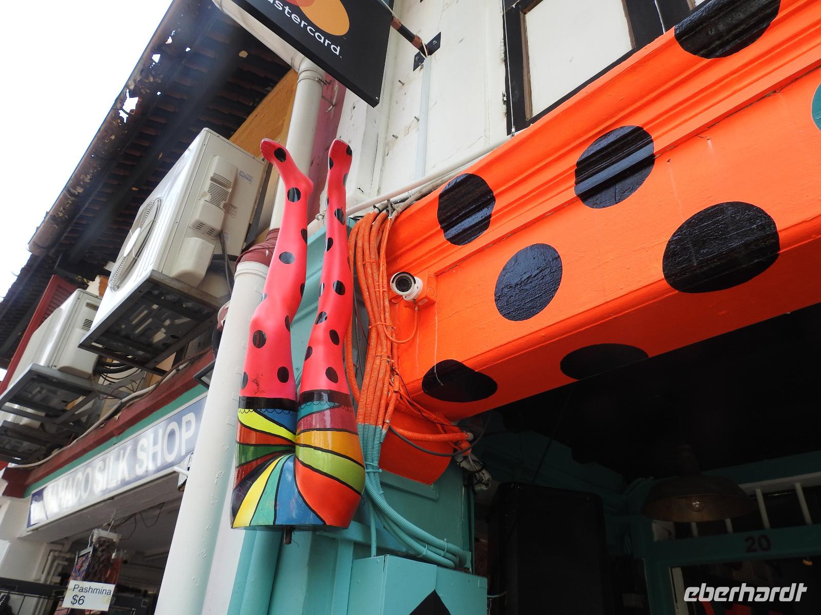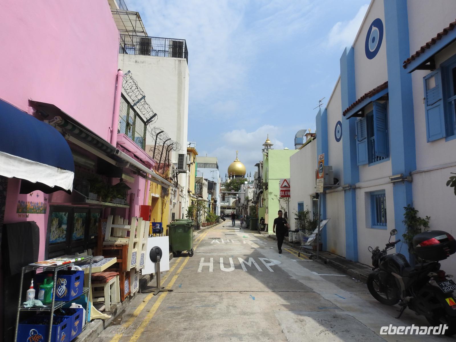 Pünktlich um Zehn holt uns David zur Stadtbesichtigung ab. Habt ihr gestern alles gesehen, fragt er. Dann lasst uns heut etwas anderes machen, damit ihr nicht alles doppelt seht. Unser erstes Ziel ist der Sands Skypark. Dieser befindet sich auf dem Dach des Hotels Marina Bay Sands. Von hier aus haben wir eine tolle Aussicht auf Singapur. Allerdings ist es super heiß. David erklärt uns auf allen Seiten, was es zu sehen gibt und dann schnell wieder runter, bevor wir durchgebraten sind. Wir fahren nach Kampong Glam, in das Arabische Viertel. In der bunten Haji Lane (Straße) beginnt unser Rundgang. Die Straße ist schmal und auf beiden Seiten befinden sich quietschbunt angemalte Häuschen. In den meisten sind Restaurants oder Cafés untergebracht, noch aber geschlossen, denn es ist ja vormittags und die Gäste kommen eher abends. In der Arab Street zeigt uns David ein Café, in dem drei Glückssymbole aus verschiedenen Religionen angebracht sind - ein Zeichen für die Offenheit der hiesigen Bewohner - ein Hufeisen, ein türkisches Auge und ein Spiegel von ? - hab ich leider vergessen. Wir spazieren zur Sultan Moschee, deren goldene Kuppel in der Sonne leuchtet. Wir fahren weiter nach Little India. Hier erklärt uns David verschiedene exotische Früchte. Bemerkenswert sind hier die vielen kleinen Läden, in denen säckeweise Gewürze angeboten werden. Wir wundern uns darüber, dass fast nur Männer zu sehen sind, die hier einkaufen, aber auch dafür hat David eine Erklärung. Es sind indische Gastarbeiter, deren Frauen sich noch in der Heimat befinden. Uns erwartet jetzt der Besuch des Orchideen-Gartens. Wie der Name schon sagt, sind hier Orchideen in all ihrer Pracht, in verschiedenen Farben und Formen zu bewundern. Ein Teil des Gartens ist V(ery) I(mportend) P(erson)s gewidmet. Hier hat unsere Angie eine Blume, und auch Lady Di, und viele andere bekannte Personen. Nun besuchen wir Chinatown. Da uns gestern das einheimische Geld ausgegangen ist, wollen wir hier noch einmal tauschen. Kein Problem, sagt David. Die erste Wechselstube ist geschlossen, die nächste hat nicht genügend Geld vorrätig und die dritte ist nur nach einem anstrengenden Fußmarsch in einem Einkaufszentrum zu finden (so viel zu „kein Problem"), naja, macht nichts, letztendlich sind alle versorgt. Wer möchte, kann jetzt in der Garküche noch einen Happen essen oder an einem der vielen bunten Souvenirstände Andenken einkaufen. Unsere Tour ist beendet und wir fahren zurück zum Hotel. Es ist noch Zeit für eigene Unternehmungen oder zum Mittagsschlaf. Während dessen schauert es heftig. Doch zum Abendspaziergang ist der Regen wieder vorbei. Wir spazieren am Singapur-River entlang und sind nach nicht einmal zehn Minuten am Quay Side Seafood Restaurant. Innerhalb von 25 Minuten sind wir mit einem Fünf-Gänge-Menü durch. Suppe - Prawns - Hühnchen mit Reis aus dem Wok - grünes Gemüse. Zum Schluss eine Obstplatte, von der jeder 2 Stück Melone und 1 Stück Ananas bekommt - genau abgezählt. Das Essen ist ausgezeichnet, die Kellner überaus freundlich - wir sind zwar amüsiert ob der Schnelle, aber dennoch zufrieden. Und so kommt es, dass wir es schaffen, pünktlich zur Lichtshow bei den Gardens of the Bay zu sein. Heute sind wir schlauer und nehmen die U-Bahn. Die Supertrees (Super-Bäume) werden in verschiedenen Farben beleuchtet und dazu erklingt Musik - es ist wunderschön. Nach dem Schauspiel kommen wir gerade recht zu Musik-Licht-Show des Marina Bay Sand Hotels. Beeindruckt verlassen wir die Szene und spazieren nun Richtung Merlion, der uns noch auf unserem Ausflugsprogramm fehlt. So viele Menschen sind heute unterwegs. Bis zum 1. April findet hier ein Festival statt, an dem wir unerwartet teilhaben können. Endlich erreichen wir den Merlion. Auch dieser ist heute Teil des Festivals und wird musikalisch untermalt, angeleuchtet. Wir verweilen einen Moment und stellen fest, dass hier die Geschichte der Welt dargestellt wird. Beeindruckend.