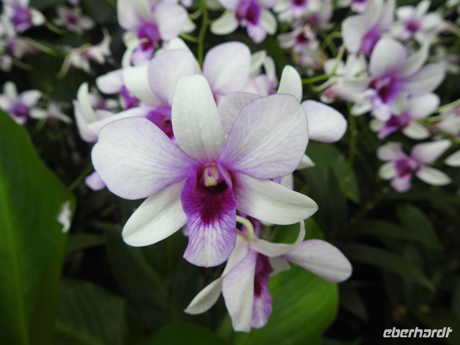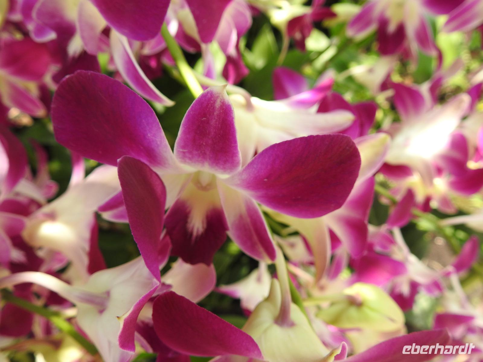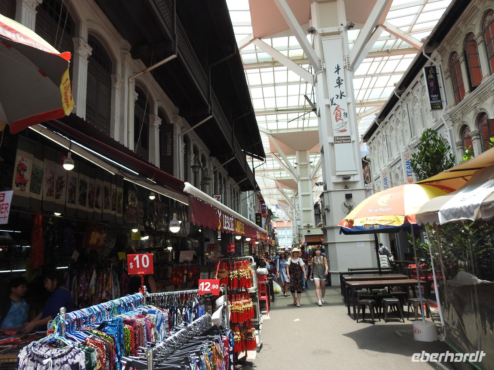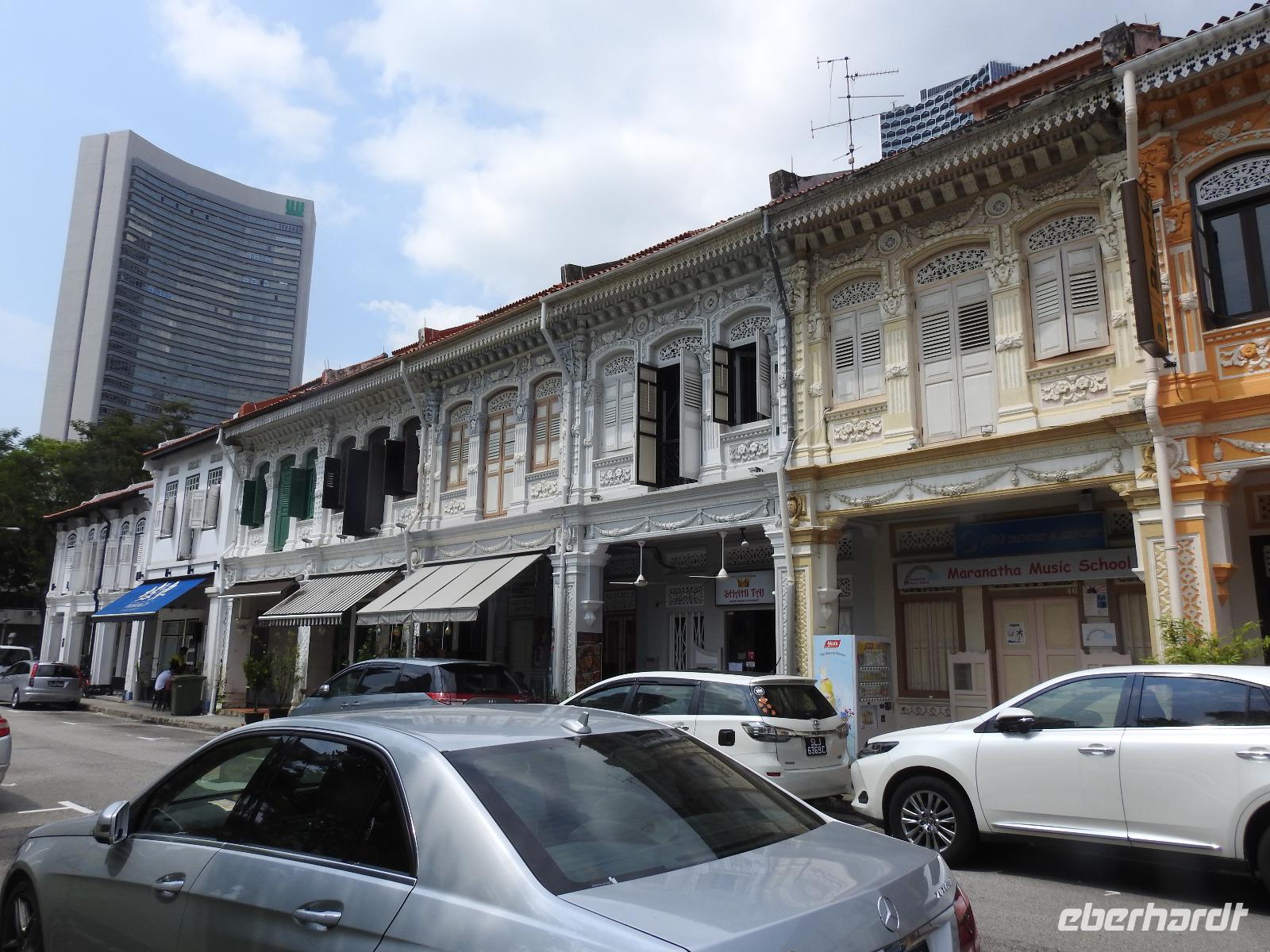 Pünktlich um Zehn holt uns David zur Stadtbesichtigung ab. Habt ihr gestern alles gesehen, fragt er. Dann lasst uns heut etwas anderes machen, damit ihr nicht alles doppelt seht. Unser erstes Ziel ist der Sands Skypark. Dieser befindet sich auf dem Dach des Hotels Marina Bay Sands. Von hier aus haben wir eine tolle Aussicht auf Singapur. Allerdings ist es super heiß. David erklärt uns auf allen Seiten, was es zu sehen gibt und dann schnell wieder runter, bevor wir durchgebraten sind. Wir fahren nach Kampong Glam, in das Arabische Viertel. In der bunten Haji Lane (Straße) beginnt unser Rundgang. Die Straße ist schmal und auf beiden Seiten befinden sich quietschbunt angemalte Häuschen. In den meisten sind Restaurants oder Cafés untergebracht, noch aber geschlossen, denn es ist ja vormittags und die Gäste kommen eher abends. In der Arab Street zeigt uns David ein Café, in dem drei Glückssymbole aus verschiedenen Religionen angebracht sind - ein Zeichen für die Offenheit der hiesigen Bewohner - ein Hufeisen, ein türkisches Auge und ein Spiegel von ? - hab ich leider vergessen. Wir spazieren zur Sultan Moschee, deren goldene Kuppel in der Sonne leuchtet. Wir fahren weiter nach Little India. Hier erklärt uns David verschiedene exotische Früchte. Bemerkenswert sind hier die vielen kleinen Läden, in denen säckeweise Gewürze angeboten werden. Wir wundern uns darüber, dass fast nur Männer zu sehen sind, die hier einkaufen, aber auch dafür hat David eine Erklärung. Es sind indische Gastarbeiter, deren Frauen sich noch in der Heimat befinden. Uns erwartet jetzt der Besuch des Orchideen-Gartens. Wie der Name schon sagt, sind hier Orchideen in all ihrer Pracht, in verschiedenen Farben und Formen zu bewundern. Ein Teil des Gartens ist V(ery) I(mportend) P(erson)s gewidmet. Hier hat unsere Angie eine Blume, und auch Lady Di, und viele andere bekannte Personen. Nun besuchen wir Chinatown. Da uns gestern das einheimische Geld ausgegangen ist, wollen wir hier noch einmal tauschen. Kein Problem, sagt David. Die erste Wechselstube ist geschlossen, die nächste hat nicht genügend Geld vorrätig und die dritte ist nur nach einem anstrengenden Fußmarsch in einem Einkaufszentrum zu finden (so viel zu „kein Problem"), naja, macht nichts, letztendlich sind alle versorgt. Wer möchte, kann jetzt in der Garküche noch einen Happen essen oder an einem der vielen bunten Souvenirstände Andenken einkaufen. Unsere Tour ist beendet und wir fahren zurück zum Hotel. Es ist noch Zeit für eigene Unternehmungen oder zum Mittagsschlaf. Während dessen schauert es heftig. Doch zum Abendspaziergang ist der Regen wieder vorbei. Wir spazieren am Singapur-River entlang und sind nach nicht einmal zehn Minuten am Quay Side Seafood Restaurant. Innerhalb von 25 Minuten sind wir mit einem Fünf-Gänge-Menü durch. Suppe - Prawns - Hühnchen mit Reis aus dem Wok - grünes Gemüse. Zum Schluss eine Obstplatte, von der jeder 2 Stück Melone und 1 Stück Ananas bekommt - genau abgezählt. Das Essen ist ausgezeichnet, die Kellner überaus freundlich - wir sind zwar amüsiert ob der Schnelle, aber dennoch zufrieden. Und so kommt es, dass wir es schaffen, pünktlich zur Lichtshow bei den Gardens of the Bay zu sein. Heute sind wir schlauer und nehmen die U-Bahn. Die Supertrees (Super-Bäume) werden in verschiedenen Farben beleuchtet und dazu erklingt Musik - es ist wunderschön. Nach dem Schauspiel kommen wir gerade recht zu Musik-Licht-Show des Marina Bay Sand Hotels. Beeindruckt verlassen wir die Szene und spazieren nun Richtung Merlion, der uns noch auf unserem Ausflugsprogramm fehlt. So viele Menschen sind heute unterwegs. Bis zum 1. April findet hier ein Festival statt, an dem wir unerwartet teilhaben können. Endlich erreichen wir den Merlion. Auch dieser ist heute Teil des Festivals und wird musikalisch untermalt, angeleuchtet. Wir verweilen einen Moment und stellen fest, dass hier die Geschichte der Welt dargestellt wird. Beeindruckend.