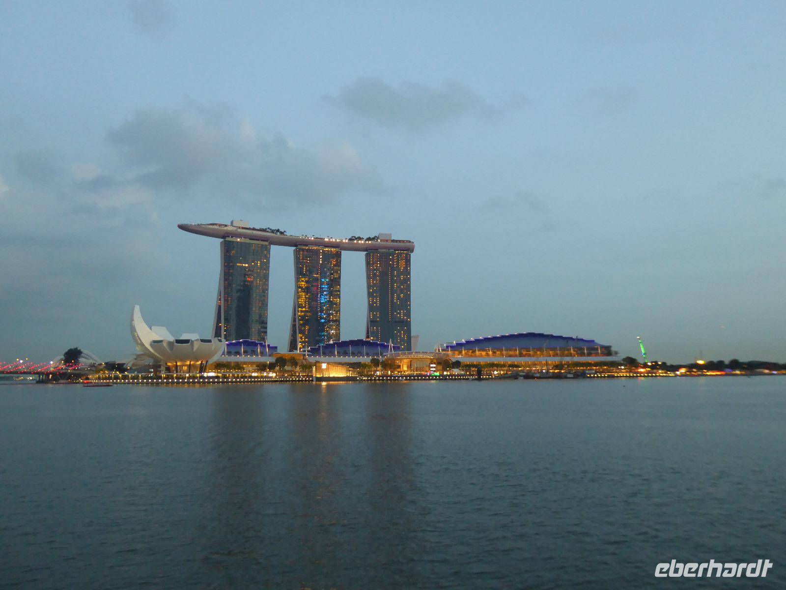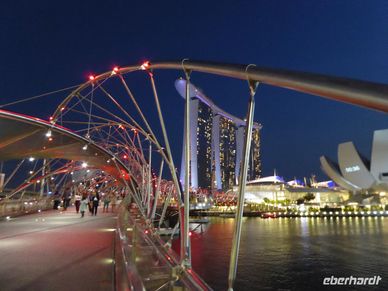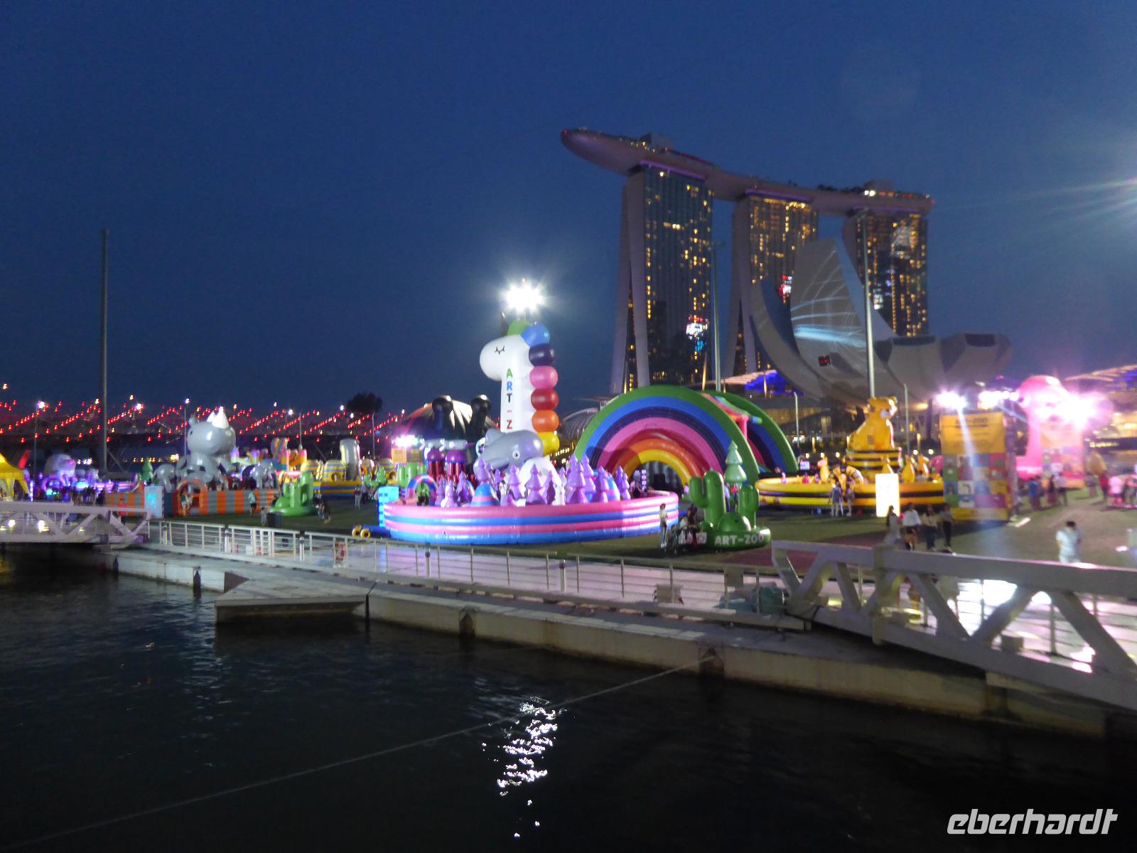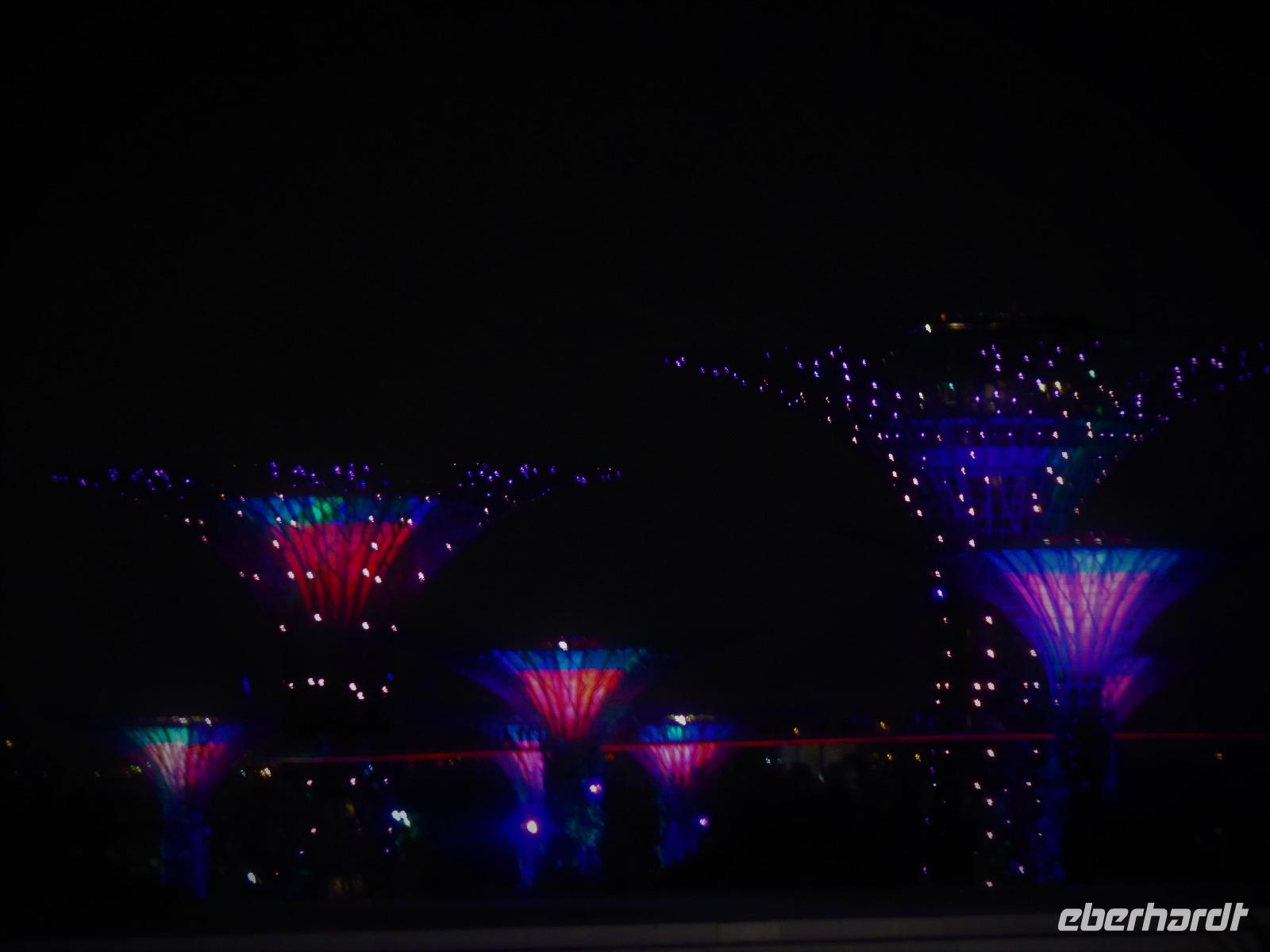 Gerade haben wir Frühstück gegessen und schon ist es wieder abends. Wir lassen uns Zeit beim Aussteigen, haben es nicht eilig und so passiert es, dass uns hunderte Asiaten überholen und wir nun doch (endlich) einmal anstehen müssen. Denn, sagt mal ehrlich, eine Anreise ohne Anstehen, das geht doch gar nicht, was? Aber auch die Einreise nach Singapur läuft dann reibungslos, wir geben unsere Einreiseformulare und unsere Fingerabdrücke ab und fertig. Ale Koffer sind da (Hurra!) und am Ausgang wartet unser örtlicher Reiseleiter David, der uns zum Bus bringt. Wir fahren zum Hotel Clarke Quay, checken ein, ich hinterlege 700 $ Kaution für alle, in der Hoffnung, dass niemand davon Gebrauch machen wird. Eine halbe Stunde später treffen wir uns zum Abendspaziergang. Links raus aus dem Hotel, ein paar Schritte und schon sind wir am Singapur River. Immer am Fluss entlang laufen wir bis zum Clarke Quay und können es nicht lassen, alles um uns herum zu fotografieren. Am Novotel überqueren wir die Straße und finden schon bald eine Wechselstube direkt am Hotel. Noch heute Abend werden wir feststellen, dass wir zu wenig Geld getauscht haben. Die Preise hier sind höher als erwartet. Noch stört uns das nicht, wir sind beruhigt, Landeswährung in der Tasche zu haben. Die Brücken über den Singapur River sind bunt beleuchtet und sobald eine viel befahrene Straße kommt, leitet uns eine Unterführung sicher auf die andere Seite. An Bootsanlegern versucht man, uns zum Buchen einer Flussfahrt zu überreden, aber wir wollen die Stadt zu Fuß erkunden. Bald schon erstreckt sich auf der anderen Uferseite das Finanzviertel Singapurs, dass sich für uns als Aneinanderreihung beleuchteter Wolkenkratzer zeigt. Fotomotiv - ganz klar. Am Merlionpark biegen wir nicht rechts ab, denn wir wollen zur Helixbridge und dort den Fluss überqueren. Am Ufer entlang sind Lichtinstallationen aufgebaut, die nicht nur unsere Aufmerksamkeit erregen. Auch Einheimische (?) und viele Asiaten sind unterwegs. Wir kommen am Tanzenden Gras vorbei und an einer Demo gegen Plastikmüll (in Form einer Lichtinstallation). Am Horizont ist die Silhouette des Marina Bay Sands zu sehen. Drei Hoteltürme mit einem imaginären Schiff oben drauf. David sagt, wenn die Sintflut kommt, haben die Singapurer ihre Arche. Der Weg zieht sich und zieht sich. Der Plan ist, mindestens eine Lichtshow zu erwischen, am liebsten mehrere. Wir kommen zum Singapur Flyer, das größte stehende Riesenrad der Welt, wie David uns am nächsten Tag lächelnd erzählt, würde es fahren, wäre es nur das zweitgrößte, denn in Las Vegas gibt es ein größeres. Leider ist der Singapur Flyer seit Januar kaputt und bis heute ist es nicht gelungen, ihn wieder flott zu machen. Trotzdem sind die Gondeln beleuchtet und direkt über dem Riesenrad scheint der Vollmond. Wir biegen rechts ab, überqueren die wundervolle Helixbridge und kommen zur Mall des Marina Bay Sands. Mit der Rolltreppe fahren wir nach oben und finden dort eine Aussichtsplattform mit Blick auf die Supertrees. Na, bis dahin wäre es aber noch weit. Und unsere Füße brennen. Also schauen wir die Lichtshow von hier oben an und bekommen zumindest einen Eindruck davon. Wir sind uns einig, dass wir jetzt umkehren. Am Clarke Quay sind wir uns ebenfalls bald einig, dass es egal ist, welche Kneipe, Hauptsache sitzen. Wir bestellen ein paar Getränke und auch etwas zum Essen. Es dauert nicht lange und wir werden gefragt, ob wir 45 Minuten aushalten, bis das Essen kommt. Es ist ca. halb zehn. Wir handeln auf zwanzig Minuten runter. Das Bier löscht den Durst, die Suppe wird serviert und auch Fish and Ships kommen bald. Jetzt fehlt nur noch das Sandwich mit Chicken. Wieder werden wir gefragt, ob wir noch 20 Minuten aushalten. Eigentlich nicht. Gerade als wir aufgeben wollen, wird das Sandwich serviert. Es handelt sich dabei um eine Art Pizza in länglicher Form in überdimensionaler Größe. Wer, bitte wer, soll das essen? Um diese Zeit? Das ist eine Portion für zehn Personen. Nun ja, es schmeckt immerhin und fast die Hälfte wird vertilgt. Noch ein paar Schritte bis nach Haus (ins Hotel) und wir fallen erschöpft in den Tiefschlaf.