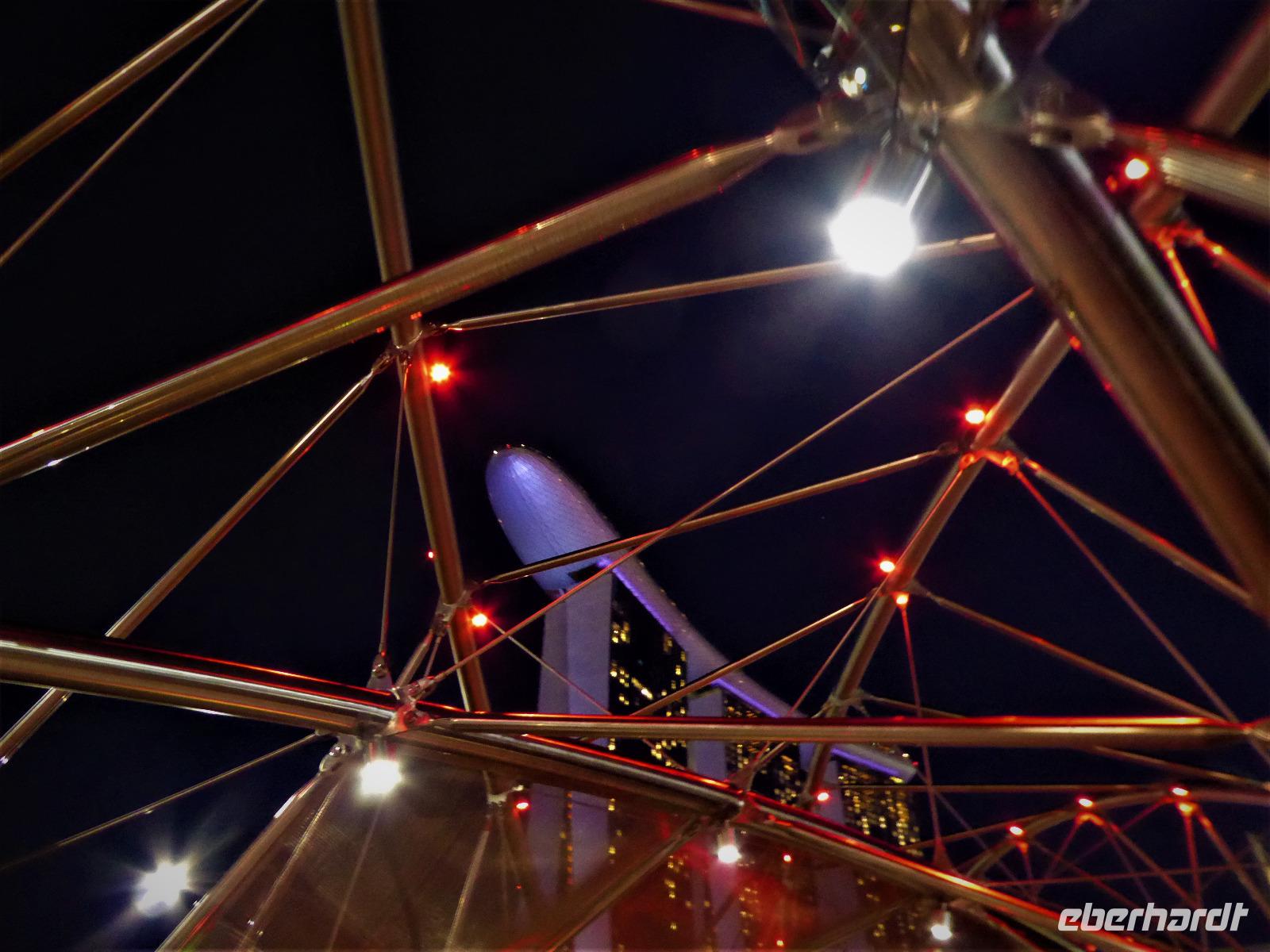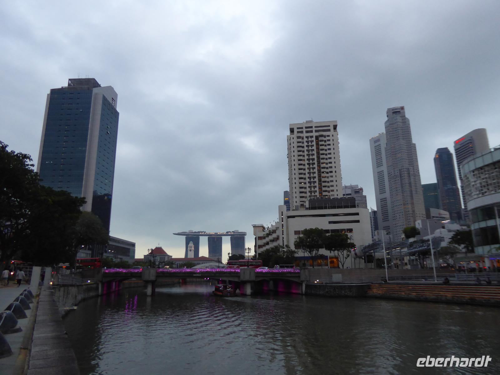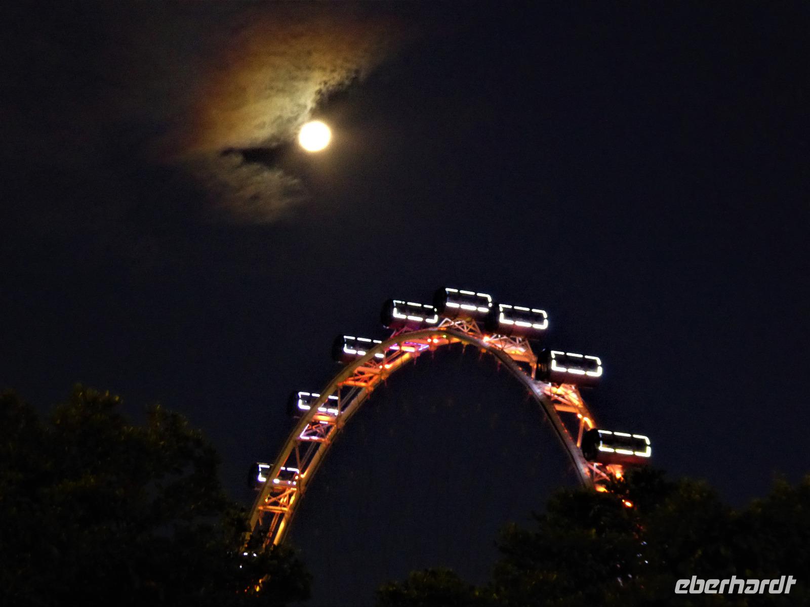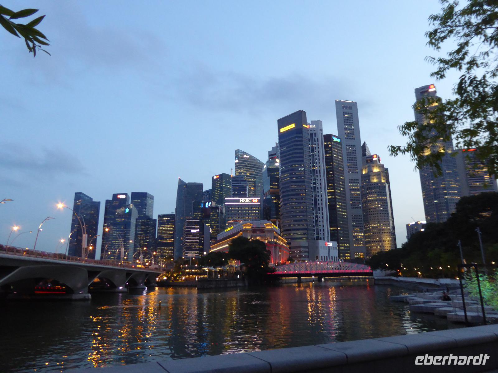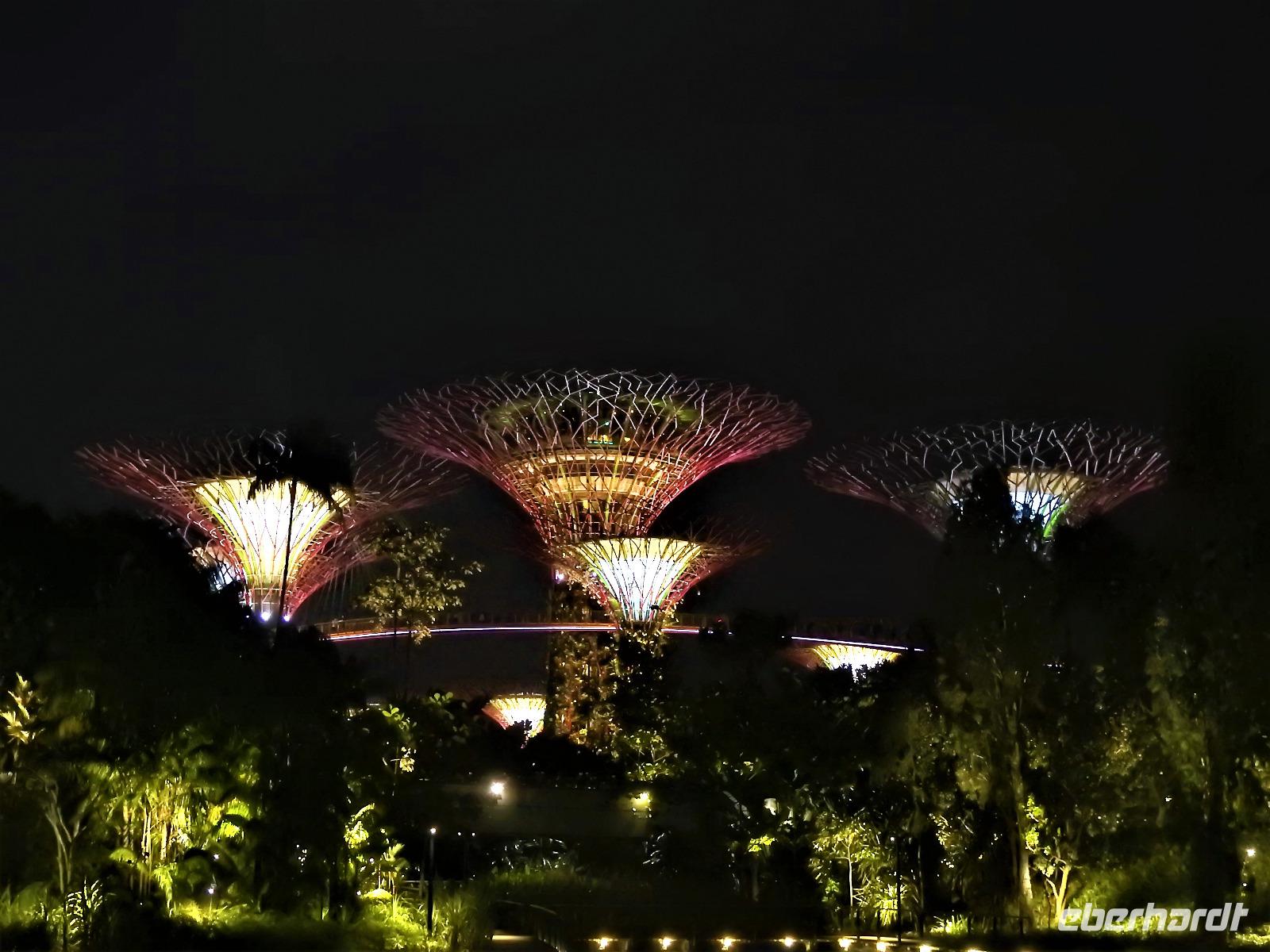 Gerade haben wir Frühstück gegessen und schon ist es wieder abends. Wir lassen uns Zeit beim Aussteigen, haben es nicht eilig und so passiert es, dass uns hunderte Asiaten überholen und wir nun doch (endlich) einmal anstehen müssen. Denn, sagt mal ehrlich, eine Anreise ohne Anstehen, das geht doch gar nicht, was? Aber auch die Einreise nach Singapur läuft dann reibungslos, wir geben unsere Einreiseformulare und unsere Fingerabdrücke ab und fertig. Ale Koffer sind da (Hurra!) und am Ausgang wartet unser örtlicher Reiseleiter David, der uns zum Bus bringt. Wir fahren zum Hotel Clarke Quay, checken ein, ich hinterlege 700 $ Kaution für alle, in der Hoffnung, dass niemand davon Gebrauch machen wird. Eine halbe Stunde später treffen wir uns zum Abendspaziergang. Links raus aus dem Hotel, ein paar Schritte und schon sind wir am Singapur River. Immer am Fluss entlang laufen wir bis zum Clarke Quay und können es nicht lassen, alles um uns herum zu fotografieren. Am Novotel überqueren wir die Straße und finden schon bald eine Wechselstube direkt am Hotel. Noch heute Abend werden wir feststellen, dass wir zu wenig Geld getauscht haben. Die Preise hier sind höher als erwartet. Noch stört uns das nicht, wir sind beruhigt, Landeswährung in der Tasche zu haben. Die Brücken über den Singapur River sind bunt beleuchtet und sobald eine viel befahrene Straße kommt, leitet uns eine Unterführung sicher auf die andere Seite. An Bootsanlegern versucht man, uns zum Buchen einer Flussfahrt zu überreden, aber wir wollen die Stadt zu Fuß erkunden. Bald schon erstreckt sich auf der anderen Uferseite das Finanzviertel Singapurs, dass sich für uns als Aneinanderreihung beleuchteter Wolkenkratzer zeigt. Fotomotiv - ganz klar. Am Merlionpark biegen wir nicht rechts ab, denn wir wollen zur Helixbridge und dort den Fluss überqueren. Am Ufer entlang sind Lichtinstallationen aufgebaut, die nicht nur unsere Aufmerksamkeit erregen. Auch Einheimische (?) und viele Asiaten sind unterwegs. Wir kommen am Tanzenden Gras vorbei und an einer Demo gegen Plastikmüll (in Form einer Lichtinstallation). Am Horizont ist die Silhouette des Marina Bay Sands zu sehen. Drei Hoteltürme mit einem imaginären Schiff oben drauf. David sagt, wenn die Sintflut kommt, haben die Singapurer ihre Arche. Der Weg zieht sich und zieht sich. Der Plan ist, mindestens eine Lichtshow zu erwischen, am liebsten mehrere. Wir kommen zum Singapur Flyer, das größte stehende Riesenrad der Welt, wie David uns am nächsten Tag lächelnd erzählt, würde es fahren, wäre es nur das zweitgrößte, denn in Las Vegas gibt es ein größeres. Leider ist der Singapur Flyer seit Januar kaputt und bis heute ist es nicht gelungen, ihn wieder flott zu machen. Trotzdem sind die Gondeln beleuchtet und direkt über dem Riesenrad scheint der Vollmond. Wir biegen rechts ab, überqueren die wundervolle Helixbridge und kommen zur Mall des Marina Bay Sands. Mit der Rolltreppe fahren wir nach oben und finden dort eine Aussichtsplattform mit Blick auf die Supertrees. Na, bis dahin wäre es aber noch weit. Und unsere Füße brennen. Also schauen wir die Lichtshow von hier oben an und bekommen zumindest einen Eindruck davon. Wir sind uns einig, dass wir jetzt umkehren. Am Clarke Quay sind wir uns ebenfalls bald einig, dass es egal ist, welche Kneipe, Hauptsache sitzen. Wir bestellen ein paar Getränke und auch etwas zum Essen. Es dauert nicht lange und wir werden gefragt, ob wir 45 Minuten aushalten, bis das Essen kommt. Es ist ca. halb zehn. Wir handeln auf zwanzig Minuten runter. Das Bier löscht den Durst, die Suppe wird serviert und auch Fish and Ships kommen bald. Jetzt fehlt nur noch das Sandwich mit Chicken. Wieder werden wir gefragt, ob wir noch 20 Minuten aushalten. Eigentlich nicht. Gerade als wir aufgeben wollen, wird das Sandwich serviert. Es handelt sich dabei um eine Art Pizza in länglicher Form in überdimensionaler Größe. Wer, bitte wer, soll das essen? Um diese Zeit? Das ist eine Portion für zehn Personen. Nun ja, es schmeckt immerhin und fast die Hälfte wird vertilgt. Noch ein paar Schritte bis nach Haus (ins Hotel) und wir fallen erschöpft in den Tiefschlaf.