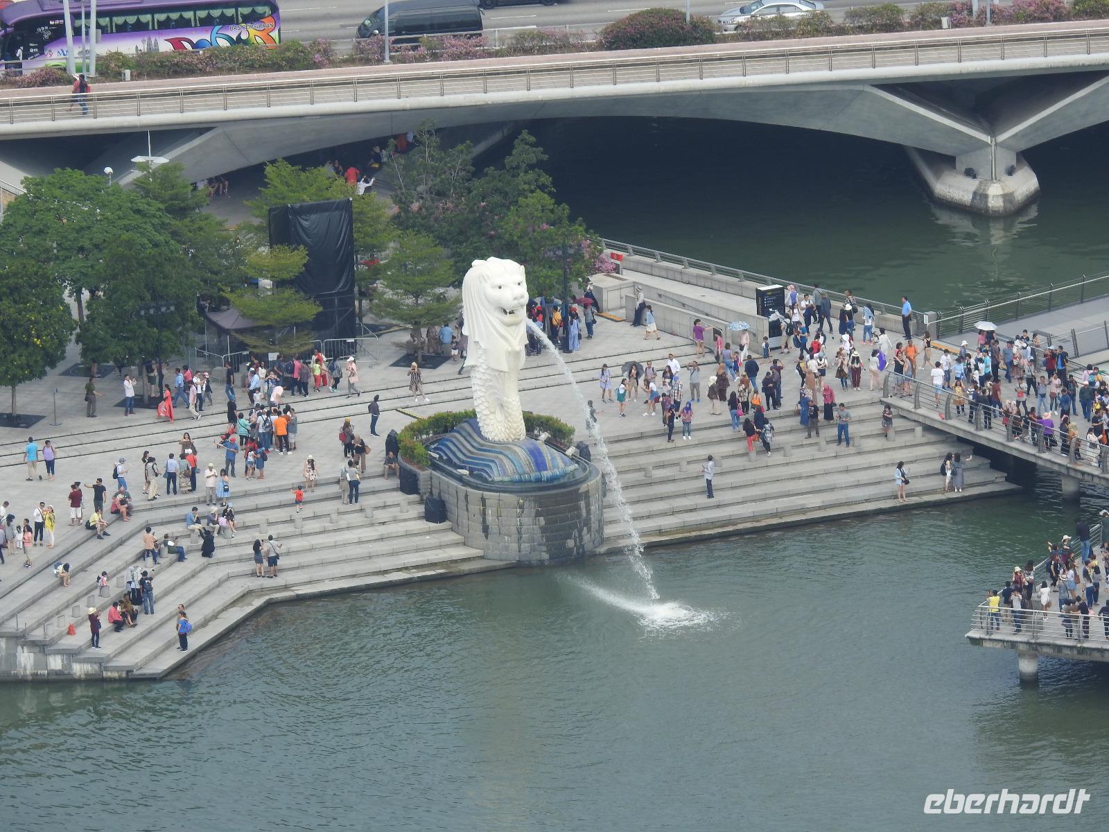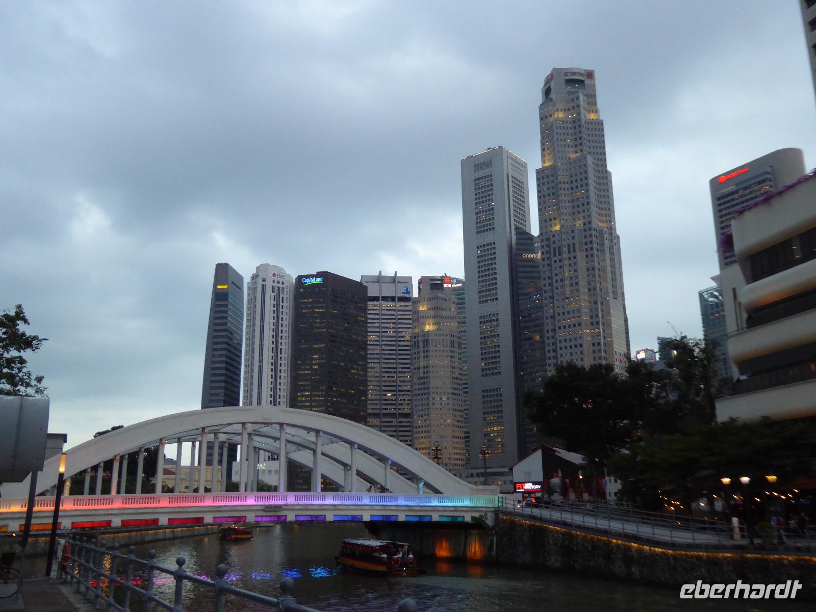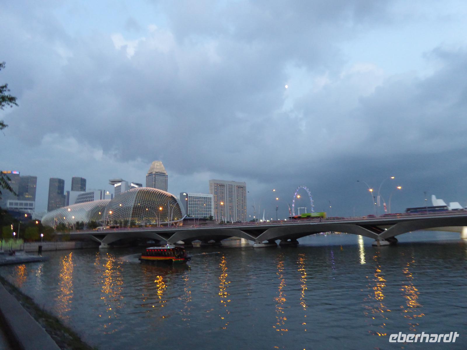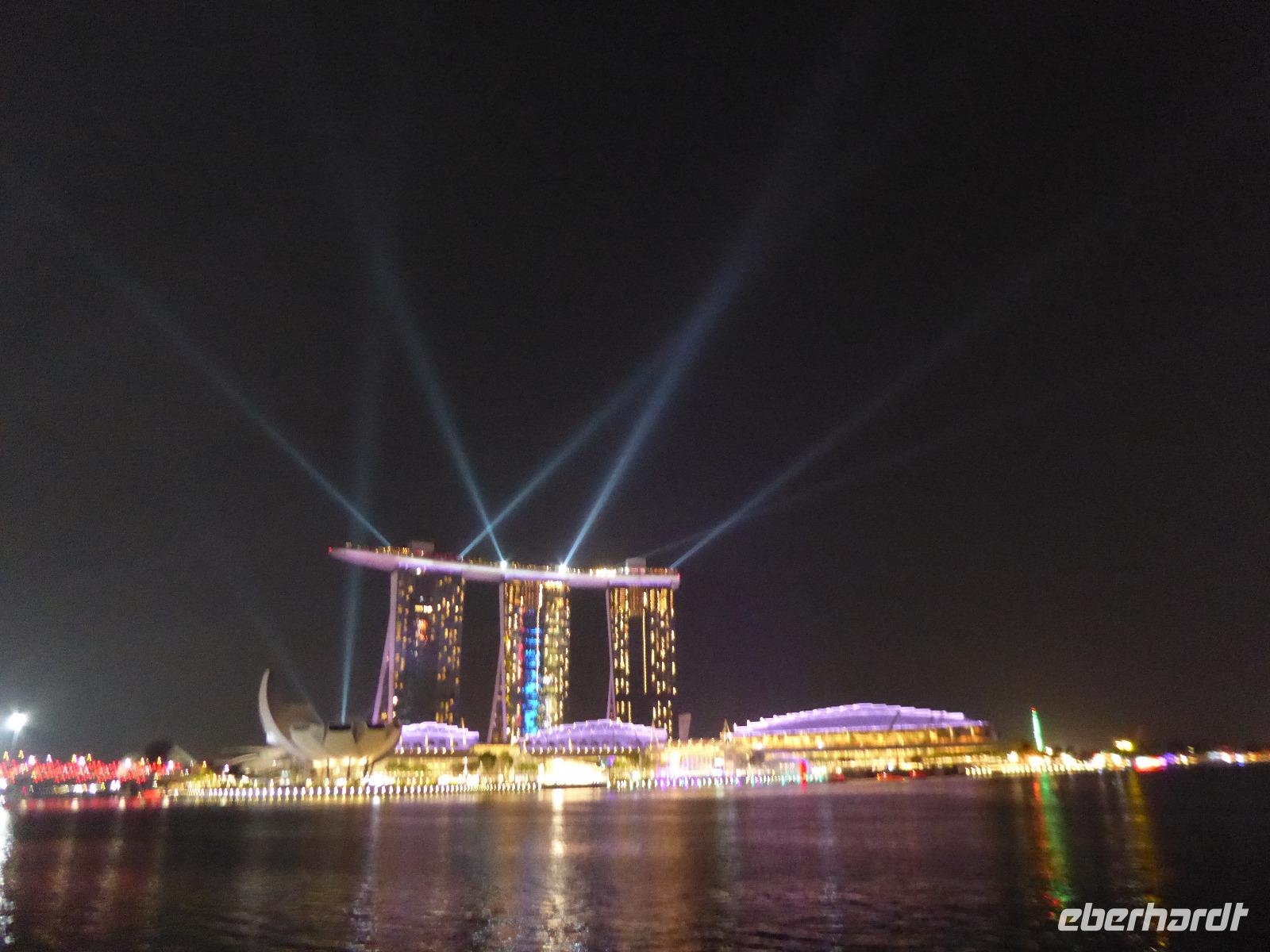 Gerade haben wir Frühstück gegessen und schon ist es wieder abends. Wir lassen uns Zeit beim Aussteigen, haben es nicht eilig und so passiert es, dass uns hunderte Asiaten überholen und wir nun doch (endlich) einmal anstehen müssen. Denn, sagt mal ehrlich, eine Anreise ohne Anstehen, das geht doch gar nicht, was? Aber auch die Einreise nach Singapur läuft dann reibungslos, wir geben unsere Einreiseformulare und unsere Fingerabdrücke ab und fertig. Ale Koffer sind da (Hurra!) und am Ausgang wartet unser örtlicher Reiseleiter David, der uns zum Bus bringt. Wir fahren zum Hotel Clarke Quay, checken ein, ich hinterlege 700 $ Kaution für alle, in der Hoffnung, dass niemand davon Gebrauch machen wird. Eine halbe Stunde später treffen wir uns zum Abendspaziergang. Links raus aus dem Hotel, ein paar Schritte und schon sind wir am Singapur River. Immer am Fluss entlang laufen wir bis zum Clarke Quay und können es nicht lassen, alles um uns herum zu fotografieren. Am Novotel überqueren wir die Straße und finden schon bald eine Wechselstube direkt am Hotel. Noch heute Abend werden wir feststellen, dass wir zu wenig Geld getauscht haben. Die Preise hier sind höher als erwartet. Noch stört uns das nicht, wir sind beruhigt, Landeswährung in der Tasche zu haben. Die Brücken über den Singapur River sind bunt beleuchtet und sobald eine viel befahrene Straße kommt, leitet uns eine Unterführung sicher auf die andere Seite. An Bootsanlegern versucht man, uns zum Buchen einer Flussfahrt zu überreden, aber wir wollen die Stadt zu Fuß erkunden. Bald schon erstreckt sich auf der anderen Uferseite das Finanzviertel Singapurs, dass sich für uns als Aneinanderreihung beleuchteter Wolkenkratzer zeigt. Fotomotiv - ganz klar. Am Merlionpark biegen wir nicht rechts ab, denn wir wollen zur Helixbridge und dort den Fluss überqueren. Am Ufer entlang sind Lichtinstallationen aufgebaut, die nicht nur unsere Aufmerksamkeit erregen. Auch Einheimische (?) und viele Asiaten sind unterwegs. Wir kommen am Tanzenden Gras vorbei und an einer Demo gegen Plastikmüll (in Form einer Lichtinstallation). Am Horizont ist die Silhouette des Marina Bay Sands zu sehen. Drei Hoteltürme mit einem imaginären Schiff oben drauf. David sagt, wenn die Sintflut kommt, haben die Singapurer ihre Arche. Der Weg zieht sich und zieht sich. Der Plan ist, mindestens eine Lichtshow zu erwischen, am liebsten mehrere. Wir kommen zum Singapur Flyer, das größte stehende Riesenrad der Welt, wie David uns am nächsten Tag lächelnd erzählt, würde es fahren, wäre es nur das zweitgrößte, denn in Las Vegas gibt es ein größeres. Leider ist der Singapur Flyer seit Januar kaputt und bis heute ist es nicht gelungen, ihn wieder flott zu machen. Trotzdem sind die Gondeln beleuchtet und direkt über dem Riesenrad scheint der Vollmond. Wir biegen rechts ab, überqueren die wundervolle Helixbridge und kommen zur Mall des Marina Bay Sands. Mit der Rolltreppe fahren wir nach oben und finden dort eine Aussichtsplattform mit Blick auf die Supertrees. Na, bis dahin wäre es aber noch weit. Und unsere Füße brennen. Also schauen wir die Lichtshow von hier oben an und bekommen zumindest einen Eindruck davon. Wir sind uns einig, dass wir jetzt umkehren. Am Clarke Quay sind wir uns ebenfalls bald einig, dass es egal ist, welche Kneipe, Hauptsache sitzen. Wir bestellen ein paar Getränke und auch etwas zum Essen. Es dauert nicht lange und wir werden gefragt, ob wir 45 Minuten aushalten, bis das Essen kommt. Es ist ca. halb zehn. Wir handeln auf zwanzig Minuten runter. Das Bier löscht den Durst, die Suppe wird serviert und auch Fish and Ships kommen bald. Jetzt fehlt nur noch das Sandwich mit Chicken. Wieder werden wir gefragt, ob wir noch 20 Minuten aushalten. Eigentlich nicht. Gerade als wir aufgeben wollen, wird das Sandwich serviert. Es handelt sich dabei um eine Art Pizza in länglicher Form in überdimensionaler Größe. Wer, bitte wer, soll das essen? Um diese Zeit? Das ist eine Portion für zehn Personen. Nun ja, es schmeckt immerhin und fast die Hälfte wird vertilgt. Noch ein paar Schritte bis nach Haus (ins Hotel) und wir fallen erschöpft in den Tiefschlaf.