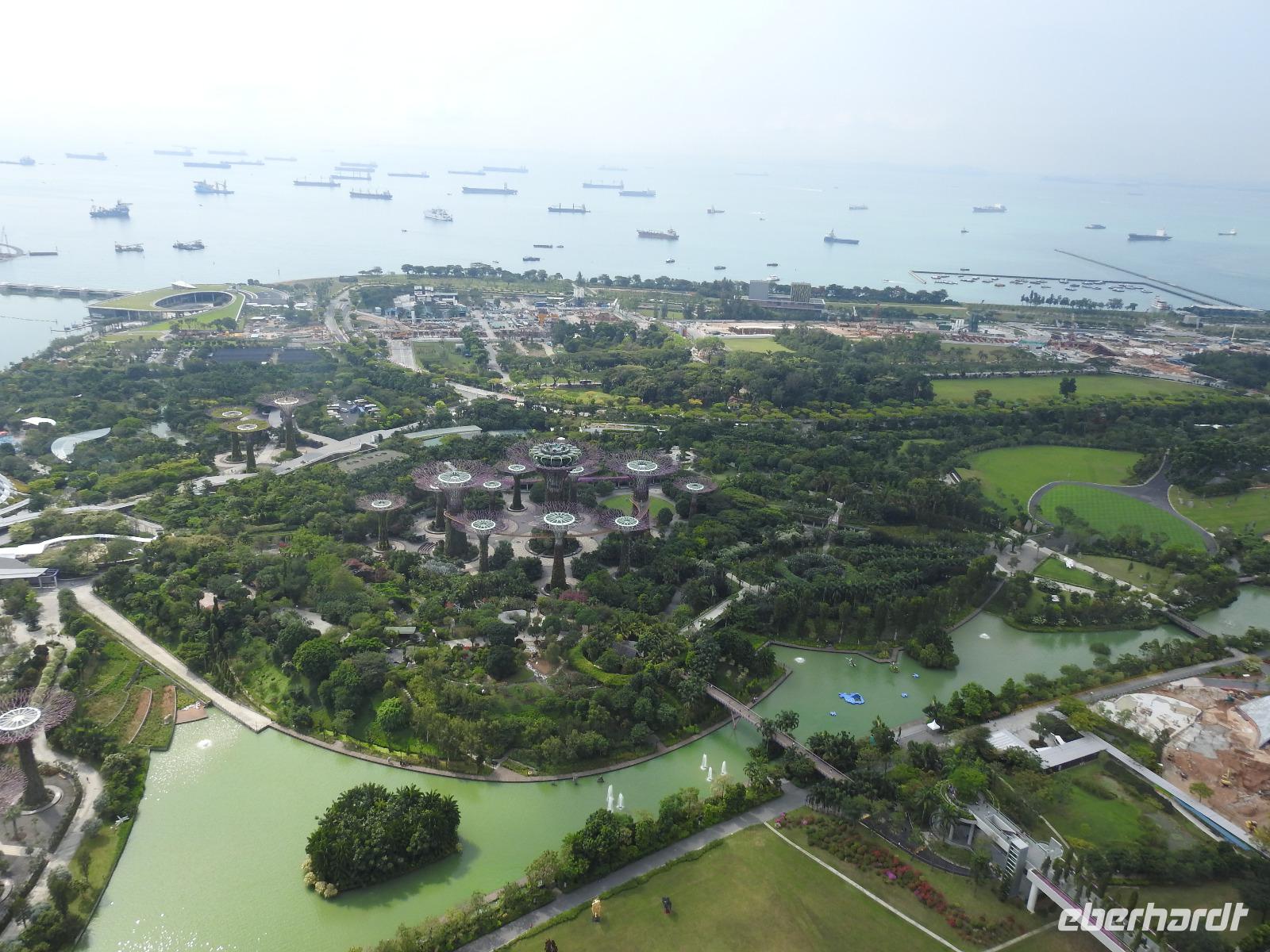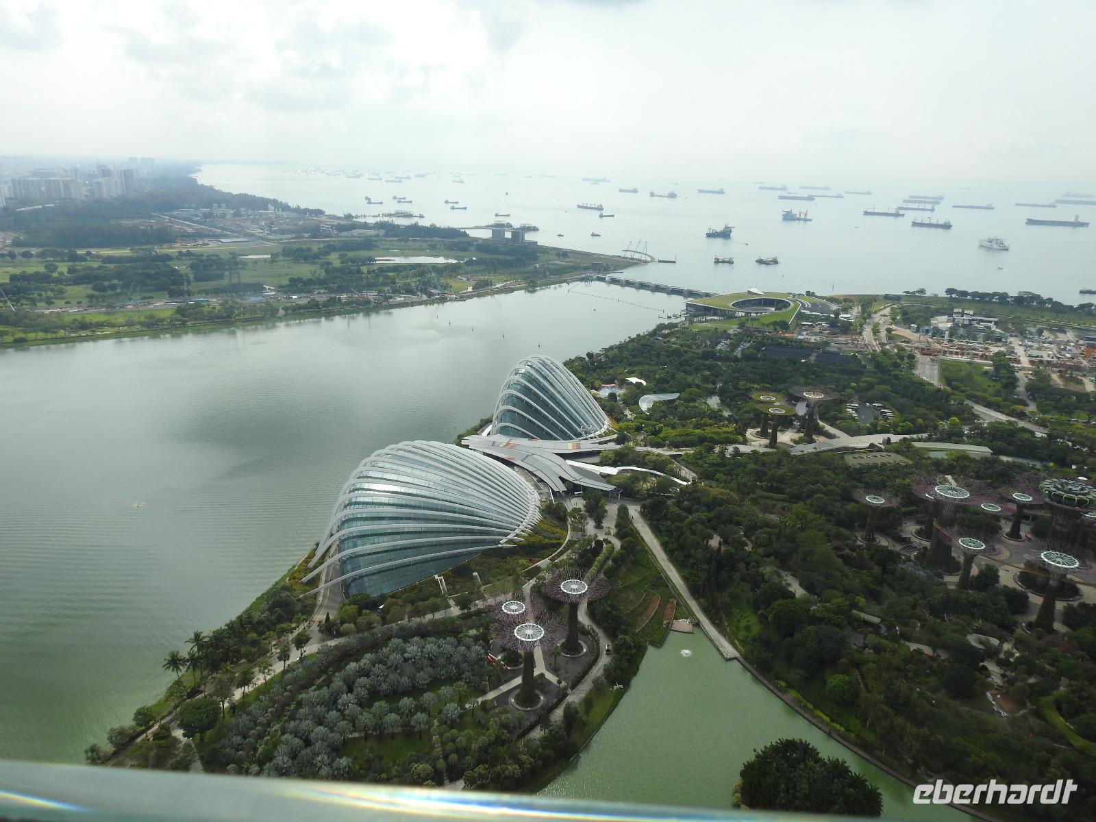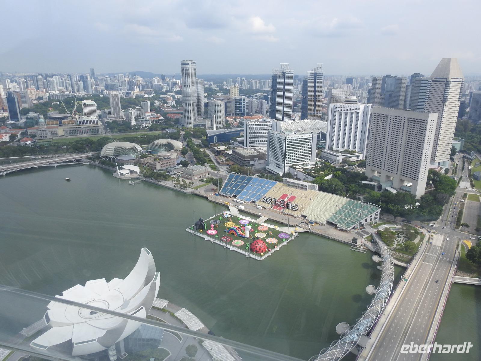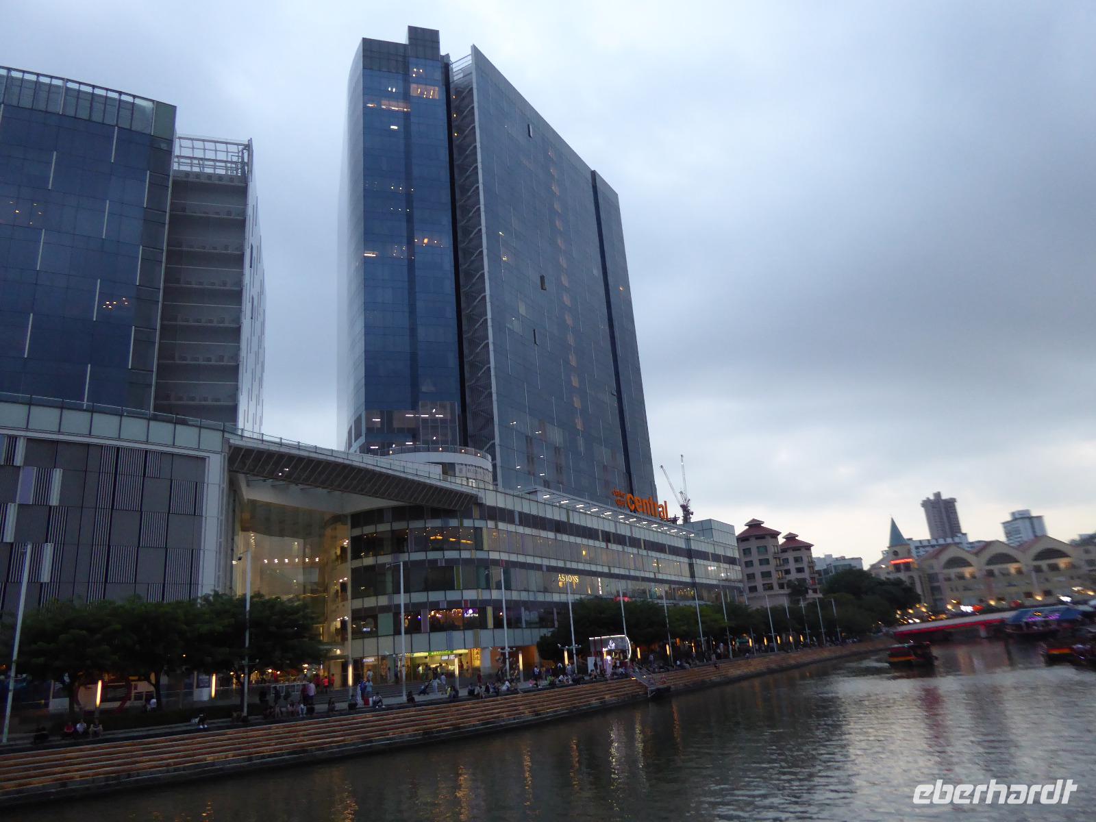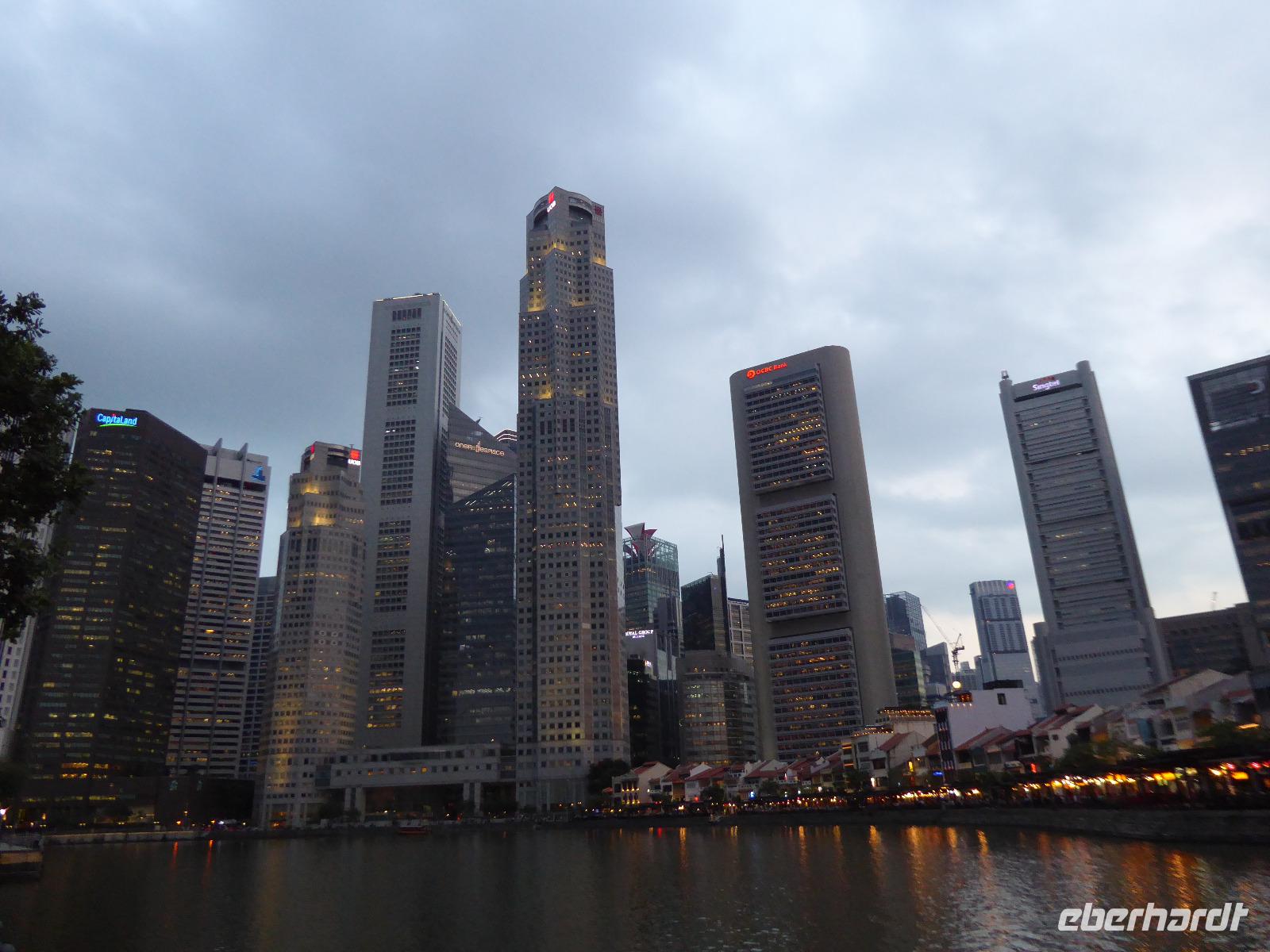 Gerade haben wir Frühstück gegessen und schon ist es wieder abends. Wir lassen uns Zeit beim Aussteigen, haben es nicht eilig und so passiert es, dass uns hunderte Asiaten überholen und wir nun doch (endlich) einmal anstehen müssen. Denn, sagt mal ehrlich, eine Anreise ohne Anstehen, das geht doch gar nicht, was? Aber auch die Einreise nach Singapur läuft dann reibungslos, wir geben unsere Einreiseformulare und unsere Fingerabdrücke ab und fertig. Ale Koffer sind da (Hurra!) und am Ausgang wartet unser örtlicher Reiseleiter David, der uns zum Bus bringt. Wir fahren zum Hotel Clarke Quay, checken ein, ich hinterlege 700 $ Kaution für alle, in der Hoffnung, dass niemand davon Gebrauch machen wird. Eine halbe Stunde später treffen wir uns zum Abendspaziergang. Links raus aus dem Hotel, ein paar Schritte und schon sind wir am Singapur River. Immer am Fluss entlang laufen wir bis zum Clarke Quay und können es nicht lassen, alles um uns herum zu fotografieren. Am Novotel überqueren wir die Straße und finden schon bald eine Wechselstube direkt am Hotel. Noch heute Abend werden wir feststellen, dass wir zu wenig Geld getauscht haben. Die Preise hier sind höher als erwartet. Noch stört uns das nicht, wir sind beruhigt, Landeswährung in der Tasche zu haben. Die Brücken über den Singapur River sind bunt beleuchtet und sobald eine viel befahrene Straße kommt, leitet uns eine Unterführung sicher auf die andere Seite. An Bootsanlegern versucht man, uns zum Buchen einer Flussfahrt zu überreden, aber wir wollen die Stadt zu Fuß erkunden. Bald schon erstreckt sich auf der anderen Uferseite das Finanzviertel Singapurs, dass sich für uns als Aneinanderreihung beleuchteter Wolkenkratzer zeigt. Fotomotiv - ganz klar. Am Merlionpark biegen wir nicht rechts ab, denn wir wollen zur Helixbridge und dort den Fluss überqueren. Am Ufer entlang sind Lichtinstallationen aufgebaut, die nicht nur unsere Aufmerksamkeit erregen. Auch Einheimische (?) und viele Asiaten sind unterwegs. Wir kommen am Tanzenden Gras vorbei und an einer Demo gegen Plastikmüll (in Form einer Lichtinstallation). Am Horizont ist die Silhouette des Marina Bay Sands zu sehen. Drei Hoteltürme mit einem imaginären Schiff oben drauf. David sagt, wenn die Sintflut kommt, haben die Singapurer ihre Arche. Der Weg zieht sich und zieht sich. Der Plan ist, mindestens eine Lichtshow zu erwischen, am liebsten mehrere. Wir kommen zum Singapur Flyer, das größte stehende Riesenrad der Welt, wie David uns am nächsten Tag lächelnd erzählt, würde es fahren, wäre es nur das zweitgrößte, denn in Las Vegas gibt es ein größeres. Leider ist der Singapur Flyer seit Januar kaputt und bis heute ist es nicht gelungen, ihn wieder flott zu machen. Trotzdem sind die Gondeln beleuchtet und direkt über dem Riesenrad scheint der Vollmond. Wir biegen rechts ab, überqueren die wundervolle Helixbridge und kommen zur Mall des Marina Bay Sands. Mit der Rolltreppe fahren wir nach oben und finden dort eine Aussichtsplattform mit Blick auf die Supertrees. Na, bis dahin wäre es aber noch weit. Und unsere Füße brennen. Also schauen wir die Lichtshow von hier oben an und bekommen zumindest einen Eindruck davon. Wir sind uns einig, dass wir jetzt umkehren. Am Clarke Quay sind wir uns ebenfalls bald einig, dass es egal ist, welche Kneipe, Hauptsache sitzen. Wir bestellen ein paar Getränke und auch etwas zum Essen. Es dauert nicht lange und wir werden gefragt, ob wir 45 Minuten aushalten, bis das Essen kommt. Es ist ca. halb zehn. Wir handeln auf zwanzig Minuten runter. Das Bier löscht den Durst, die Suppe wird serviert und auch Fish and Ships kommen bald. Jetzt fehlt nur noch das Sandwich mit Chicken. Wieder werden wir gefragt, ob wir noch 20 Minuten aushalten. Eigentlich nicht. Gerade als wir aufgeben wollen, wird das Sandwich serviert. Es handelt sich dabei um eine Art Pizza in länglicher Form in überdimensionaler Größe. Wer, bitte wer, soll das essen? Um diese Zeit? Das ist eine Portion für zehn Personen. Nun ja, es schmeckt immerhin und fast die Hälfte wird vertilgt. Noch ein paar Schritte bis nach Haus (ins Hotel) und wir fallen erschöpft in den Tiefschlaf.