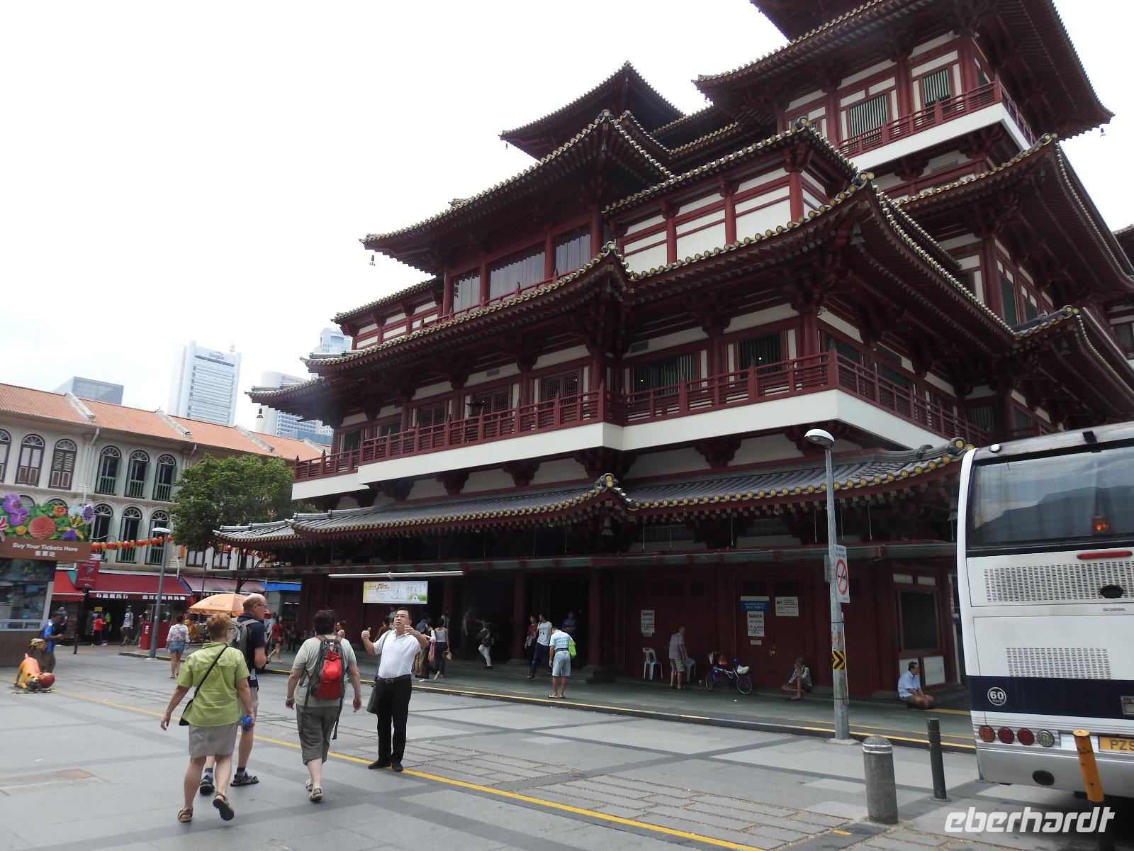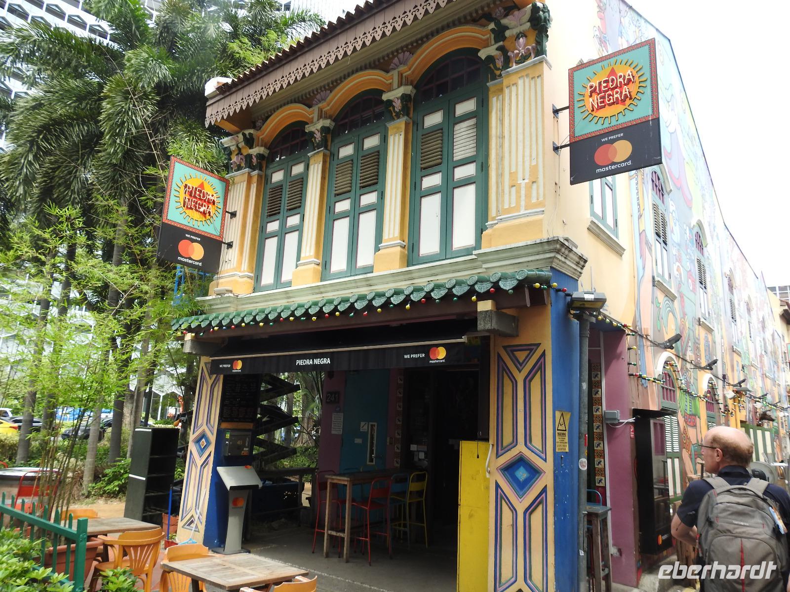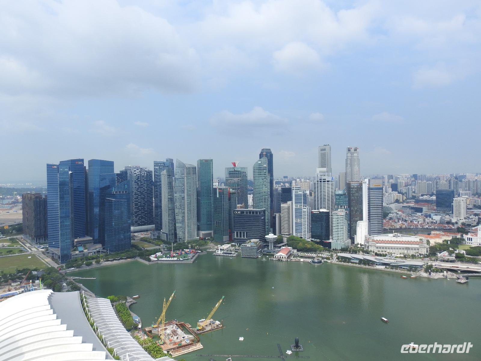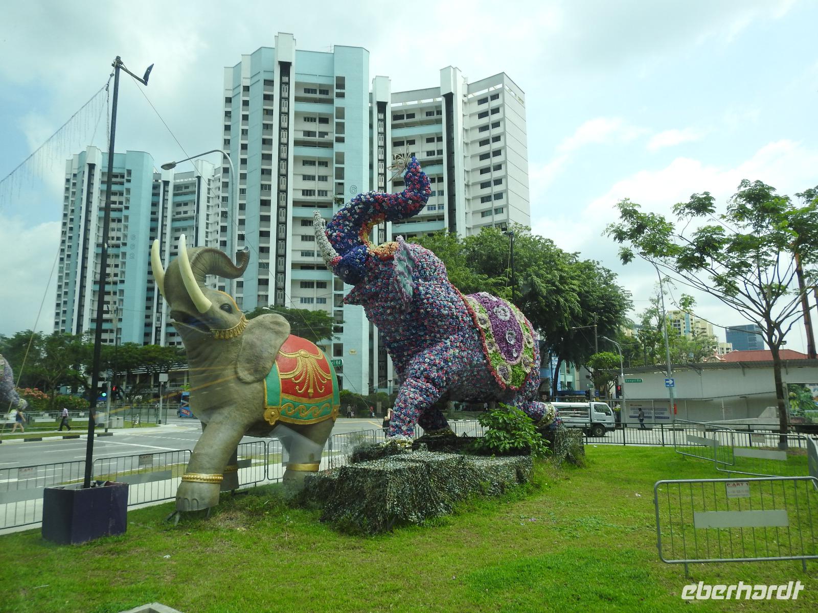 Gerade haben wir Frühstück gegessen und schon ist es wieder abends. Wir lassen uns Zeit beim Aussteigen, haben es nicht eilig und so passiert es, dass uns hunderte Asiaten überholen und wir nun doch (endlich) einmal anstehen müssen. Denn, sagt mal ehrlich, eine Anreise ohne Anstehen, das geht doch gar nicht, was? Aber auch die Einreise nach Singapur läuft dann reibungslos, wir geben unsere Einreiseformulare und unsere Fingerabdrücke ab und fertig. Ale Koffer sind da (Hurra!) und am Ausgang wartet unser örtlicher Reiseleiter David, der uns zum Bus bringt. Wir fahren zum Hotel Clarke Quay, checken ein, ich hinterlege 700 $ Kaution für alle, in der Hoffnung, dass niemand davon Gebrauch machen wird. Eine halbe Stunde später treffen wir uns zum Abendspaziergang. Links raus aus dem Hotel, ein paar Schritte und schon sind wir am Singapur River. Immer am Fluss entlang laufen wir bis zum Clarke Quay und können es nicht lassen, alles um uns herum zu fotografieren. Am Novotel überqueren wir die Straße und finden schon bald eine Wechselstube direkt am Hotel. Noch heute Abend werden wir feststellen, dass wir zu wenig Geld getauscht haben. Die Preise hier sind höher als erwartet. Noch stört uns das nicht, wir sind beruhigt, Landeswährung in der Tasche zu haben. Die Brücken über den Singapur River sind bunt beleuchtet und sobald eine viel befahrene Straße kommt, leitet uns eine Unterführung sicher auf die andere Seite. An Bootsanlegern versucht man, uns zum Buchen einer Flussfahrt zu überreden, aber wir wollen die Stadt zu Fuß erkunden. Bald schon erstreckt sich auf der anderen Uferseite das Finanzviertel Singapurs, dass sich für uns als Aneinanderreihung beleuchteter Wolkenkratzer zeigt. Fotomotiv - ganz klar. Am Merlionpark biegen wir nicht rechts ab, denn wir wollen zur Helixbridge und dort den Fluss überqueren. Am Ufer entlang sind Lichtinstallationen aufgebaut, die nicht nur unsere Aufmerksamkeit erregen. Auch Einheimische (?) und viele Asiaten sind unterwegs. Wir kommen am Tanzenden Gras vorbei und an einer Demo gegen Plastikmüll (in Form einer Lichtinstallation). Am Horizont ist die Silhouette des Marina Bay Sands zu sehen. Drei Hoteltürme mit einem imaginären Schiff oben drauf. David sagt, wenn die Sintflut kommt, haben die Singapurer ihre Arche. Der Weg zieht sich und zieht sich. Der Plan ist, mindestens eine Lichtshow zu erwischen, am liebsten mehrere. Wir kommen zum Singapur Flyer, das größte stehende Riesenrad der Welt, wie David uns am nächsten Tag lächelnd erzählt, würde es fahren, wäre es nur das zweitgrößte, denn in Las Vegas gibt es ein größeres. Leider ist der Singapur Flyer seit Januar kaputt und bis heute ist es nicht gelungen, ihn wieder flott zu machen. Trotzdem sind die Gondeln beleuchtet und direkt über dem Riesenrad scheint der Vollmond. Wir biegen rechts ab, überqueren die wundervolle Helixbridge und kommen zur Mall des Marina Bay Sands. Mit der Rolltreppe fahren wir nach oben und finden dort eine Aussichtsplattform mit Blick auf die Supertrees. Na, bis dahin wäre es aber noch weit. Und unsere Füße brennen. Also schauen wir die Lichtshow von hier oben an und bekommen zumindest einen Eindruck davon. Wir sind uns einig, dass wir jetzt umkehren. Am Clarke Quay sind wir uns ebenfalls bald einig, dass es egal ist, welche Kneipe, Hauptsache sitzen. Wir bestellen ein paar Getränke und auch etwas zum Essen. Es dauert nicht lange und wir werden gefragt, ob wir 45 Minuten aushalten, bis das Essen kommt. Es ist ca. halb zehn. Wir handeln auf zwanzig Minuten runter. Das Bier löscht den Durst, die Suppe wird serviert und auch Fish and Ships kommen bald. Jetzt fehlt nur noch das Sandwich mit Chicken. Wieder werden wir gefragt, ob wir noch 20 Minuten aushalten. Eigentlich nicht. Gerade als wir aufgeben wollen, wird das Sandwich serviert. Es handelt sich dabei um eine Art Pizza in länglicher Form in überdimensionaler Größe. Wer, bitte wer, soll das essen? Um diese Zeit? Das ist eine Portion für zehn Personen. Nun ja, es schmeckt immerhin und fast die Hälfte wird vertilgt. Noch ein paar Schritte bis nach Haus (ins Hotel) und wir fallen erschöpft in den Tiefschlaf.