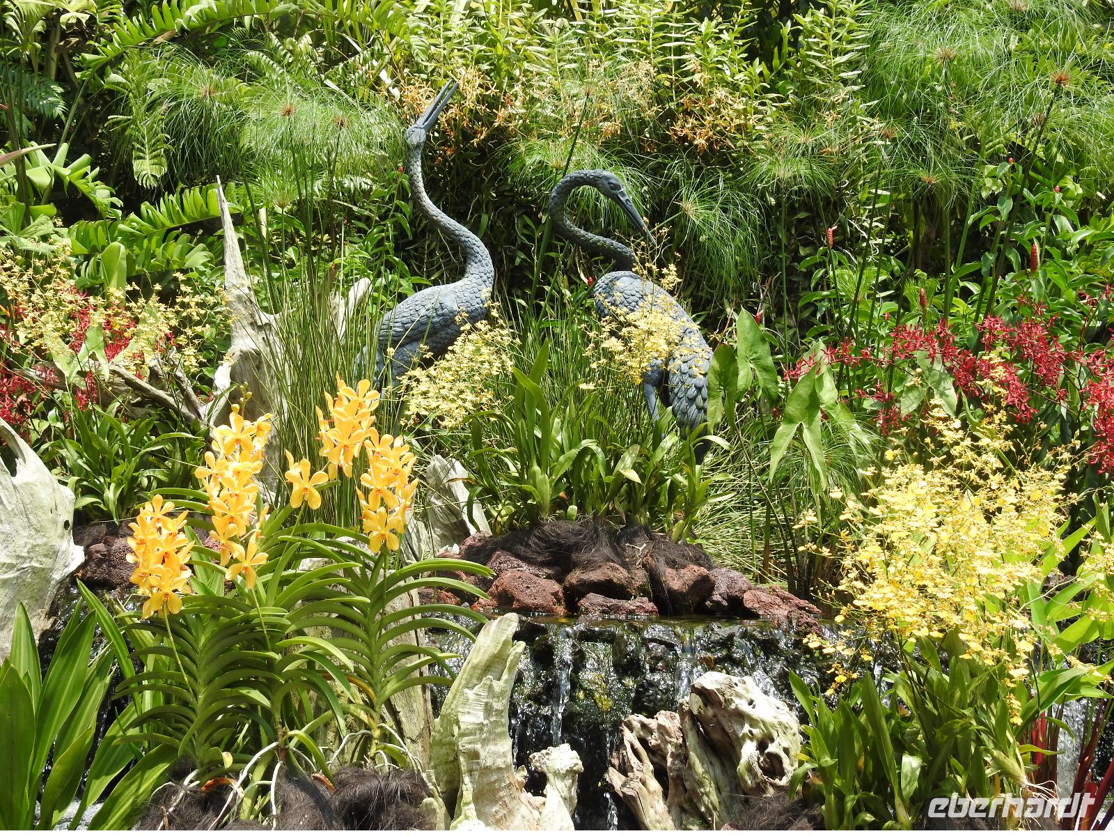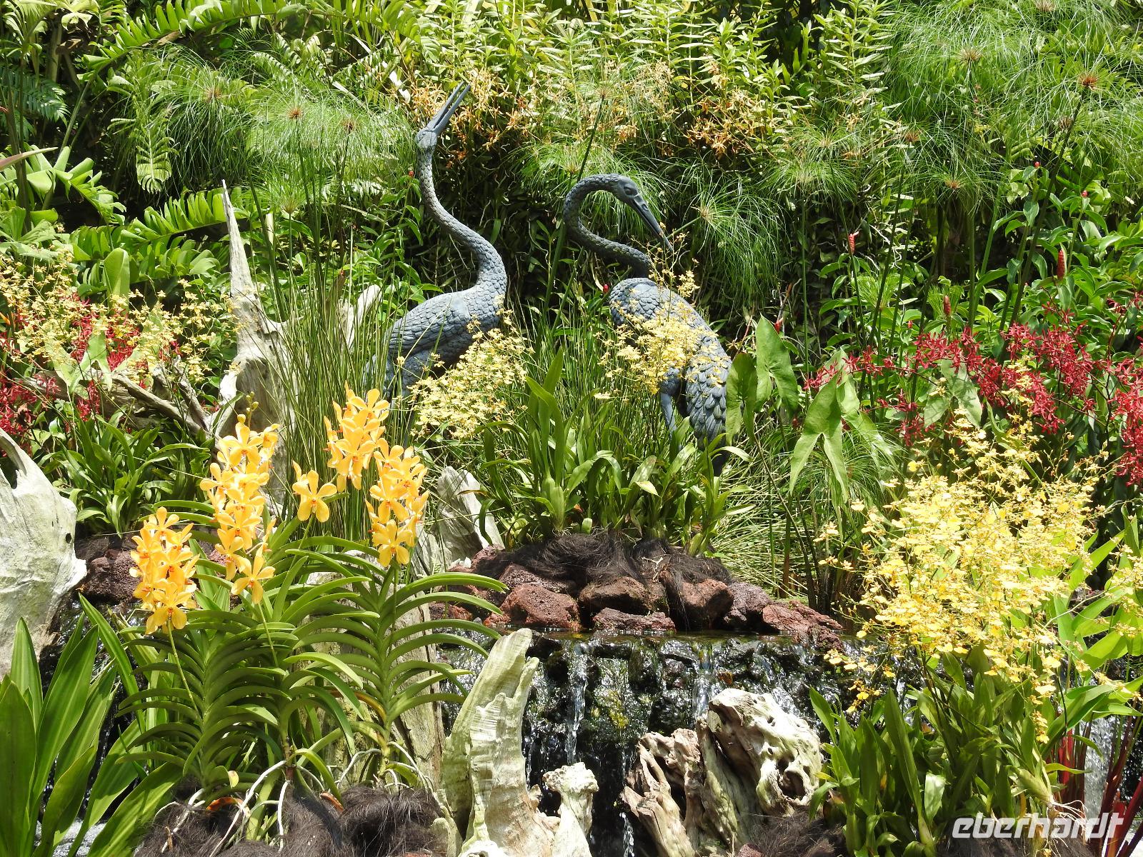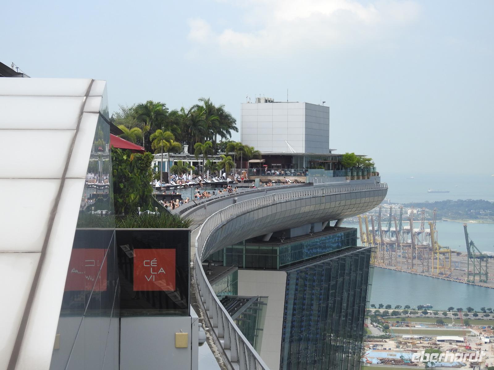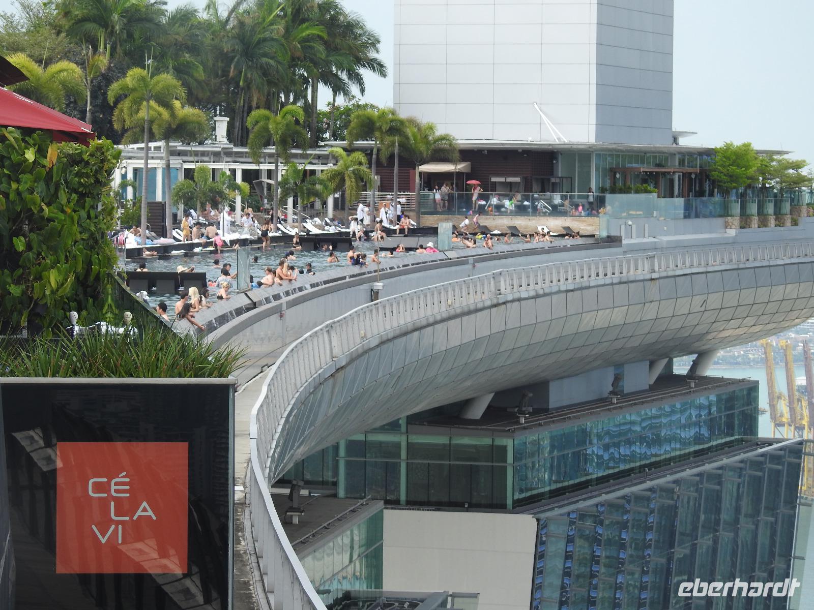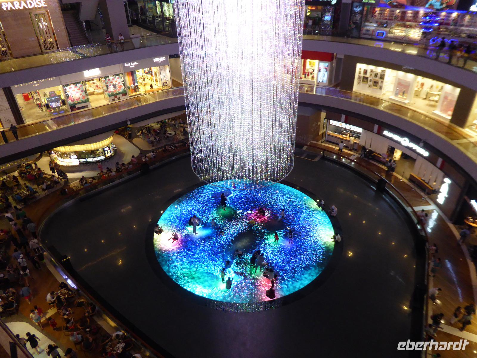 Gerade haben wir Frühstück gegessen und schon ist es wieder abends. Wir lassen uns Zeit beim Aussteigen, haben es nicht eilig und so passiert es, dass uns hunderte Asiaten überholen und wir nun doch (endlich) einmal anstehen müssen. Denn, sagt mal ehrlich, eine Anreise ohne Anstehen, das geht doch gar nicht, was? Aber auch die Einreise nach Singapur läuft dann reibungslos, wir geben unsere Einreiseformulare und unsere Fingerabdrücke ab und fertig. Ale Koffer sind da (Hurra!) und am Ausgang wartet unser örtlicher Reiseleiter David, der uns zum Bus bringt. Wir fahren zum Hotel Clarke Quay, checken ein, ich hinterlege 700 $ Kaution für alle, in der Hoffnung, dass niemand davon Gebrauch machen wird. Eine halbe Stunde später treffen wir uns zum Abendspaziergang. Links raus aus dem Hotel, ein paar Schritte und schon sind wir am Singapur River. Immer am Fluss entlang laufen wir bis zum Clarke Quay und können es nicht lassen, alles um uns herum zu fotografieren. Am Novotel überqueren wir die Straße und finden schon bald eine Wechselstube direkt am Hotel. Noch heute Abend werden wir feststellen, dass wir zu wenig Geld getauscht haben. Die Preise hier sind höher als erwartet. Noch stört uns das nicht, wir sind beruhigt, Landeswährung in der Tasche zu haben. Die Brücken über den Singapur River sind bunt beleuchtet und sobald eine viel befahrene Straße kommt, leitet uns eine Unterführung sicher auf die andere Seite. An Bootsanlegern versucht man, uns zum Buchen einer Flussfahrt zu überreden, aber wir wollen die Stadt zu Fuß erkunden. Bald schon erstreckt sich auf der anderen Uferseite das Finanzviertel Singapurs, dass sich für uns als Aneinanderreihung beleuchteter Wolkenkratzer zeigt. Fotomotiv - ganz klar. Am Merlionpark biegen wir nicht rechts ab, denn wir wollen zur Helixbridge und dort den Fluss überqueren. Am Ufer entlang sind Lichtinstallationen aufgebaut, die nicht nur unsere Aufmerksamkeit erregen. Auch Einheimische (?) und viele Asiaten sind unterwegs. Wir kommen am Tanzenden Gras vorbei und an einer Demo gegen Plastikmüll (in Form einer Lichtinstallation). Am Horizont ist die Silhouette des Marina Bay Sands zu sehen. Drei Hoteltürme mit einem imaginären Schiff oben drauf. David sagt, wenn die Sintflut kommt, haben die Singapurer ihre Arche. Der Weg zieht sich und zieht sich. Der Plan ist, mindestens eine Lichtshow zu erwischen, am liebsten mehrere. Wir kommen zum Singapur Flyer, das größte stehende Riesenrad der Welt, wie David uns am nächsten Tag lächelnd erzählt, würde es fahren, wäre es nur das zweitgrößte, denn in Las Vegas gibt es ein größeres. Leider ist der Singapur Flyer seit Januar kaputt und bis heute ist es nicht gelungen, ihn wieder flott zu machen. Trotzdem sind die Gondeln beleuchtet und direkt über dem Riesenrad scheint der Vollmond. Wir biegen rechts ab, überqueren die wundervolle Helixbridge und kommen zur Mall des Marina Bay Sands. Mit der Rolltreppe fahren wir nach oben und finden dort eine Aussichtsplattform mit Blick auf die Supertrees. Na, bis dahin wäre es aber noch weit. Und unsere Füße brennen. Also schauen wir die Lichtshow von hier oben an und bekommen zumindest einen Eindruck davon. Wir sind uns einig, dass wir jetzt umkehren. Am Clarke Quay sind wir uns ebenfalls bald einig, dass es egal ist, welche Kneipe, Hauptsache sitzen. Wir bestellen ein paar Getränke und auch etwas zum Essen. Es dauert nicht lange und wir werden gefragt, ob wir 45 Minuten aushalten, bis das Essen kommt. Es ist ca. halb zehn. Wir handeln auf zwanzig Minuten runter. Das Bier löscht den Durst, die Suppe wird serviert und auch Fish and Ships kommen bald. Jetzt fehlt nur noch das Sandwich mit Chicken. Wieder werden wir gefragt, ob wir noch 20 Minuten aushalten. Eigentlich nicht. Gerade als wir aufgeben wollen, wird das Sandwich serviert. Es handelt sich dabei um eine Art Pizza in länglicher Form in überdimensionaler Größe. Wer, bitte wer, soll das essen? Um diese Zeit? Das ist eine Portion für zehn Personen. Nun ja, es schmeckt immerhin und fast die Hälfte wird vertilgt. Noch ein paar Schritte bis nach Haus (ins Hotel) und wir fallen erschöpft in den Tiefschlaf.