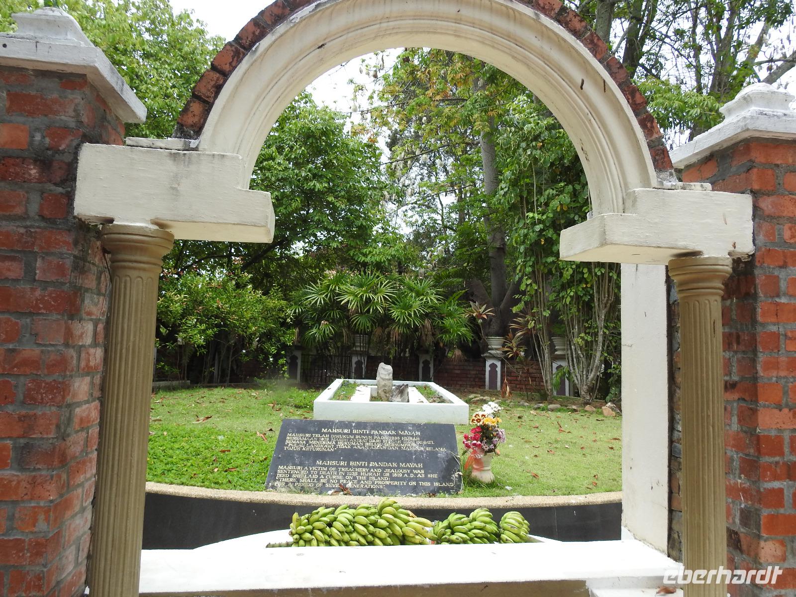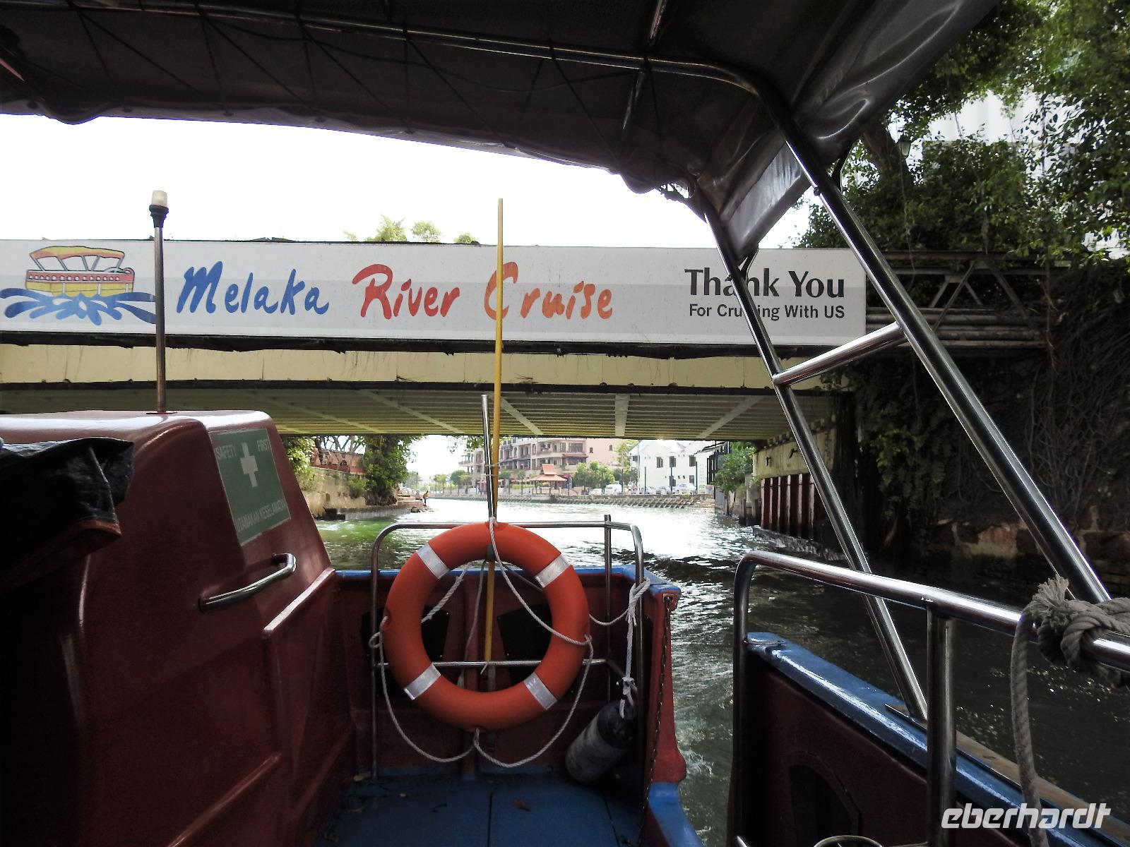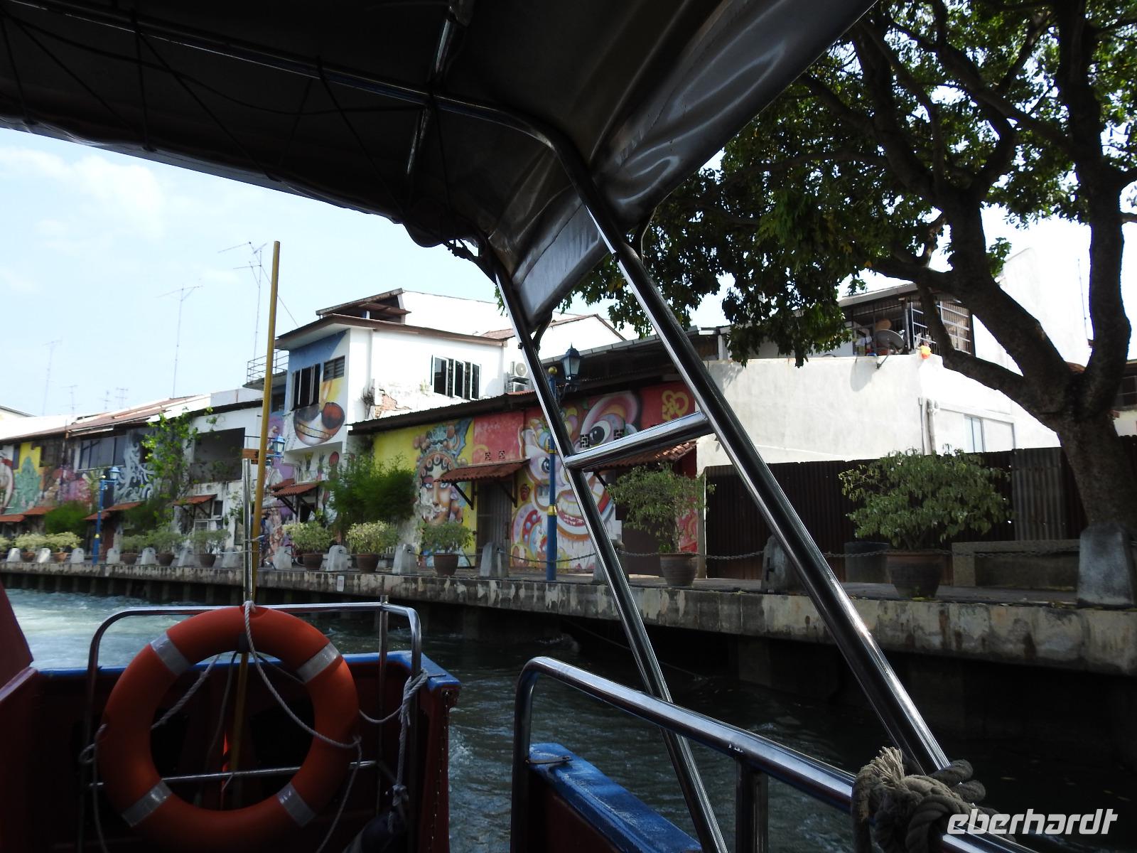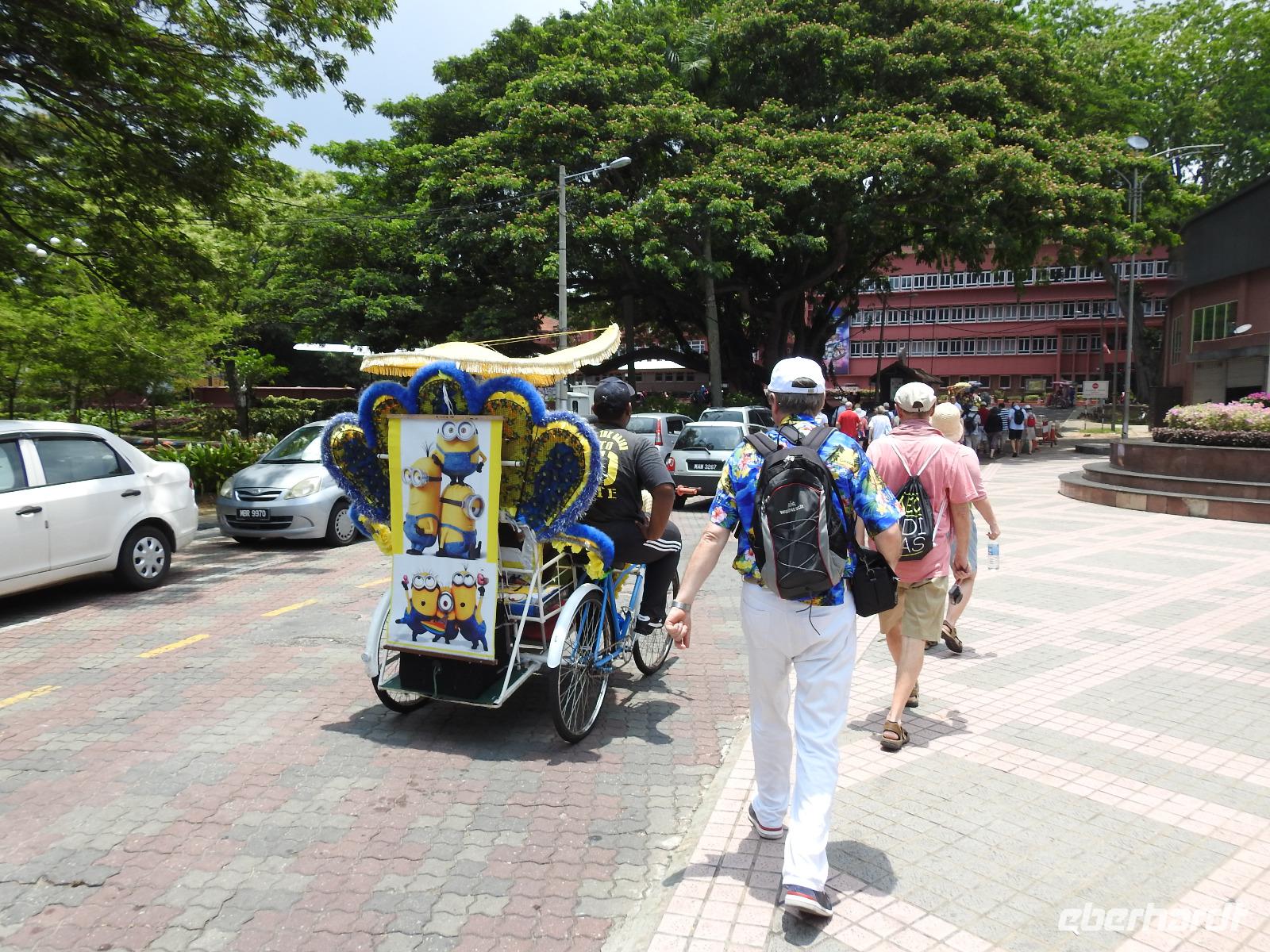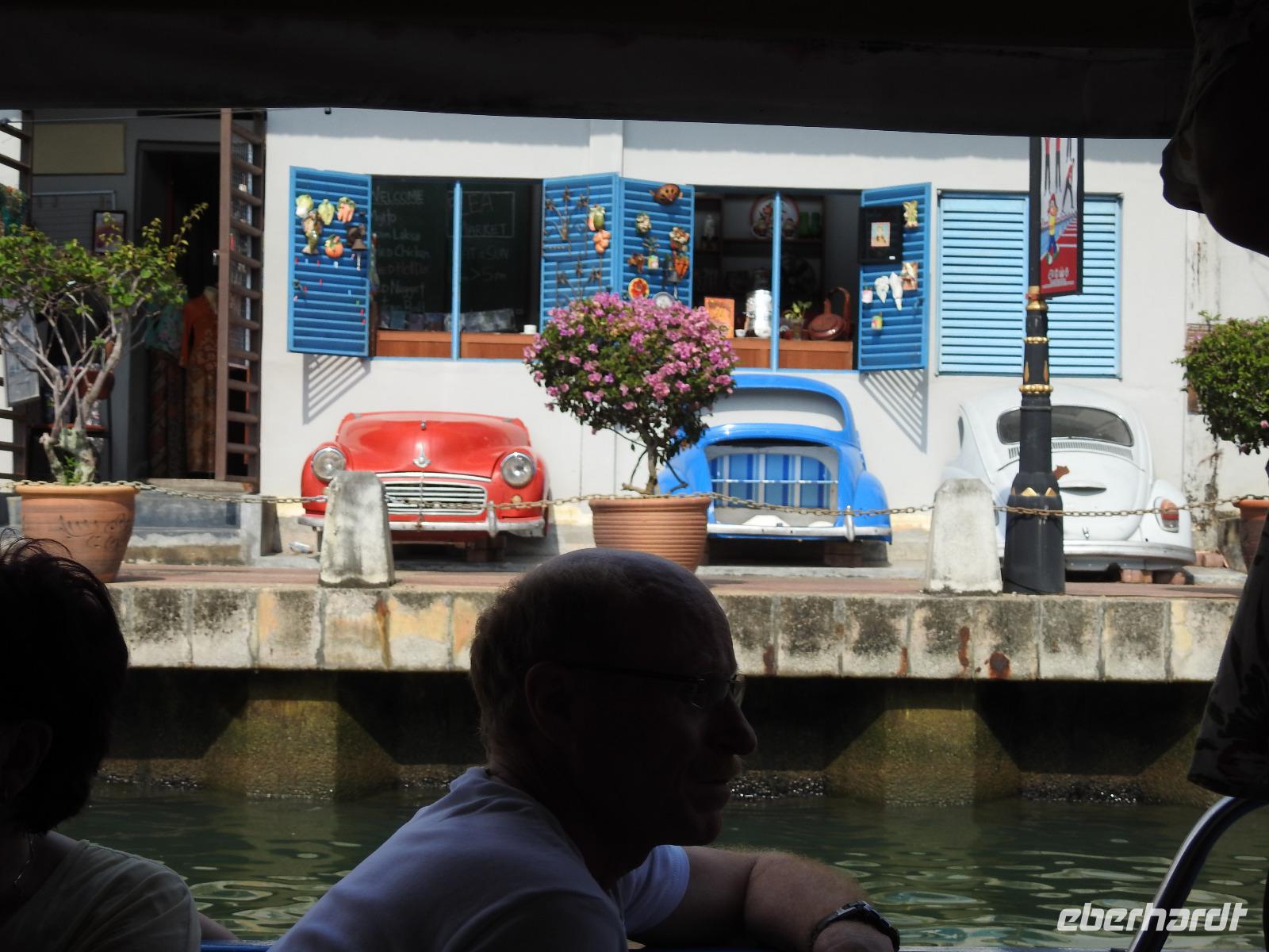 Wir haben uns verabredet, um Acht gemeinsam zu frühstücken. Und so machen wir es auch. Der österreichische Hotelmanager schaut etwas kritisch auf unser Eberhardt-Schild, denn beim Frühstück gibt es freie Platzwahl und man darf nichts reservieren. Gut. Erstens haben wir nichts reserviert, das Schild kam erst mit uns gemeinsam auf den Tisch und zweitens ist ringsum Platz, also lassen wir uns nicht beeindrucken. Das Frühstückbuffet ist reich von Köstlichkeiten. Verschieden Brot- und Brötchensorten, Wurst, Käse, Lachs und Shrimps Cocktail, Eier gekocht und gerührt oder frisch gebraten, Obst und vieles mehr. Da fällt die Auswahl schwer. Nach dem Frühstück gibt es eine Stunde Freizeit, mehr nicht. Warum? Na, um Zehn ist die zweite Sicherheitsübung und anschließend wird die Crew vorgestellt. Der Kapitän hält eine freundliche Rede und anschließend übernimmt die Kreuzfahrtdirektorin Monika aus Brasilien die Regie. So sind wir bis Elf beschäftigt. In der Piano-Bar setzen wir uns nun zusammen, um den Ausflug am Nachmittag zu besprechen. Halb zwölf gibt es die Einweisung für Tauchinteressenten, parallel das Mittagsbuffet. Auch hier lässt der Koch sich nicht lumpen. Von der Vorsuppe über Salatbuffet, vier Hauptspeisen und Obst oder Süßes zum Nachtisch, es gibt alles, was das Herz begehrt. 13.30 Uhr treten wir an zum Ausflug. Wir haben uns für das HISTORISCHE MALAKKA entschieden. Über eine wacklige Gangway (wir liegen auf Reede) hangeln wir uns ins Tenderboot. Ca. zehn Minuten sind es bis zum Land. Dort erwartet uns ein Reisebus, der uns mit weiteren 37 Gästen in ca. 10 Minuten zum Stadtzentrum bringt. Hier beginnt unsere Stadtbesichtigung. Wir befinden uns in der ältesten Stadt Malaysias, die ca. 181.000 Einwohner hat. Schon vom Busfenster aus, ist zu sehen, dass kunterbunte Rikschas hier das Stadtbild bestimmen. Später stellen wir fest, dass aus den Rikschas auch noch ohrenbetäubende Musik erklingt. Ab dem Santiago Tor, das zu den Überresten einer portugiesischen Festung gehört, gehen wir zu Fuß. Es sind schlappe 31 Grad. Unser junger Guide ist nicht zu bremsen. Er erklärt sowohl in Deutsch als auch in Englisch, alles was er über die Geschichte der Stadt weiß und was wir wissen müssen. Und das ist nicht wenig. Während die Englisch sprachigen Gäste ihre Informationen bekommen, haben wir Zeit, die Gebäude in der Nachbarschaft ins Auge bzw. vor die Linse zu nehmen. Links vom Santiago Tor befindet sich das Bastionshaus und rechts die Memorial Hall. Wenn wir Zeit hätten, könnten wir, ohne Eintritt zu bezahlen, hier die Dokumentation von Malaysias Weg zur Unabhängigkeit besichtigen, wozu Urkunden, Verträge, Karten usw. gehören. Wir aber erklimmen den St. Pauls Hügel, wofür wir 150 Treppenstufen bewältigen müssen, die direkt vom Santiago Tor hinaufführen. Auf dem Hügel befindet sich die gleichnamige (und erste) katholische Kirche der Stadt. Hier begruben die Holländer ihre Adligen. Die beeindruckenden Grabplatten sind heute noch zu besichtigen. Vom St. Pauls Hügel steigen wir hinab und kommen zum holländischen Stadthys, das vermutlich 1650 erbaut wurde und damals Sitz der holländischen Gouverneure war. Heute befindet sich hier ein Geschichtsmuseum. Nebenbei bemerkt gibt es in Malakka 30 Museen. Am holländischen Platz finden sich außerdem Zeugnisse der britischen Herrschaft, ein Uhrturm und der Victoria-Brunnen. Durch die Jong-Street gelangen wir zur Straße der Harmonie, die deshalb so heißt, weil sich hier in einer Reihe, eine Moschee, eine christliche Kirche und ein chinesischer Tempel befinden. Den Chen-Hoon-Teng Tempel besichtigen wir auch von Innen. Schöne Holzschnitzereien sind hier zu bewundern und es riecht nach Räucherstäbchen. In einer Nebenstraße nähert sich eine Prozession mit Drachentanz, aber wir haben keine Zeit und dürfen nicht bleiben, um zu schauen. Wir begeben und zum Baba Nyonya Museum, das sich in einem privaten Wohnhaus einer Familie der Nyonyas befindet, weswegen auch das Fotografieren verboten ist. Die Nyonya sind eine eigene Bevölkerungsgruppe, die sich aus der Verheiratung von malayischen Frauen und chinesischen Männern entwickelt hat. Den Abschluss unserer Stadtbesichtigung bildet eine Bootsfahrt auf dem Melaka-Fluss, bei der wir nochmal einen Blick auf die bunt angestrichenen Häuser haben und vor allem Leguane unsere Aufmerksamkeit erregen. Mit vier Gästen Verlust (natürlich nicht von unserer Gruppe) erreichen wir schließlich das letzte Tenderboot, das um 17.30 Uhr zur Star Clipper fährt. Um 18 Uhr verlassen wir Malakka und nehmen Kurs auf Langkawi. Nach einem üppigen Abendessen kann man entweder die bordeigene Modenschau besuchen oder sich aufs Ohr legen. Gute Nacht, ihr Lieben, bis Morgen!
