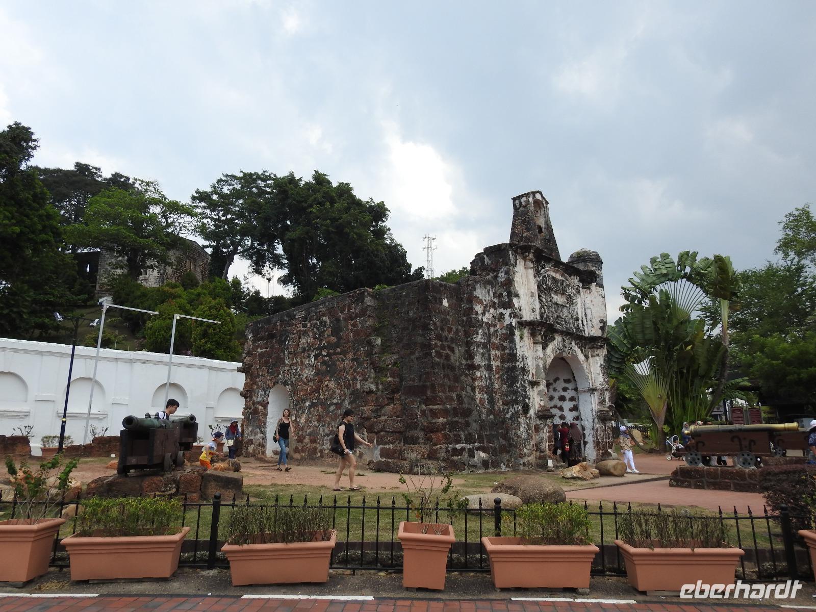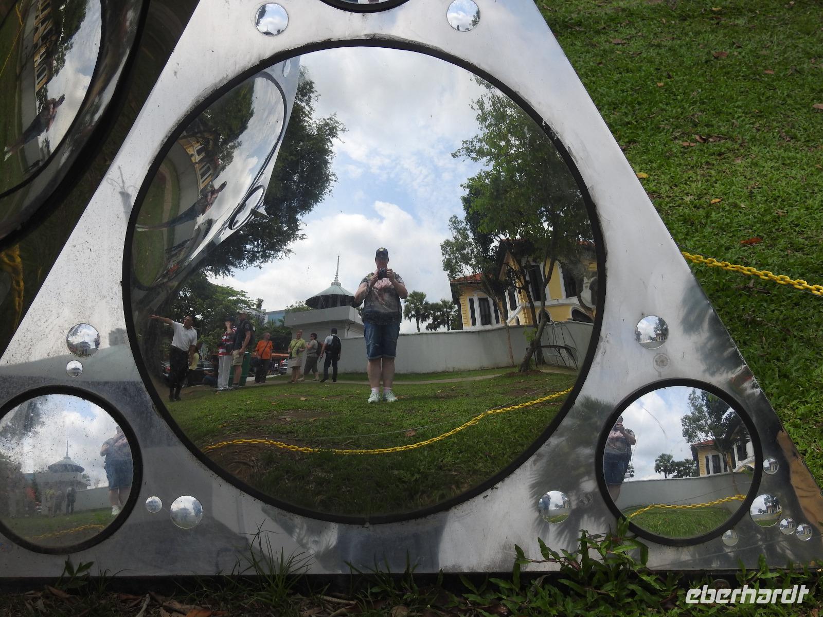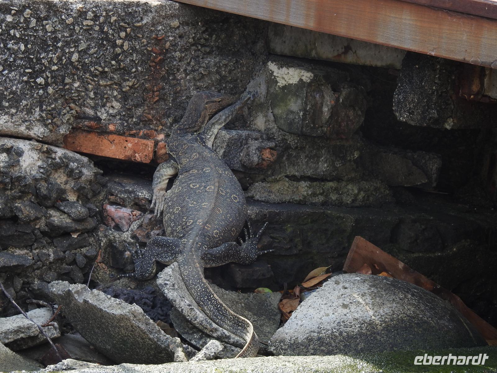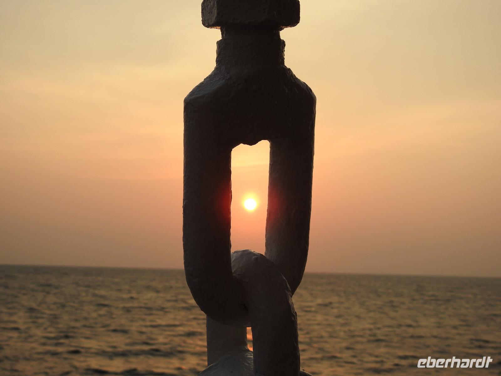 Wir haben uns verabredet, um Acht gemeinsam zu frühstücken. Und so machen wir es auch. Der österreichische Hotelmanager schaut etwas kritisch auf unser Eberhardt-Schild, denn beim Frühstück gibt es freie Platzwahl und man darf nichts reservieren. Gut. Erstens haben wir nichts reserviert, das Schild kam erst mit uns gemeinsam auf den Tisch und zweitens ist ringsum Platz, also lassen wir uns nicht beeindrucken. Das Frühstückbuffet ist reich von Köstlichkeiten. Verschieden Brot- und Brötchensorten, Wurst, Käse, Lachs und Shrimps Cocktail, Eier gekocht und gerührt oder frisch gebraten, Obst und vieles mehr. Da fällt die Auswahl schwer. Nach dem Frühstück gibt es eine Stunde Freizeit, mehr nicht. Warum? Na, um Zehn ist die zweite Sicherheitsübung und anschließend wird die Crew vorgestellt. Der Kapitän hält eine freundliche Rede und anschließend übernimmt die Kreuzfahrtdirektorin Monika aus Brasilien die Regie. So sind wir bis Elf beschäftigt. In der Piano-Bar setzen wir uns nun zusammen, um den Ausflug am Nachmittag zu besprechen. Halb zwölf gibt es die Einweisung für Tauchinteressenten, parallel das Mittagsbuffet. Auch hier lässt der Koch sich nicht lumpen. Von der Vorsuppe über Salatbuffet, vier Hauptspeisen und Obst oder Süßes zum Nachtisch, es gibt alles, was das Herz begehrt. 13.30 Uhr treten wir an zum Ausflug. Wir haben uns für das HISTORISCHE MALAKKA entschieden. Über eine wacklige Gangway (wir liegen auf Reede) hangeln wir uns ins Tenderboot. Ca. zehn Minuten sind es bis zum Land. Dort erwartet uns ein Reisebus, der uns mit weiteren 37 Gästen in ca. 10 Minuten zum Stadtzentrum bringt. Hier beginnt unsere Stadtbesichtigung. Wir befinden uns in der ältesten Stadt Malaysias, die ca. 181.000 Einwohner hat. Schon vom Busfenster aus, ist zu sehen, dass kunterbunte Rikschas hier das Stadtbild bestimmen. Später stellen wir fest, dass aus den Rikschas auch noch ohrenbetäubende Musik erklingt. Ab dem Santiago Tor, das zu den Überresten einer portugiesischen Festung gehört, gehen wir zu Fuß. Es sind schlappe 31 Grad. Unser junger Guide ist nicht zu bremsen. Er erklärt sowohl in Deutsch als auch in Englisch, alles was er über die Geschichte der Stadt weiß und was wir wissen müssen. Und das ist nicht wenig. Während die Englisch sprachigen Gäste ihre Informationen bekommen, haben wir Zeit, die Gebäude in der Nachbarschaft ins Auge bzw. vor die Linse zu nehmen. Links vom Santiago Tor befindet sich das Bastionshaus und rechts die Memorial Hall. Wenn wir Zeit hätten, könnten wir, ohne Eintritt zu bezahlen, hier die Dokumentation von Malaysias Weg zur Unabhängigkeit besichtigen, wozu Urkunden, Verträge, Karten usw. gehören. Wir aber erklimmen den St. Pauls Hügel, wofür wir 150 Treppenstufen bewältigen müssen, die direkt vom Santiago Tor hinaufführen. Auf dem Hügel befindet sich die gleichnamige (und erste) katholische Kirche der Stadt. Hier begruben die Holländer ihre Adligen. Die beeindruckenden Grabplatten sind heute noch zu besichtigen. Vom St. Pauls Hügel steigen wir hinab und kommen zum holländischen Stadthys, das vermutlich 1650 erbaut wurde und damals Sitz der holländischen Gouverneure war. Heute befindet sich hier ein Geschichtsmuseum. Nebenbei bemerkt gibt es in Malakka 30 Museen. Am holländischen Platz finden sich außerdem Zeugnisse der britischen Herrschaft, ein Uhrturm und der Victoria-Brunnen. Durch die Jong-Street gelangen wir zur Straße der Harmonie, die deshalb so heißt, weil sich hier in einer Reihe, eine Moschee, eine christliche Kirche und ein chinesischer Tempel befinden. Den Chen-Hoon-Teng Tempel besichtigen wir auch von Innen. Schöne Holzschnitzereien sind hier zu bewundern und es riecht nach Räucherstäbchen. In einer Nebenstraße nähert sich eine Prozession mit Drachentanz, aber wir haben keine Zeit und dürfen nicht bleiben, um zu schauen. Wir begeben und zum Baba Nyonya Museum, das sich in einem privaten Wohnhaus einer Familie der Nyonyas befindet, weswegen auch das Fotografieren verboten ist. Die Nyonya sind eine eigene Bevölkerungsgruppe, die sich aus der Verheiratung von malayischen Frauen und chinesischen Männern entwickelt hat. Den Abschluss unserer Stadtbesichtigung bildet eine Bootsfahrt auf dem Melaka-Fluss, bei der wir nochmal einen Blick auf die bunt angestrichenen Häuser haben und vor allem Leguane unsere Aufmerksamkeit erregen. Mit vier Gästen Verlust (natürlich nicht von unserer Gruppe) erreichen wir schließlich das letzte Tenderboot, das um 17.30 Uhr zur Star Clipper fährt. Um 18 Uhr verlassen wir Malakka und nehmen Kurs auf Langkawi. Nach einem üppigen Abendessen kann man entweder die bordeigene Modenschau besuchen oder sich aufs Ohr legen. Gute Nacht, ihr Lieben, bis Morgen!