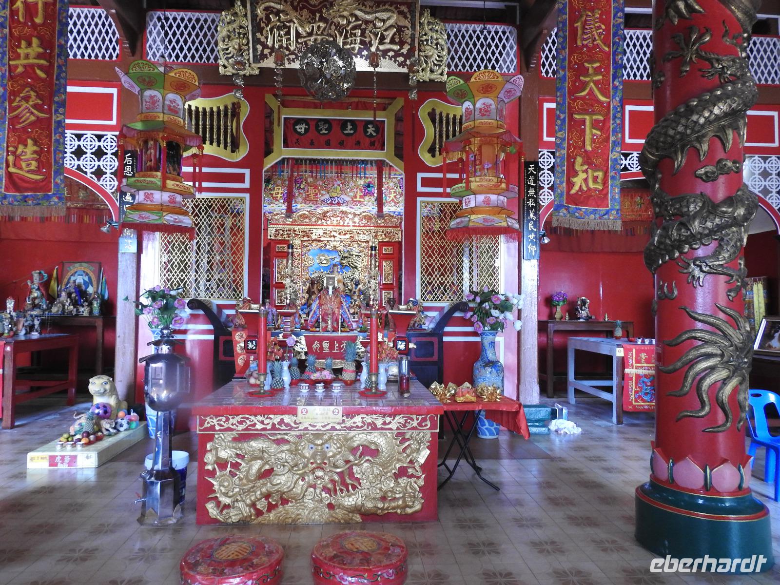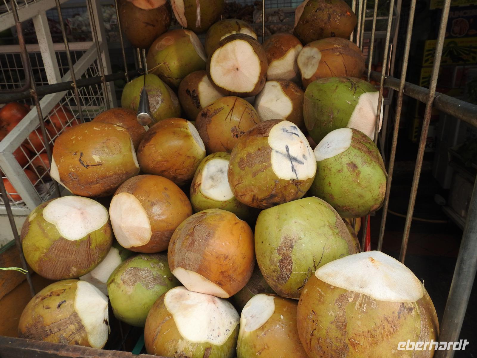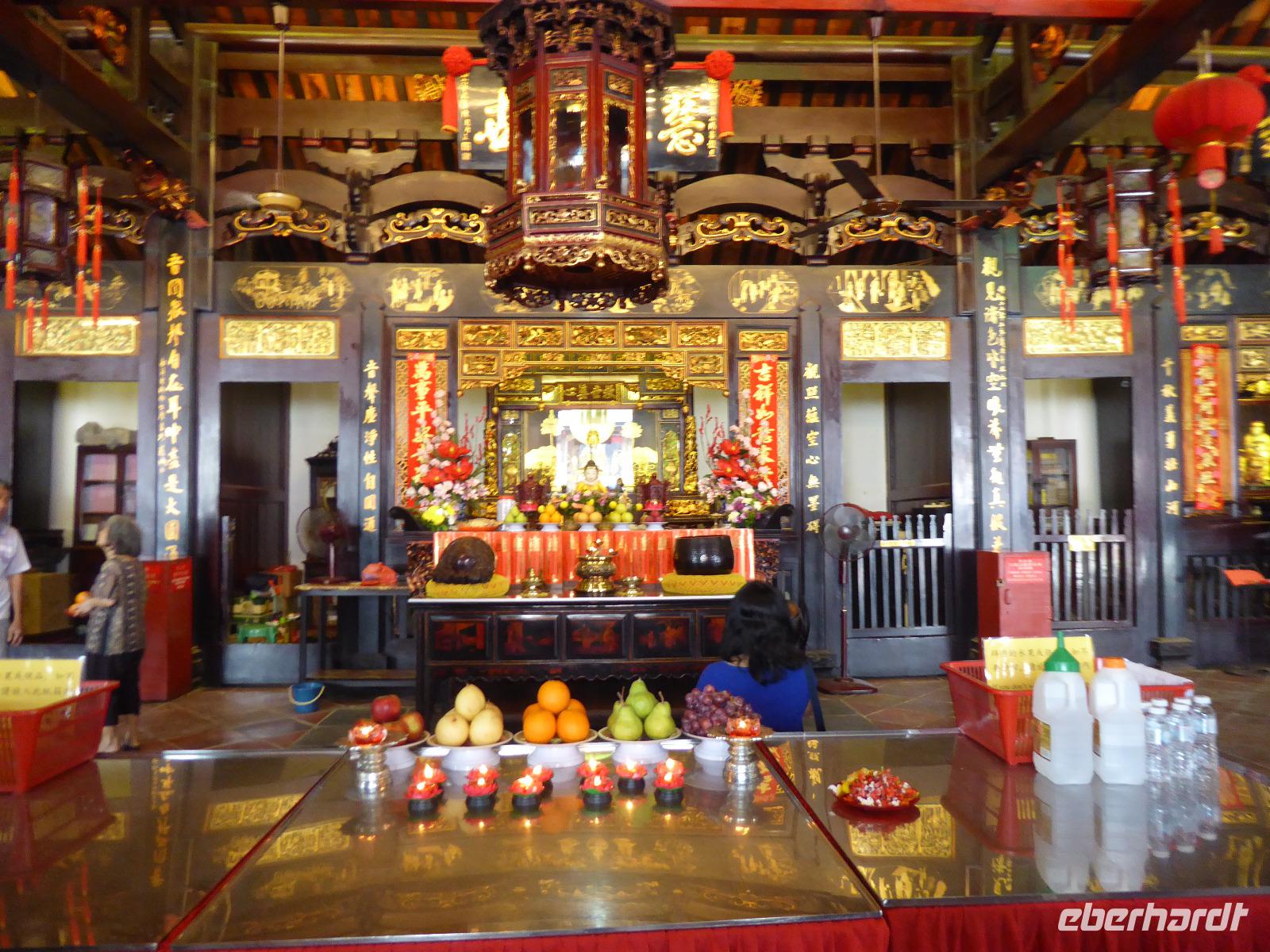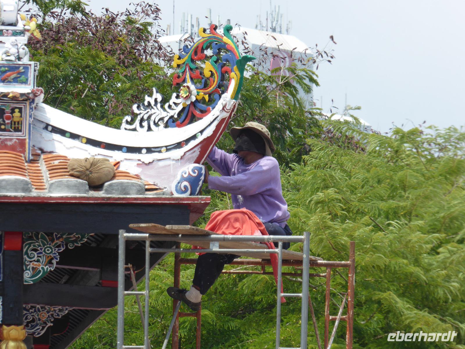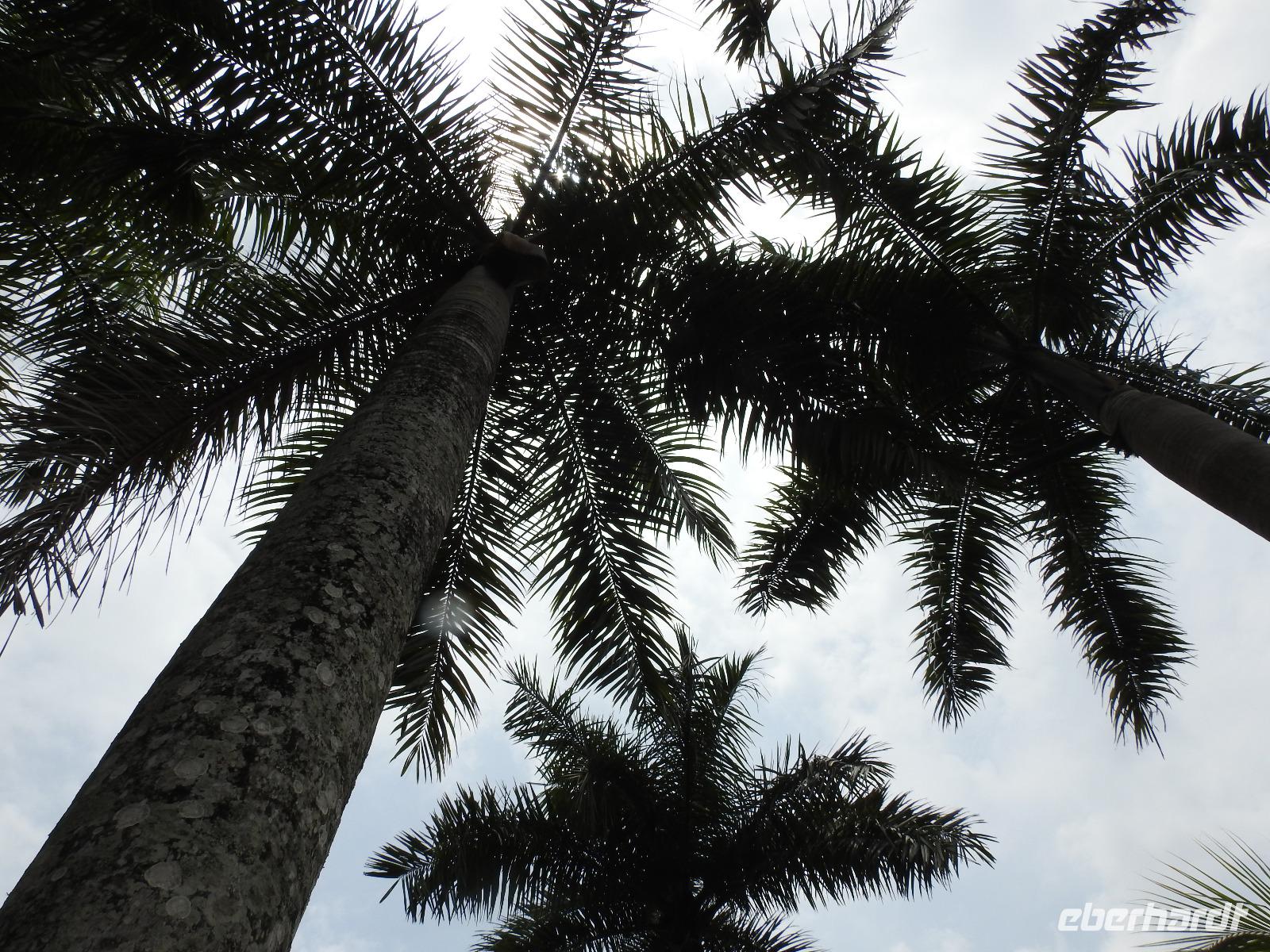 Wir haben uns verabredet, um Acht gemeinsam zu frühstücken. Und so machen wir es auch. Der österreichische Hotelmanager schaut etwas kritisch auf unser Eberhardt-Schild, denn beim Frühstück gibt es freie Platzwahl und man darf nichts reservieren. Gut. Erstens haben wir nichts reserviert, das Schild kam erst mit uns gemeinsam auf den Tisch und zweitens ist ringsum Platz, also lassen wir uns nicht beeindrucken. Das Frühstückbuffet ist reich von Köstlichkeiten. Verschieden Brot- und Brötchensorten, Wurst, Käse, Lachs und Shrimps Cocktail, Eier gekocht und gerührt oder frisch gebraten, Obst und vieles mehr. Da fällt die Auswahl schwer. Nach dem Frühstück gibt es eine Stunde Freizeit, mehr nicht. Warum? Na, um Zehn ist die zweite Sicherheitsübung und anschließend wird die Crew vorgestellt. Der Kapitän hält eine freundliche Rede und anschließend übernimmt die Kreuzfahrtdirektorin Monika aus Brasilien die Regie. So sind wir bis Elf beschäftigt. In der Piano-Bar setzen wir uns nun zusammen, um den Ausflug am Nachmittag zu besprechen. Halb zwölf gibt es die Einweisung für Tauchinteressenten, parallel das Mittagsbuffet. Auch hier lässt der Koch sich nicht lumpen. Von der Vorsuppe über Salatbuffet, vier Hauptspeisen und Obst oder Süßes zum Nachtisch, es gibt alles, was das Herz begehrt. 13.30 Uhr treten wir an zum Ausflug. Wir haben uns für das HISTORISCHE MALAKKA entschieden. Über eine wacklige Gangway (wir liegen auf Reede) hangeln wir uns ins Tenderboot. Ca. zehn Minuten sind es bis zum Land. Dort erwartet uns ein Reisebus, der uns mit weiteren 37 Gästen in ca. 10 Minuten zum Stadtzentrum bringt. Hier beginnt unsere Stadtbesichtigung. Wir befinden uns in der ältesten Stadt Malaysias, die ca. 181.000 Einwohner hat. Schon vom Busfenster aus, ist zu sehen, dass kunterbunte Rikschas hier das Stadtbild bestimmen. Später stellen wir fest, dass aus den Rikschas auch noch ohrenbetäubende Musik erklingt. Ab dem Santiago Tor, das zu den Überresten einer portugiesischen Festung gehört, gehen wir zu Fuß. Es sind schlappe 31 Grad. Unser junger Guide ist nicht zu bremsen. Er erklärt sowohl in Deutsch als auch in Englisch, alles was er über die Geschichte der Stadt weiß und was wir wissen müssen. Und das ist nicht wenig. Während die Englisch sprachigen Gäste ihre Informationen bekommen, haben wir Zeit, die Gebäude in der Nachbarschaft ins Auge bzw. vor die Linse zu nehmen. Links vom Santiago Tor befindet sich das Bastionshaus und rechts die Memorial Hall. Wenn wir Zeit hätten, könnten wir, ohne Eintritt zu bezahlen, hier die Dokumentation von Malaysias Weg zur Unabhängigkeit besichtigen, wozu Urkunden, Verträge, Karten usw. gehören. Wir aber erklimmen den St. Pauls Hügel, wofür wir 150 Treppenstufen bewältigen müssen, die direkt vom Santiago Tor hinaufführen. Auf dem Hügel befindet sich die gleichnamige (und erste) katholische Kirche der Stadt. Hier begruben die Holländer ihre Adligen. Die beeindruckenden Grabplatten sind heute noch zu besichtigen. Vom St. Pauls Hügel steigen wir hinab und kommen zum holländischen Stadthys, das vermutlich 1650 erbaut wurde und damals Sitz der holländischen Gouverneure war. Heute befindet sich hier ein Geschichtsmuseum. Nebenbei bemerkt gibt es in Malakka 30 Museen. Am holländischen Platz finden sich außerdem Zeugnisse der britischen Herrschaft, ein Uhrturm und der Victoria-Brunnen. Durch die Jong-Street gelangen wir zur Straße der Harmonie, die deshalb so heißt, weil sich hier in einer Reihe, eine Moschee, eine christliche Kirche und ein chinesischer Tempel befinden. Den Chen-Hoon-Teng Tempel besichtigen wir auch von Innen. Schöne Holzschnitzereien sind hier zu bewundern und es riecht nach Räucherstäbchen. In einer Nebenstraße nähert sich eine Prozession mit Drachentanz, aber wir haben keine Zeit und dürfen nicht bleiben, um zu schauen. Wir begeben und zum Baba Nyonya Museum, das sich in einem privaten Wohnhaus einer Familie der Nyonyas befindet, weswegen auch das Fotografieren verboten ist. Die Nyonya sind eine eigene Bevölkerungsgruppe, die sich aus der Verheiratung von malayischen Frauen und chinesischen Männern entwickelt hat. Den Abschluss unserer Stadtbesichtigung bildet eine Bootsfahrt auf dem Melaka-Fluss, bei der wir nochmal einen Blick auf die bunt angestrichenen Häuser haben und vor allem Leguane unsere Aufmerksamkeit erregen. Mit vier Gästen Verlust (natürlich nicht von unserer Gruppe) erreichen wir schließlich das letzte Tenderboot, das um 17.30 Uhr zur Star Clipper fährt. Um 18 Uhr verlassen wir Malakka und nehmen Kurs auf Langkawi. Nach einem üppigen Abendessen kann man entweder die bordeigene Modenschau besuchen oder sich aufs Ohr legen. Gute Nacht, ihr Lieben, bis Morgen!