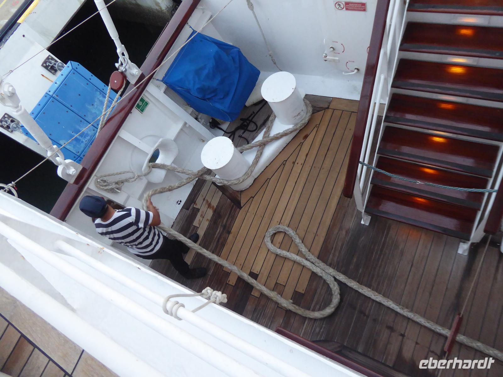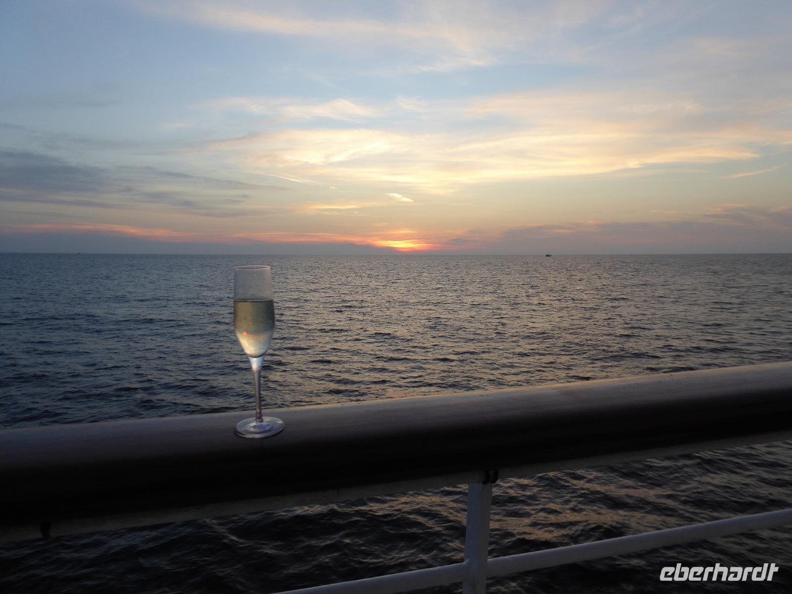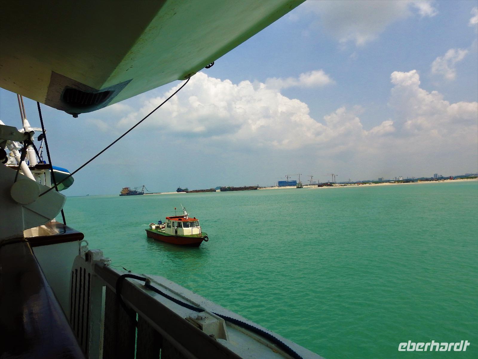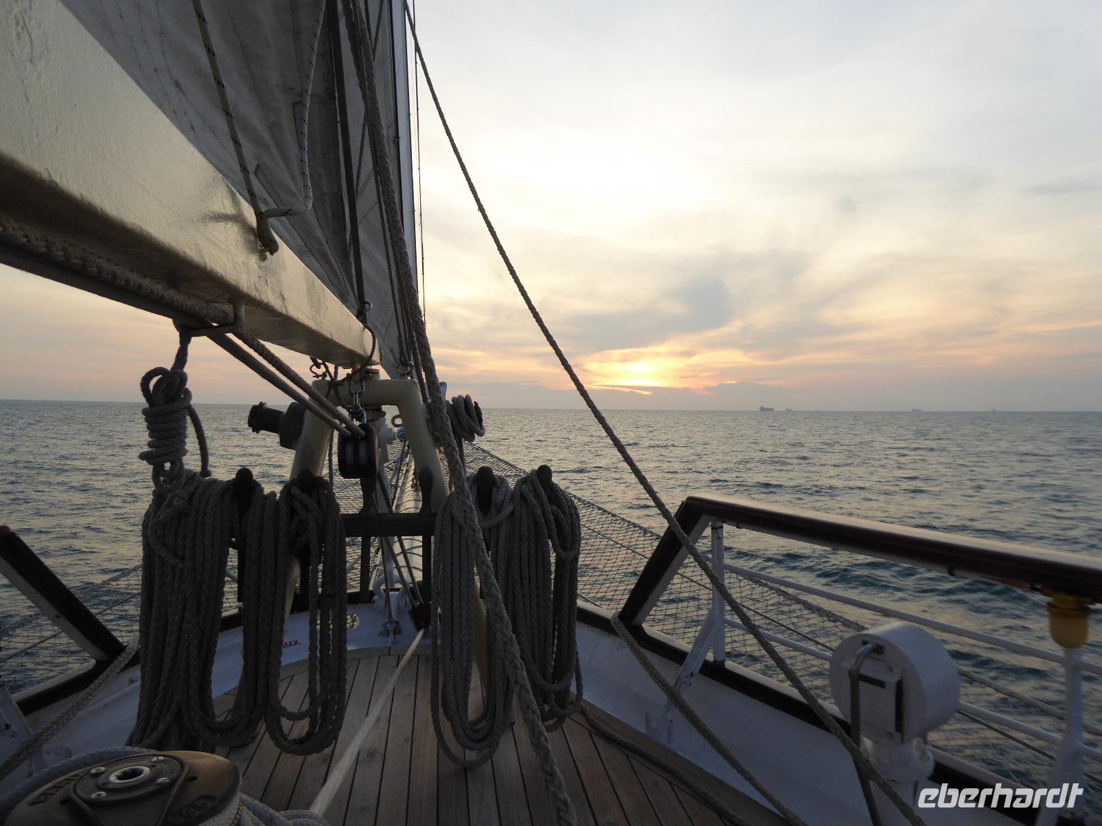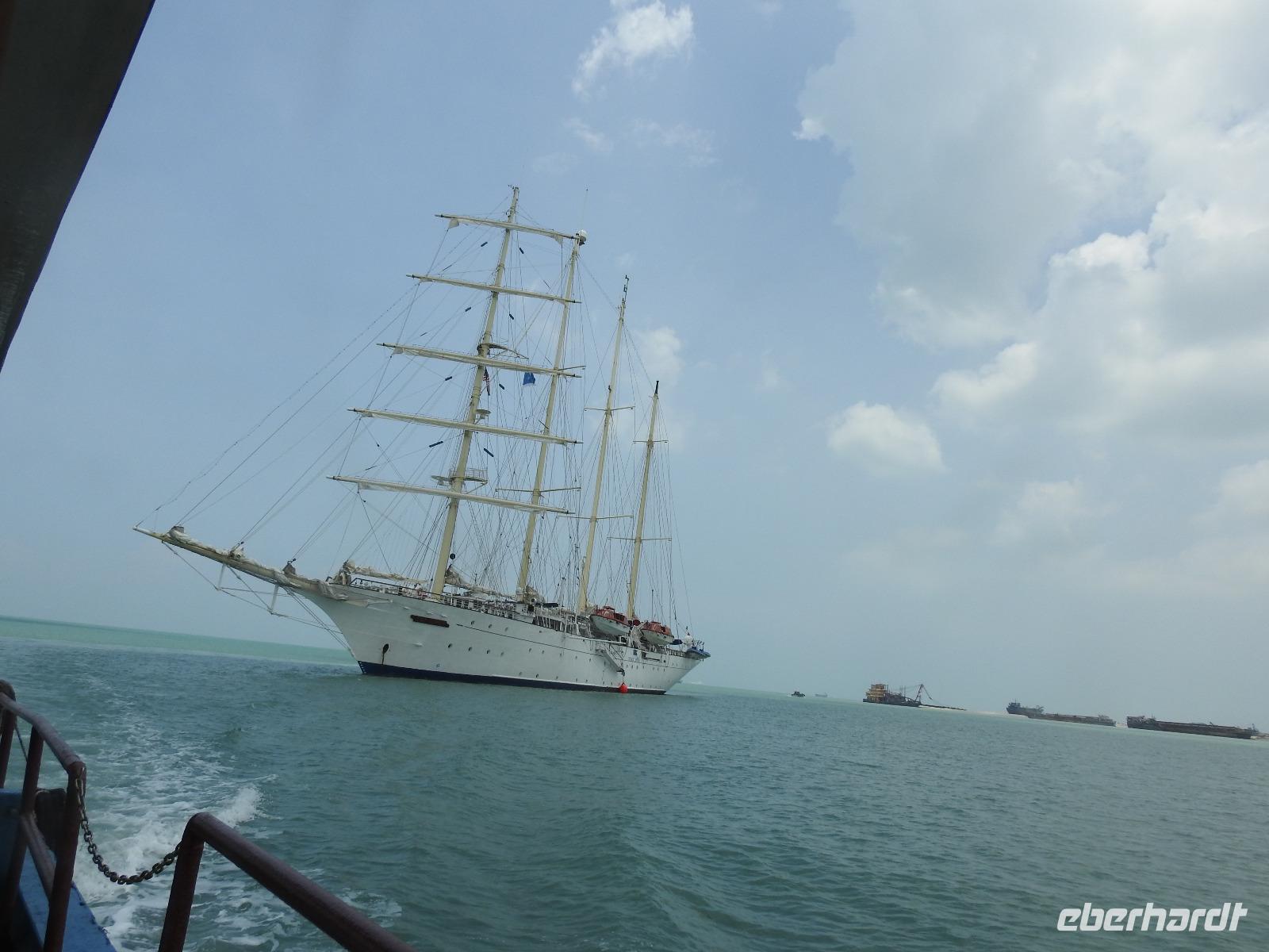 Am Vormittag ist Freizeit angesagt. Man könnte ausschlafen oder noch einmal die Stadt unsicher machen. Um 12 müssen wir auschecken und um 13 Uhr holt uns David mit dem Bus ab. Wir fahren zum Hafen, den wir nach ca. 20 Minuten erreichen. Aufs Schiff dürfen wir erst um 16 Uhr. Na so was. Hm. Also 2,5 Stunden Wartezeit. Da lässt sich am Programm doch etwas optimieren. Irgendwann ist die Zeit um und wir werden eingelassen. Zunächst müssen wir den Pass und den Voucher vorzeigen, dann unser Handgepäck kontrollieren lassen. Als nächstes gilt es, Formulare auszufüllen. 1x Einreiseformular, 1x Gesundheitsformular, 1x Haftungsausschlussformular - fertig. Die Papiere werden abgegeben und wir bekommen unsere Bordkarte. Gemeinsam gehen wir zur Passkontrolle. Wir verlassen Singapur und reisen aus nach ? Thailand? Wahrscheinlich, denn auf einem Formular müssen wir unsere Adresse in Thailand angeben. Naja, fahren wir nicht erst nach Malaysia? Egal, wen interessierts. Nochmal Passkontrolle und Voucher und Bordkarte. Irgendwann sind wir an Bord. Anstellen an der Bibliothek. Hier geben wir den Pass ab und die Kreditkarte an bzw. 300 € Deposit pro Kabine, wer keine Kreditkarte hat. Wir bekommen unsere Kabinenschlüssel - noch richtig old school - richtige Schlüssel aus Metall mit Schlüsselanhänger dran. An Deck gibt es einen Begrüßungstrunk und einen Imbiss. 18.30 Uhr müssen sich alle mit angezogener Schwimmweste an ihrer Musterstation einfinden. Dort findet eine Anwesenheitskontrolle statt und wir werden zum Verhalten im Notfall belehrt. Der Verantwortliche für unser Rettungsboot rät uns, nicht in ein anderes einzusteigen, denn nur in unserem gibt es Kaviar und Lachs. Nach der Rettungsübung bringen wir schnell unsere Schwimmwesten zurück in die Kabine, denn 19 Uhr legen wir ab und verlassen Singapur. Während die Melodie von Conquest of Paradise erklingt, werden zum ersten Mal die Segel gesetzt und mit einem Glas Sekt in der Hand und viel Gänsehautgefühl beginnt unsere Segelkreuzfahrt. Ahoi, meine lieben Gäste!