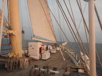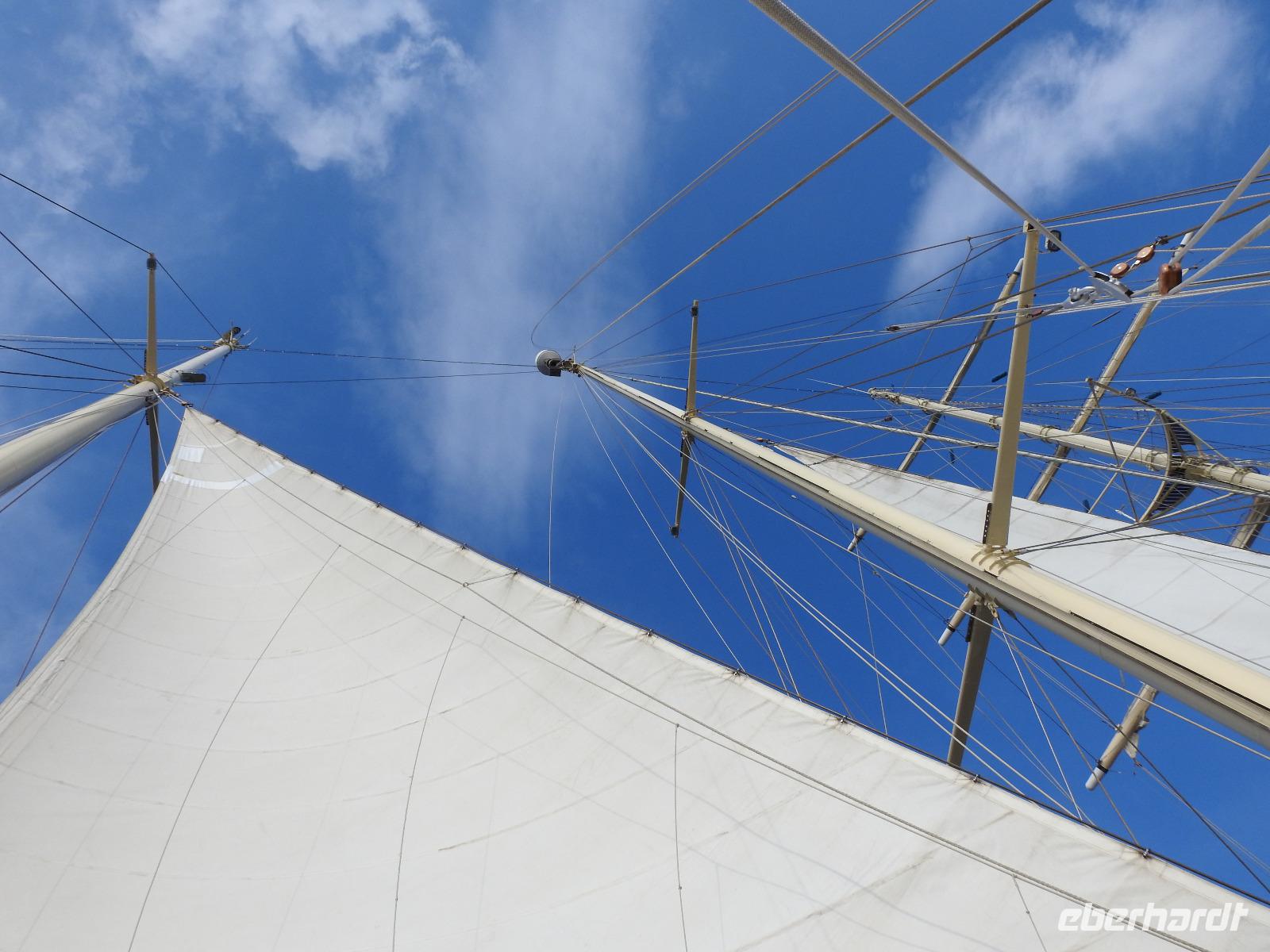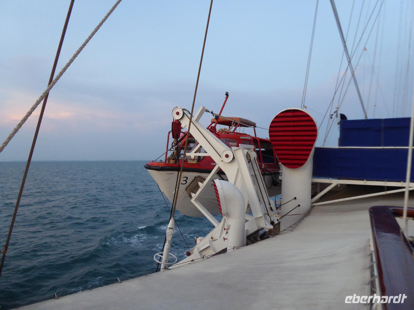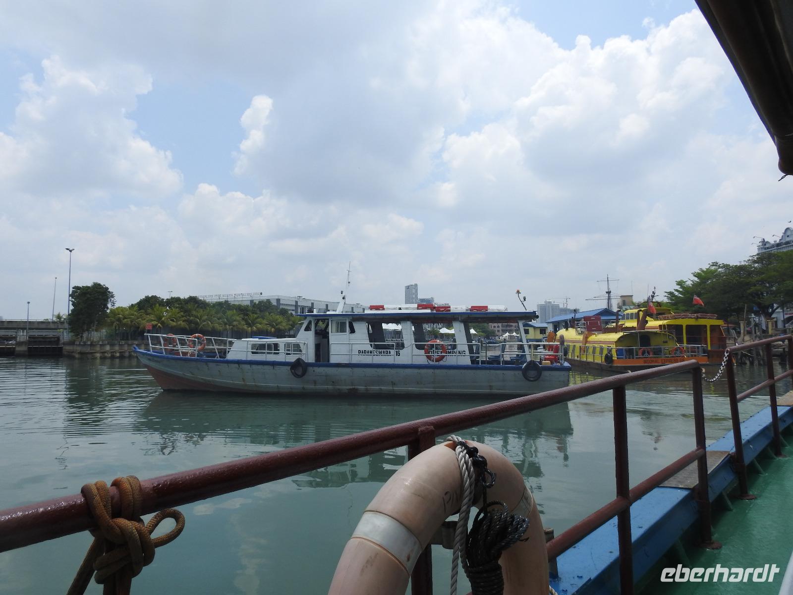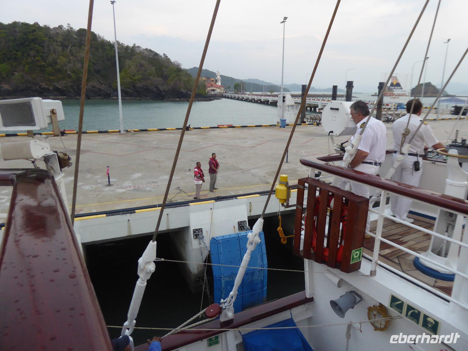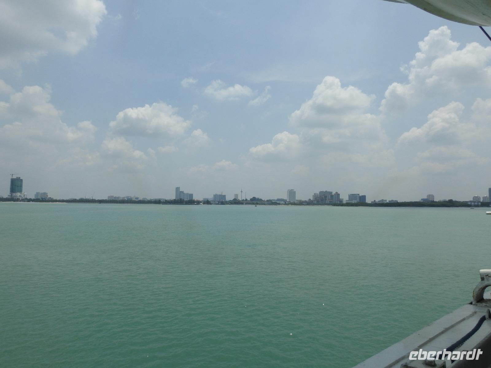 Am Vormittag ist Freizeit angesagt. Man könnte ausschlafen oder noch einmal die Stadt unsicher machen. Um 12 müssen wir auschecken und um 13 Uhr holt uns David mit dem Bus ab. Wir fahren zum Hafen, den wir nach ca. 20 Minuten erreichen. Aufs Schiff dürfen wir erst um 16 Uhr. Na so was. Hm. Also 2,5 Stunden Wartezeit. Da lässt sich am Programm doch etwas optimieren. Irgendwann ist die Zeit um und wir werden eingelassen. Zunächst müssen wir den Pass und den Voucher vorzeigen, dann unser Handgepäck kontrollieren lassen. Als nächstes gilt es, Formulare auszufüllen. 1x Einreiseformular, 1x Gesundheitsformular, 1x Haftungsausschlussformular - fertig. Die Papiere werden abgegeben und wir bekommen unsere Bordkarte. Gemeinsam gehen wir zur Passkontrolle. Wir verlassen Singapur und reisen aus nach ? Thailand? Wahrscheinlich, denn auf einem Formular müssen wir unsere Adresse in Thailand angeben. Naja, fahren wir nicht erst nach Malaysia? Egal, wen interessierts. Nochmal Passkontrolle und Voucher und Bordkarte. Irgendwann sind wir an Bord. Anstellen an der Bibliothek. Hier geben wir den Pass ab und die Kreditkarte an bzw. 300 € Deposit pro Kabine, wer keine Kreditkarte hat. Wir bekommen unsere Kabinenschlüssel - noch richtig old school - richtige Schlüssel aus Metall mit Schlüsselanhänger dran. An Deck gibt es einen Begrüßungstrunk und einen Imbiss. 18.30 Uhr müssen sich alle mit angezogener Schwimmweste an ihrer Musterstation einfinden. Dort findet eine Anwesenheitskontrolle statt und wir werden zum Verhalten im Notfall belehrt. Der Verantwortliche für unser Rettungsboot rät uns, nicht in ein anderes einzusteigen, denn nur in unserem gibt es Kaviar und Lachs. Nach der Rettungsübung bringen wir schnell unsere Schwimmwesten zurück in die Kabine, denn 19 Uhr legen wir ab und verlassen Singapur. Während die Melodie von Conquest of Paradise erklingt, werden zum ersten Mal die Segel gesetzt und mit einem Glas Sekt in der Hand und viel Gänsehautgefühl beginnt unsere Segelkreuzfahrt. Ahoi, meine lieben Gäste!