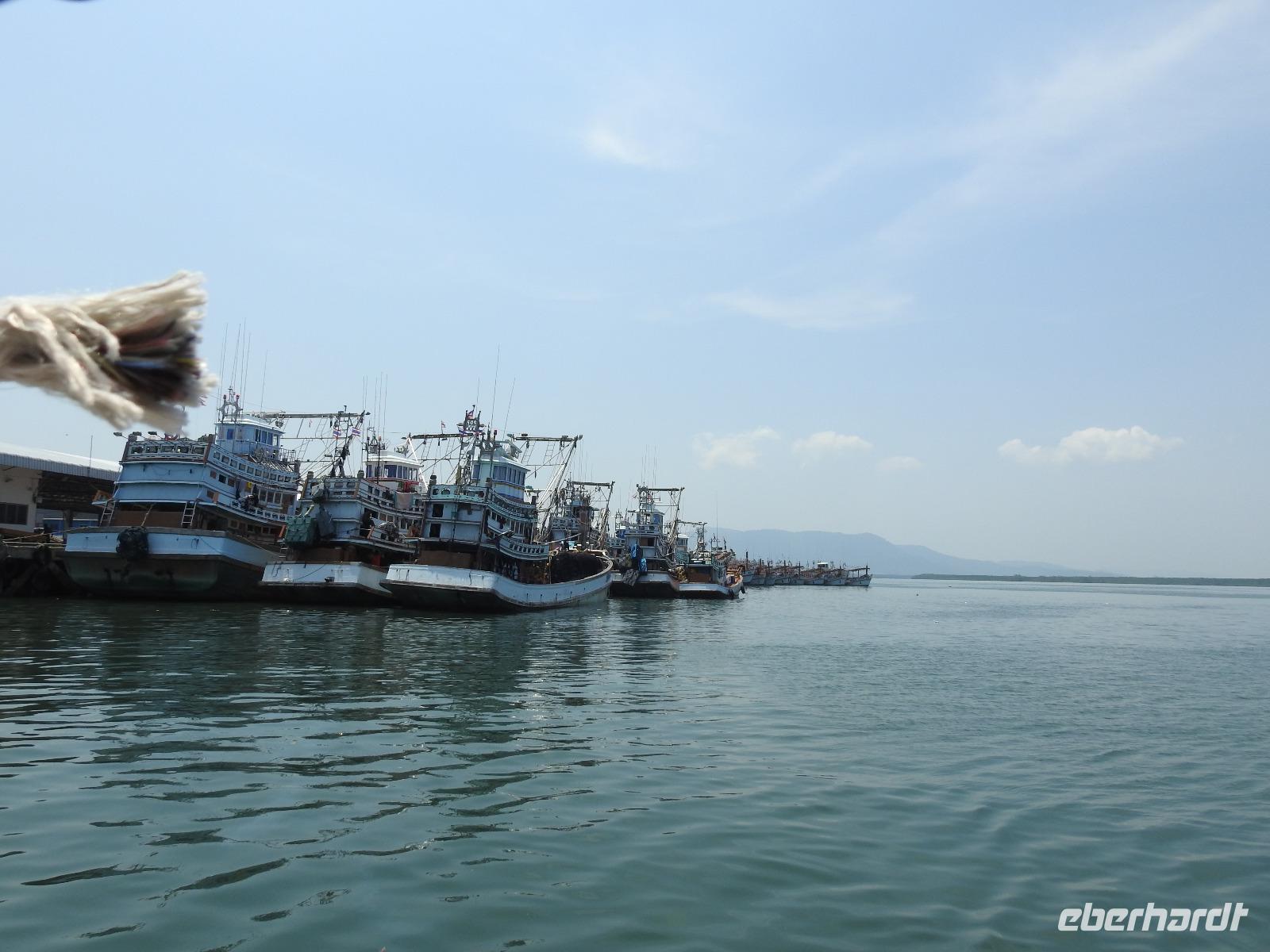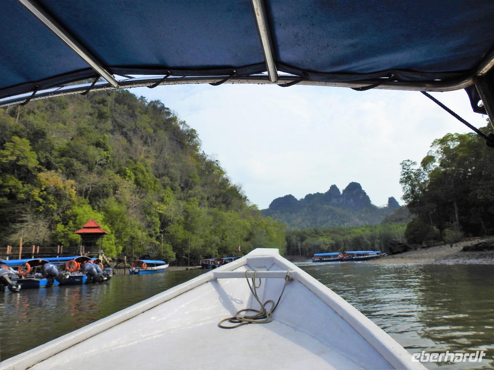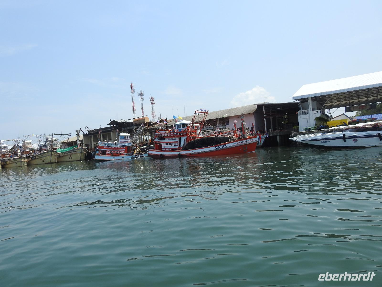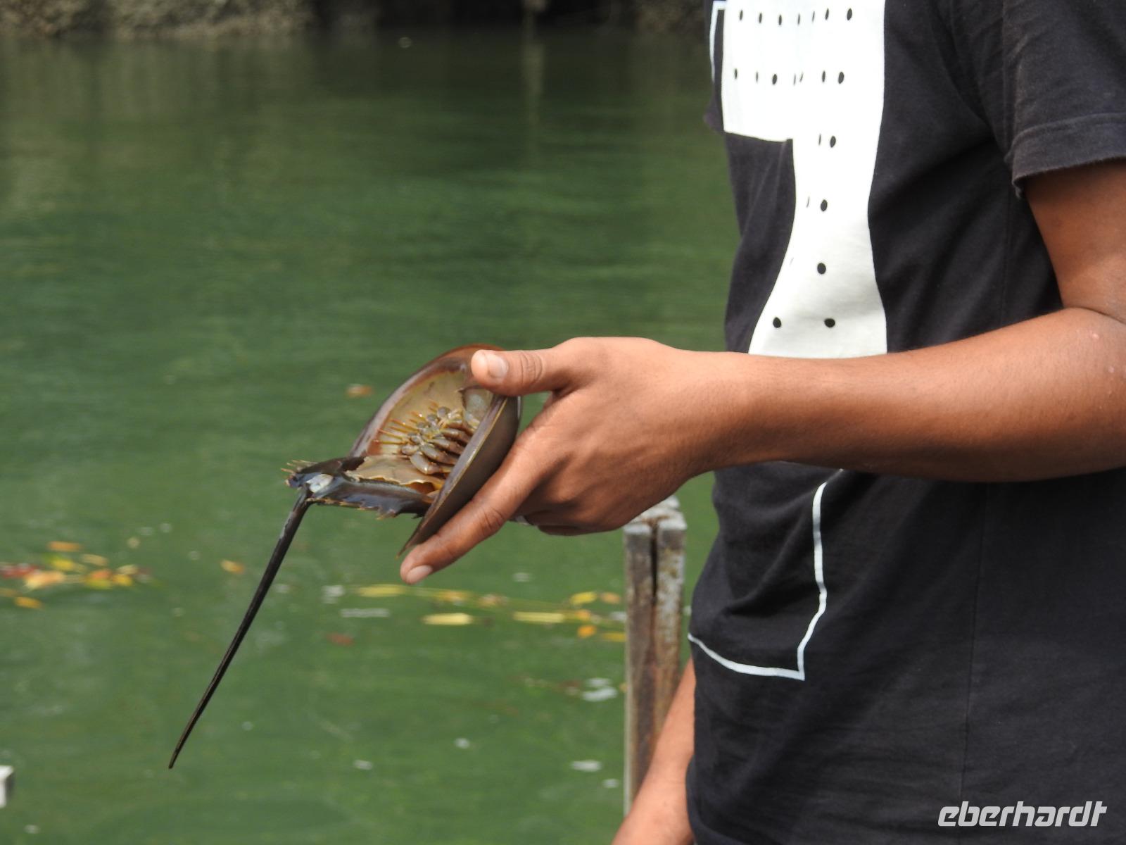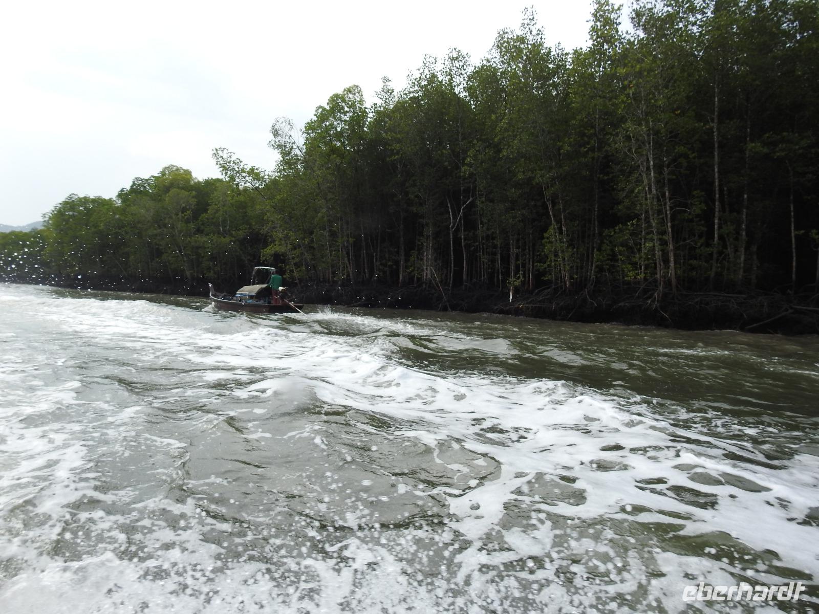 Pünktlich um acht legen wir in Langkawi an. Wir haben heute alle den selben Ausflug gebucht, wir nehmen an der Inselrundfahrt teil. Unser örtlicher Guide ist ein Deutscher namens Josef. Wir fahren eine knappe Stunde im klimatisierten Reisebus bis zu einem Mangrovenwald, wo wir in ein Schnellboot umsteigen. Da im Boot nicht für alle Gäste Platz ist, gelingt es uns, für unser kleines Grüppchen ein eigenes Boot zu kapern. So haben wir viel Platz und Spaß. Unser Bootsführer hat ebenfalls Spaß, indem er mit uns rasante Kurven fährt. Erst nach einer Weile wird es ruhiger und dann bleiben die Boote ganz stehen. Oh, jetzt wissen wir auch warum. In dieser Bucht sind die Seeadler unterwegs. Nach diesen ist auch die Insel benannt (Lang = Adler, Kawi = weiß-braun). Wir haben viel Zeit, die schönen Vögel zu beobachten, wie sie ihre Schwingen strecken und auf der Suche nach Futter ins Wasser eintauchen. Nach etwa einer Stunde sind wir zurück am Ausgangspunkt. Man kann die Toiletten hier aufsuchen, muss aber mit anderen, als europäischen Gepflogenheiten zurechtkommen. Unseren nächsten Stopp legen wir bei den schwimmenden Häusern ein. Hier befindet sich eine Fischfarm, wo üblicherweise Fisch verkauft wird, inzwischen aber auch Touristen seltene Fische gezeigt werden. Wir beginnen mit einem Rochen, der sich durch das Plätschern der Hand unseres Vorführers angezogen fühlt und zeigt. Nun kommt etwas sehr Ungewöhnliches. Eine Art Krebs, der aussieht wie aus einem Sience Fiction Film. Oder wie ein Tier aus der Urzeit, so soll es wohl auch sein. Anschließend wird es lustig. Wir lernen eine Fischart kennen, die ihr Futter (Insekten) von Blätter spucken kann. In unserem Fall sind es Brotstückchen, die unser Vorführer an die Bohlen klebt. Und tatsächlich dauert es nicht lange und die Fische spucken so gezielt, dass das Brotstückchen ins Wasser fällt. Genial. Wir besuchen eine Familie, die noch auf traditionelle Weise Kautschuk aus Kautschukbäumen gewinnt. Die Dame des Hauses zeigt uns, wie sie mit einem spitzen Gerät, spiralförmige Rillen in den Baum schneidet, aus dem das weiße Kautschuk in darunter stehende Becherchen läuft. Zum Mittagessen kehren wir in ein Thai-Malayisches Restaurant ein. Hier werden wir regelrecht gefüttert. Es gibt so viele leckere Speisen, dass wir gar nicht alles aufessen können. Auf dem Rückweg besuchen wir ein Mausoleum für eine malayische Prinzessin und ein Reismuseum. Die Sage über die verehrte malayische Prinzessin besagt, dass diese, aus Neid von anderen Frauen des Ehebruchs bezichtigt und deshalb zum Tode verurteilt wurde. Einige Versuche, sieumzubringen scheiterten und schließlich wurde sie erdolcht. Das aus der Wunde austretende Blut hatte eine weiße Farbe, was die Unschuld der Frau bewies. Diese hatte jedoch die Inselbewohner für sieben Generationen verflucht. Zum Glück ist diese Zeit vorbei und den Malaien geht es heutzutage richtig gut. Im Reismuseum gibt es verschiedene Reissorten zu sehen, Reis in unterschiedlichen Wachstumsstadien und viele Geräte, die traditionell für den Reisanbau benötigt wurden. Mit diesen vielen neuen Eindrücken im Gepäck kehren wir zum Schiff zurück. Um 17 Uhr gibt es einen Imbiss und 17.30 Uhr verlassen wir Langkawi und nehmen Kurs auf Thailand.