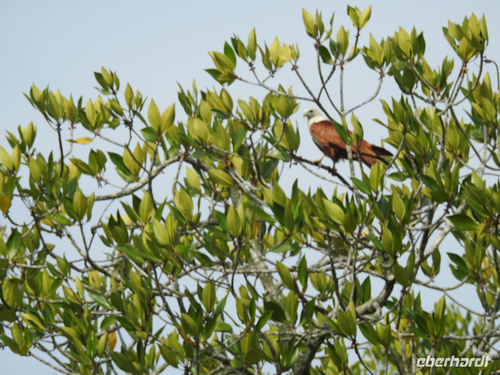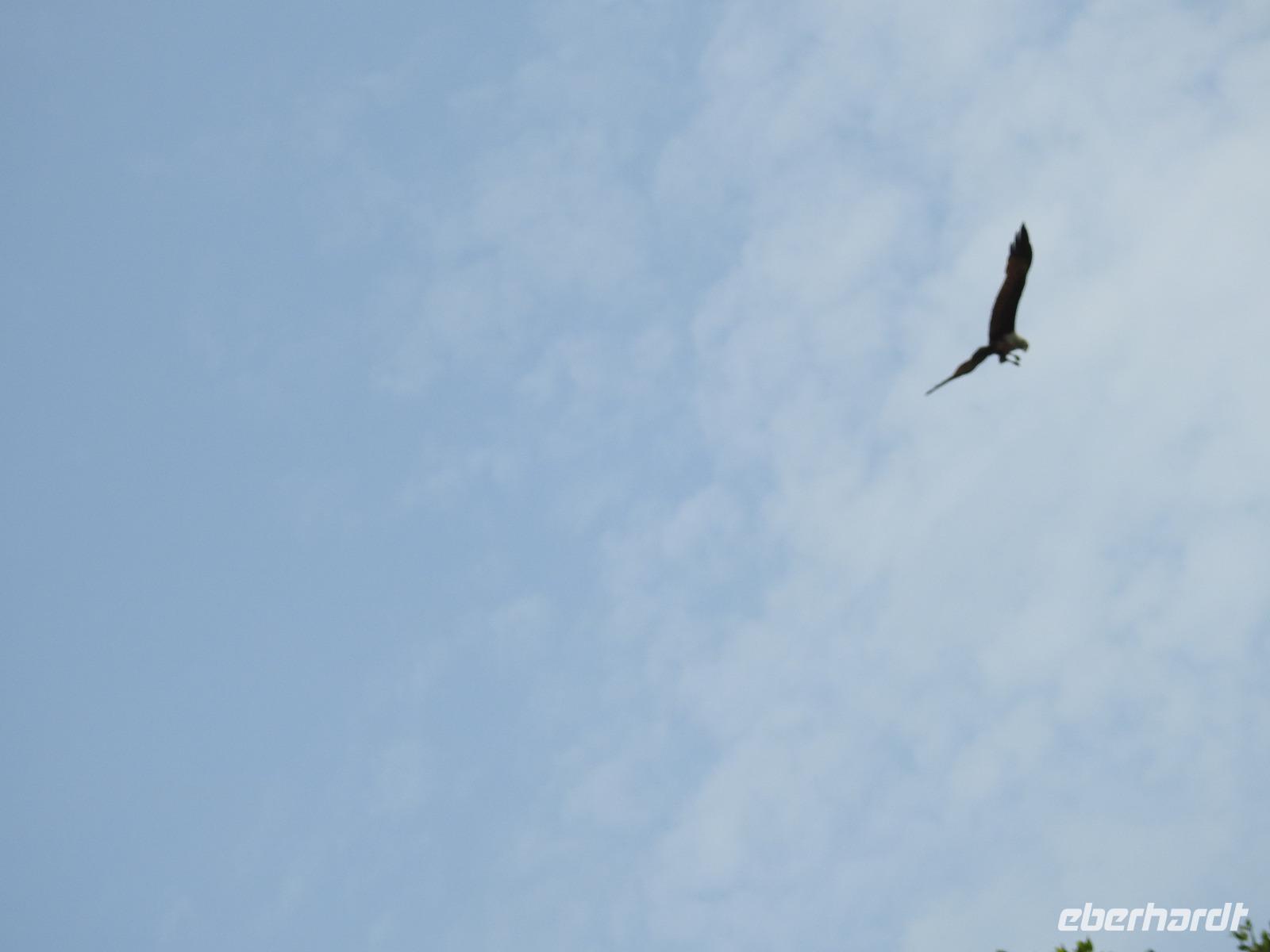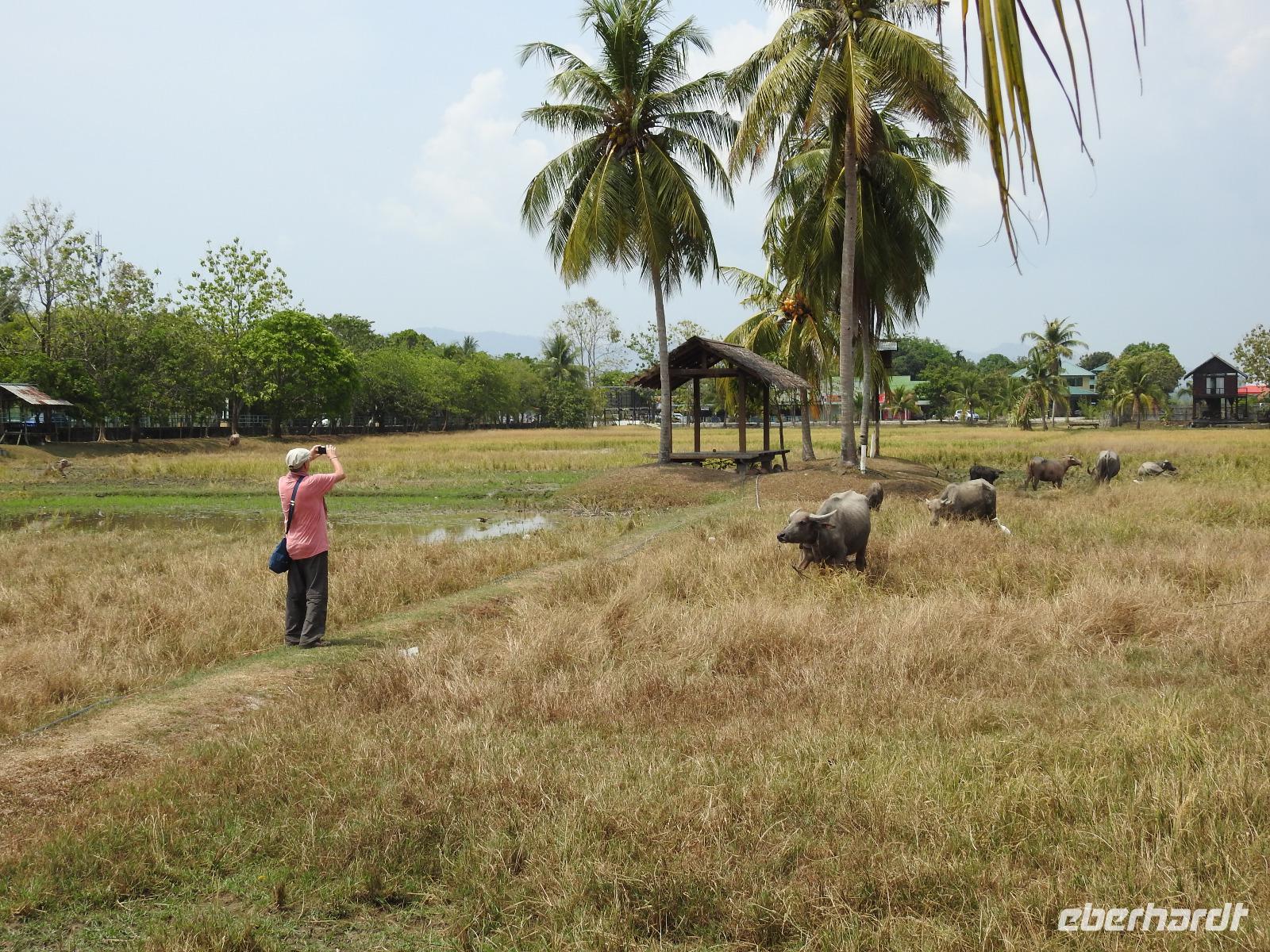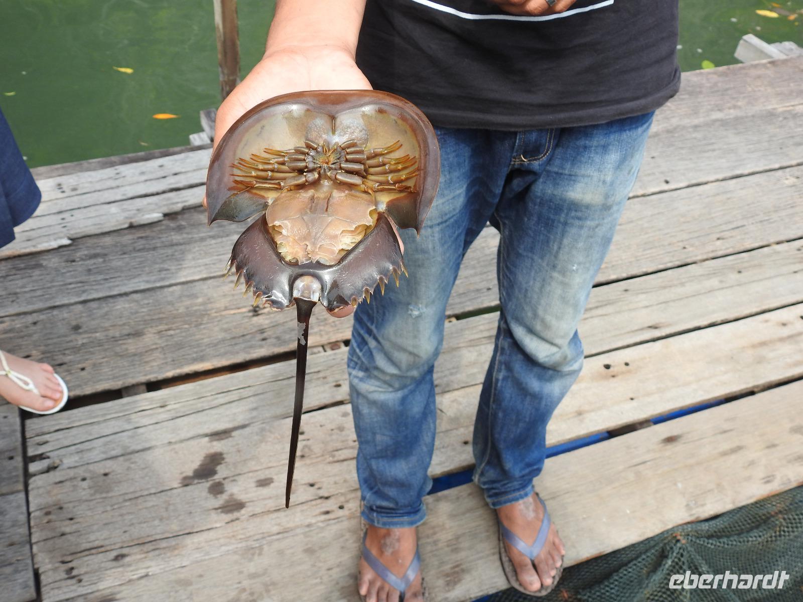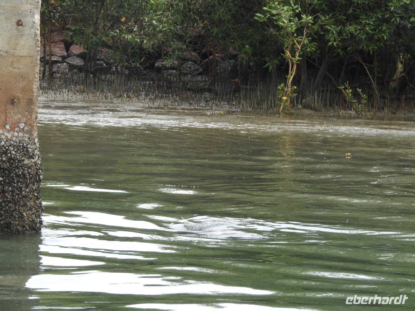 Pünktlich um acht legen wir in Langkawi an. Wir haben heute alle den selben Ausflug gebucht, wir nehmen an der Inselrundfahrt teil. Unser örtlicher Guide ist ein Deutscher namens Josef. Wir fahren eine knappe Stunde im klimatisierten Reisebus bis zu einem Mangrovenwald, wo wir in ein Schnellboot umsteigen. Da im Boot nicht für alle Gäste Platz ist, gelingt es uns, für unser kleines Grüppchen ein eigenes Boot zu kapern. So haben wir viel Platz und Spaß. Unser Bootsführer hat ebenfalls Spaß, indem er mit uns rasante Kurven fährt. Erst nach einer Weile wird es ruhiger und dann bleiben die Boote ganz stehen. Oh, jetzt wissen wir auch warum. In dieser Bucht sind die Seeadler unterwegs. Nach diesen ist auch die Insel benannt (Lang = Adler, Kawi = weiß-braun). Wir haben viel Zeit, die schönen Vögel zu beobachten, wie sie ihre Schwingen strecken und auf der Suche nach Futter ins Wasser eintauchen. Nach etwa einer Stunde sind wir zurück am Ausgangspunkt. Man kann die Toiletten hier aufsuchen, muss aber mit anderen, als europäischen Gepflogenheiten zurechtkommen. Unseren nächsten Stopp legen wir bei den schwimmenden Häusern ein. Hier befindet sich eine Fischfarm, wo üblicherweise Fisch verkauft wird, inzwischen aber auch Touristen seltene Fische gezeigt werden. Wir beginnen mit einem Rochen, der sich durch das Plätschern der Hand unseres Vorführers angezogen fühlt und zeigt. Nun kommt etwas sehr Ungewöhnliches. Eine Art Krebs, der aussieht wie aus einem Sience Fiction Film. Oder wie ein Tier aus der Urzeit, so soll es wohl auch sein. Anschließend wird es lustig. Wir lernen eine Fischart kennen, die ihr Futter (Insekten) von Blätter spucken kann. In unserem Fall sind es Brotstückchen, die unser Vorführer an die Bohlen klebt. Und tatsächlich dauert es nicht lange und die Fische spucken so gezielt, dass das Brotstückchen ins Wasser fällt. Genial. Wir besuchen eine Familie, die noch auf traditionelle Weise Kautschuk aus Kautschukbäumen gewinnt. Die Dame des Hauses zeigt uns, wie sie mit einem spitzen Gerät, spiralförmige Rillen in den Baum schneidet, aus dem das weiße Kautschuk in darunter stehende Becherchen läuft. Zum Mittagessen kehren wir in ein Thai-Malayisches Restaurant ein. Hier werden wir regelrecht gefüttert. Es gibt so viele leckere Speisen, dass wir gar nicht alles aufessen können. Auf dem Rückweg besuchen wir ein Mausoleum für eine malayische Prinzessin und ein Reismuseum. Die Sage über die verehrte malayische Prinzessin besagt, dass diese, aus Neid von anderen Frauen des Ehebruchs bezichtigt und deshalb zum Tode verurteilt wurde. Einige Versuche, sieumzubringen scheiterten und schließlich wurde sie erdolcht. Das aus der Wunde austretende Blut hatte eine weiße Farbe, was die Unschuld der Frau bewies. Diese hatte jedoch die Inselbewohner für sieben Generationen verflucht. Zum Glück ist diese Zeit vorbei und den Malaien geht es heutzutage richtig gut. Im Reismuseum gibt es verschiedene Reissorten zu sehen, Reis in unterschiedlichen Wachstumsstadien und viele Geräte, die traditionell für den Reisanbau benötigt wurden. Mit diesen vielen neuen Eindrücken im Gepäck kehren wir zum Schiff zurück. Um 17 Uhr gibt es einen Imbiss und 17.30 Uhr verlassen wir Langkawi und nehmen Kurs auf Thailand.