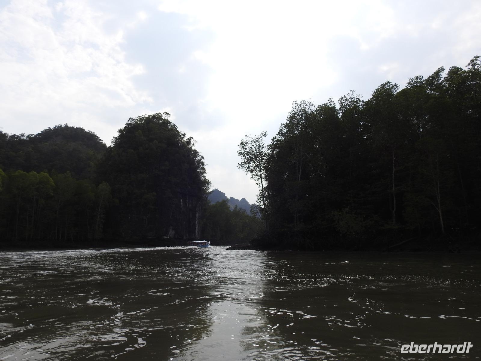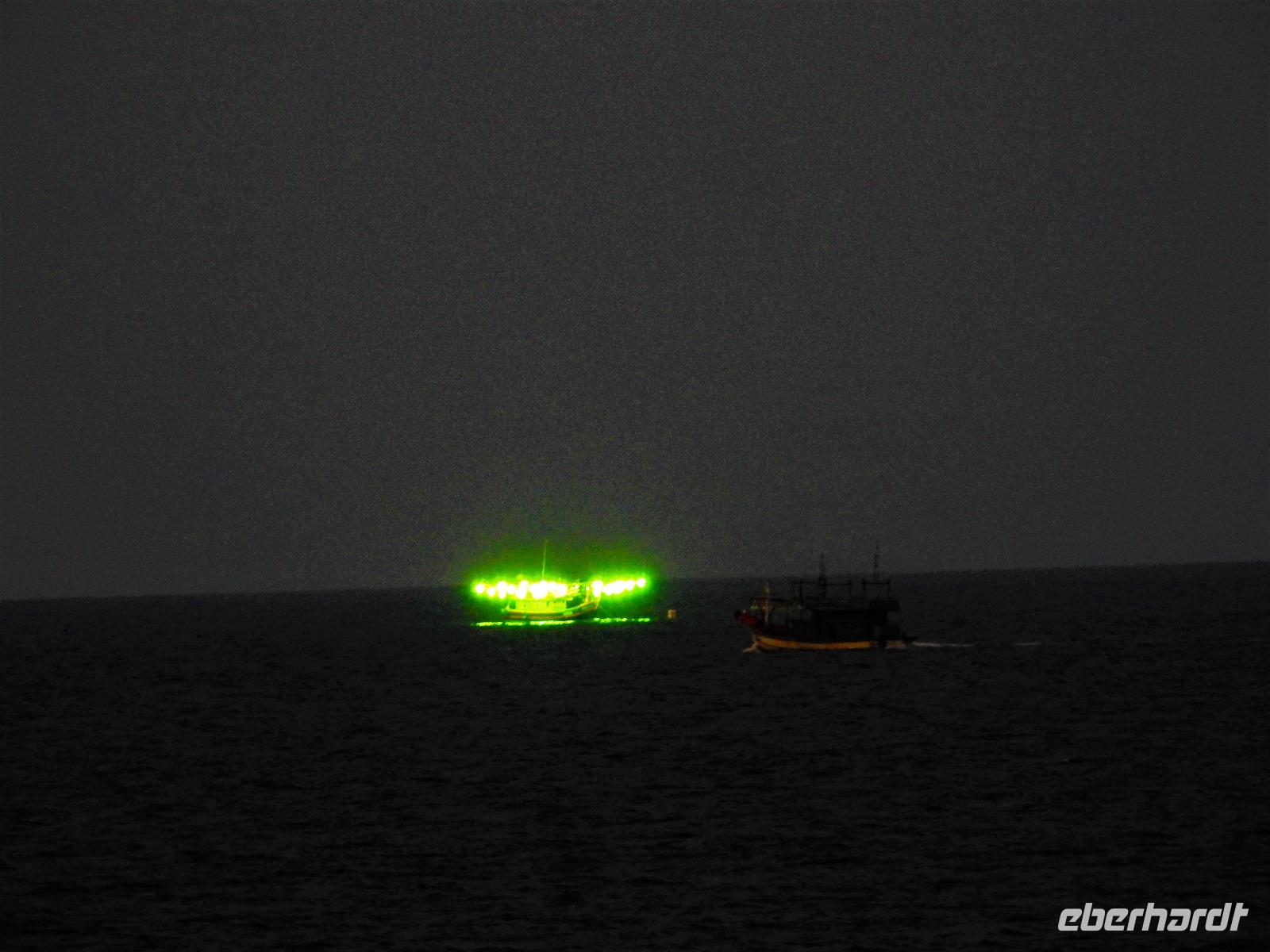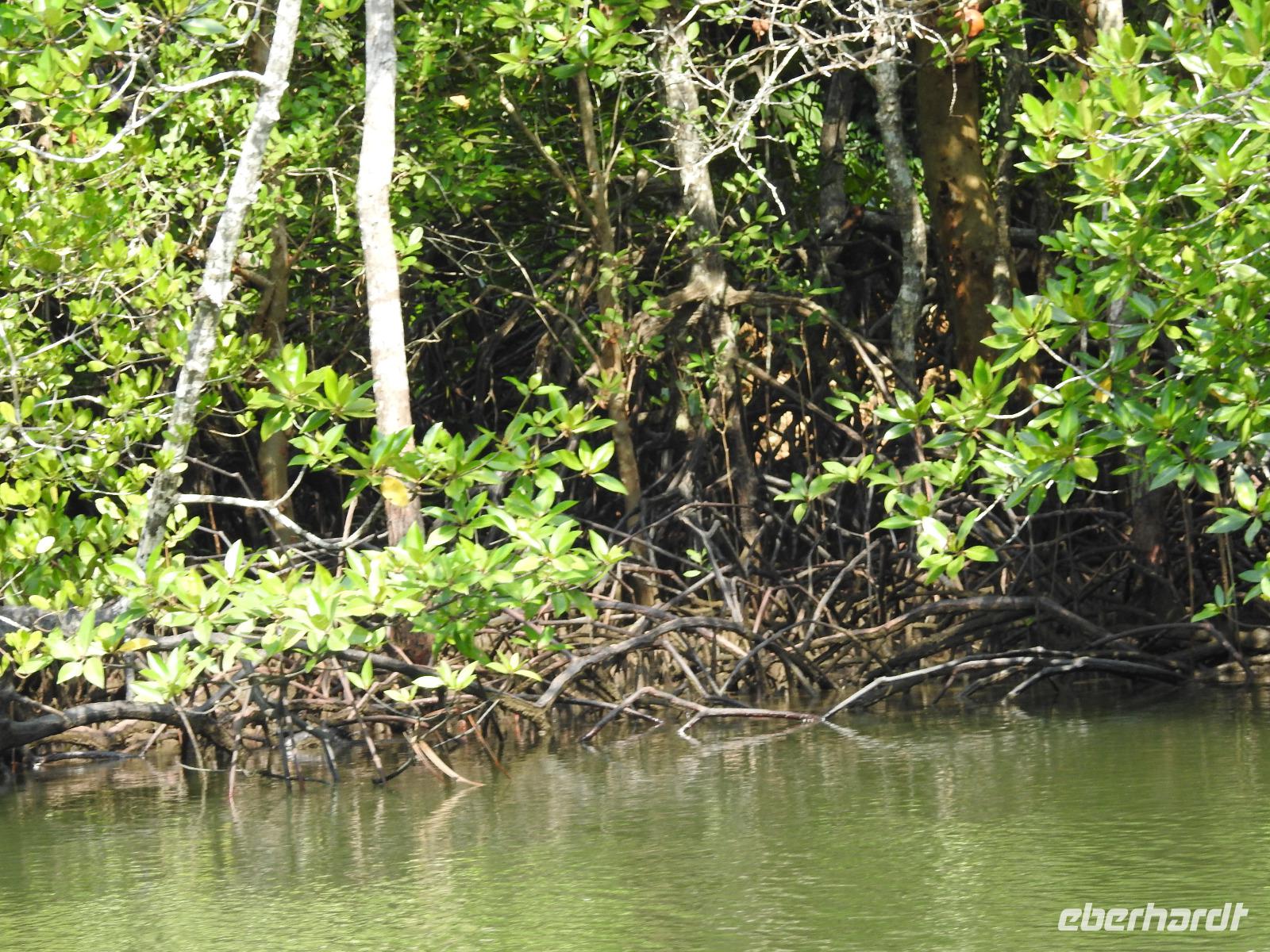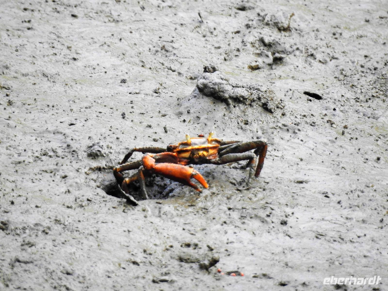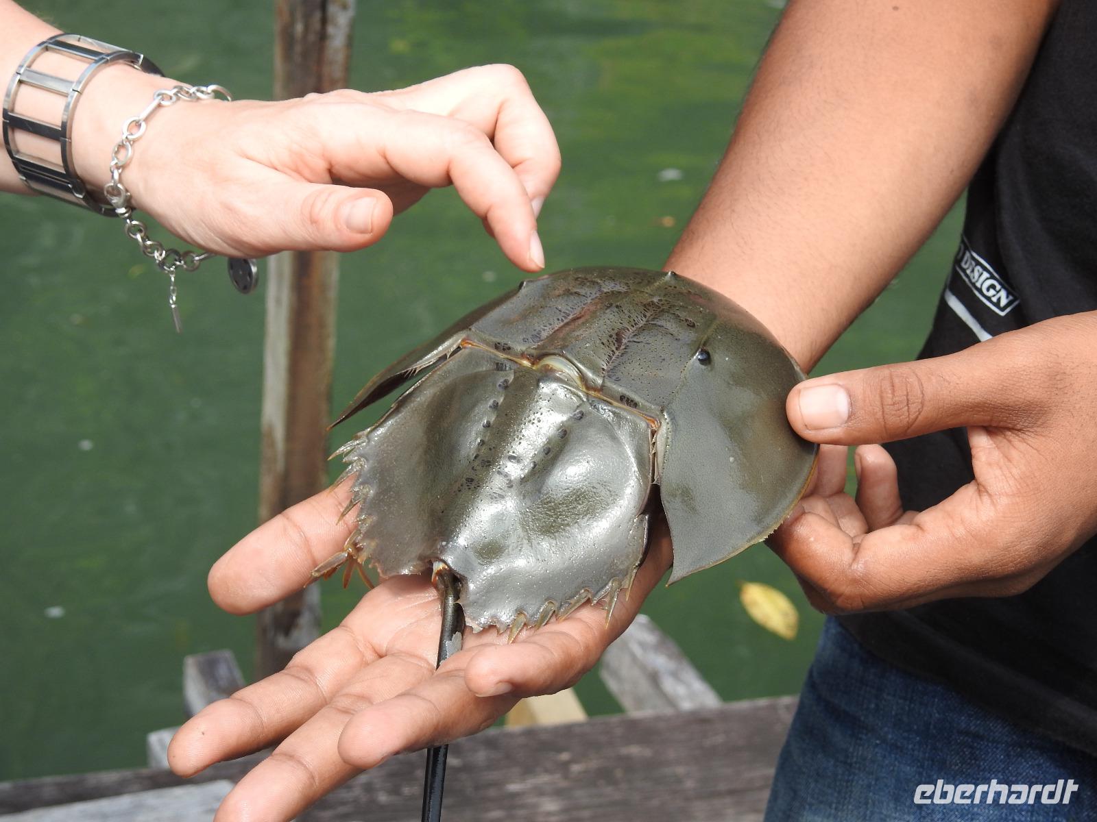 Pünktlich um acht legen wir in Langkawi an. Wir haben heute alle den selben Ausflug gebucht, wir nehmen an der Inselrundfahrt teil. Unser örtlicher Guide ist ein Deutscher namens Josef. Wir fahren eine knappe Stunde im klimatisierten Reisebus bis zu einem Mangrovenwald, wo wir in ein Schnellboot umsteigen. Da im Boot nicht für alle Gäste Platz ist, gelingt es uns, für unser kleines Grüppchen ein eigenes Boot zu kapern. So haben wir viel Platz und Spaß. Unser Bootsführer hat ebenfalls Spaß, indem er mit uns rasante Kurven fährt. Erst nach einer Weile wird es ruhiger und dann bleiben die Boote ganz stehen. Oh, jetzt wissen wir auch warum. In dieser Bucht sind die Seeadler unterwegs. Nach diesen ist auch die Insel benannt (Lang = Adler, Kawi = weiß-braun). Wir haben viel Zeit, die schönen Vögel zu beobachten, wie sie ihre Schwingen strecken und auf der Suche nach Futter ins Wasser eintauchen. Nach etwa einer Stunde sind wir zurück am Ausgangspunkt. Man kann die Toiletten hier aufsuchen, muss aber mit anderen, als europäischen Gepflogenheiten zurechtkommen. Unseren nächsten Stopp legen wir bei den schwimmenden Häusern ein. Hier befindet sich eine Fischfarm, wo üblicherweise Fisch verkauft wird, inzwischen aber auch Touristen seltene Fische gezeigt werden. Wir beginnen mit einem Rochen, der sich durch das Plätschern der Hand unseres Vorführers angezogen fühlt und zeigt. Nun kommt etwas sehr Ungewöhnliches. Eine Art Krebs, der aussieht wie aus einem Sience Fiction Film. Oder wie ein Tier aus der Urzeit, so soll es wohl auch sein. Anschließend wird es lustig. Wir lernen eine Fischart kennen, die ihr Futter (Insekten) von Blätter spucken kann. In unserem Fall sind es Brotstückchen, die unser Vorführer an die Bohlen klebt. Und tatsächlich dauert es nicht lange und die Fische spucken so gezielt, dass das Brotstückchen ins Wasser fällt. Genial. Wir besuchen eine Familie, die noch auf traditionelle Weise Kautschuk aus Kautschukbäumen gewinnt. Die Dame des Hauses zeigt uns, wie sie mit einem spitzen Gerät, spiralförmige Rillen in den Baum schneidet, aus dem das weiße Kautschuk in darunter stehende Becherchen läuft. Zum Mittagessen kehren wir in ein Thai-Malayisches Restaurant ein. Hier werden wir regelrecht gefüttert. Es gibt so viele leckere Speisen, dass wir gar nicht alles aufessen können. Auf dem Rückweg besuchen wir ein Mausoleum für eine malayische Prinzessin und ein Reismuseum. Die Sage über die verehrte malayische Prinzessin besagt, dass diese, aus Neid von anderen Frauen des Ehebruchs bezichtigt und deshalb zum Tode verurteilt wurde. Einige Versuche, sieumzubringen scheiterten und schließlich wurde sie erdolcht. Das aus der Wunde austretende Blut hatte eine weiße Farbe, was die Unschuld der Frau bewies. Diese hatte jedoch die Inselbewohner für sieben Generationen verflucht. Zum Glück ist diese Zeit vorbei und den Malaien geht es heutzutage richtig gut. Im Reismuseum gibt es verschiedene Reissorten zu sehen, Reis in unterschiedlichen Wachstumsstadien und viele Geräte, die traditionell für den Reisanbau benötigt wurden. Mit diesen vielen neuen Eindrücken im Gepäck kehren wir zum Schiff zurück. Um 17 Uhr gibt es einen Imbiss und 17.30 Uhr verlassen wir Langkawi und nehmen Kurs auf Thailand.