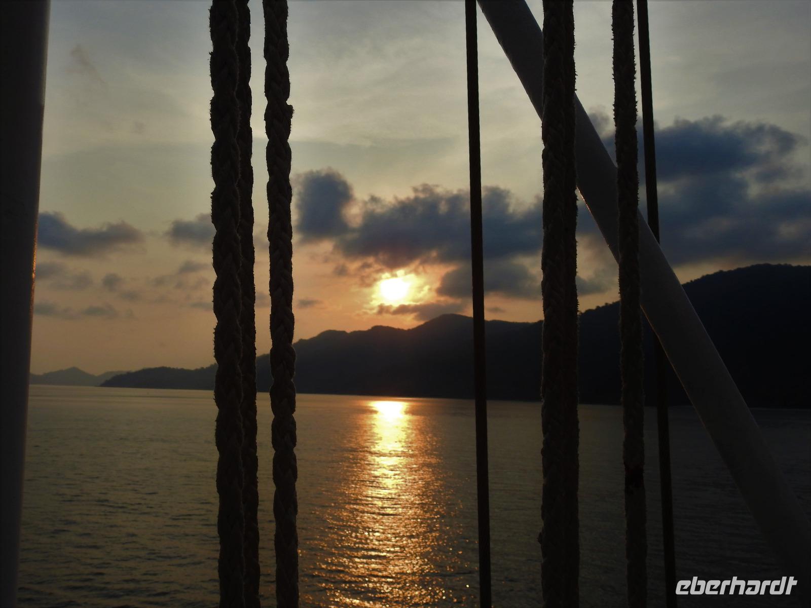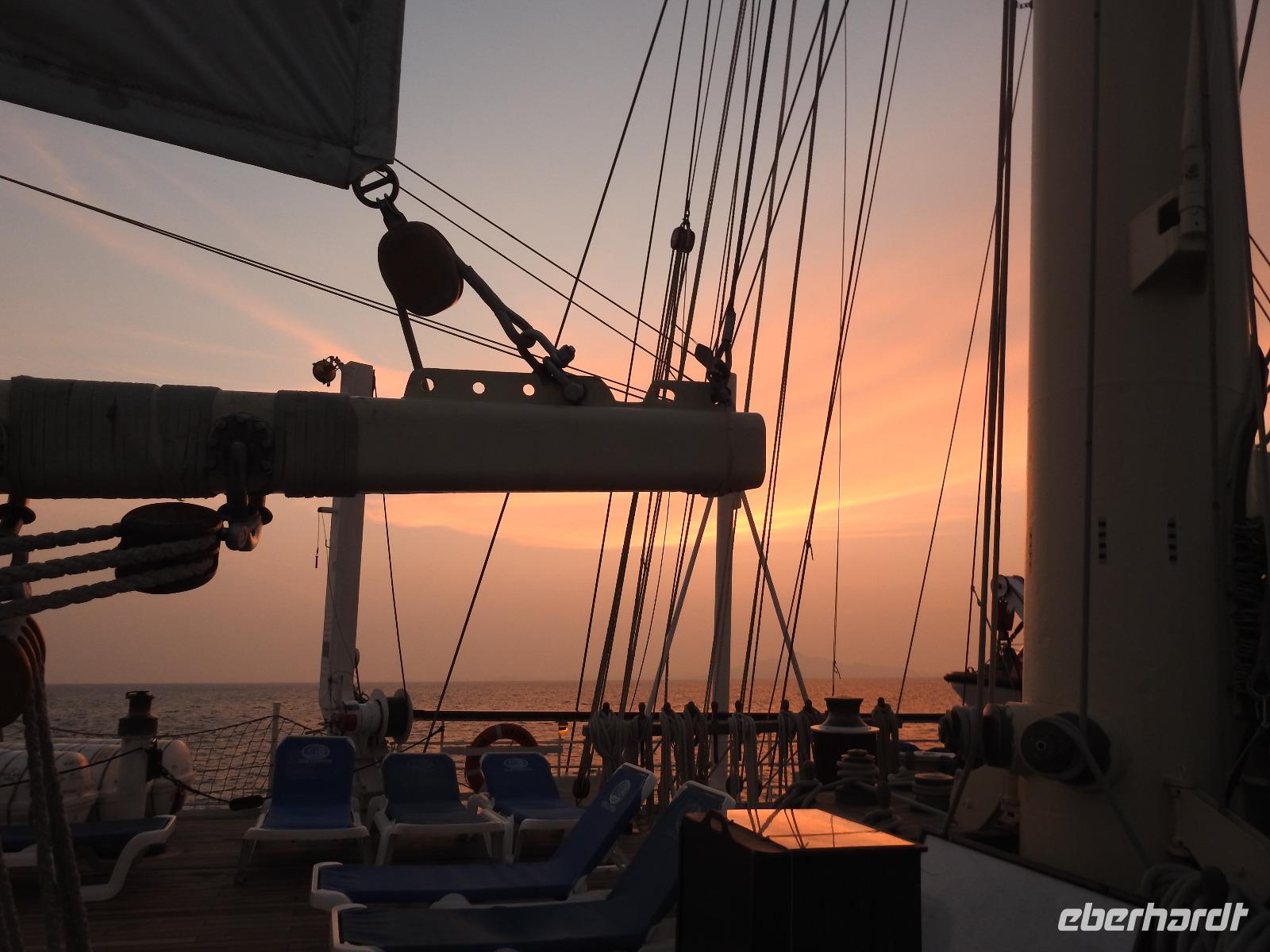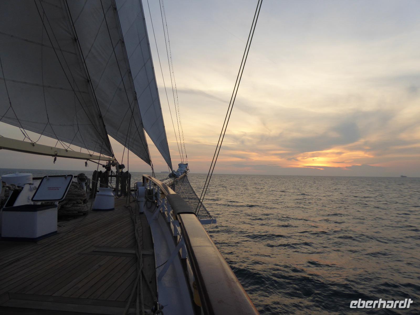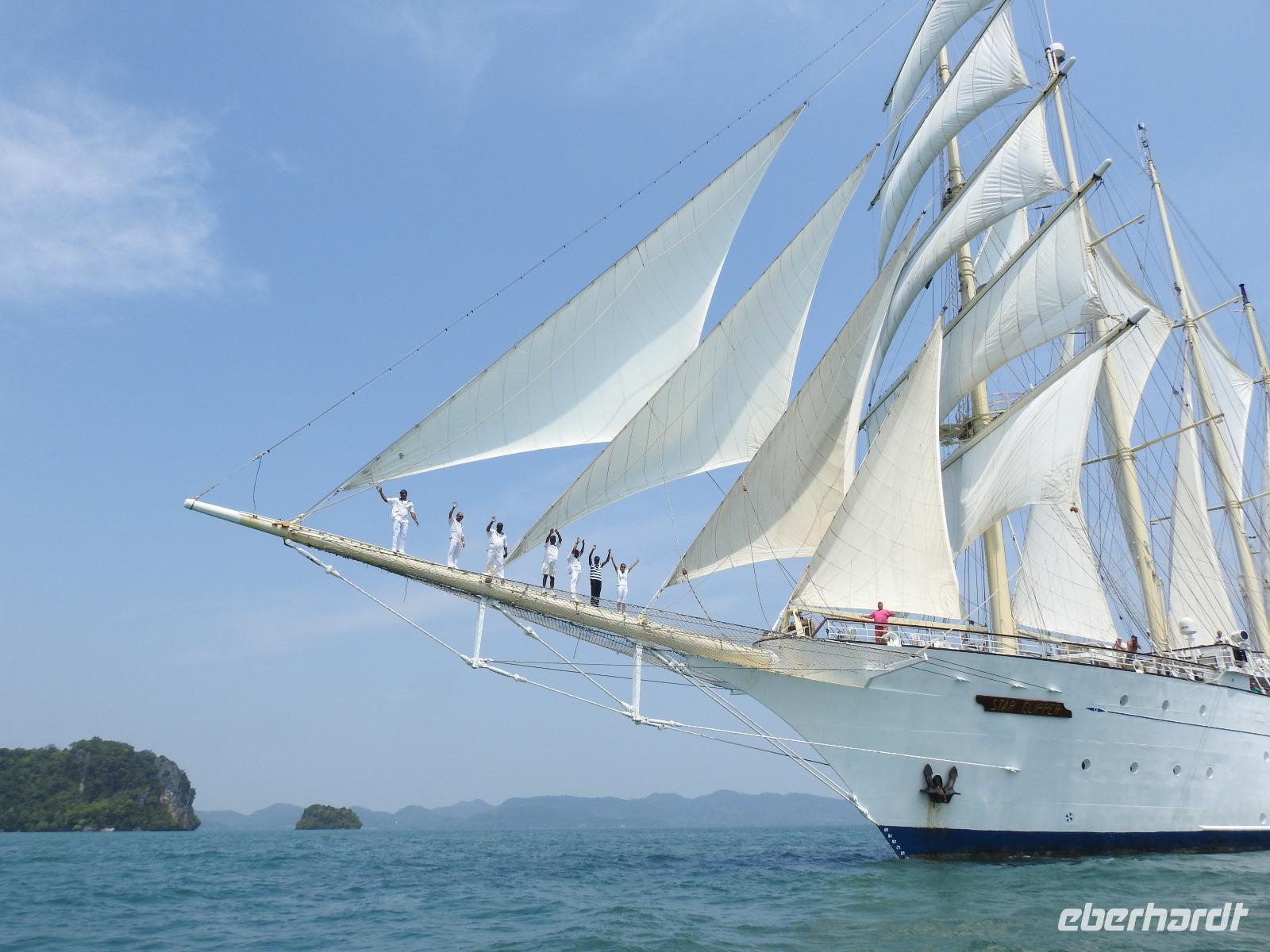 An Seetagen kann man ausschlafen oder aber zum Sonnenaufgang an Deck sein, noch ist es ruhig und es gibt auch schon den ersten Kaffee. Die ganz Aktiven nehmen am Frühsport teil. Aber wir genießen gemeinsam das luxuriöse Frühstücksbuffet. Nun heißt es, aus den ausgeschriebenen Aktivitäten an Bord, das Passende zu finden. Von neun bis zehn besteht die Möglichkeit, einmal an einem Segelmast hinaufzuklettern und von oben übers Meer zu schauen. Die Kreuzfahrtleiterin Monika informiert über den nächsten Hafen Langkawi und den anstehenden Ausflug. Anschließend plaudert der Kapitän aus seinem Leben. Nachmittags können wir lernen, wie man Seemannsknoten knüpft und mit dem Hotelmanager hinter die Kulissen eines Segelschiffes schauen, leider nur in Form einer Präsentation, den auf der Star Clipper darf niemand in die Küche oder ins Lebensmittel-Lager. Die Sportanimateure und die Kinder verkleiden sich heute als Piraten und überfallen uns beim Abendessen. So vergeht der Tag und schon ist es wieder abends, die Sonne versinkt am Horizont und wir lassen uns von den Wellen in den Schlaf schaukeln.