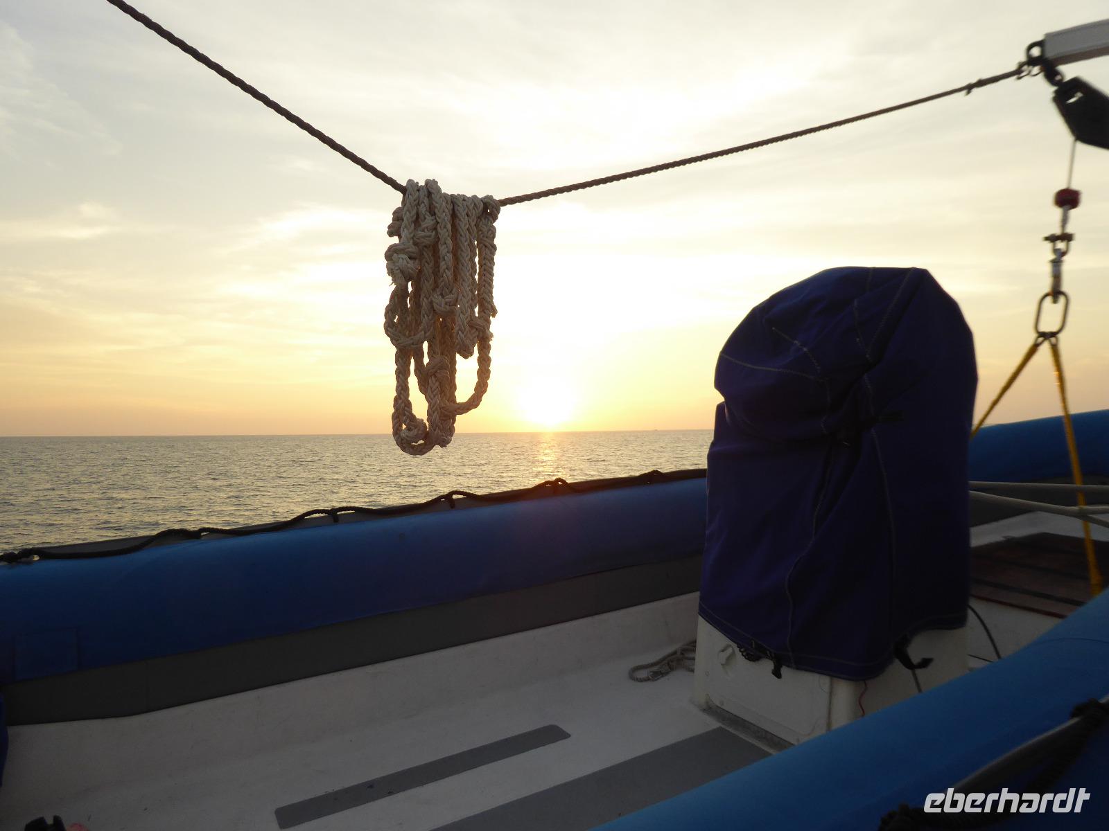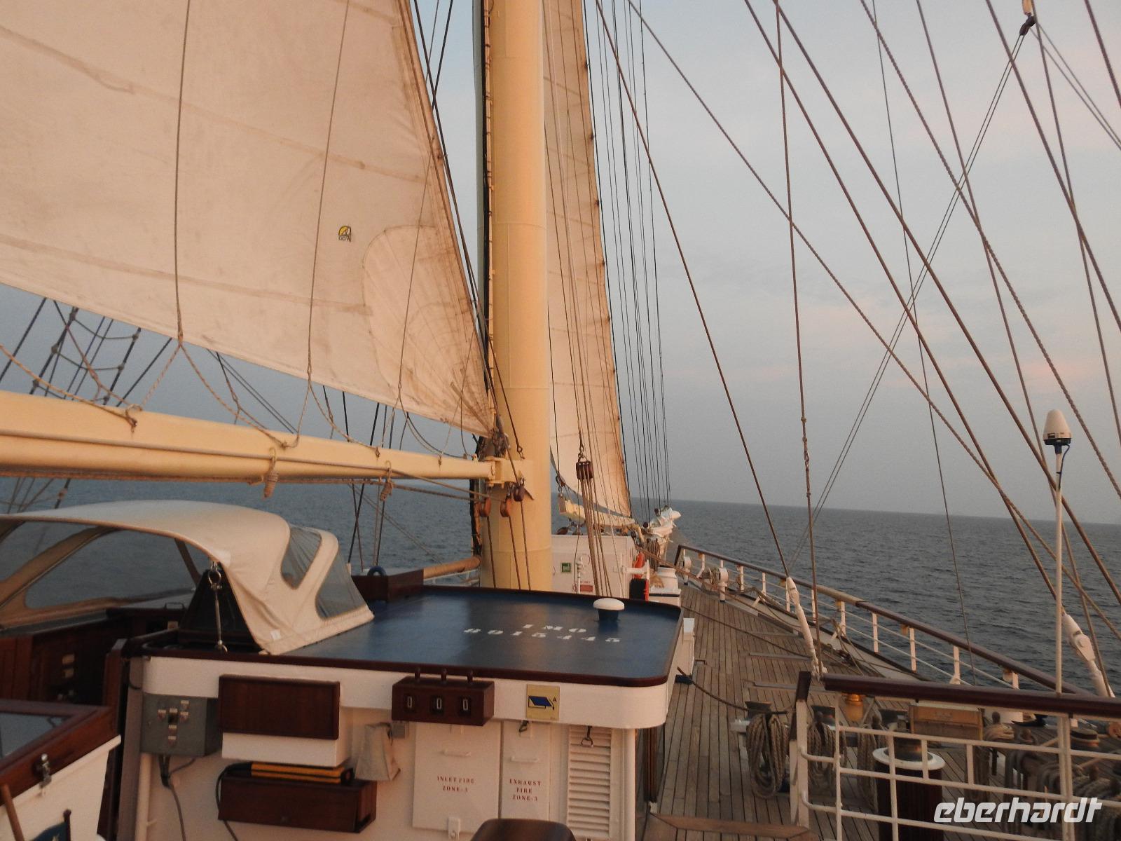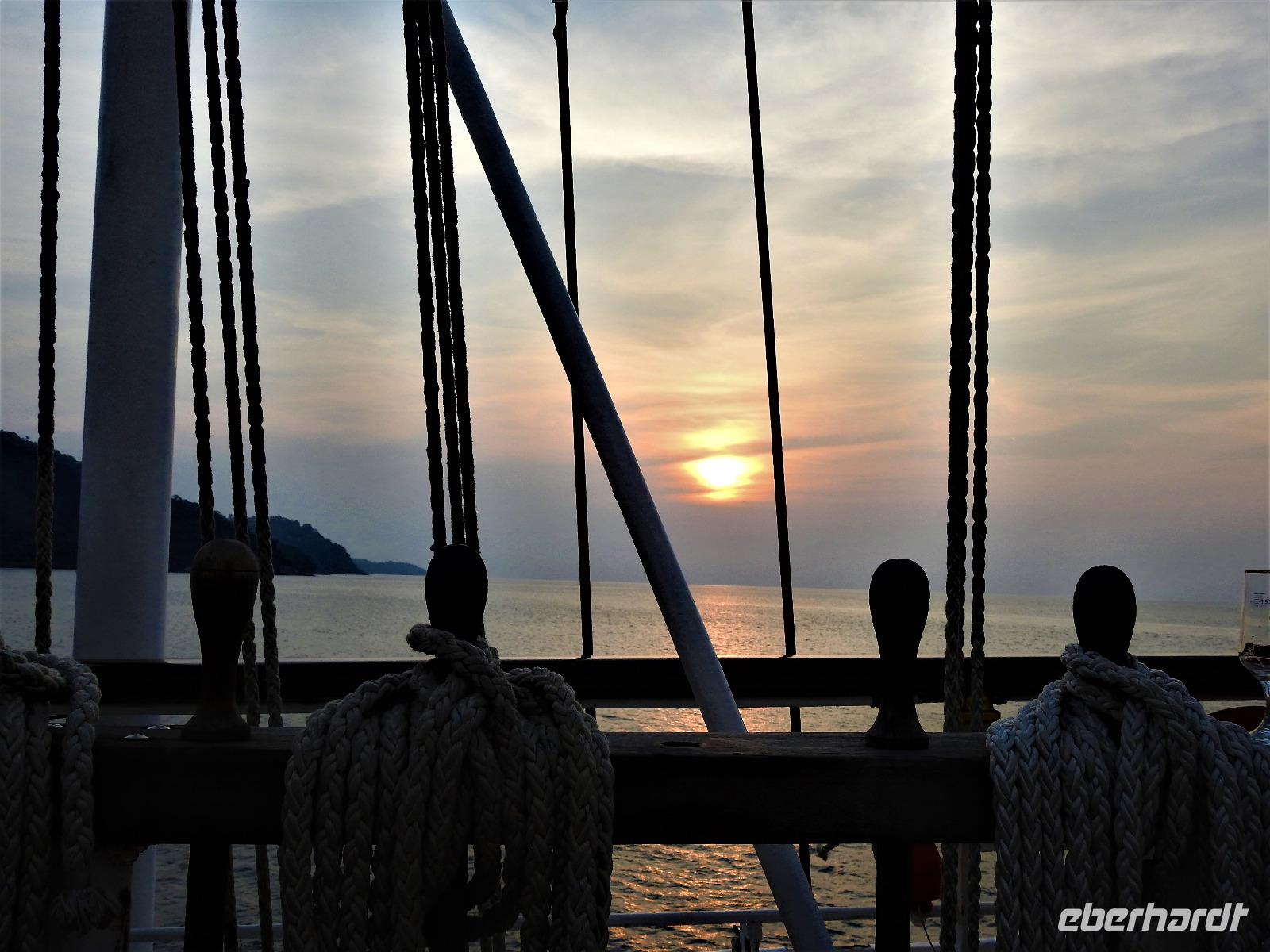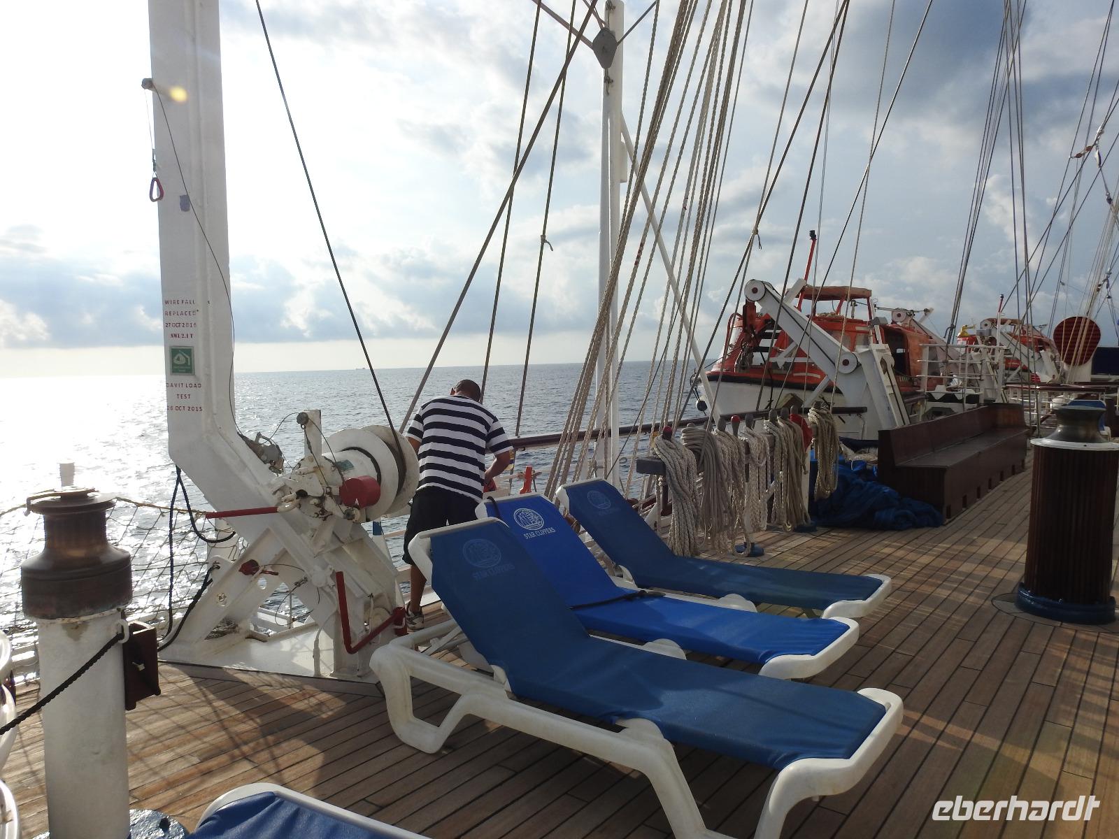 An Seetagen kann man ausschlafen oder aber zum Sonnenaufgang an Deck sein, noch ist es ruhig und es gibt auch schon den ersten Kaffee. Die ganz Aktiven nehmen am Frühsport teil. Aber wir genießen gemeinsam das luxuriöse Frühstücksbuffet. Nun heißt es, aus den ausgeschriebenen Aktivitäten an Bord, das Passende zu finden. Von neun bis zehn besteht die Möglichkeit, einmal an einem Segelmast hinaufzuklettern und von oben übers Meer zu schauen. Die Kreuzfahrtleiterin Monika informiert über den nächsten Hafen Langkawi und den anstehenden Ausflug. Anschließend plaudert der Kapitän aus seinem Leben. Nachmittags können wir lernen, wie man Seemannsknoten knüpft und mit dem Hotelmanager hinter die Kulissen eines Segelschiffes schauen, leider nur in Form einer Präsentation, den auf der Star Clipper darf niemand in die Küche oder ins Lebensmittel-Lager. Die Sportanimateure und die Kinder verkleiden sich heute als Piraten und überfallen uns beim Abendessen. So vergeht der Tag und schon ist es wieder abends, die Sonne versinkt am Horizont und wir lassen uns von den Wellen in den Schlaf schaukeln.