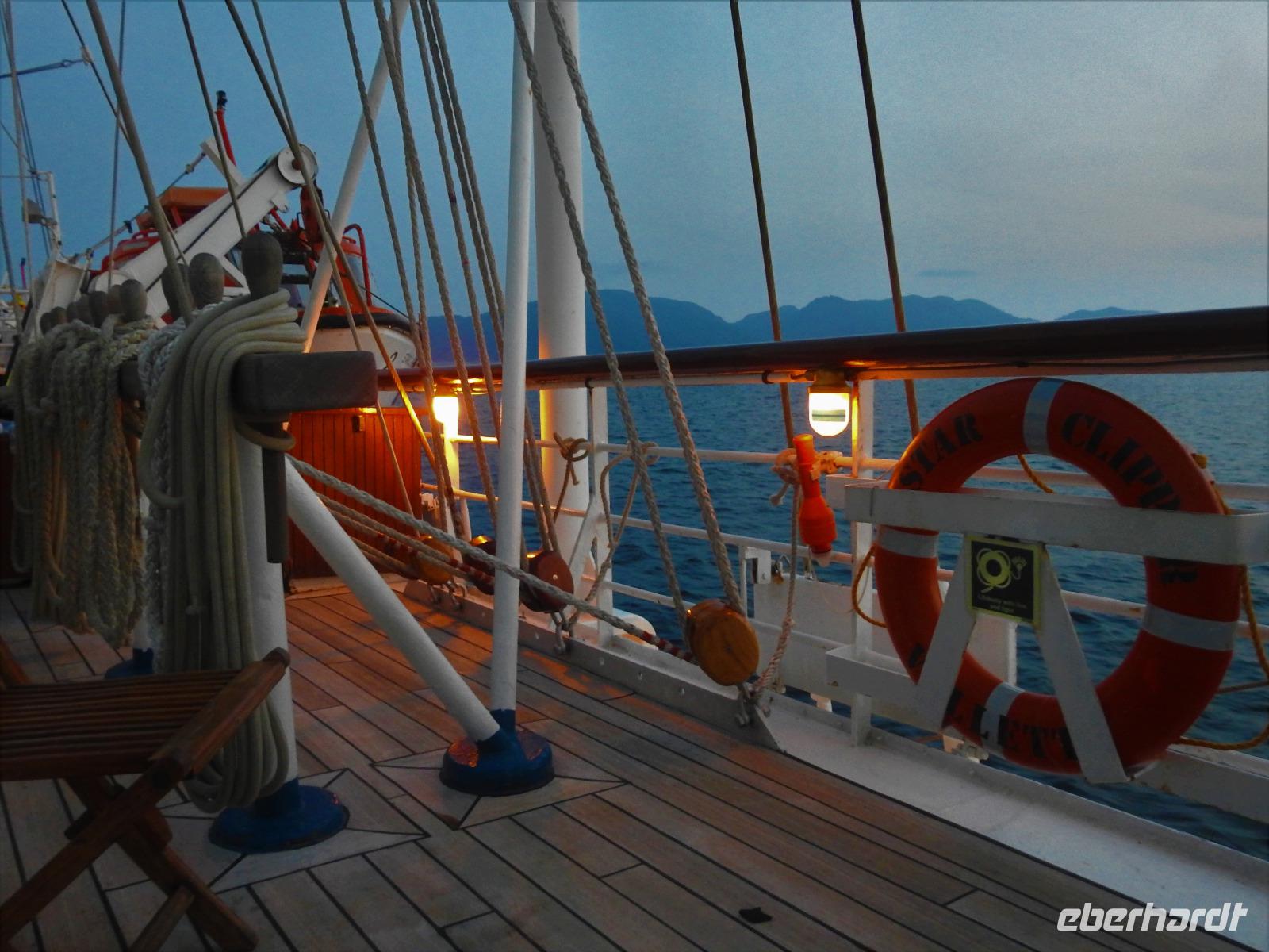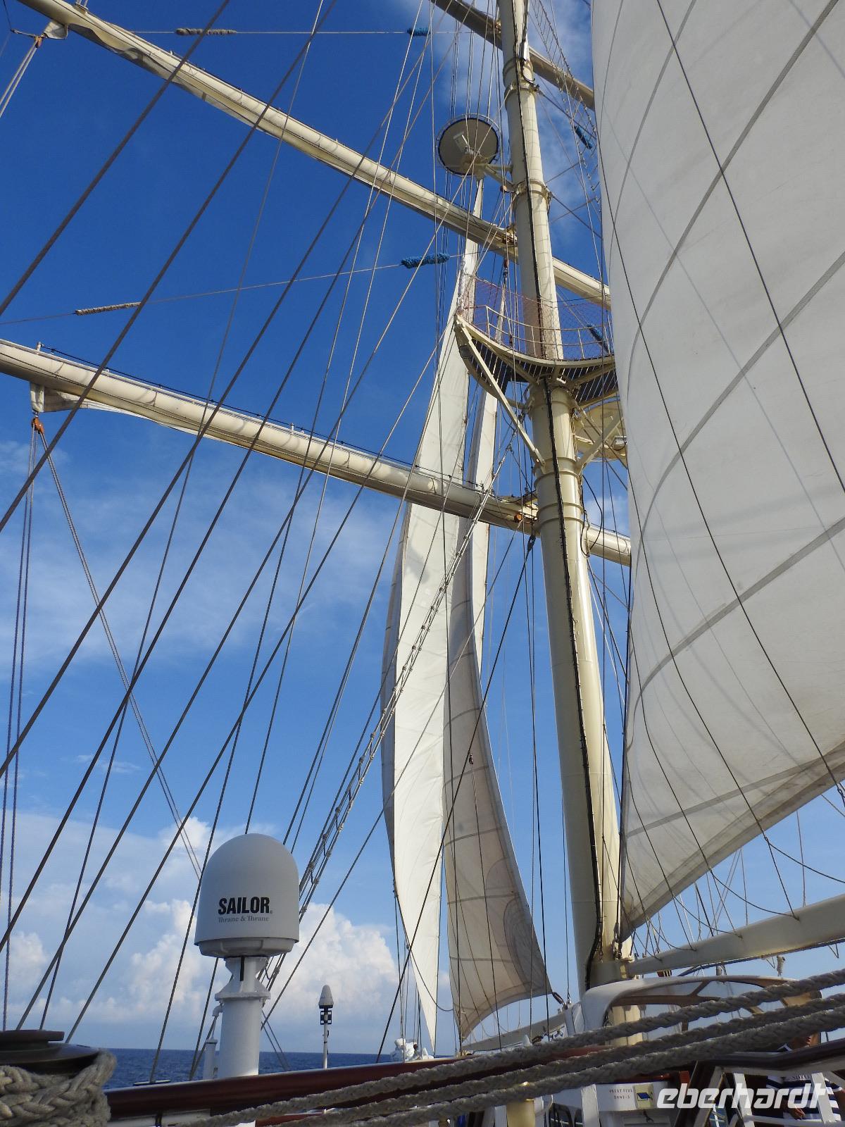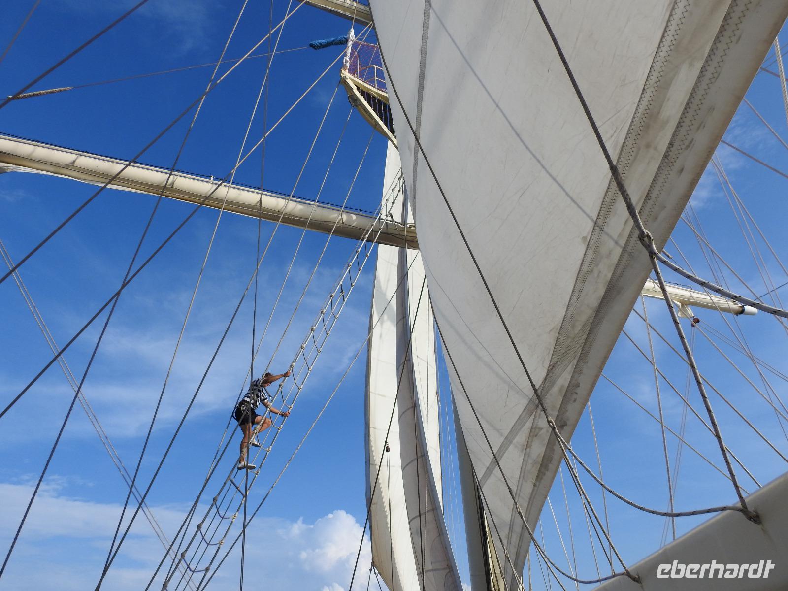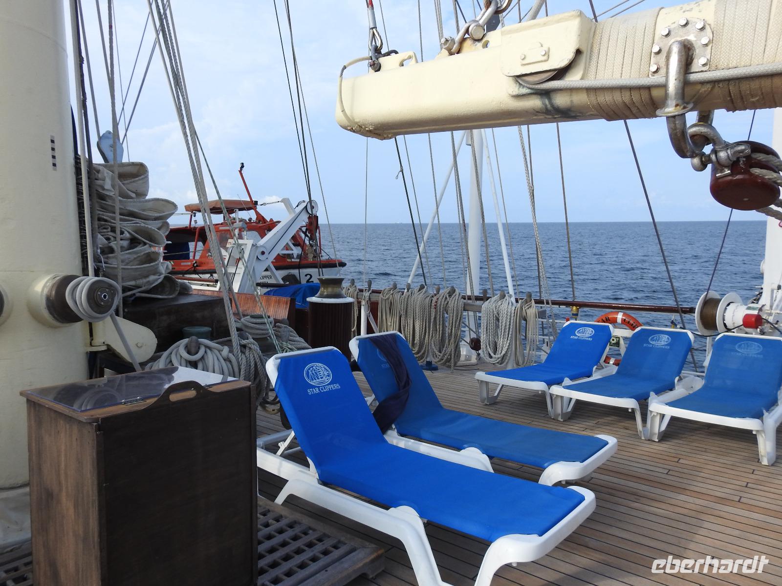An Seetagen kann man ausschlafen oder aber zum Sonnenaufgang an Deck sein, noch ist es ruhig und es gibt auch schon den ersten Kaffee. Die ganz Aktiven nehmen am Frühsport teil. Aber wir genießen gemeinsam das luxuriöse Frühstücksbuffet. Nun heißt es, aus den ausgeschriebenen Aktivitäten an Bord, das Passende zu finden. Von neun bis zehn besteht die Möglichkeit, einmal an einem Segelmast hinaufzuklettern und von oben übers Meer zu schauen. Die Kreuzfahrtleiterin Monika informiert über den nächsten Hafen Langkawi und den anstehenden Ausflug. Anschließend plaudert der Kapitän aus seinem Leben. Nachmittags können wir lernen, wie man Seemannsknoten knüpft und mit dem Hotelmanager hinter die Kulissen eines Segelschiffes schauen, leider nur in Form einer Präsentation, den auf der Star Clipper darf niemand in die Küche oder ins Lebensmittel-Lager. Die Sportanimateure und die Kinder verkleiden sich heute als Piraten und überfallen uns beim Abendessen. So vergeht der Tag und schon ist es wieder abends, die Sonne versinkt am Horizont und wir lassen uns von den Wellen in den Schlaf schaukeln.