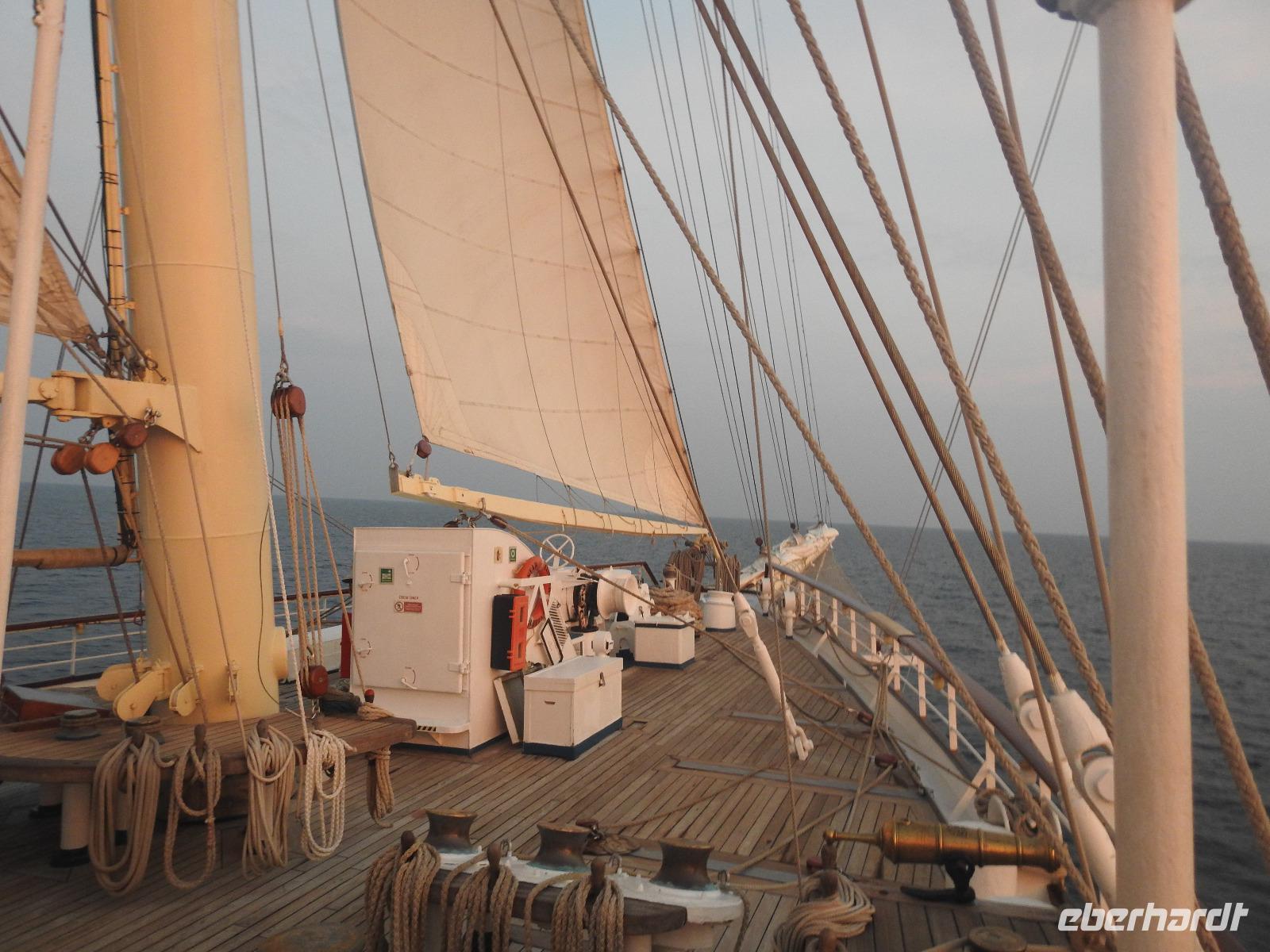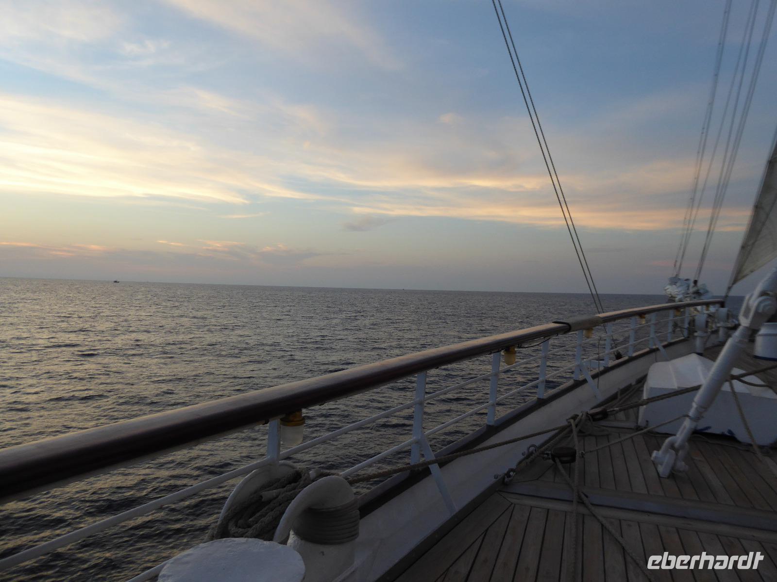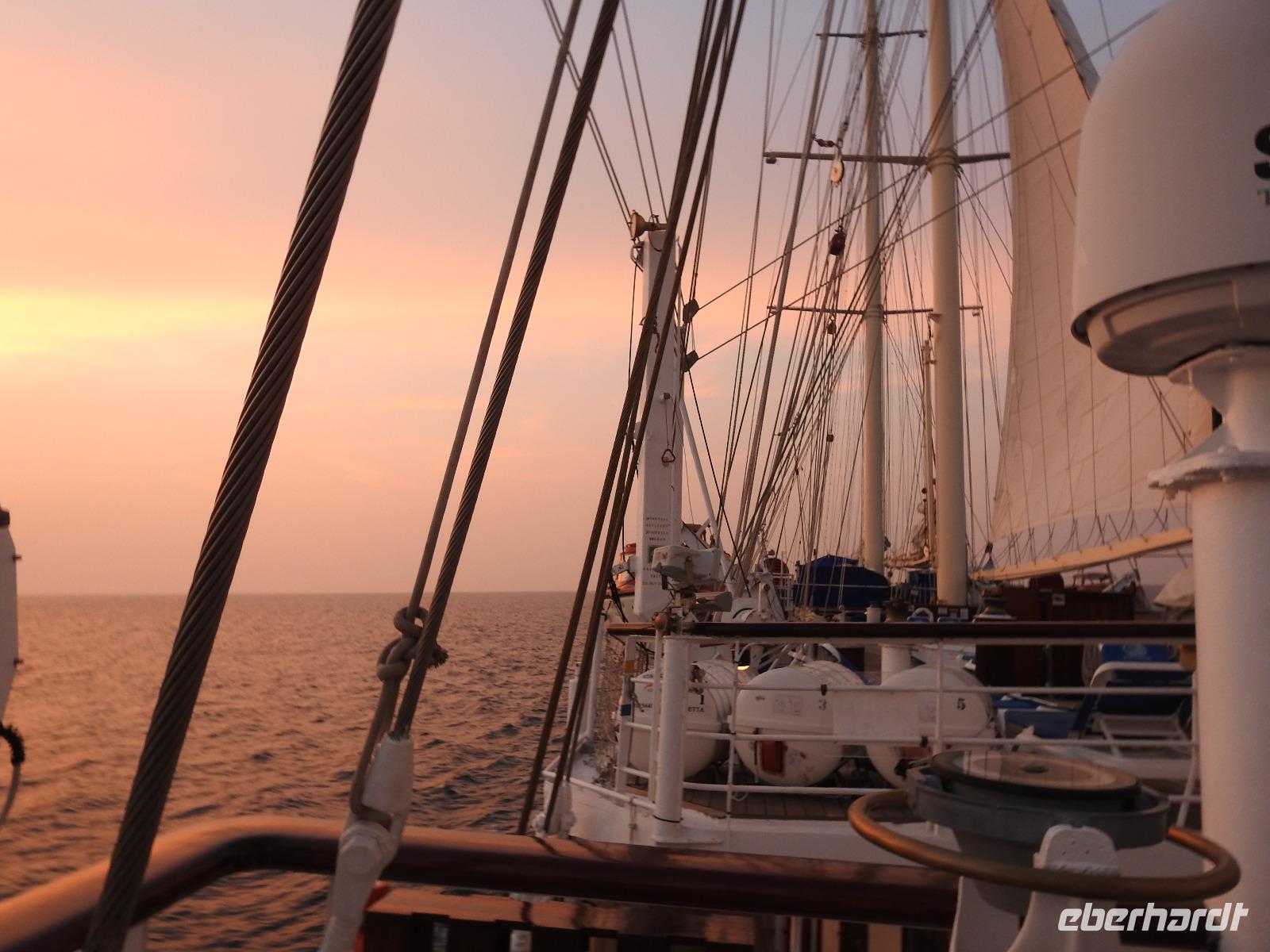 Die Luft riecht nach Meer, es ist still, am Horizont steigt die Sonne als rotglühender Ball am Himmel auf. Der Blick nach oben zeigt weiße Segel im Wind. Ein Morgen auf der Star Clipper - unvergesslic