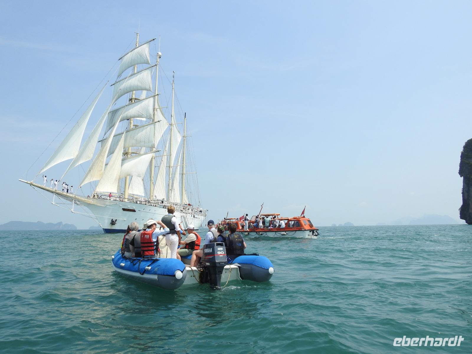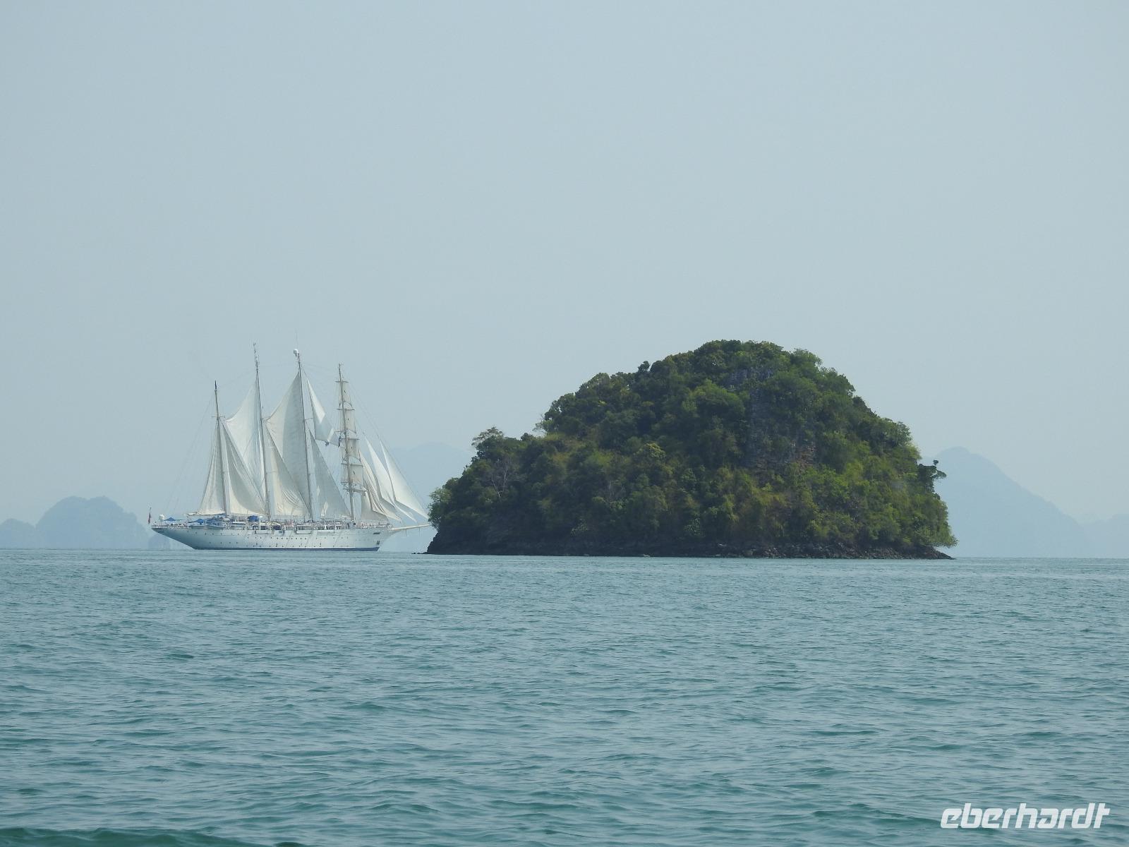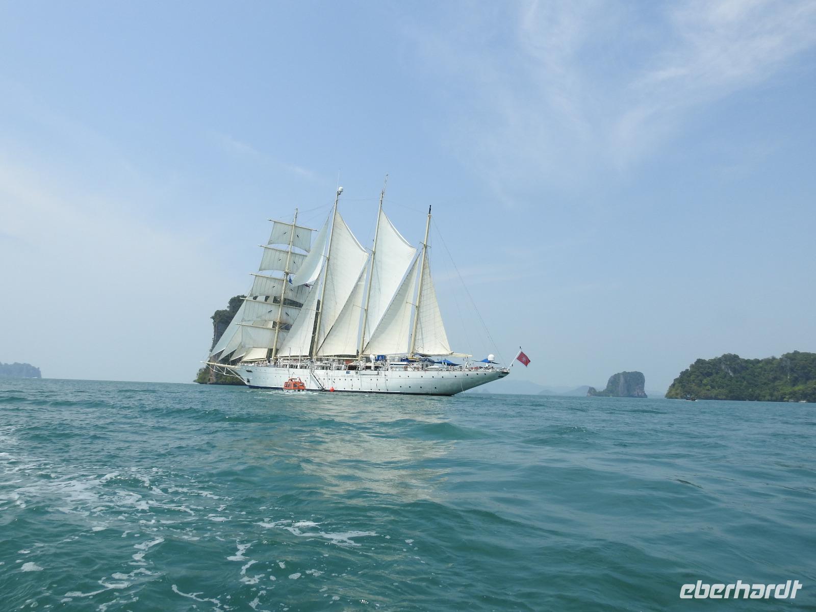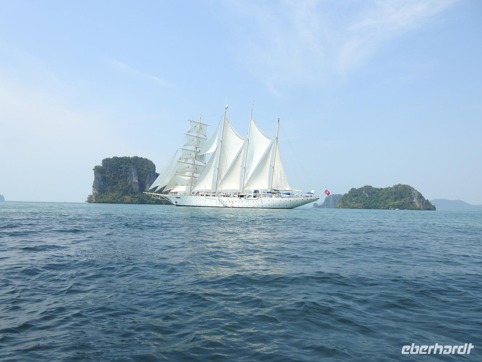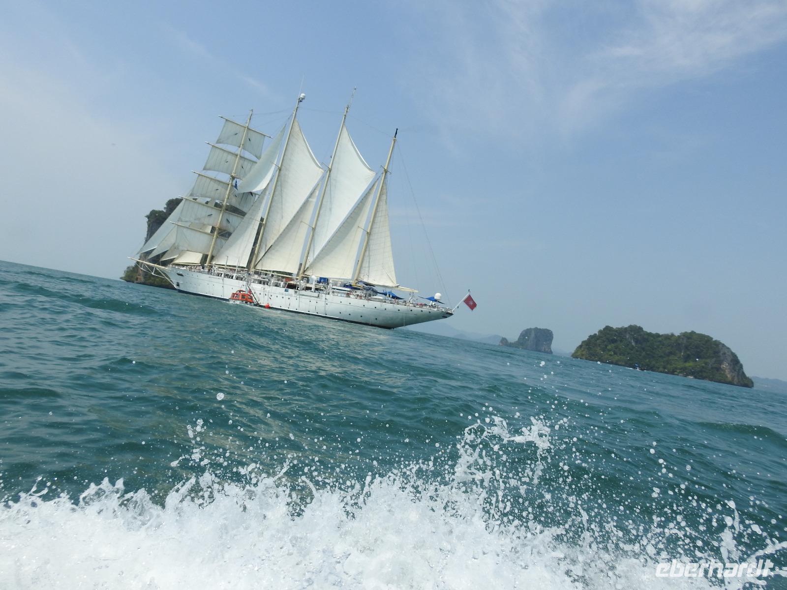 Frühmorgens zeigt sich die aufgehende Sonne als glutroter Ball. Wir müssen pünktlich aufstehen, denn um acht Uhr erwarten uns die thailändischen Behörden zur Gesichtskontrolle. Außerdem werden die von uns ausgefüllten Einreiseformulare geprüft. Der Beamte, an den wir geraten ist äußerst exakt, wer eine Spalte nicht ausgefüllt hat, wird zum Nachschreiben beordert. Mich hat er beim Wickel, weil ihm meine Schrift nicht gefällt. Naja, auch den Typen haben wir überstanden. Widmen wir uns wieder den schönen Erlebnissen. Heute Vormittag steht der langerwartete Fototender auf dem Programm. Zunächst gibt es von der Kreuzfahrtleiterin Monika eine Einweisung, dann wird durchgezählt, wie viele Gäste teilnehmen möchten. Man ist daran interessiert, dass die Gäste Platz im Tender haben. Maximal 15 Gäste sollen auf einem Boot sein. Auf unserem sind zwanzig, weil die Kinder nicht mitgezählt werden. Wir nehmen Kurs auf die Kalksteinfelsen, die mit ihren fantastischen Formationen jedes Fotografenherz höherschlagen lassen. Dann fängt irgendetwas auf unserem Boot an zu piepen. Was zur Folge hat, dass der Kapitän zwei Zodiaks (Schlauchboote) schickt, die uns aufsammeln und mit denen wir die Fotosafari fortsetzen. Wir sind nicht unglücklich darüber. Außer uns sieben Eberhardt Reisenden ist noch eine Familie aus Luxemburg an Bord. Das passt. Ab und zu trifft uns die Gischt und wir werden nass. Aber nichts kann uns die Laune verderben. Wir sind neugierig auf die Höhlen, in denen die Einheimischen Schwalbennester abbauen, die teuer an den chinesischen Markt verkauft werden. Außerdem haben wir die einmalige Gelegenheit, das Schiff von allen Seiten und unter Segeln, zu fotografieren. Nach ca. einer Stunde kehren wir zurück an Bord und werden mit einem leckeren Mittagsbuffet verwöhnt. Bald schon, nämlich 12.15 Uhr, besteigen wir das nächste Boot, diesmal sind es zwei Schnellboote, auf denen wir den Nachmittag verbringen. Auf einem Boot sind die englisch sprechenden Gäste, auf dem anderen die Deutschen. Unsere thailändischen Gastgeber sind sehr aufmerksam und die örtliche Reiseleiterin, namens Ej, super. Nach den ersten einweisenden Worten wird Gas gegeben und wir brausen durch die traumhafte Landschaft. Wir fahren in eine Grotte, besuchen das thailändische Dorf Ko Panyi und die James Bond Insel mit dem berühmten Felsen. Unterwegs gibt es ein Mittagessen mit thailändischen Gerichten. Für die Souvenirjäger ist hier Zeit und Gelegenheit zum Einkaufen (am Anfang des Marktes stand auch ein Geldautomat). Nach einem weiteren Tag voller spannender Eindrücke kehren wir glücklich und zufrieden auf unsere Star Clipper zurück.