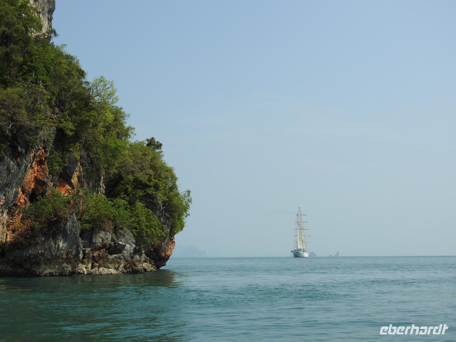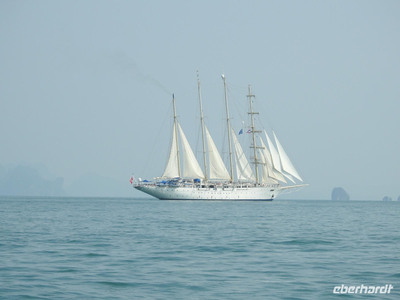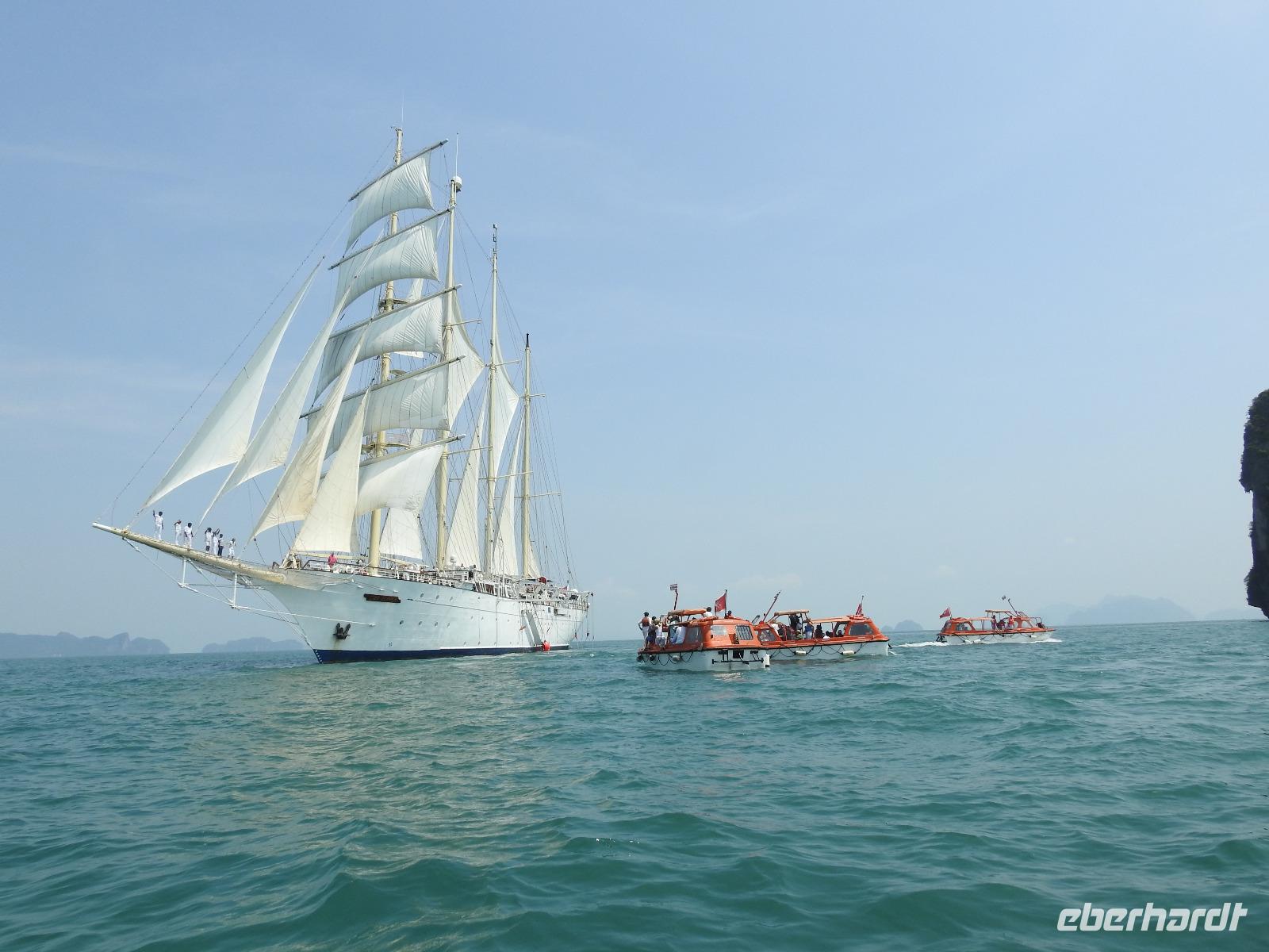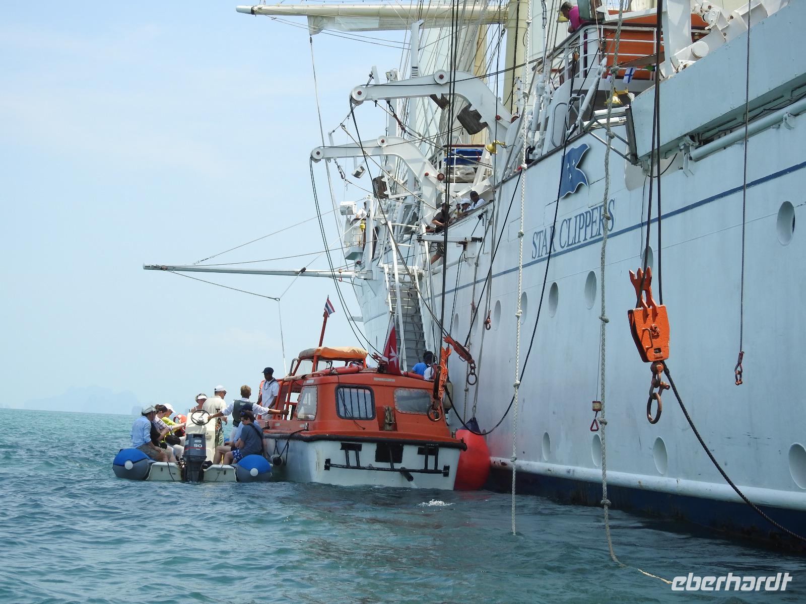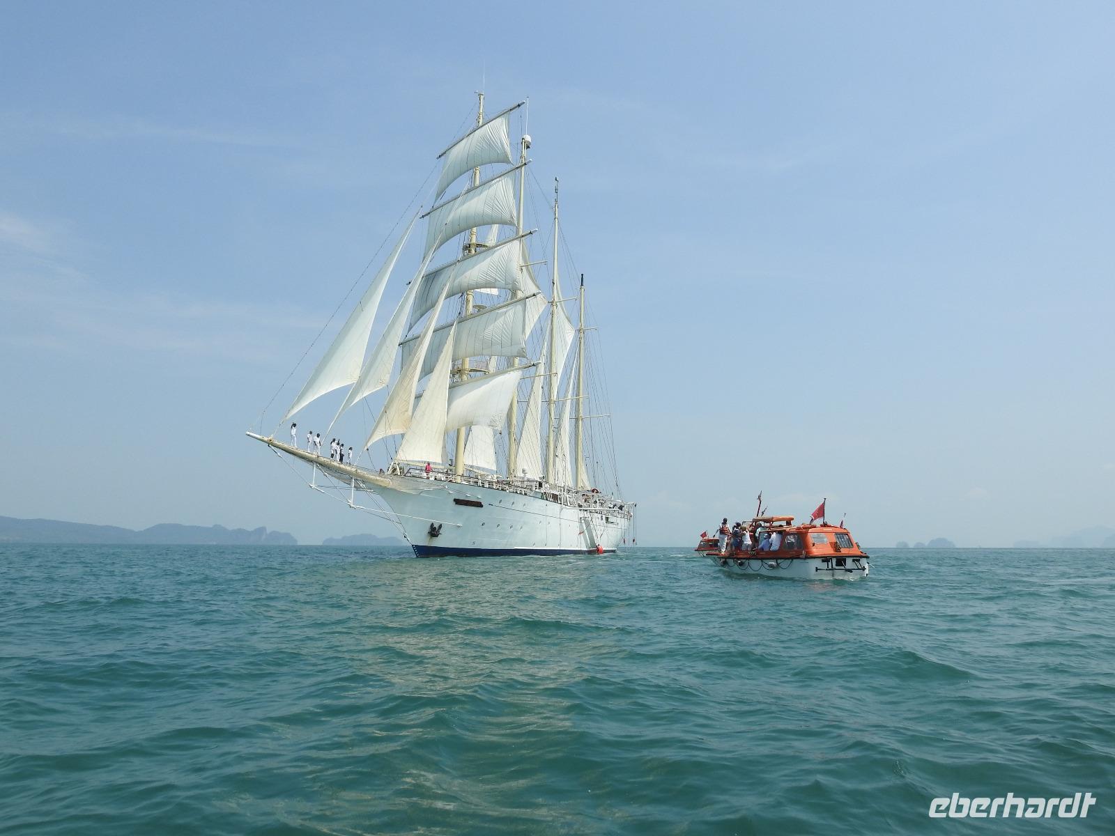 Frühmorgens zeigt sich die aufgehende Sonne als glutroter Ball. Wir müssen pünktlich aufstehen, denn um acht Uhr erwarten uns die thailändischen Behörden zur Gesichtskontrolle. Außerdem werden die von uns ausgefüllten Einreiseformulare geprüft. Der Beamte, an den wir geraten ist äußerst exakt, wer eine Spalte nicht ausgefüllt hat, wird zum Nachschreiben beordert. Mich hat er beim Wickel, weil ihm meine Schrift nicht gefällt. Naja, auch den Typen haben wir überstanden. Widmen wir uns wieder den schönen Erlebnissen. Heute Vormittag steht der langerwartete Fototender auf dem Programm. Zunächst gibt es von der Kreuzfahrtleiterin Monika eine Einweisung, dann wird durchgezählt, wie viele Gäste teilnehmen möchten. Man ist daran interessiert, dass die Gäste Platz im Tender haben. Maximal 15 Gäste sollen auf einem Boot sein. Auf unserem sind zwanzig, weil die Kinder nicht mitgezählt werden. Wir nehmen Kurs auf die Kalksteinfelsen, die mit ihren fantastischen Formationen jedes Fotografenherz höherschlagen lassen. Dann fängt irgendetwas auf unserem Boot an zu piepen. Was zur Folge hat, dass der Kapitän zwei Zodiaks (Schlauchboote) schickt, die uns aufsammeln und mit denen wir die Fotosafari fortsetzen. Wir sind nicht unglücklich darüber. Außer uns sieben Eberhardt Reisenden ist noch eine Familie aus Luxemburg an Bord. Das passt. Ab und zu trifft uns die Gischt und wir werden nass. Aber nichts kann uns die Laune verderben. Wir sind neugierig auf die Höhlen, in denen die Einheimischen Schwalbennester abbauen, die teuer an den chinesischen Markt verkauft werden. Außerdem haben wir die einmalige Gelegenheit, das Schiff von allen Seiten und unter Segeln, zu fotografieren. Nach ca. einer Stunde kehren wir zurück an Bord und werden mit einem leckeren Mittagsbuffet verwöhnt. Bald schon, nämlich 12.15 Uhr, besteigen wir das nächste Boot, diesmal sind es zwei Schnellboote, auf denen wir den Nachmittag verbringen. Auf einem Boot sind die englisch sprechenden Gäste, auf dem anderen die Deutschen. Unsere thailändischen Gastgeber sind sehr aufmerksam und die örtliche Reiseleiterin, namens Ej, super. Nach den ersten einweisenden Worten wird Gas gegeben und wir brausen durch die traumhafte Landschaft. Wir fahren in eine Grotte, besuchen das thailändische Dorf Ko Panyi und die James Bond Insel mit dem berühmten Felsen. Unterwegs gibt es ein Mittagessen mit thailändischen Gerichten. Für die Souvenirjäger ist hier Zeit und Gelegenheit zum Einkaufen (am Anfang des Marktes stand auch ein Geldautomat). Nach einem weiteren Tag voller spannender Eindrücke kehren wir glücklich und zufrieden auf unsere Star Clipper zurück.