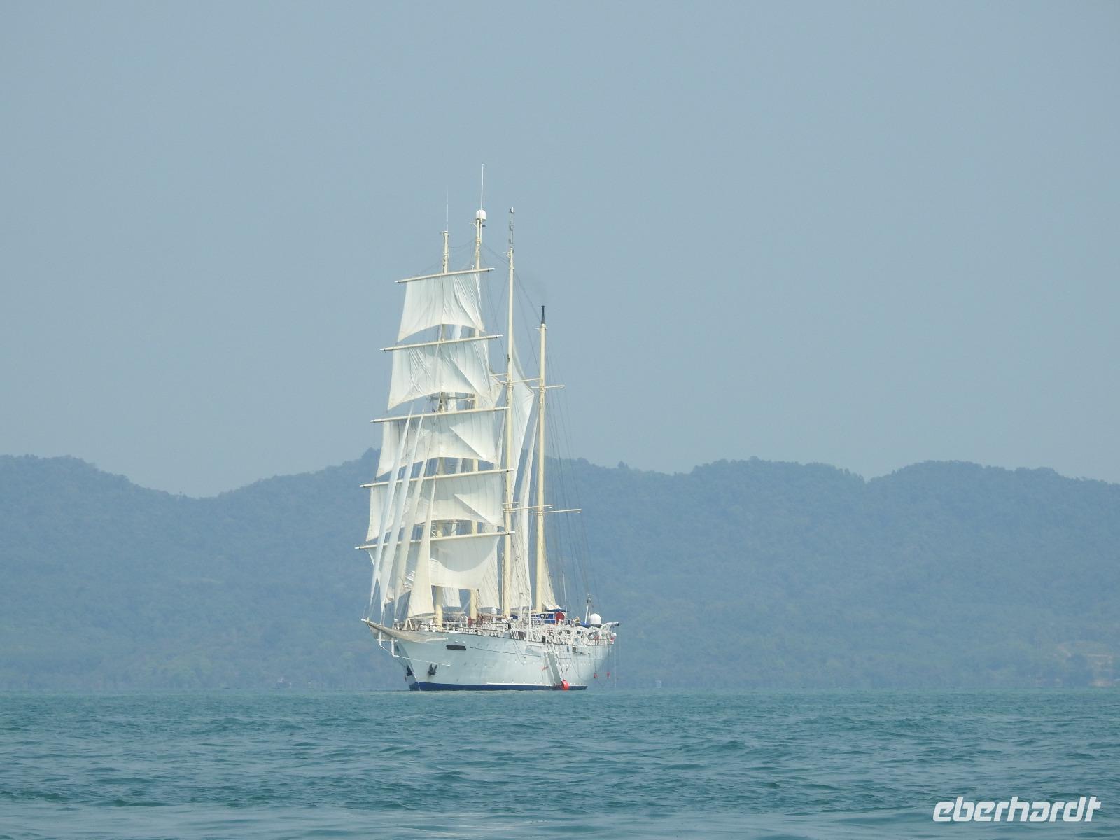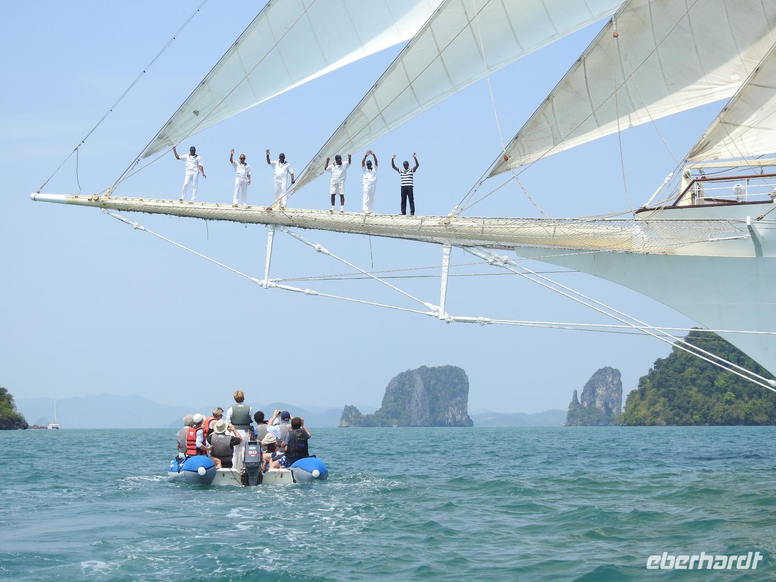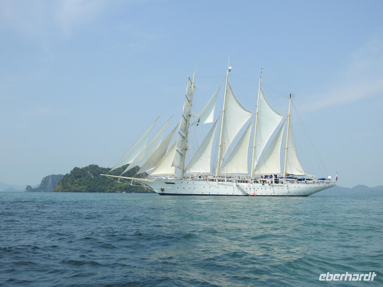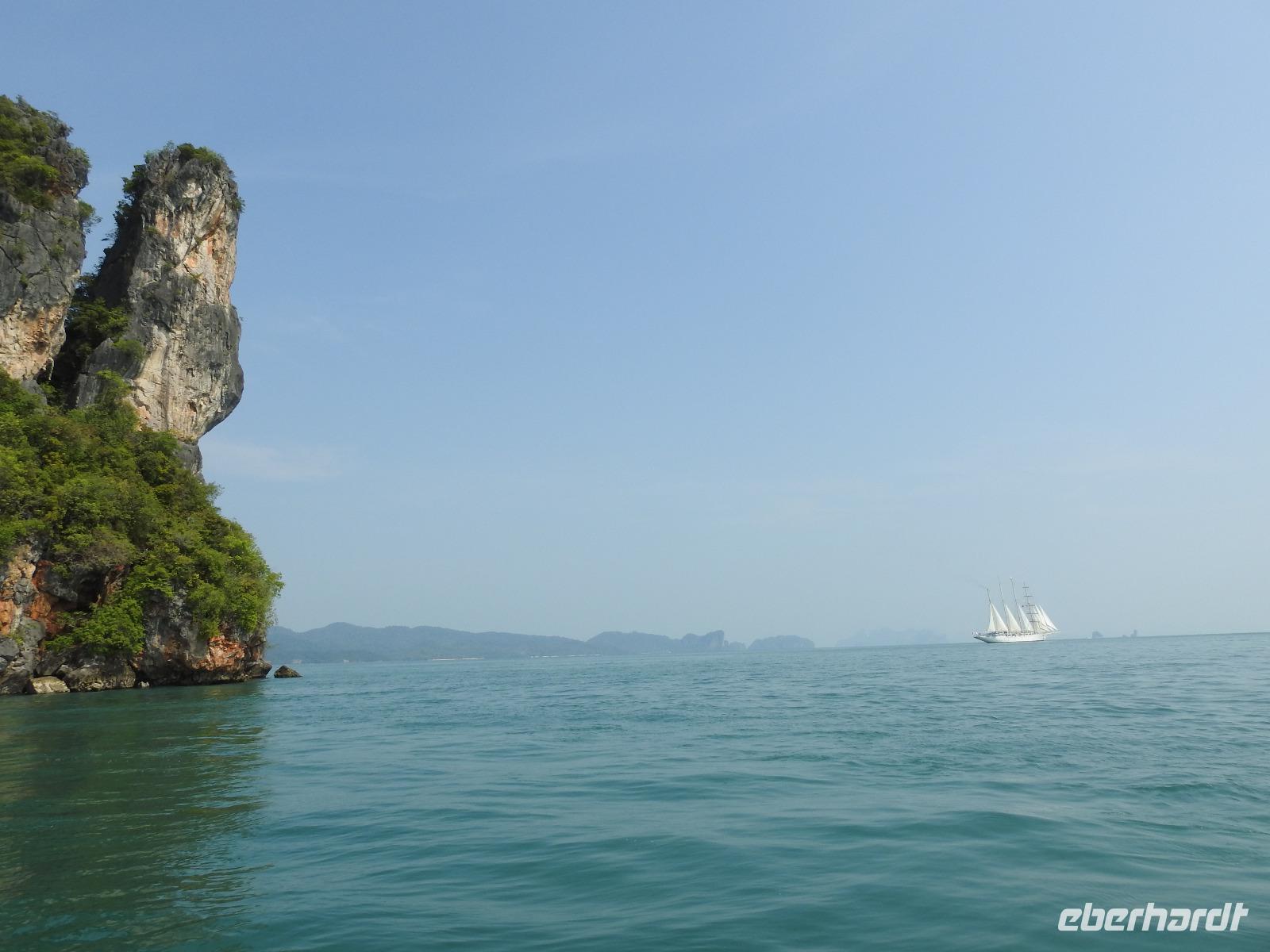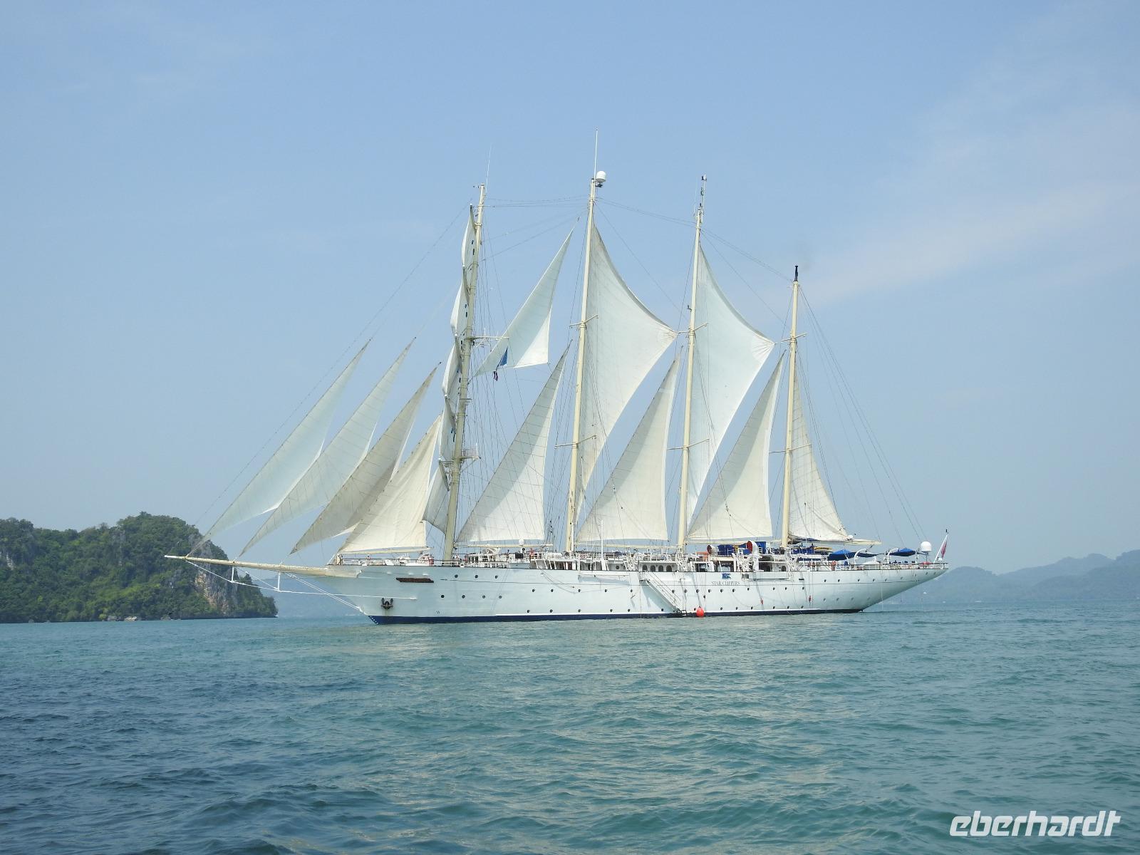 Frühmorgens zeigt sich die aufgehende Sonne als glutroter Ball. Wir müssen pünktlich aufstehen, denn um acht Uhr erwarten uns die thailändischen Behörden zur Gesichtskontrolle. Außerdem werden die von uns ausgefüllten Einreiseformulare geprüft. Der Beamte, an den wir geraten ist äußerst exakt, wer eine Spalte nicht ausgefüllt hat, wird zum Nachschreiben beordert. Mich hat er beim Wickel, weil ihm meine Schrift nicht gefällt. Naja, auch den Typen haben wir überstanden. Widmen wir uns wieder den schönen Erlebnissen. Heute Vormittag steht der langerwartete Fototender auf dem Programm. Zunächst gibt es von der Kreuzfahrtleiterin Monika eine Einweisung, dann wird durchgezählt, wie viele Gäste teilnehmen möchten. Man ist daran interessiert, dass die Gäste Platz im Tender haben. Maximal 15 Gäste sollen auf einem Boot sein. Auf unserem sind zwanzig, weil die Kinder nicht mitgezählt werden. Wir nehmen Kurs auf die Kalksteinfelsen, die mit ihren fantastischen Formationen jedes Fotografenherz höherschlagen lassen. Dann fängt irgendetwas auf unserem Boot an zu piepen. Was zur Folge hat, dass der Kapitän zwei Zodiaks (Schlauchboote) schickt, die uns aufsammeln und mit denen wir die Fotosafari fortsetzen. Wir sind nicht unglücklich darüber. Außer uns sieben Eberhardt Reisenden ist noch eine Familie aus Luxemburg an Bord. Das passt. Ab und zu trifft uns die Gischt und wir werden nass. Aber nichts kann uns die Laune verderben. Wir sind neugierig auf die Höhlen, in denen die Einheimischen Schwalbennester abbauen, die teuer an den chinesischen Markt verkauft werden. Außerdem haben wir die einmalige Gelegenheit, das Schiff von allen Seiten und unter Segeln, zu fotografieren. Nach ca. einer Stunde kehren wir zurück an Bord und werden mit einem leckeren Mittagsbuffet verwöhnt. Bald schon, nämlich 12.15 Uhr, besteigen wir das nächste Boot, diesmal sind es zwei Schnellboote, auf denen wir den Nachmittag verbringen. Auf einem Boot sind die englisch sprechenden Gäste, auf dem anderen die Deutschen. Unsere thailändischen Gastgeber sind sehr aufmerksam und die örtliche Reiseleiterin, namens Ej, super. Nach den ersten einweisenden Worten wird Gas gegeben und wir brausen durch die traumhafte Landschaft. Wir fahren in eine Grotte, besuchen das thailändische Dorf Ko Panyi und die James Bond Insel mit dem berühmten Felsen. Unterwegs gibt es ein Mittagessen mit thailändischen Gerichten. Für die Souvenirjäger ist hier Zeit und Gelegenheit zum Einkaufen (am Anfang des Marktes stand auch ein Geldautomat). Nach einem weiteren Tag voller spannender Eindrücke kehren wir glücklich und zufrieden auf unsere Star Clipper zurück.