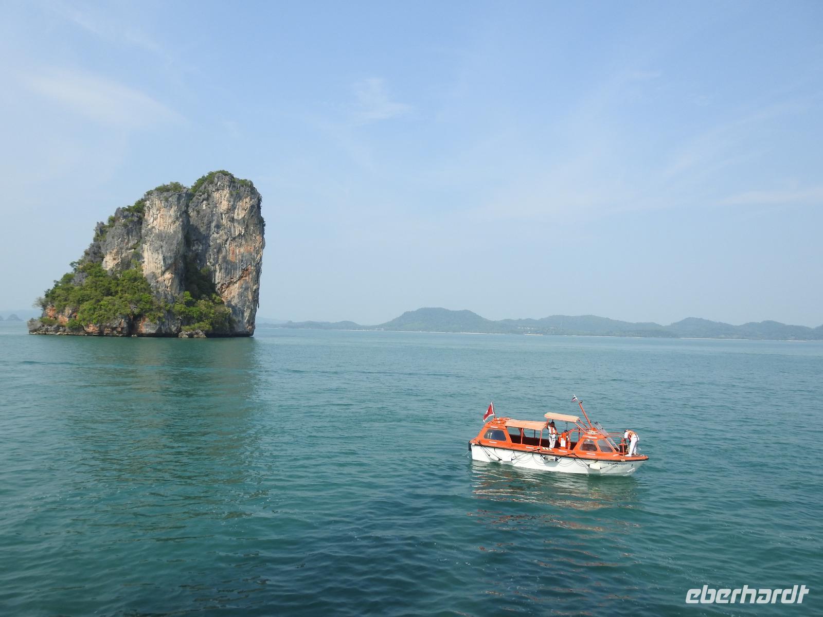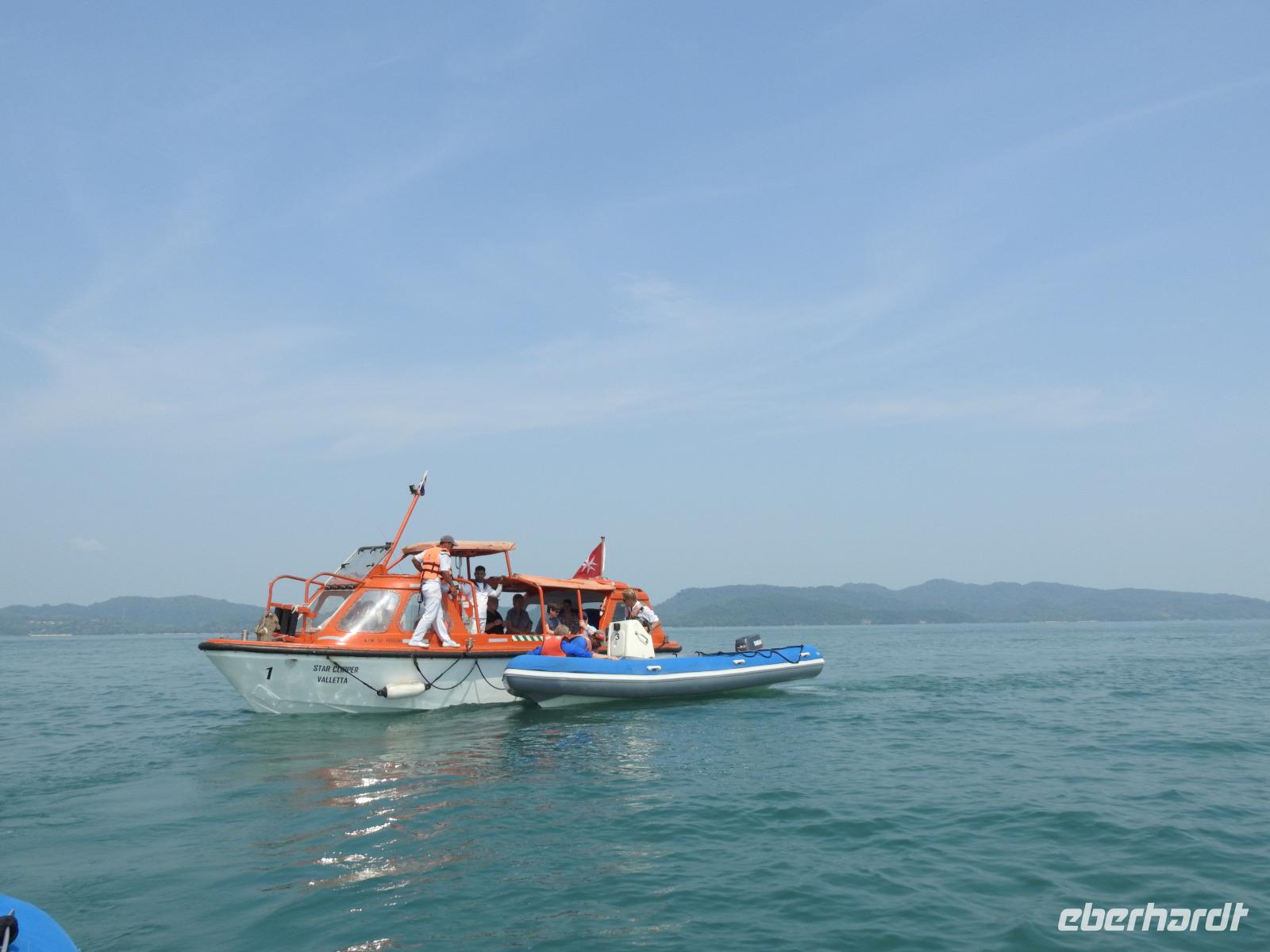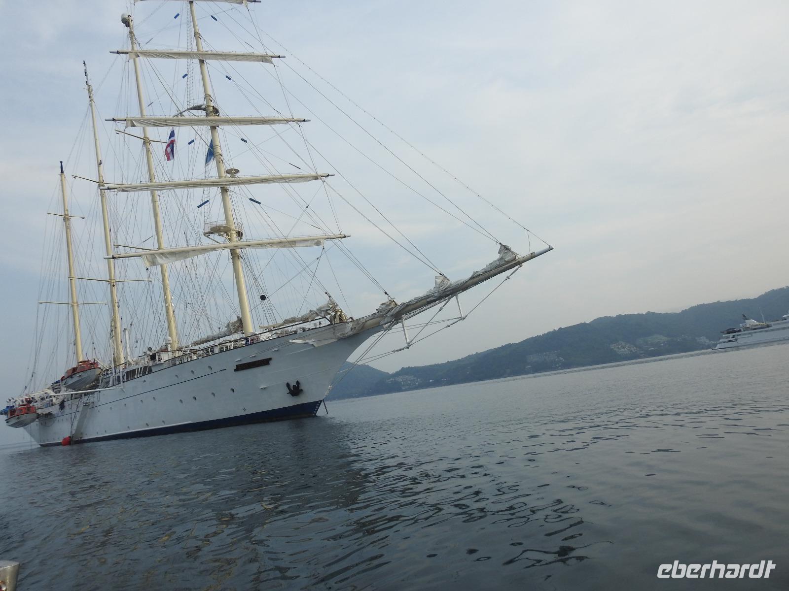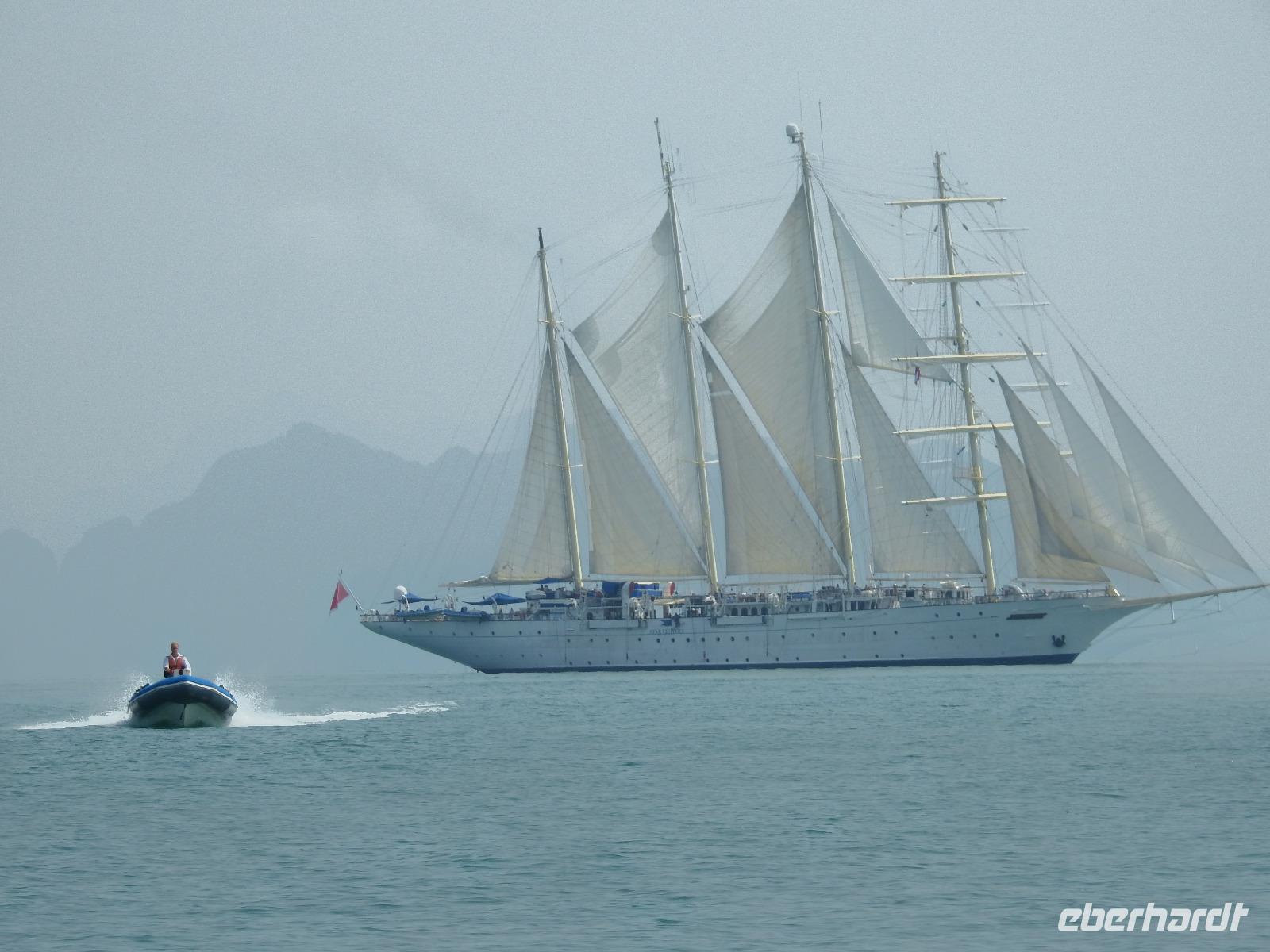 Frühmorgens zeigt sich die aufgehende Sonne als glutroter Ball. Wir müssen pünktlich aufstehen, denn um acht Uhr erwarten uns die thailändischen Behörden zur Gesichtskontrolle. Außerdem werden die von uns ausgefüllten Einreiseformulare geprüft. Der Beamte, an den wir geraten ist äußerst exakt, wer eine Spalte nicht ausgefüllt hat, wird zum Nachschreiben beordert. Mich hat er beim Wickel, weil ihm meine Schrift nicht gefällt. Naja, auch den Typen haben wir überstanden. Widmen wir uns wieder den schönen Erlebnissen. Heute Vormittag steht der langerwartete Fototender auf dem Programm. Zunächst gibt es von der Kreuzfahrtleiterin Monika eine Einweisung, dann wird durchgezählt, wie viele Gäste teilnehmen möchten. Man ist daran interessiert, dass die Gäste Platz im Tender haben. Maximal 15 Gäste sollen auf einem Boot sein. Auf unserem sind zwanzig, weil die Kinder nicht mitgezählt werden. Wir nehmen Kurs auf die Kalksteinfelsen, die mit ihren fantastischen Formationen jedes Fotografenherz höherschlagen lassen. Dann fängt irgendetwas auf unserem Boot an zu piepen. Was zur Folge hat, dass der Kapitän zwei Zodiaks (Schlauchboote) schickt, die uns aufsammeln und mit denen wir die Fotosafari fortsetzen. Wir sind nicht unglücklich darüber. Außer uns sieben Eberhardt Reisenden ist noch eine Familie aus Luxemburg an Bord. Das passt. Ab und zu trifft uns die Gischt und wir werden nass. Aber nichts kann uns die Laune verderben. Wir sind neugierig auf die Höhlen, in denen die Einheimischen Schwalbennester abbauen, die teuer an den chinesischen Markt verkauft werden. Außerdem haben wir die einmalige Gelegenheit, das Schiff von allen Seiten und unter Segeln, zu fotografieren. Nach ca. einer Stunde kehren wir zurück an Bord und werden mit einem leckeren Mittagsbuffet verwöhnt. Bald schon, nämlich 12.15 Uhr, besteigen wir das nächste Boot, diesmal sind es zwei Schnellboote, auf denen wir den Nachmittag verbringen. Auf einem Boot sind die englisch sprechenden Gäste, auf dem anderen die Deutschen. Unsere thailändischen Gastgeber sind sehr aufmerksam und die örtliche Reiseleiterin, namens Ej, super. Nach den ersten einweisenden Worten wird Gas gegeben und wir brausen durch die traumhafte Landschaft. Wir fahren in eine Grotte, besuchen das thailändische Dorf Ko Panyi und die James Bond Insel mit dem berühmten Felsen. Unterwegs gibt es ein Mittagessen mit thailändischen Gerichten. Für die Souvenirjäger ist hier Zeit und Gelegenheit zum Einkaufen (am Anfang des Marktes stand auch ein Geldautomat). Nach einem weiteren Tag voller spannender Eindrücke kehren wir glücklich und zufrieden auf unsere Star Clipper zurück.