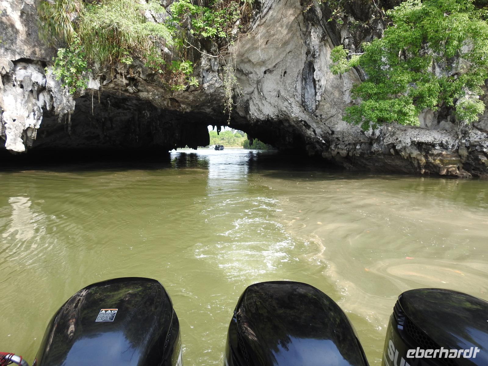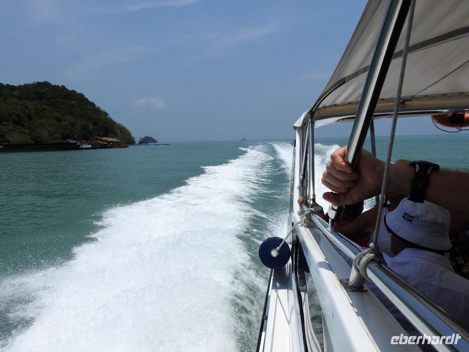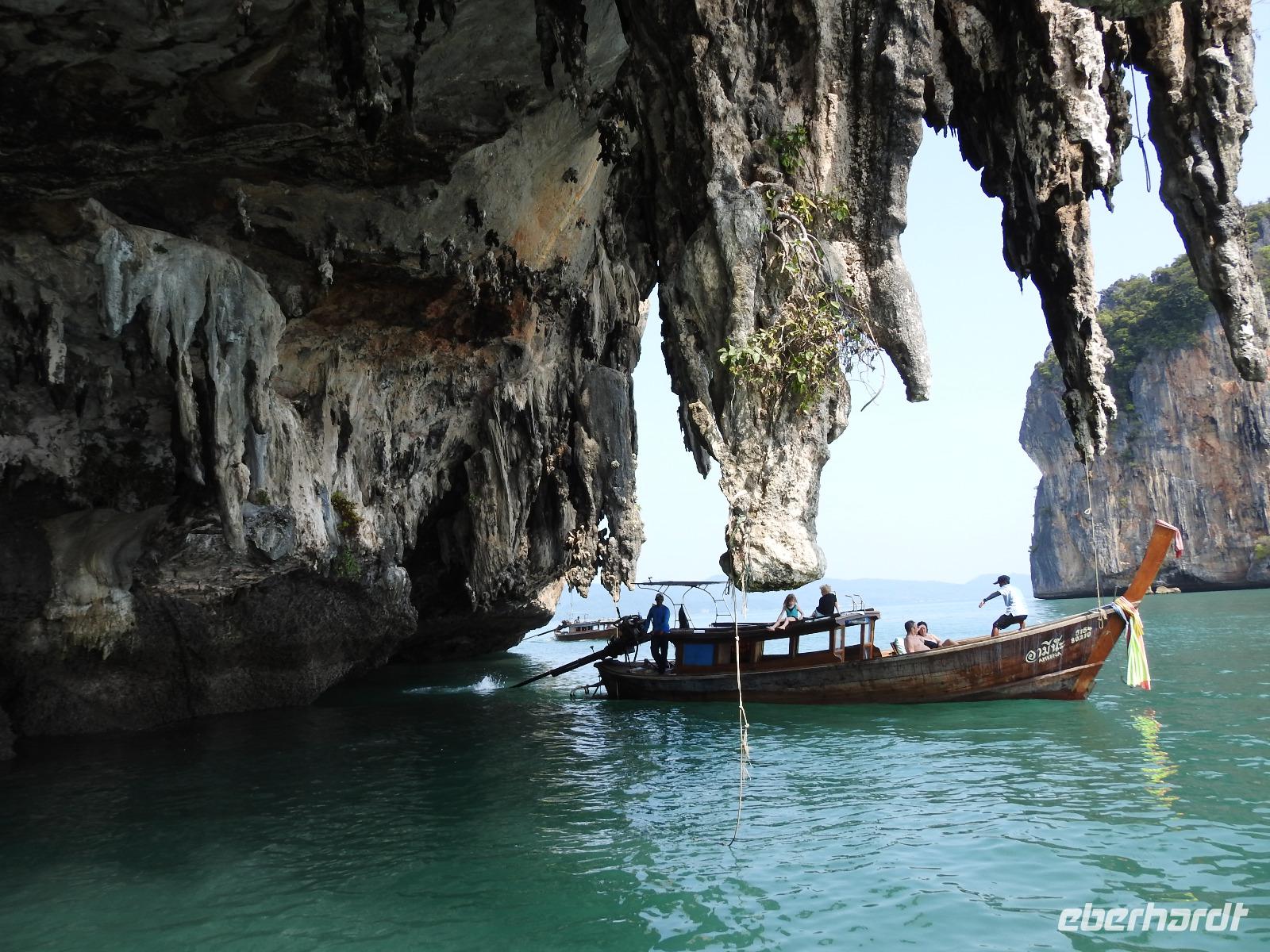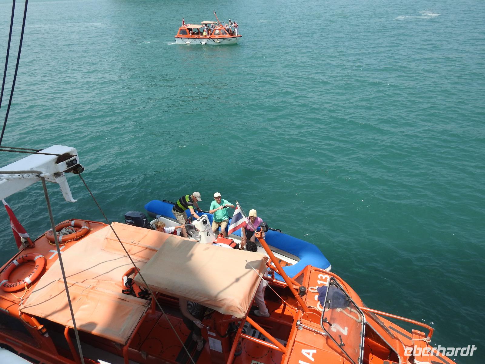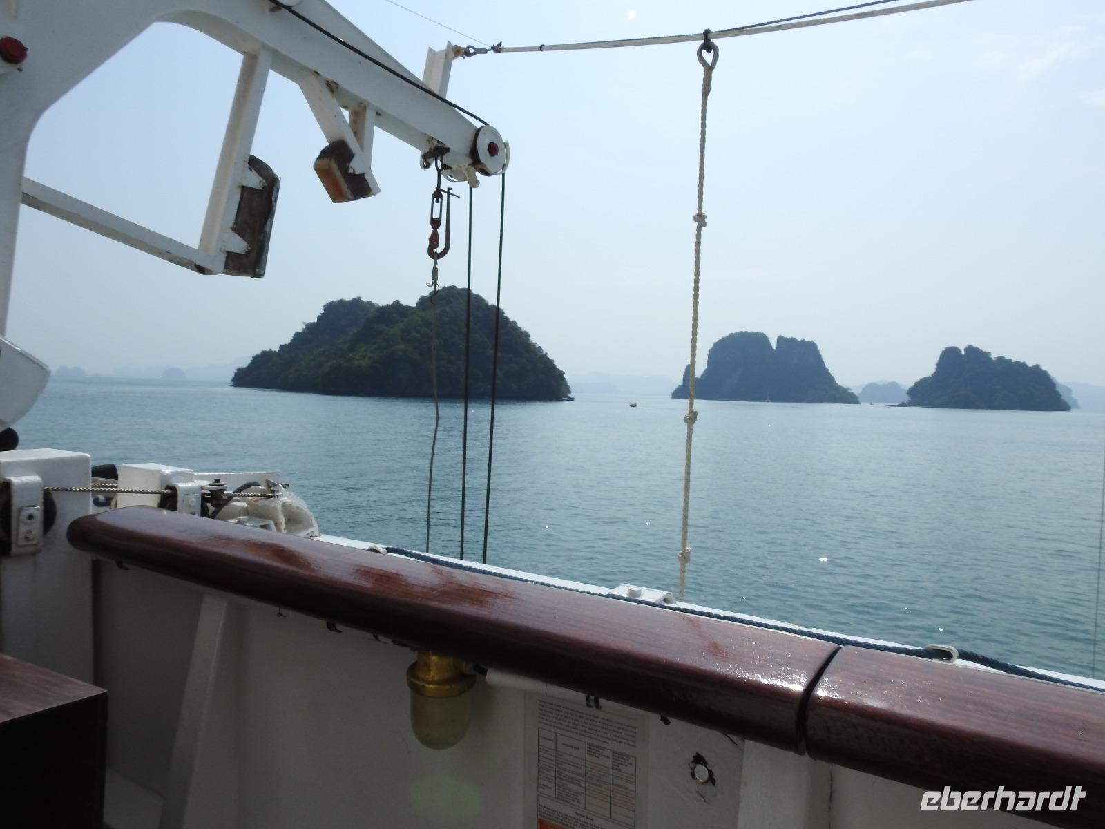 Frühmorgens zeigt sich die aufgehende Sonne als glutroter Ball. Wir müssen pünktlich aufstehen, denn um acht Uhr erwarten uns die thailändischen Behörden zur Gesichtskontrolle. Außerdem werden die von uns ausgefüllten Einreiseformulare geprüft. Der Beamte, an den wir geraten ist äußerst exakt, wer eine Spalte nicht ausgefüllt hat, wird zum Nachschreiben beordert. Mich hat er beim Wickel, weil ihm meine Schrift nicht gefällt. Naja, auch den Typen haben wir überstanden. Widmen wir uns wieder den schönen Erlebnissen. Heute Vormittag steht der langerwartete Fototender auf dem Programm. Zunächst gibt es von der Kreuzfahrtleiterin Monika eine Einweisung, dann wird durchgezählt, wie viele Gäste teilnehmen möchten. Man ist daran interessiert, dass die Gäste Platz im Tender haben. Maximal 15 Gäste sollen auf einem Boot sein. Auf unserem sind zwanzig, weil die Kinder nicht mitgezählt werden. Wir nehmen Kurs auf die Kalksteinfelsen, die mit ihren fantastischen Formationen jedes Fotografenherz höherschlagen lassen. Dann fängt irgendetwas auf unserem Boot an zu piepen. Was zur Folge hat, dass der Kapitän zwei Zodiaks (Schlauchboote) schickt, die uns aufsammeln und mit denen wir die Fotosafari fortsetzen. Wir sind nicht unglücklich darüber. Außer uns sieben Eberhardt Reisenden ist noch eine Familie aus Luxemburg an Bord. Das passt. Ab und zu trifft uns die Gischt und wir werden nass. Aber nichts kann uns die Laune verderben. Wir sind neugierig auf die Höhlen, in denen die Einheimischen Schwalbennester abbauen, die teuer an den chinesischen Markt verkauft werden. Außerdem haben wir die einmalige Gelegenheit, das Schiff von allen Seiten und unter Segeln, zu fotografieren. Nach ca. einer Stunde kehren wir zurück an Bord und werden mit einem leckeren Mittagsbuffet verwöhnt. Bald schon, nämlich 12.15 Uhr, besteigen wir das nächste Boot, diesmal sind es zwei Schnellboote, auf denen wir den Nachmittag verbringen. Auf einem Boot sind die englisch sprechenden Gäste, auf dem anderen die Deutschen. Unsere thailändischen Gastgeber sind sehr aufmerksam und die örtliche Reiseleiterin, namens Ej, super. Nach den ersten einweisenden Worten wird Gas gegeben und wir brausen durch die traumhafte Landschaft. Wir fahren in eine Grotte, besuchen das thailändische Dorf Ko Panyi und die James Bond Insel mit dem berühmten Felsen. Unterwegs gibt es ein Mittagessen mit thailändischen Gerichten. Für die Souvenirjäger ist hier Zeit und Gelegenheit zum Einkaufen (am Anfang des Marktes stand auch ein Geldautomat). Nach einem weiteren Tag voller spannender Eindrücke kehren wir glücklich und zufrieden auf unsere Star Clipper zurück.