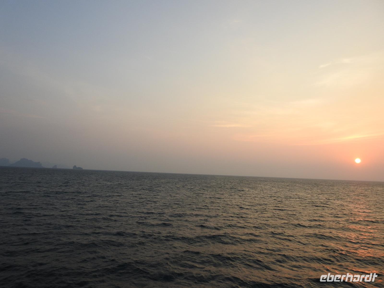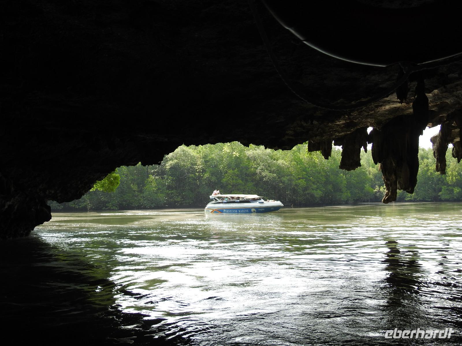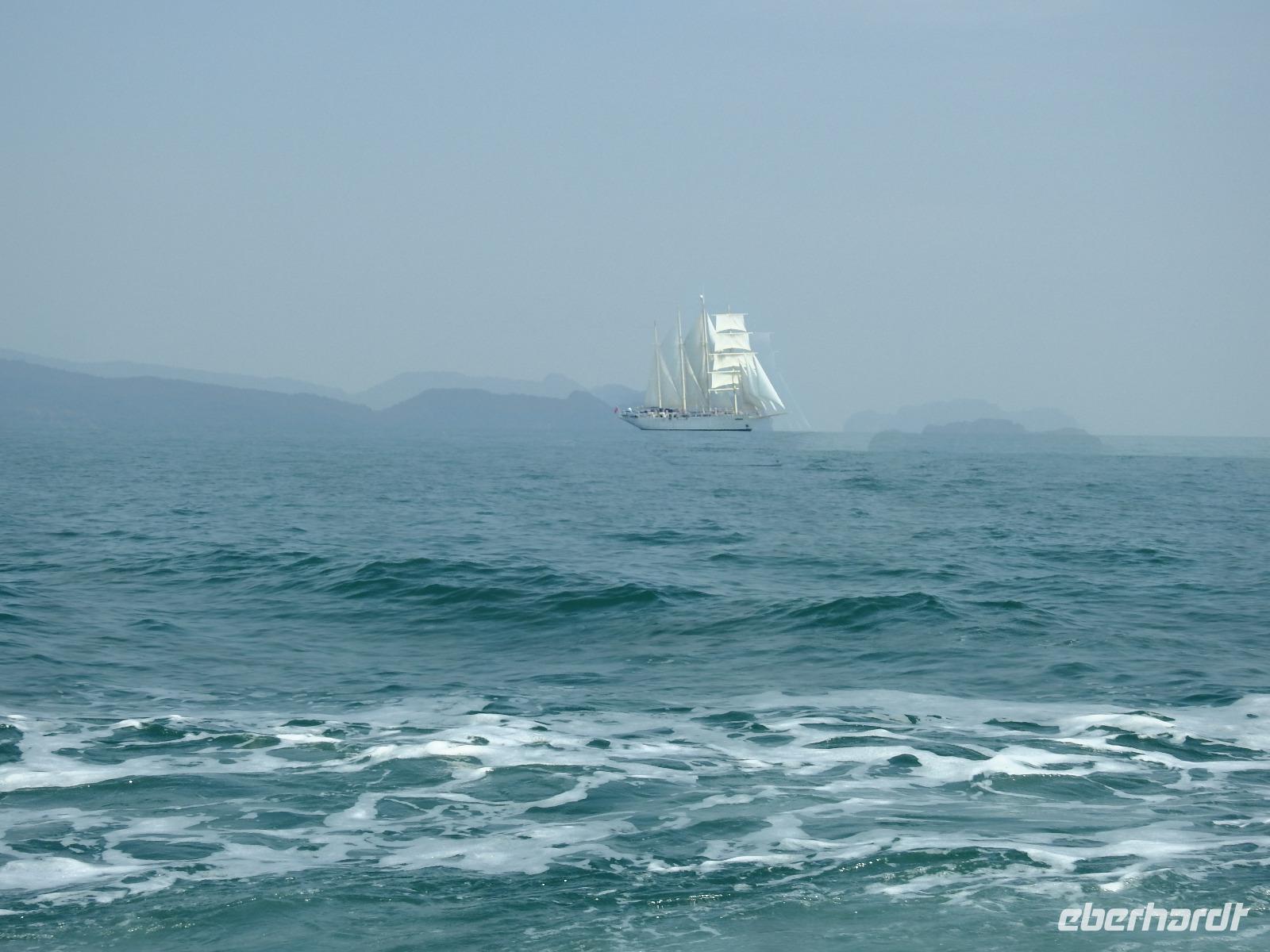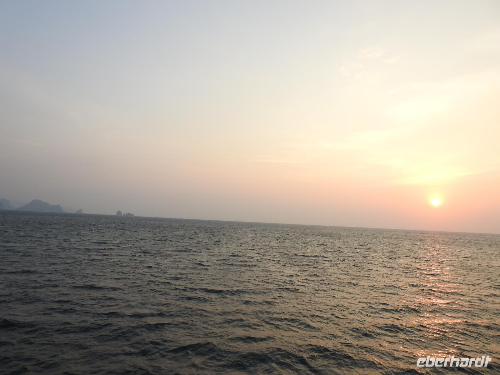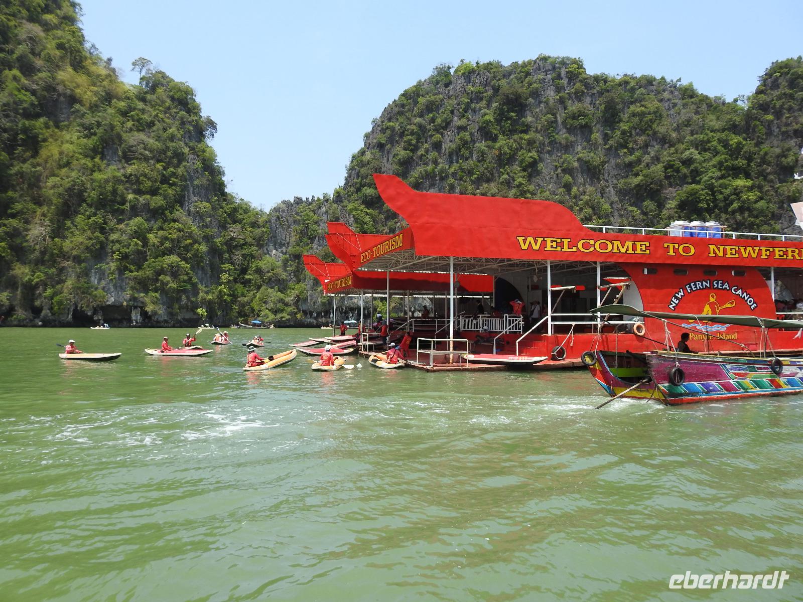 Frühmorgens zeigt sich die aufgehende Sonne als glutroter Ball. Wir müssen pünktlich aufstehen, denn um acht Uhr erwarten uns die thailändischen Behörden zur Gesichtskontrolle. Außerdem werden die von uns ausgefüllten Einreiseformulare geprüft. Der Beamte, an den wir geraten ist äußerst exakt, wer eine Spalte nicht ausgefüllt hat, wird zum Nachschreiben beordert. Mich hat er beim Wickel, weil ihm meine Schrift nicht gefällt. Naja, auch den Typen haben wir überstanden. Widmen wir uns wieder den schönen Erlebnissen. Heute Vormittag steht der langerwartete Fototender auf dem Programm. Zunächst gibt es von der Kreuzfahrtleiterin Monika eine Einweisung, dann wird durchgezählt, wie viele Gäste teilnehmen möchten. Man ist daran interessiert, dass die Gäste Platz im Tender haben. Maximal 15 Gäste sollen auf einem Boot sein. Auf unserem sind zwanzig, weil die Kinder nicht mitgezählt werden. Wir nehmen Kurs auf die Kalksteinfelsen, die mit ihren fantastischen Formationen jedes Fotografenherz höherschlagen lassen. Dann fängt irgendetwas auf unserem Boot an zu piepen. Was zur Folge hat, dass der Kapitän zwei Zodiaks (Schlauchboote) schickt, die uns aufsammeln und mit denen wir die Fotosafari fortsetzen. Wir sind nicht unglücklich darüber. Außer uns sieben Eberhardt Reisenden ist noch eine Familie aus Luxemburg an Bord. Das passt. Ab und zu trifft uns die Gischt und wir werden nass. Aber nichts kann uns die Laune verderben. Wir sind neugierig auf die Höhlen, in denen die Einheimischen Schwalbennester abbauen, die teuer an den chinesischen Markt verkauft werden. Außerdem haben wir die einmalige Gelegenheit, das Schiff von allen Seiten und unter Segeln, zu fotografieren. Nach ca. einer Stunde kehren wir zurück an Bord und werden mit einem leckeren Mittagsbuffet verwöhnt. Bald schon, nämlich 12.15 Uhr, besteigen wir das nächste Boot, diesmal sind es zwei Schnellboote, auf denen wir den Nachmittag verbringen. Auf einem Boot sind die englisch sprechenden Gäste, auf dem anderen die Deutschen. Unsere thailändischen Gastgeber sind sehr aufmerksam und die örtliche Reiseleiterin, namens Ej, super. Nach den ersten einweisenden Worten wird Gas gegeben und wir brausen durch die traumhafte Landschaft. Wir fahren in eine Grotte, besuchen das thailändische Dorf Ko Panyi und die James Bond Insel mit dem berühmten Felsen. Unterwegs gibt es ein Mittagessen mit thailändischen Gerichten. Für die Souvenirjäger ist hier Zeit und Gelegenheit zum Einkaufen (am Anfang des Marktes stand auch ein Geldautomat). Nach einem weiteren Tag voller spannender Eindrücke kehren wir glücklich und zufrieden auf unsere Star Clipper zurück.