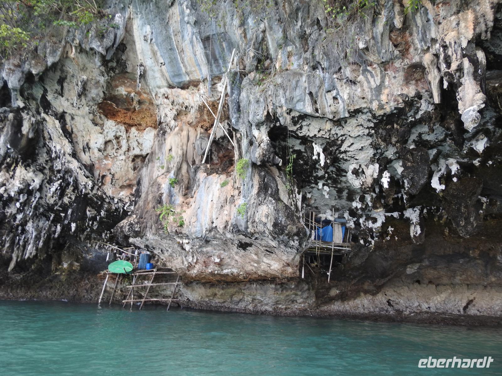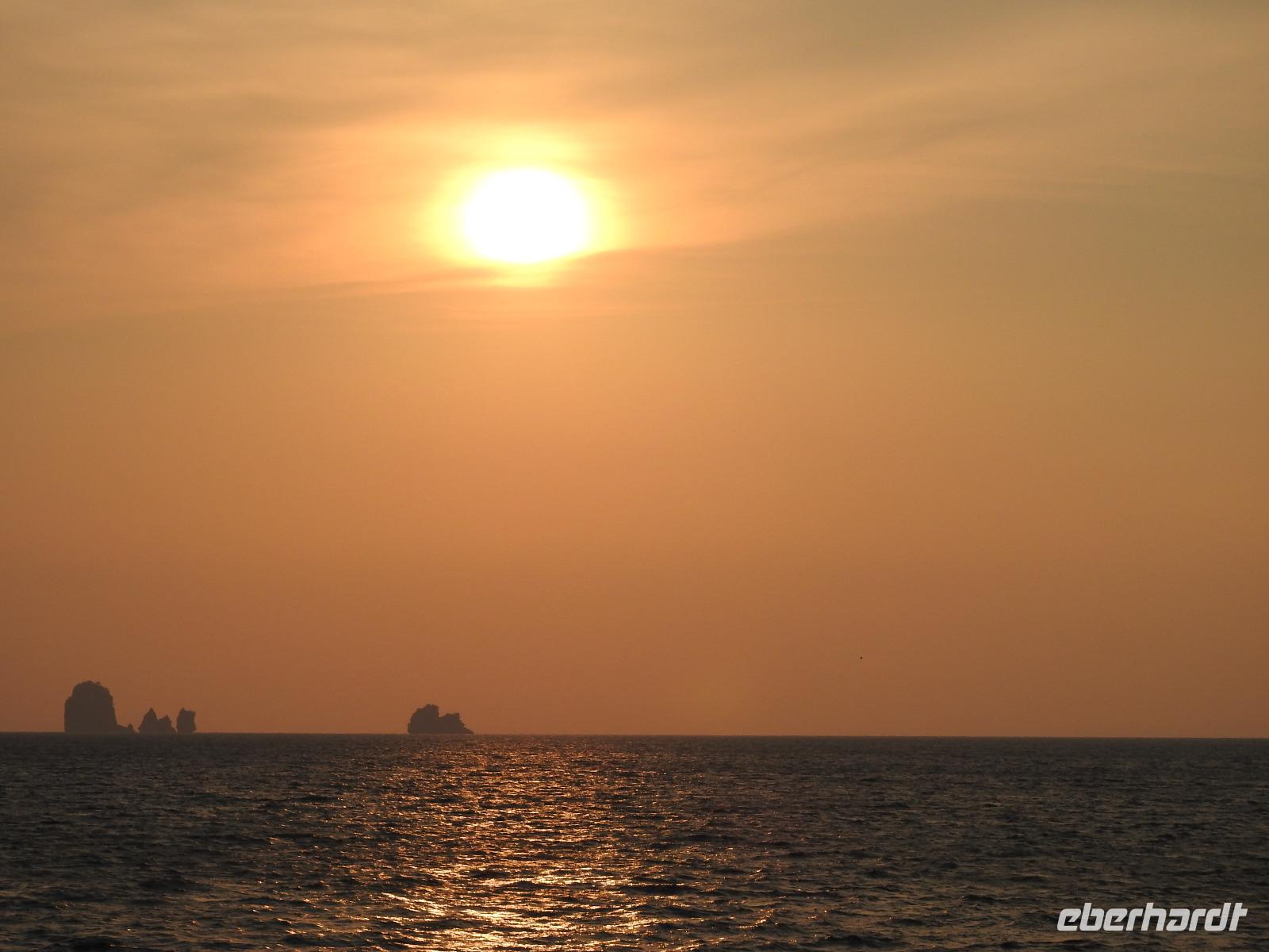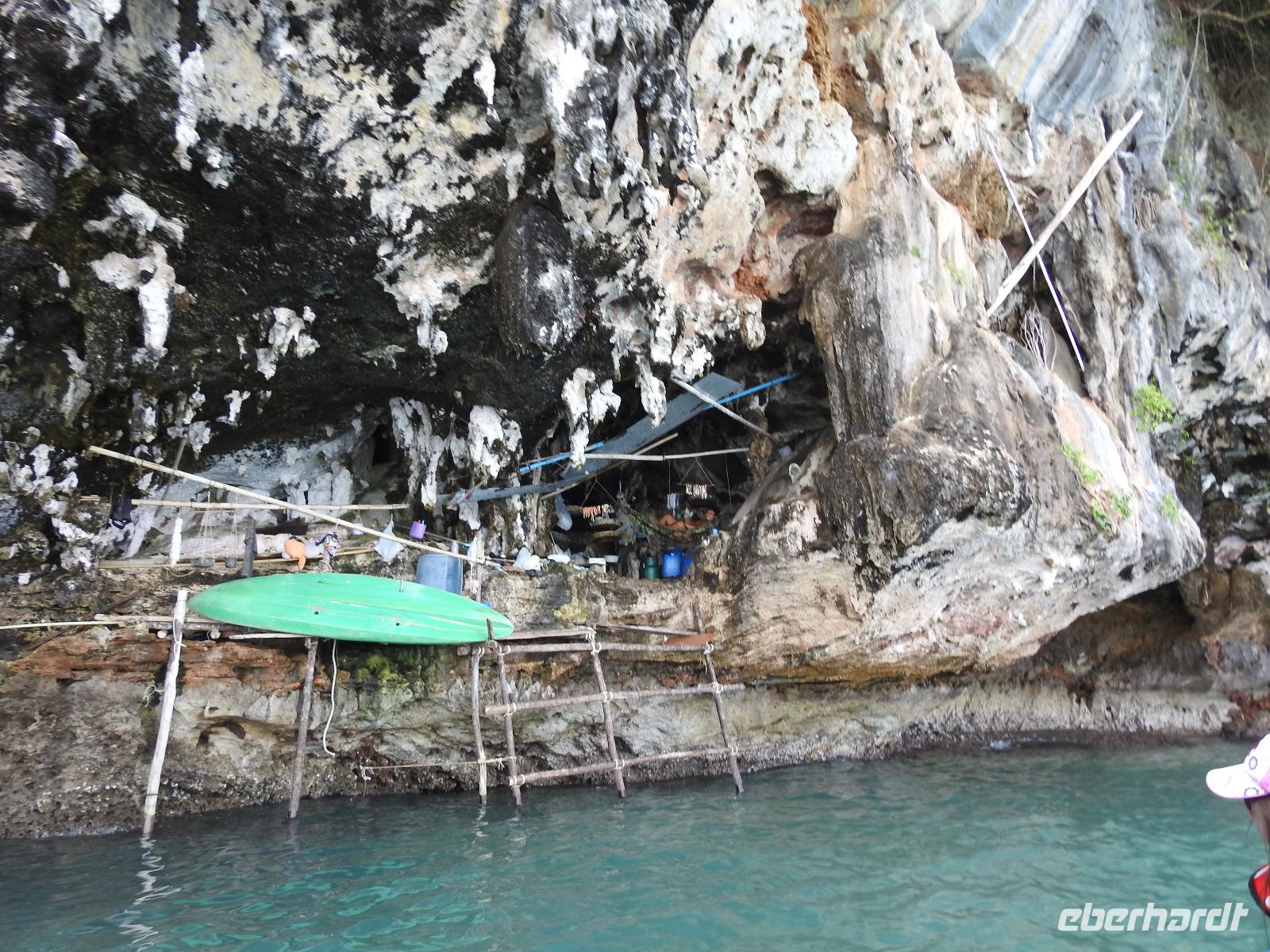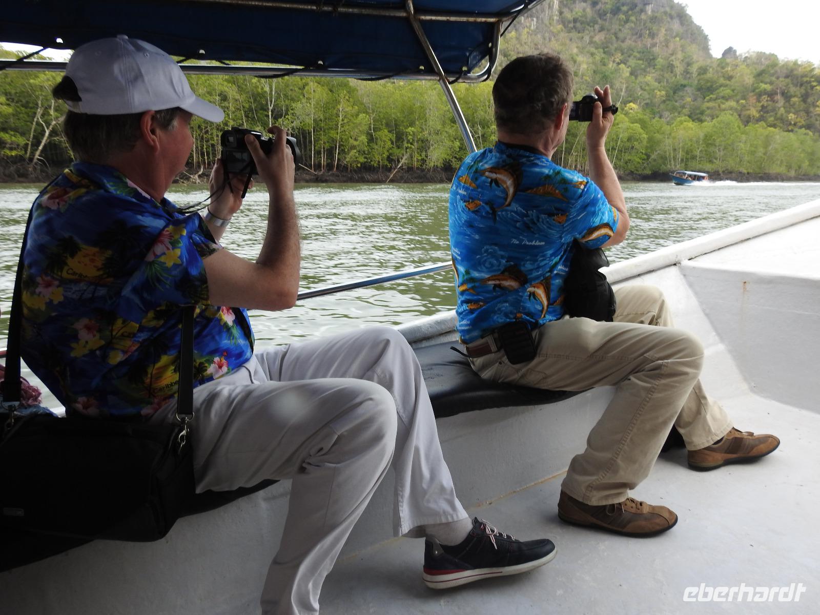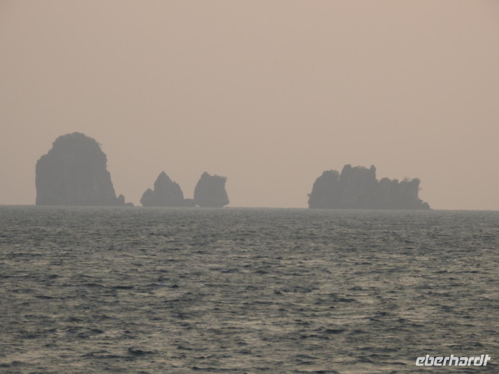 Frühmorgens zeigt sich die aufgehende Sonne als glutroter Ball. Wir müssen pünktlich aufstehen, denn um acht Uhr erwarten uns die thailändischen Behörden zur Gesichtskontrolle. Außerdem werden die von uns ausgefüllten Einreiseformulare geprüft. Der Beamte, an den wir geraten ist äußerst exakt, wer eine Spalte nicht ausgefüllt hat, wird zum Nachschreiben beordert. Mich hat er beim Wickel, weil ihm meine Schrift nicht gefällt. Naja, auch den Typen haben wir überstanden. Widmen wir uns wieder den schönen Erlebnissen. Heute Vormittag steht der langerwartete Fototender auf dem Programm. Zunächst gibt es von der Kreuzfahrtleiterin Monika eine Einweisung, dann wird durchgezählt, wie viele Gäste teilnehmen möchten. Man ist daran interessiert, dass die Gäste Platz im Tender haben. Maximal 15 Gäste sollen auf einem Boot sein. Auf unserem sind zwanzig, weil die Kinder nicht mitgezählt werden. Wir nehmen Kurs auf die Kalksteinfelsen, die mit ihren fantastischen Formationen jedes Fotografenherz höherschlagen lassen. Dann fängt irgendetwas auf unserem Boot an zu piepen. Was zur Folge hat, dass der Kapitän zwei Zodiaks (Schlauchboote) schickt, die uns aufsammeln und mit denen wir die Fotosafari fortsetzen. Wir sind nicht unglücklich darüber. Außer uns sieben Eberhardt Reisenden ist noch eine Familie aus Luxemburg an Bord. Das passt. Ab und zu trifft uns die Gischt und wir werden nass. Aber nichts kann uns die Laune verderben. Wir sind neugierig auf die Höhlen, in denen die Einheimischen Schwalbennester abbauen, die teuer an den chinesischen Markt verkauft werden. Außerdem haben wir die einmalige Gelegenheit, das Schiff von allen Seiten und unter Segeln, zu fotografieren. Nach ca. einer Stunde kehren wir zurück an Bord und werden mit einem leckeren Mittagsbuffet verwöhnt. Bald schon, nämlich 12.15 Uhr, besteigen wir das nächste Boot, diesmal sind es zwei Schnellboote, auf denen wir den Nachmittag verbringen. Auf einem Boot sind die englisch sprechenden Gäste, auf dem anderen die Deutschen. Unsere thailändischen Gastgeber sind sehr aufmerksam und die örtliche Reiseleiterin, namens Ej, super. Nach den ersten einweisenden Worten wird Gas gegeben und wir brausen durch die traumhafte Landschaft. Wir fahren in eine Grotte, besuchen das thailändische Dorf Ko Panyi und die James Bond Insel mit dem berühmten Felsen. Unterwegs gibt es ein Mittagessen mit thailändischen Gerichten. Für die Souvenirjäger ist hier Zeit und Gelegenheit zum Einkaufen (am Anfang des Marktes stand auch ein Geldautomat). Nach einem weiteren Tag voller spannender Eindrücke kehren wir glücklich und zufrieden auf unsere Star Clipper zurück.
