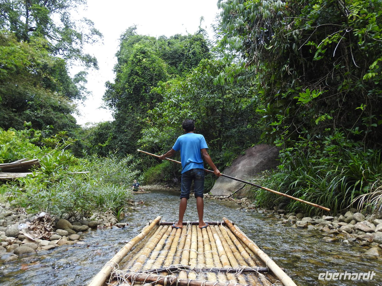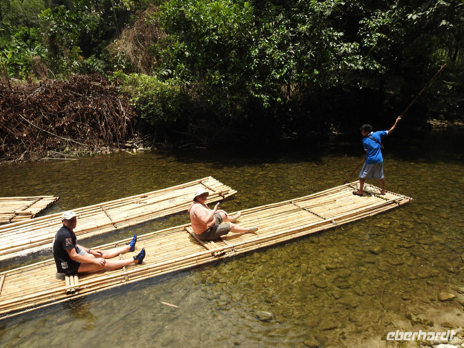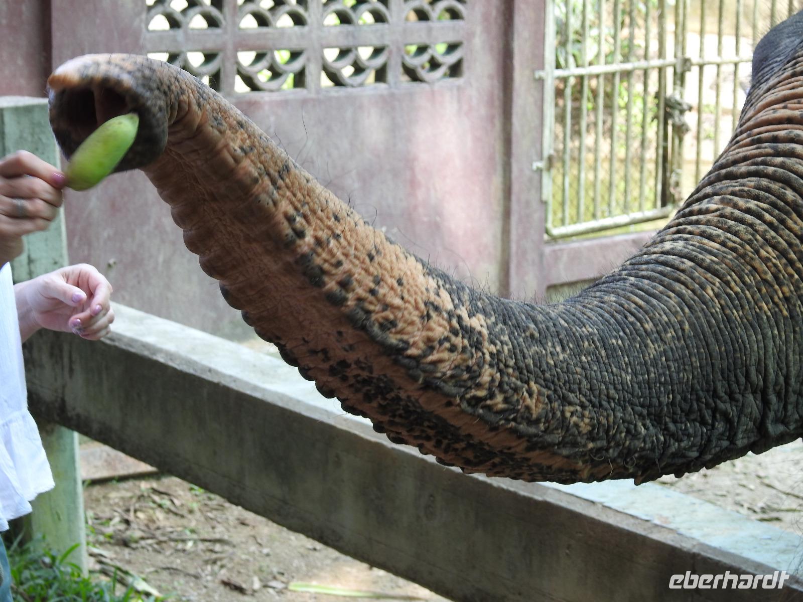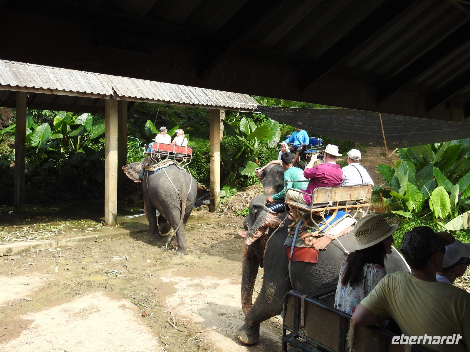 Zur Auswahl stehen heute: ein Strand- und Schnorcheltag (geteilt mit hunderten Chinesen) oder ein Ausflug mit dem Titel ELEFANTEN UND BAMBOO RAFTING. Da dieser Ausflug neu im Star Clipper Programm ist und Monika, unsere Kreuzfahrtleiterin ihn auch nicht kennt, sind die Informationen im Vorfeld etwas schwammig und wir müssen uns überraschen lassen. 25 Gäste nehmen an dem Ausflug teil, davon die Hälfte Deutsche, die anderen sind Englisch sprechende Gäste. Wir werden mit einem Speedboot abgeholt und nach den üblichen Sicherheitshinweisen, geht es mit 60 Stundekilometern ab übers Meer. Etwas mehr als eine Stunde brausen wir dahin. Unseren ersten Stopp legen wir an einer Schildkrötenaufzuchtstation ein. Diese wurde als Projekt des Königs angelegt. Als die Thailänder feststellten, dass ihre Schildkrötenpopulation zurück ging, haben sie das Leben der Schildkröten studiert und versuchen nun hier, den Schwund zu stoppen. In verschiedenen Becken schwimmen Schildkröten in unterschiedlichen Altersklassen. Die ersten sind noch ganz klein und nur ein paar Tage alt, andere schon ein paar Monate und ein paar ausgewachsene Schildkröten gibt es auch. Unsere Fahrt geht weiter zum Bamboo Rafting. Die Fahrt findet auf mit Bindfaden zusammengebundenen Bambusstangen statt, auf denen quer noch mal jeweils drei Bambusstangen als Sitz befestigt wurden. Man sitzt quasi mit dem Hintern im Wasser (Gott sei Dank ist es warm). Das ganze Gerät wird von jungen Männern dann durch den Fluss gestakt. Das Wasser bewegt sich nur an manchen Stellen etwas schneller, so dass die Flößer viel Kraft benötigen, um uns die halbe Stunde durch die Landschaft zu fahren. Sowohl beim Einstieg als auch beim Ausstieg gibt es mit einem Vorhang abgetrennte Räumchen, in denen man die Sachen wechseln kann. Nun fahren wir in ein thailändisches Restaurant zum Mittagessen. Es gibt Suppe, Reis, Hühnchen und Fisch sowie ein Softgetränk. Zum Abschluss fahren wir zu einer Familie, die Elefanten beherbergt. Lt. Aussage unseres örtlichen Guides sind die Elefanten in der Familie groß geworden und können nicht mehr ausgewildert werden, da sie sich nicht allein zurechtfinden können. Damit die Elefanten durch das gute Futter nicht zu dick werden, hat die Familie ihnen eine Laufstrecke gebaut, auf der sie sich nun den ganzen Tag bewegen können und dabei auch noch auf dem Rücken Touristen mitnehmen können. Die Elefantenführer haben ihren Spaß, ihre Gäste von den Elefanten nass spritzen zu lassen. Das Vergnügen ist auf beiden Seiten. Redlich geschafft, kommen wir zurück zu unserem Schnellboot und fahren wieder eine Stunde zurück zur Star Clipper.