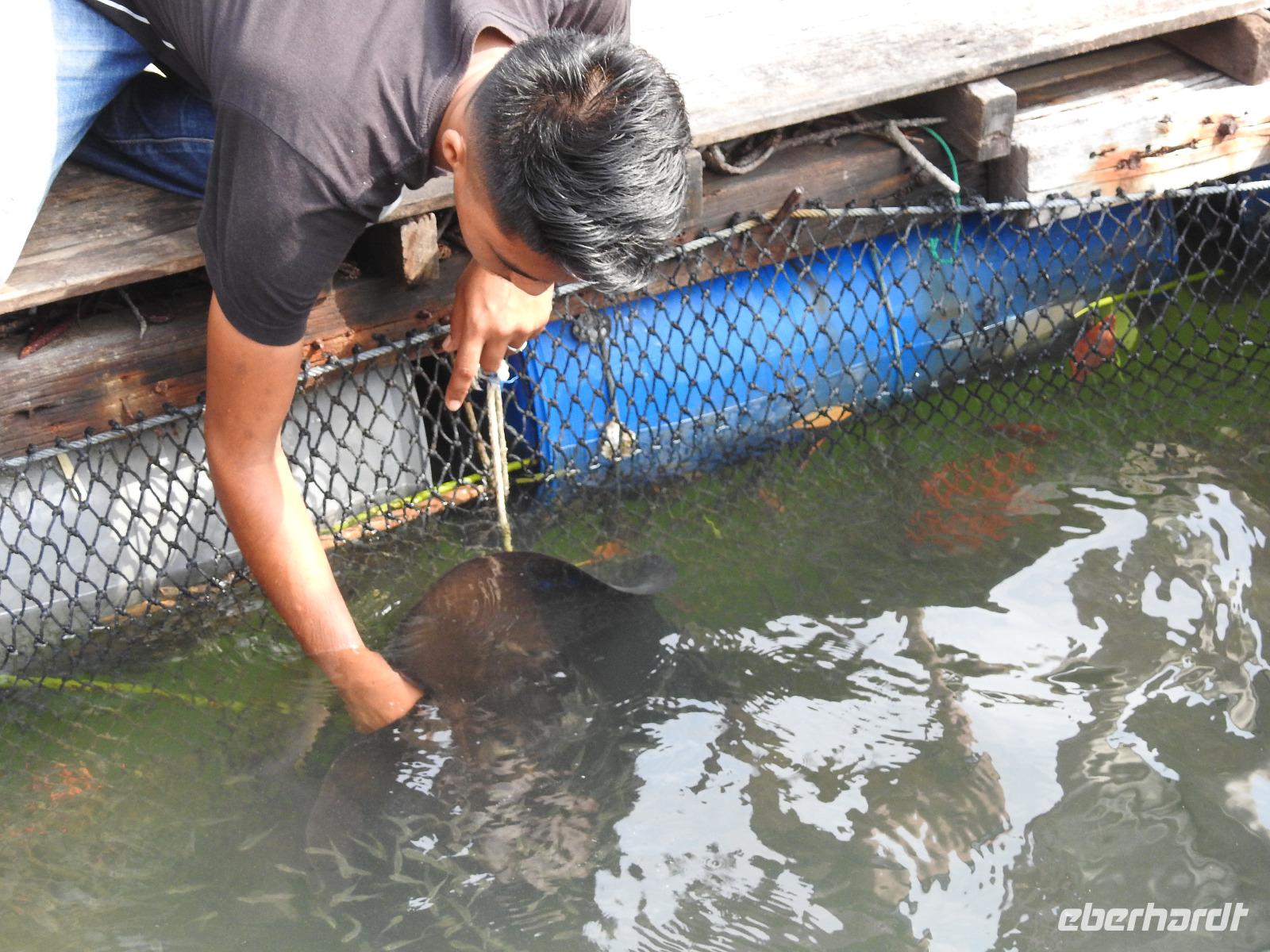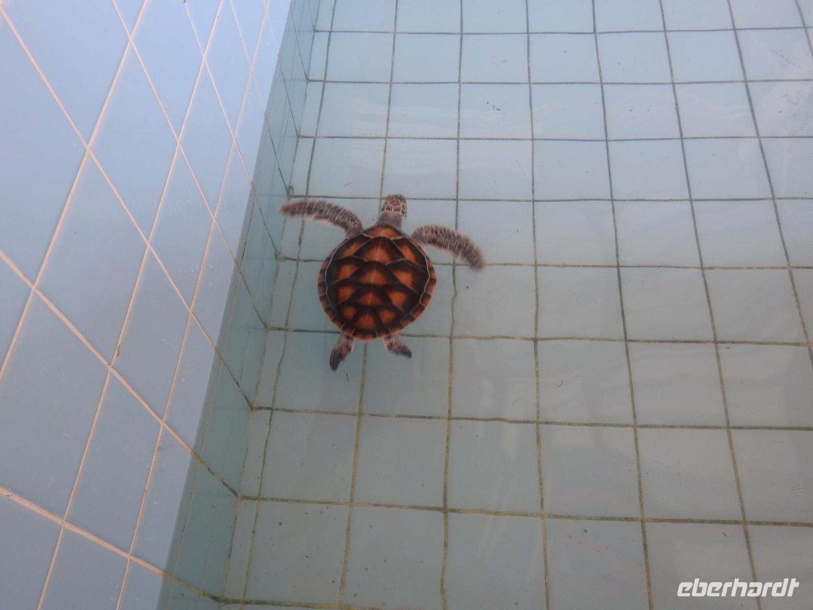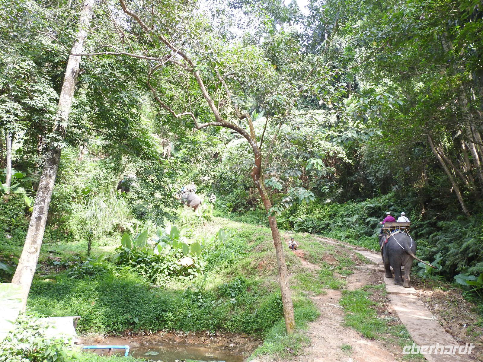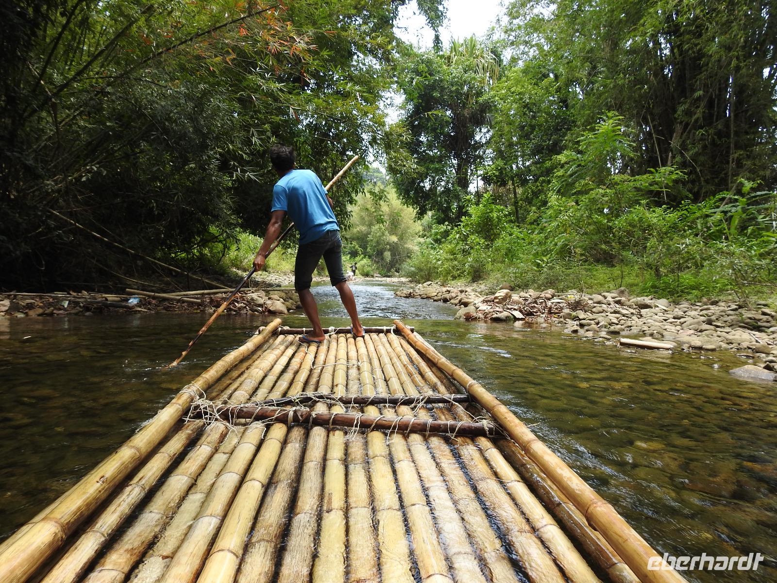 Zur Auswahl stehen heute: ein Strand- und Schnorcheltag (geteilt mit hunderten Chinesen) oder ein Ausflug mit dem Titel ELEFANTEN UND BAMBOO RAFTING. Da dieser Ausflug neu im Star Clipper Programm ist und Monika, unsere Kreuzfahrtleiterin ihn auch nicht kennt, sind die Informationen im Vorfeld etwas schwammig und wir müssen uns überraschen lassen. 25 Gäste nehmen an dem Ausflug teil, davon die Hälfte Deutsche, die anderen sind Englisch sprechende Gäste. Wir werden mit einem Speedboot abgeholt und nach den üblichen Sicherheitshinweisen, geht es mit 60 Stundekilometern ab übers Meer. Etwas mehr als eine Stunde brausen wir dahin. Unseren ersten Stopp legen wir an einer Schildkrötenaufzuchtstation ein. Diese wurde als Projekt des Königs angelegt. Als die Thailänder feststellten, dass ihre Schildkrötenpopulation zurück ging, haben sie das Leben der Schildkröten studiert und versuchen nun hier, den Schwund zu stoppen. In verschiedenen Becken schwimmen Schildkröten in unterschiedlichen Altersklassen. Die ersten sind noch ganz klein und nur ein paar Tage alt, andere schon ein paar Monate und ein paar ausgewachsene Schildkröten gibt es auch. Unsere Fahrt geht weiter zum Bamboo Rafting. Die Fahrt findet auf mit Bindfaden zusammengebundenen Bambusstangen statt, auf denen quer noch mal jeweils drei Bambusstangen als Sitz befestigt wurden. Man sitzt quasi mit dem Hintern im Wasser (Gott sei Dank ist es warm). Das ganze Gerät wird von jungen Männern dann durch den Fluss gestakt. Das Wasser bewegt sich nur an manchen Stellen etwas schneller, so dass die Flößer viel Kraft benötigen, um uns die halbe Stunde durch die Landschaft zu fahren. Sowohl beim Einstieg als auch beim Ausstieg gibt es mit einem Vorhang abgetrennte Räumchen, in denen man die Sachen wechseln kann. Nun fahren wir in ein thailändisches Restaurant zum Mittagessen. Es gibt Suppe, Reis, Hühnchen und Fisch sowie ein Softgetränk. Zum Abschluss fahren wir zu einer Familie, die Elefanten beherbergt. Lt. Aussage unseres örtlichen Guides sind die Elefanten in der Familie groß geworden und können nicht mehr ausgewildert werden, da sie sich nicht allein zurechtfinden können. Damit die Elefanten durch das gute Futter nicht zu dick werden, hat die Familie ihnen eine Laufstrecke gebaut, auf der sie sich nun den ganzen Tag bewegen können und dabei auch noch auf dem Rücken Touristen mitnehmen können. Die Elefantenführer haben ihren Spaß, ihre Gäste von den Elefanten nass spritzen zu lassen. Das Vergnügen ist auf beiden Seiten. Redlich geschafft, kommen wir zurück zu unserem Schnellboot und fahren wieder eine Stunde zurück zur Star Clipper.