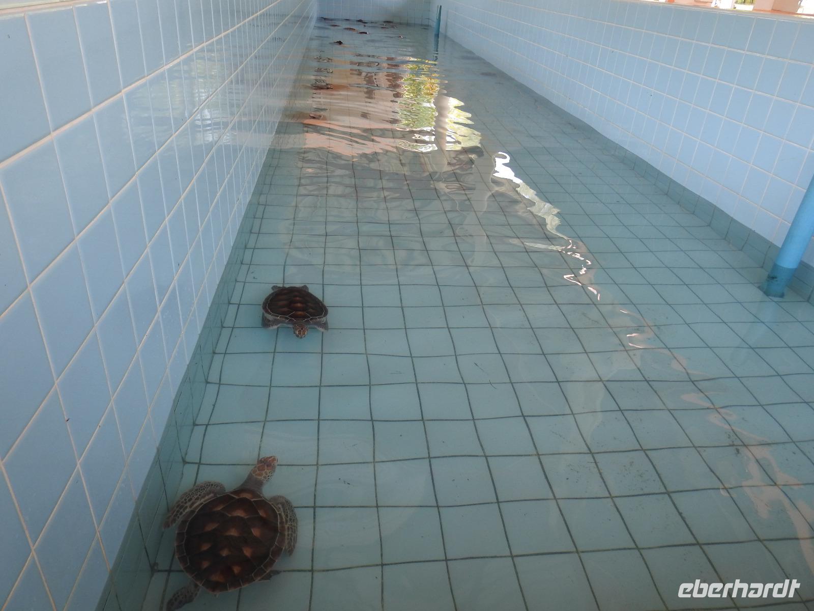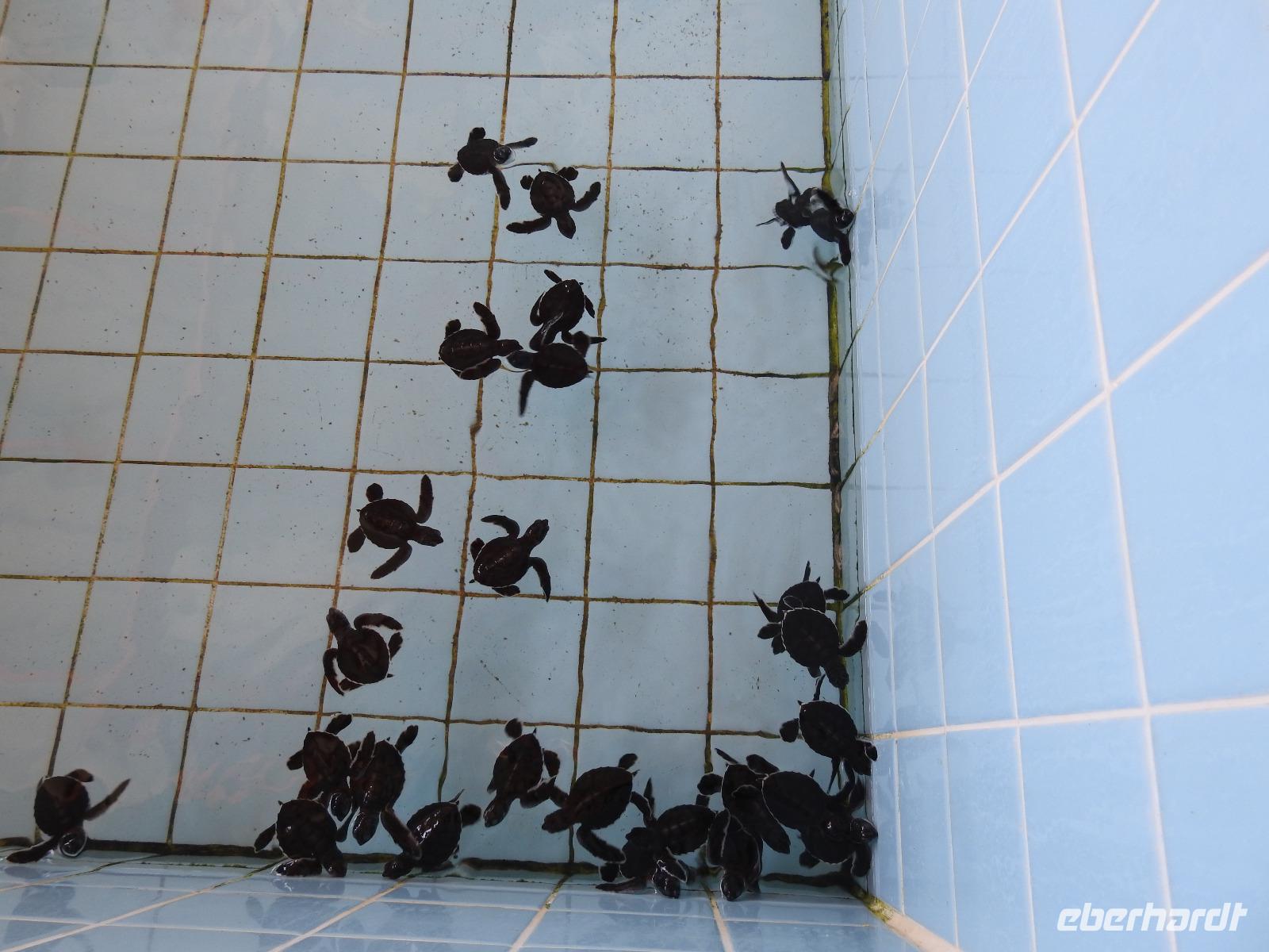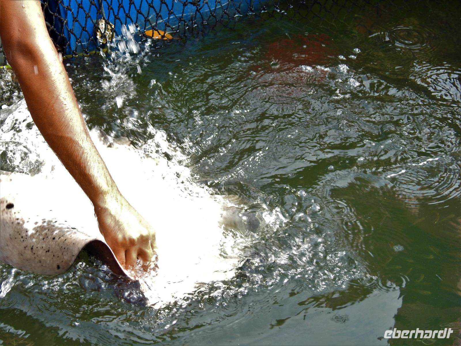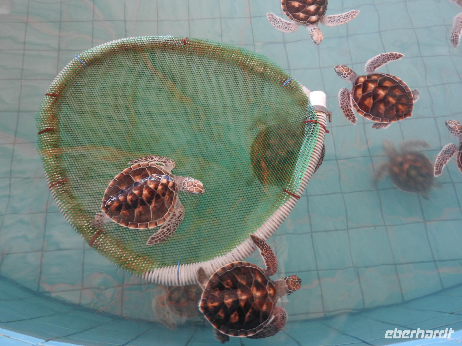 Zur Auswahl stehen heute: ein Strand- und Schnorcheltag (geteilt mit hunderten Chinesen) oder ein Ausflug mit dem Titel ELEFANTEN UND BAMBOO RAFTING. Da dieser Ausflug neu im Star Clipper Programm ist und Monika, unsere Kreuzfahrtleiterin ihn auch nicht kennt, sind die Informationen im Vorfeld etwas schwammig und wir müssen uns überraschen lassen. 25 Gäste nehmen an dem Ausflug teil, davon die Hälfte Deutsche, die anderen sind Englisch sprechende Gäste. Wir werden mit einem Speedboot abgeholt und nach den üblichen Sicherheitshinweisen, geht es mit 60 Stundekilometern ab übers Meer. Etwas mehr als eine Stunde brausen wir dahin. Unseren ersten Stopp legen wir an einer Schildkrötenaufzuchtstation ein. Diese wurde als Projekt des Königs angelegt. Als die Thailänder feststellten, dass ihre Schildkrötenpopulation zurück ging, haben sie das Leben der Schildkröten studiert und versuchen nun hier, den Schwund zu stoppen. In verschiedenen Becken schwimmen Schildkröten in unterschiedlichen Altersklassen. Die ersten sind noch ganz klein und nur ein paar Tage alt, andere schon ein paar Monate und ein paar ausgewachsene Schildkröten gibt es auch. Unsere Fahrt geht weiter zum Bamboo Rafting. Die Fahrt findet auf mit Bindfaden zusammengebundenen Bambusstangen statt, auf denen quer noch mal jeweils drei Bambusstangen als Sitz befestigt wurden. Man sitzt quasi mit dem Hintern im Wasser (Gott sei Dank ist es warm). Das ganze Gerät wird von jungen Männern dann durch den Fluss gestakt. Das Wasser bewegt sich nur an manchen Stellen etwas schneller, so dass die Flößer viel Kraft benötigen, um uns die halbe Stunde durch die Landschaft zu fahren. Sowohl beim Einstieg als auch beim Ausstieg gibt es mit einem Vorhang abgetrennte Räumchen, in denen man die Sachen wechseln kann. Nun fahren wir in ein thailändisches Restaurant zum Mittagessen. Es gibt Suppe, Reis, Hühnchen und Fisch sowie ein Softgetränk. Zum Abschluss fahren wir zu einer Familie, die Elefanten beherbergt. Lt. Aussage unseres örtlichen Guides sind die Elefanten in der Familie groß geworden und können nicht mehr ausgewildert werden, da sie sich nicht allein zurechtfinden können. Damit die Elefanten durch das gute Futter nicht zu dick werden, hat die Familie ihnen eine Laufstrecke gebaut, auf der sie sich nun den ganzen Tag bewegen können und dabei auch noch auf dem Rücken Touristen mitnehmen können. Die Elefantenführer haben ihren Spaß, ihre Gäste von den Elefanten nass spritzen zu lassen. Das Vergnügen ist auf beiden Seiten. Redlich geschafft, kommen wir zurück zu unserem Schnellboot und fahren wieder eine Stunde zurück zur Star Clipper.