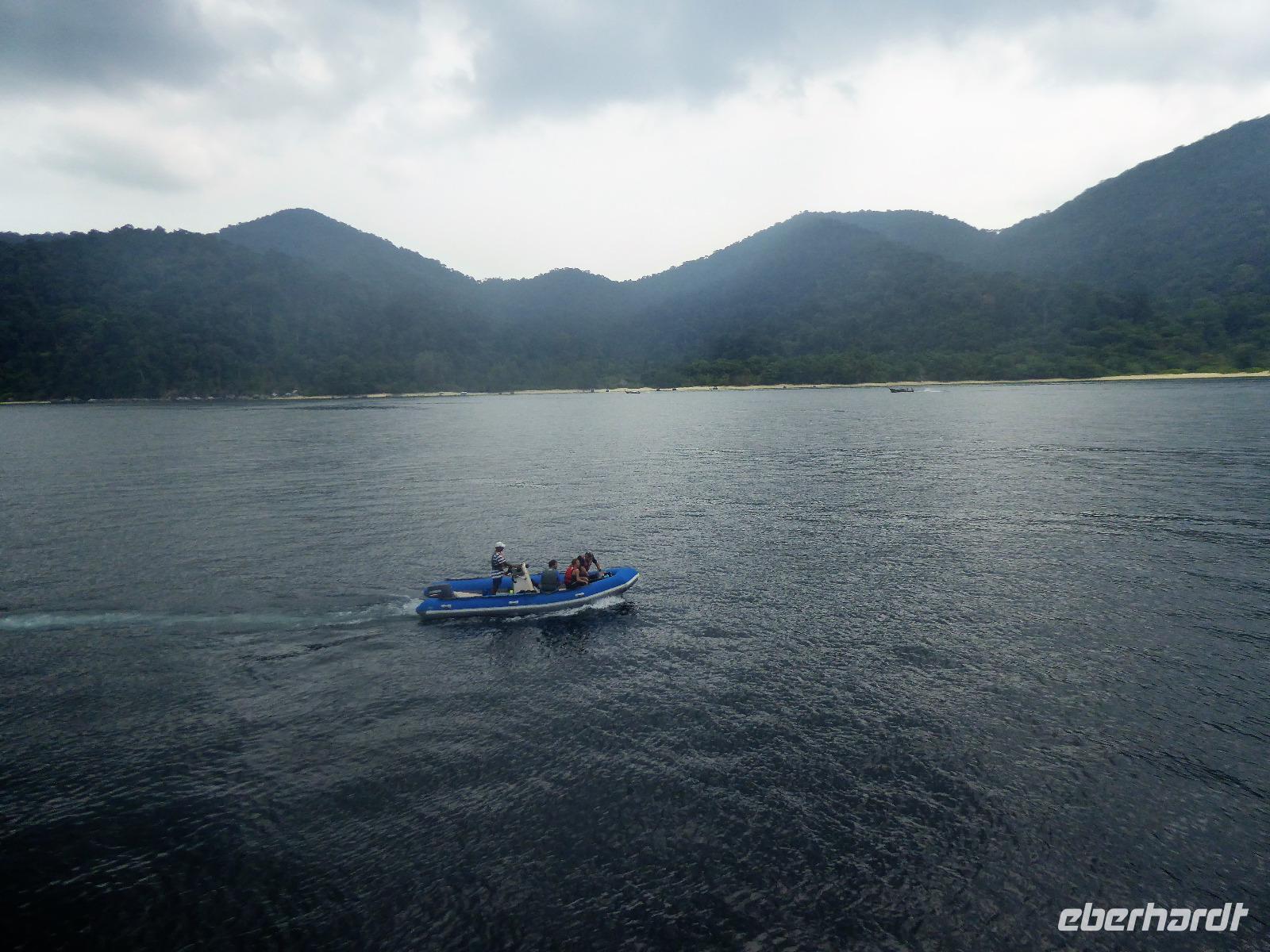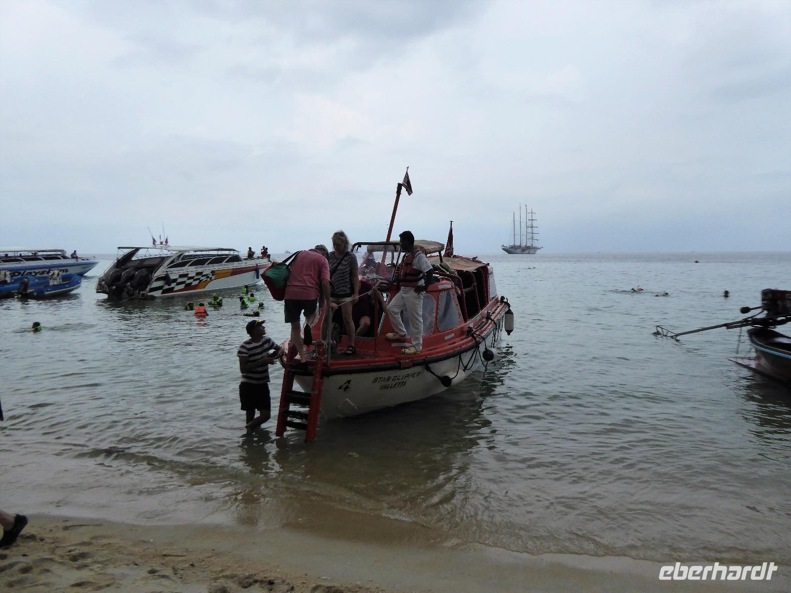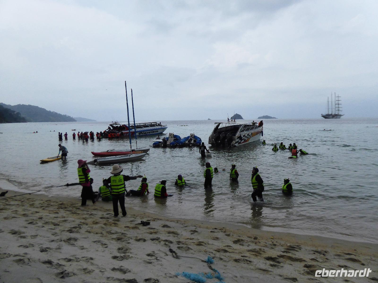 Obwohl wir abends von AUSSCHLAFEN gesprochen haben, treffen wir uns doch wieder um acht zum Frühstück. Naja, eigentlich ist es ja um neun, da wir die Uhren eine Stunde zurückgestellt haben. Um zehn werden alle Gäste an Deck gebeten, dort gibt es wichtige Informationen zum Ablauf des heutigen Tages und zu den nächsten Tagen. Bald schon werden die Rettungsboote zu Wasser gelassen, mit denen heute getendert wird. Der Himmel ist bedeckt, aber es ist tropisch warm. Schon von Weitem sehen wir im Wasser an „unserem" Strand grüne und rote Pünktchen. Diese entpuppen sich später als schwimmende Chinesen, die bereits den Strand okkupiert haben. Nun das ganze Spektakel dauert keine halbe Stunde, dann sind alle Chinesen wieder verschwunden und wir haben den Strand für uns. Aus einem der Tenderboote lädt die Crew das ganze Zubehör fürs BBQ aus, da haben die Jungs aber ganz schön zu schleppen. Wir machen es uns am Strand gemütlich, gehen Baden oder probieren Wassersportaktivitäten aus. Wasserskifahren ist gar nicht so einfach, was? Während des BBQs zieht sich der Himmel immer mehr zusammen, es wird fast dunkelgrau und ein paar dicke Tropfen fallen schon herab. Kurz entschlossen raffen wir unsere Sachen zusammen und fahren zum Schiff zurück. Zeit zum Entspannen an Bord.