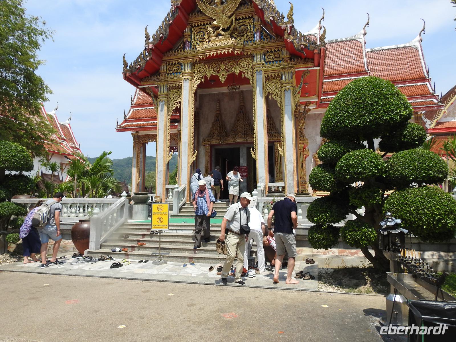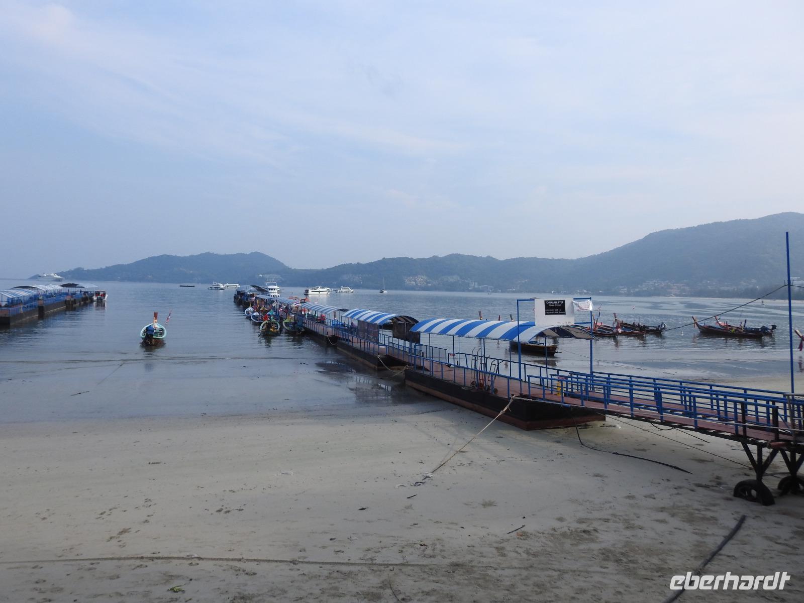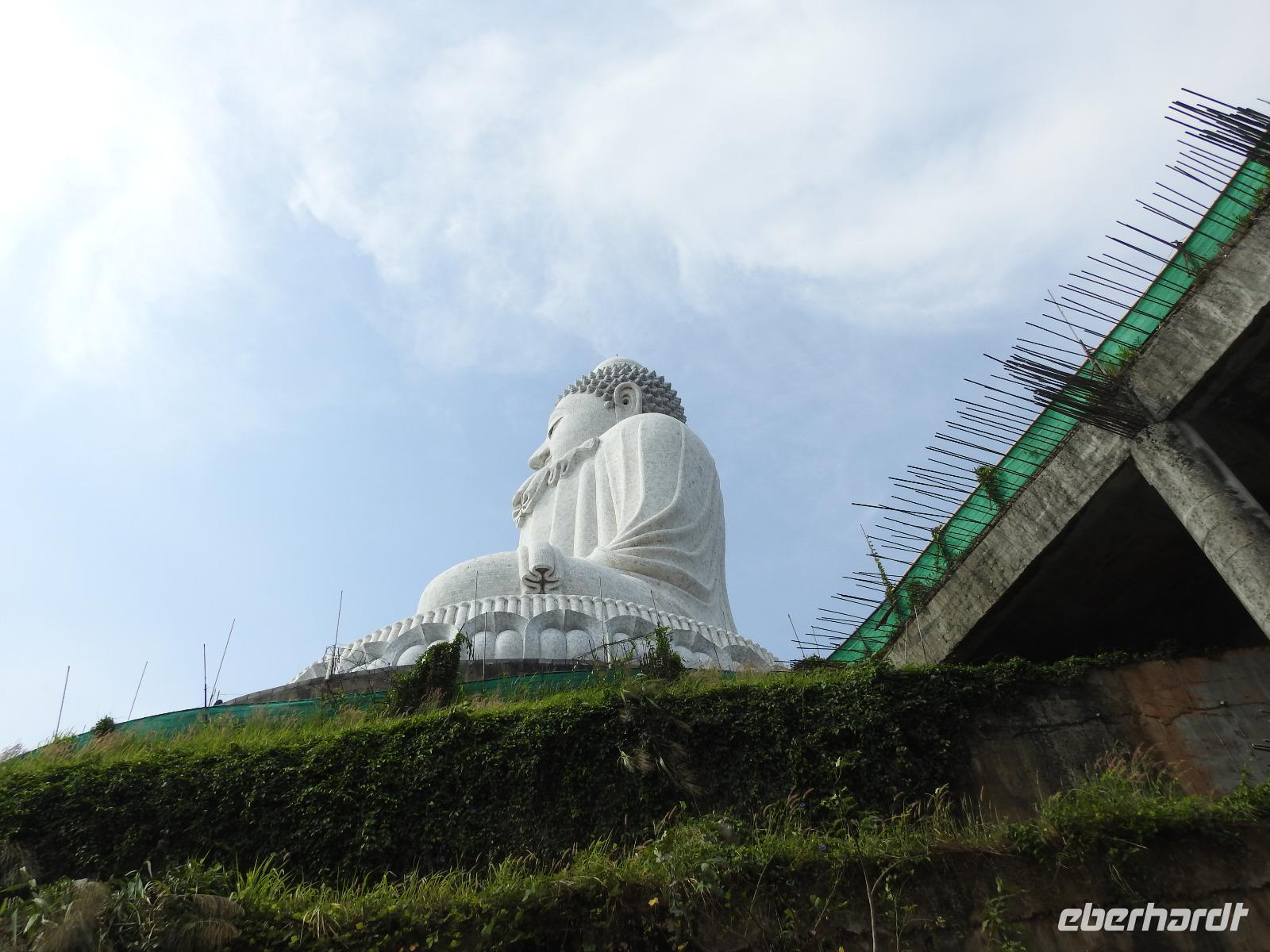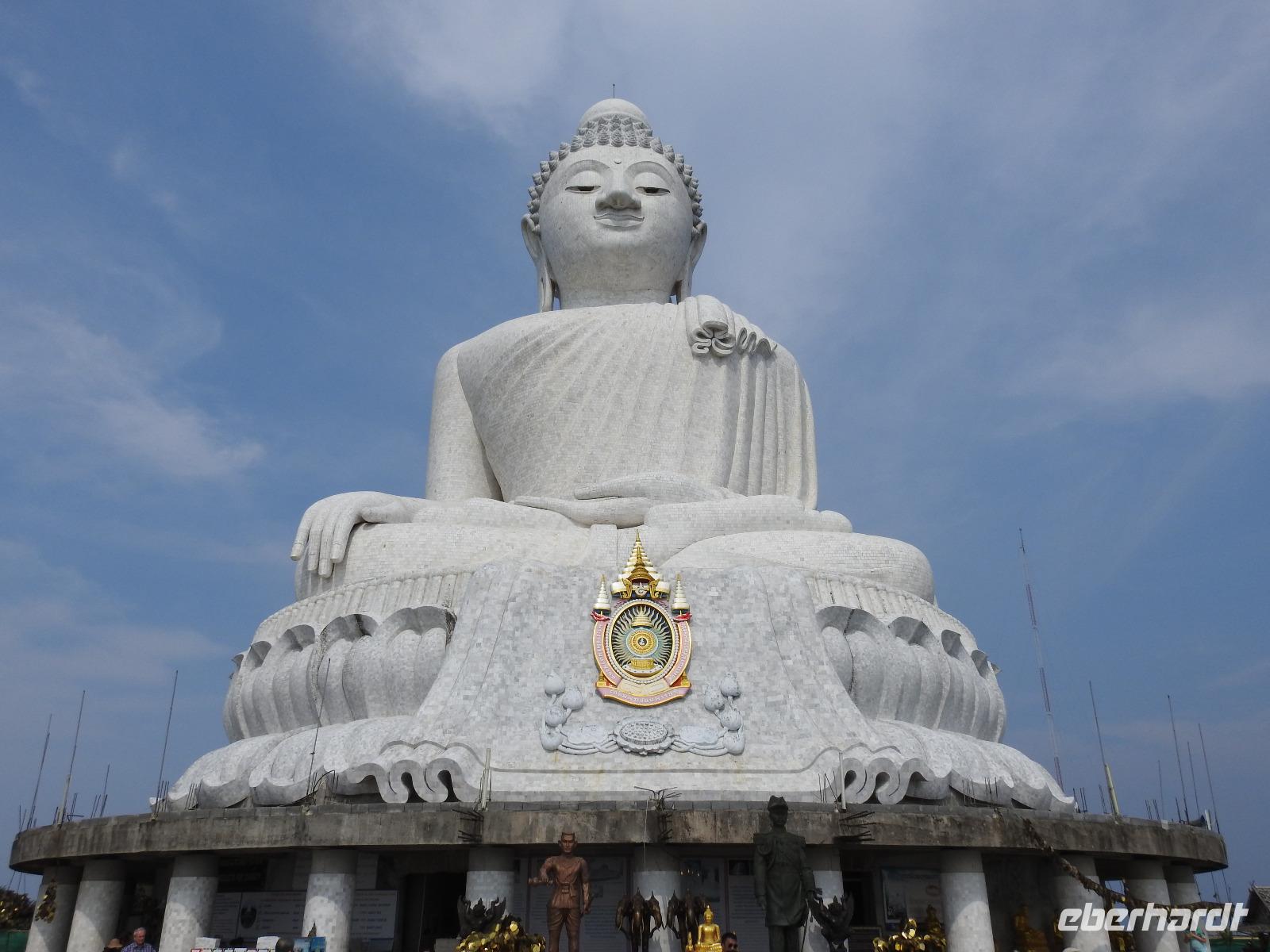 Um 5.30 Uhr wird der Anker gesetzt. Ab 7.00 Uhr gibt es Frühstück und danach geben wir unsere Kabinenschlüssel ab und bekommen im Gegenzug unsere Reisepässe zurück. Gegn acht nehmen wir den Tender und fahren an Land. Über eine Ponton-Brücke erreichen wir das Ufer. Hier spricht uns eine kleine Thailänderin an, die sich später als unsere örtliche Reiseleiterin Noi entpuppt. Noi begleitet uns bis zum Hotel Seaview, wo bereits unsere Koffer stehen. Diese müssen wir identifizieren und in ein bereit stehendes Auto verladen. Sie werden ohne uns zum Hotel Kamal Beach gebracht. Für uns geht es mit der lustigen Noi zur Inselrundfahrt auf Phuket. Wir fahren zu einem Aussichtspunkt, von dem wir tatsächlich einen schönen Blick auf drei Buchten haben. Anschließend besuchen wir den großen Buddha, der seit 2003 errichtet wird. Die Anlage ist gigantisch und wer will, kann eine kleine Marmorplatte kaufen und diese, mit seinem Namen versehen, mit einbauen lassen. Unterhaltsam ist die Fahrt mit Noi. Sie hat sich im Selbststudium die deutsche Sprache beigebracht und ihre Artikulation ist so speziell, dass sie uns dauert zum Lachen bringt. Trotzdem schafft sie es, uns in kürzester Zeit mit dem Leben in Thailand vertraut zu machen. Danke liebe Noi.