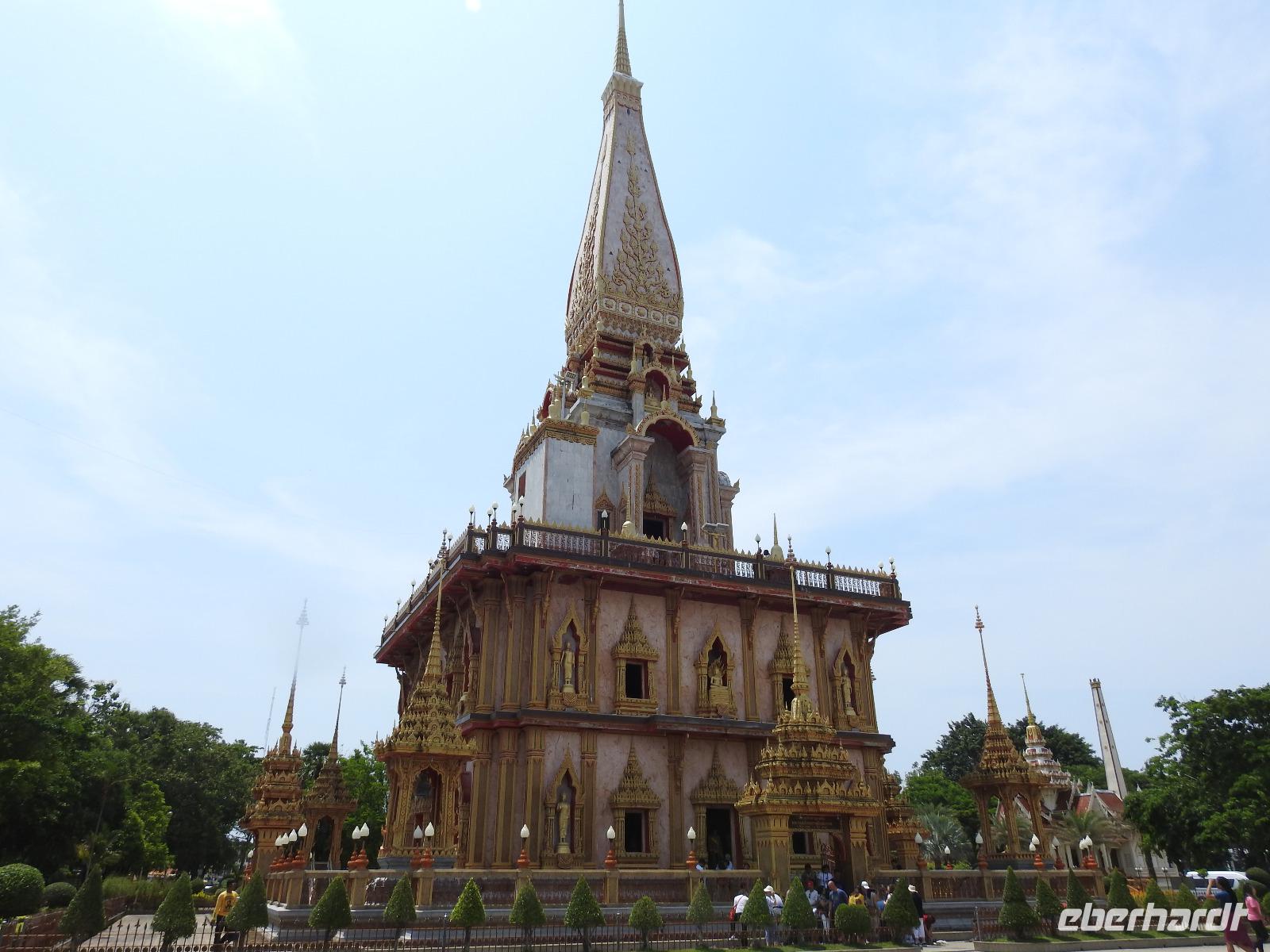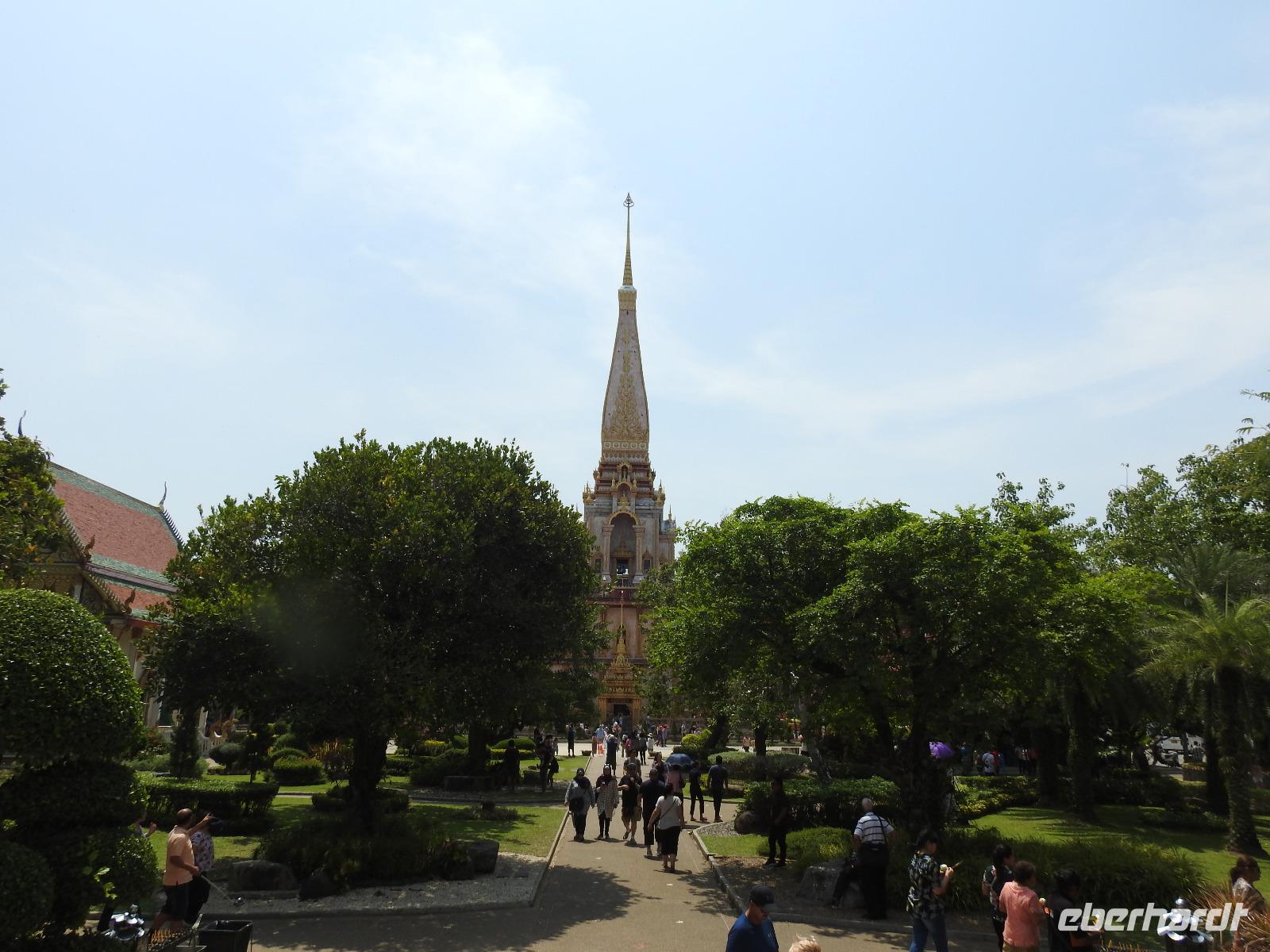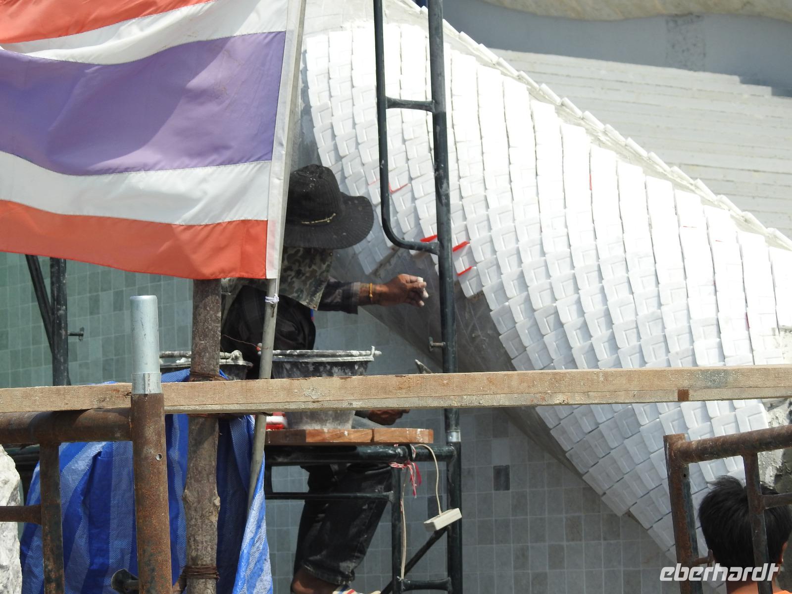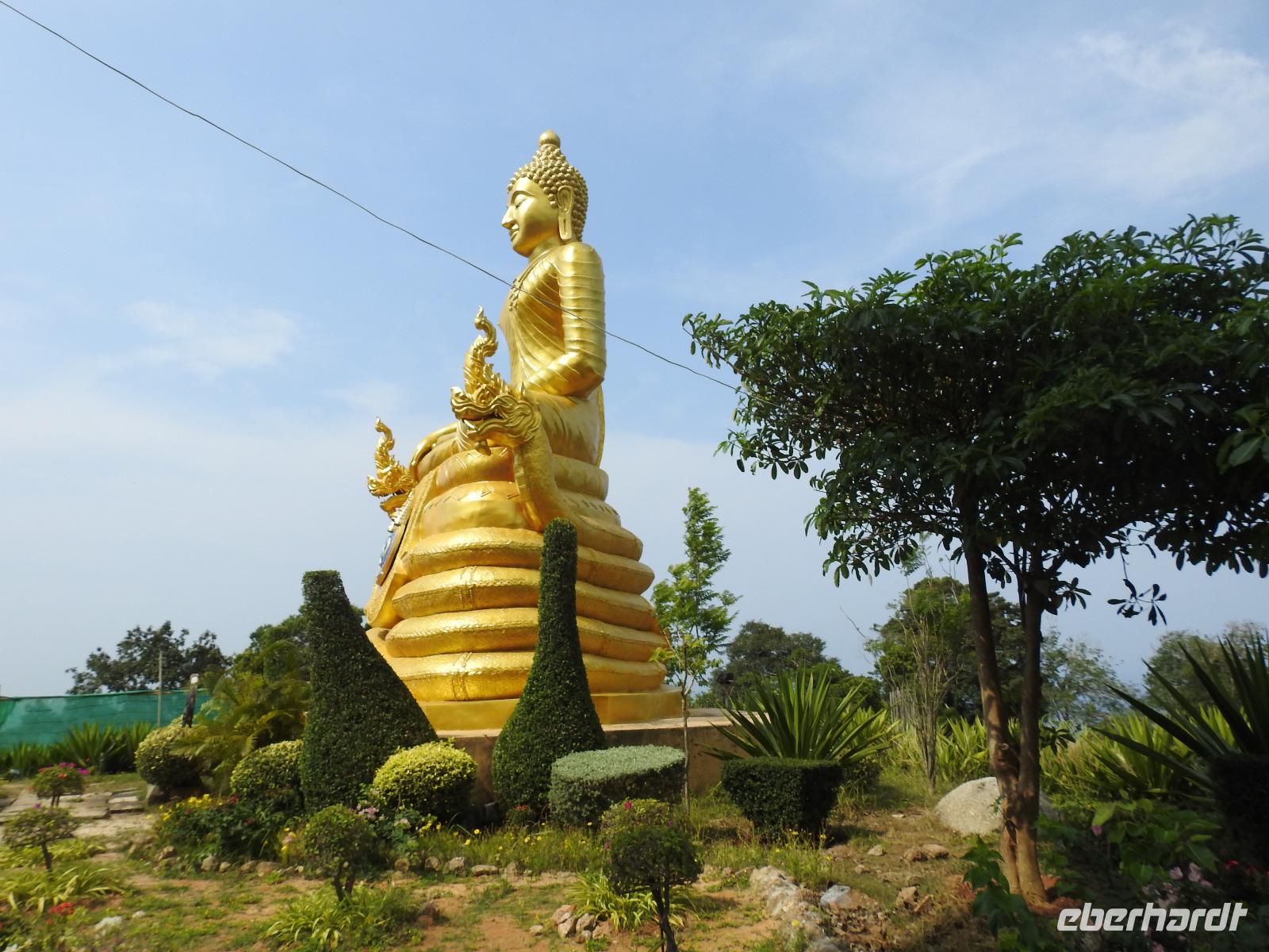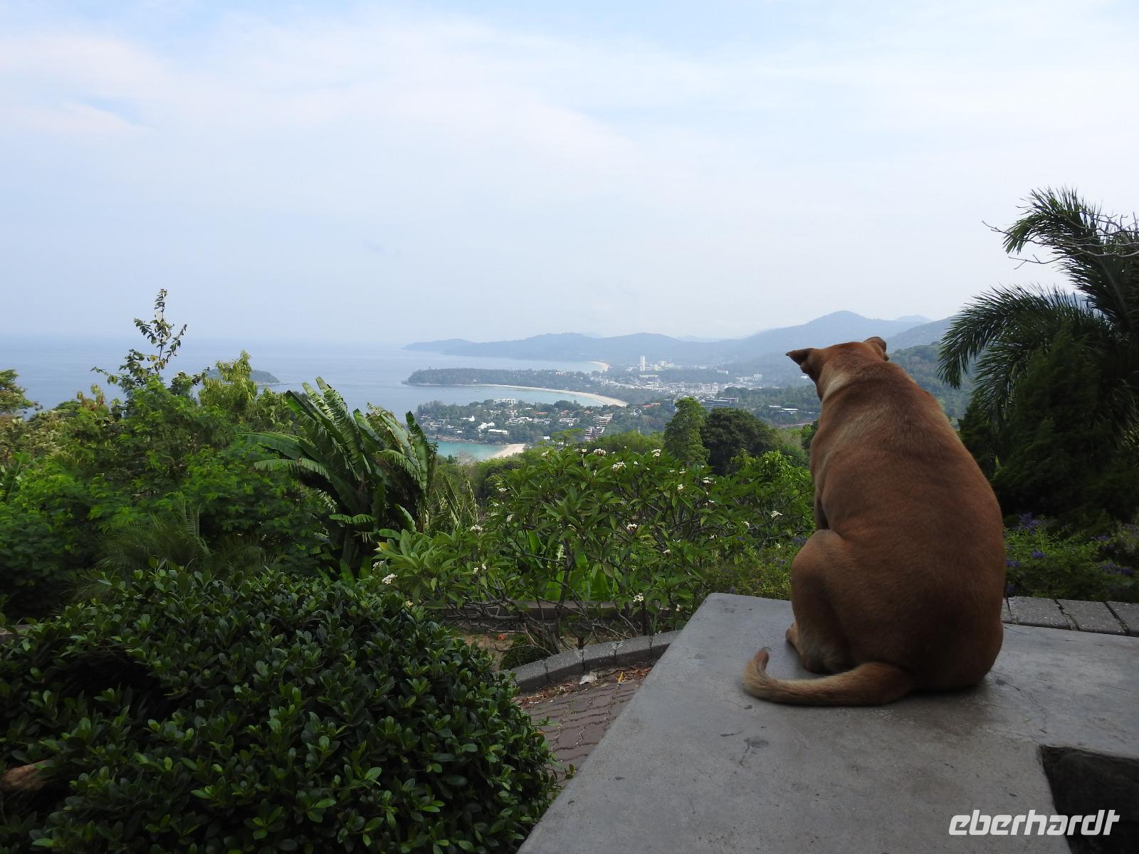 Um 5.30 Uhr wird der Anker gesetzt. Ab 7.00 Uhr gibt es Frühstück und danach geben wir unsere Kabinenschlüssel ab und bekommen im Gegenzug unsere Reisepässe zurück. Gegn acht nehmen wir den Tender und fahren an Land. Über eine Ponton-Brücke erreichen wir das Ufer. Hier spricht uns eine kleine Thailänderin an, die sich später als unsere örtliche Reiseleiterin Noi entpuppt. Noi begleitet uns bis zum Hotel Seaview, wo bereits unsere Koffer stehen. Diese müssen wir identifizieren und in ein bereit stehendes Auto verladen. Sie werden ohne uns zum Hotel Kamal Beach gebracht. Für uns geht es mit der lustigen Noi zur Inselrundfahrt auf Phuket. Wir fahren zu einem Aussichtspunkt, von dem wir tatsächlich einen schönen Blick auf drei Buchten haben. Anschließend besuchen wir den großen Buddha, der seit 2003 errichtet wird. Die Anlage ist gigantisch und wer will, kann eine kleine Marmorplatte kaufen und diese, mit seinem Namen versehen, mit einbauen lassen. Unterhaltsam ist die Fahrt mit Noi. Sie hat sich im Selbststudium die deutsche Sprache beigebracht und ihre Artikulation ist so speziell, dass sie uns dauert zum Lachen bringt. Trotzdem schafft sie es, uns in kürzester Zeit mit dem Leben in Thailand vertraut zu machen. Danke liebe Noi.