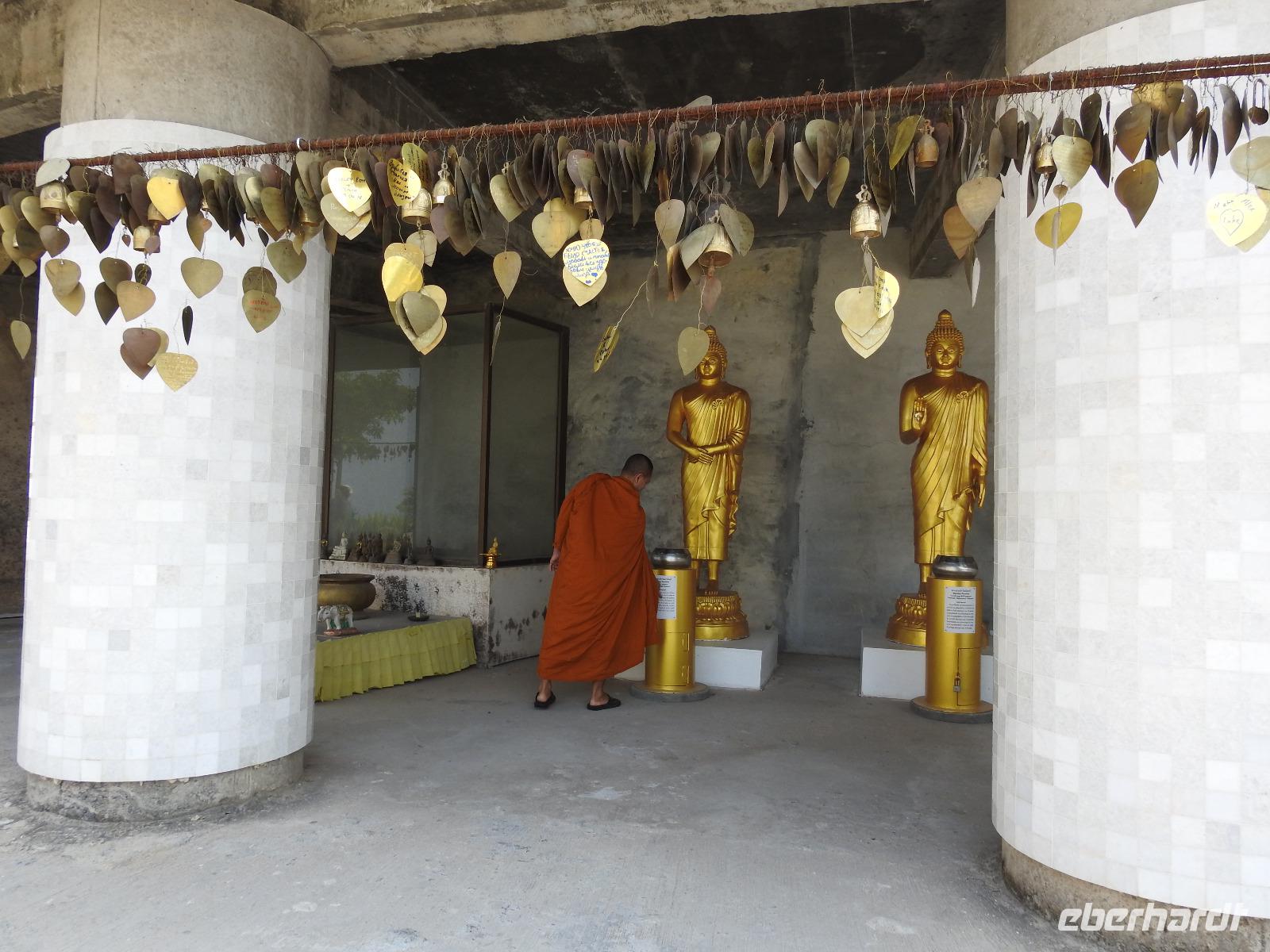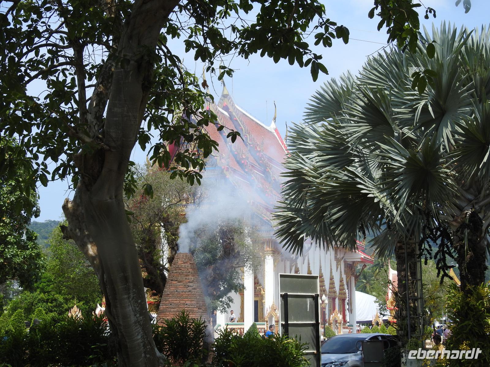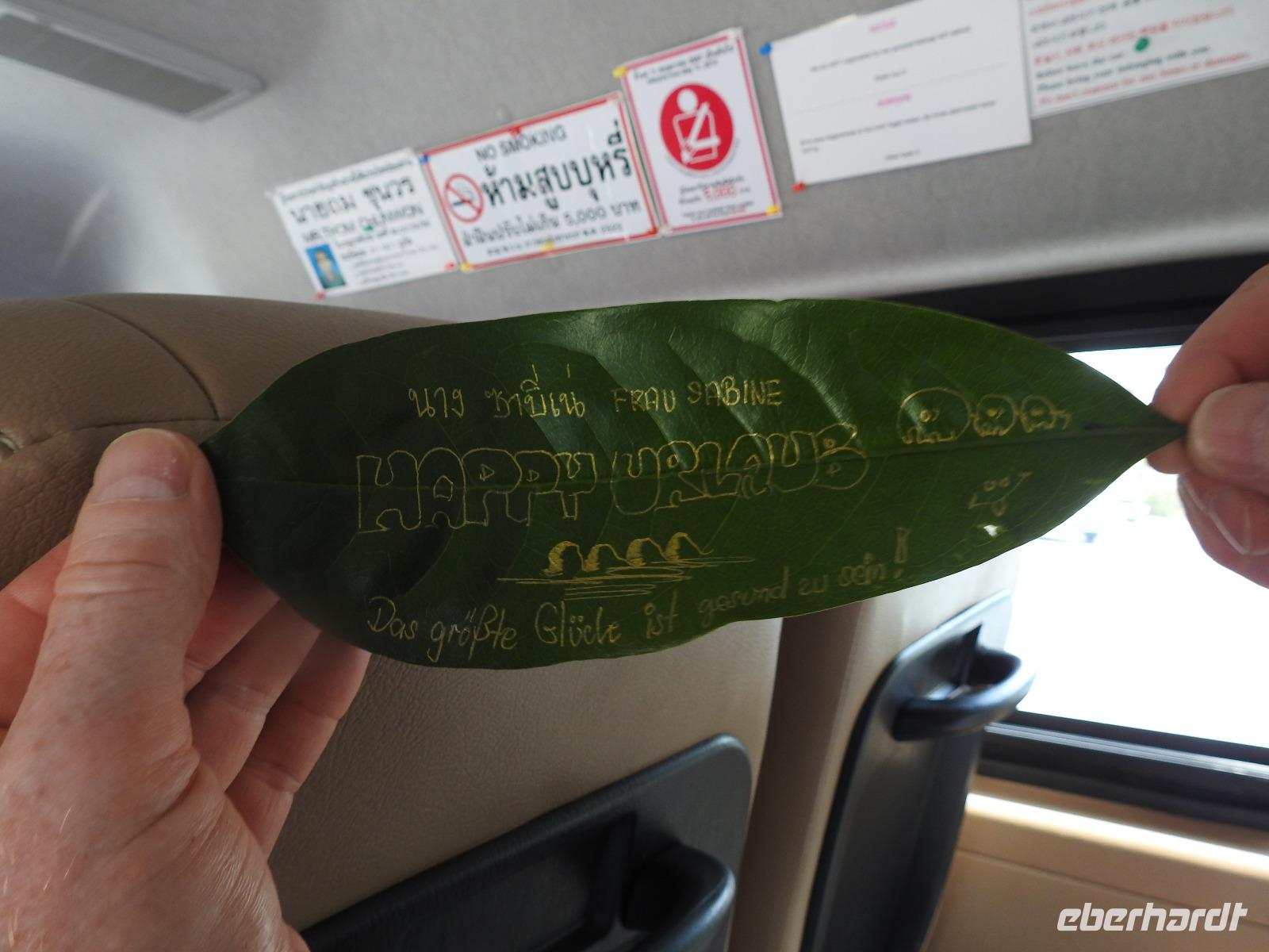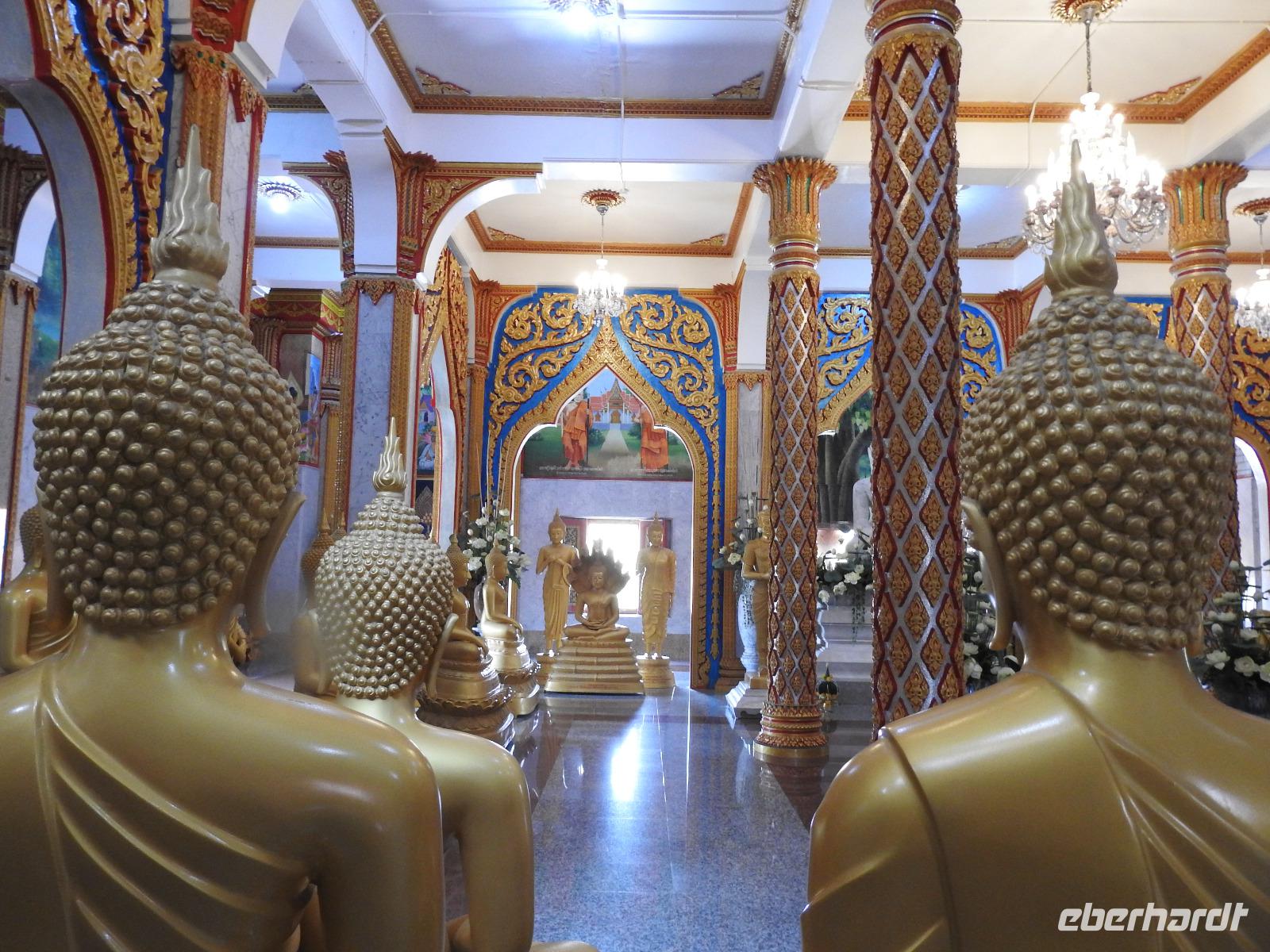 Um 5.30 Uhr wird der Anker gesetzt. Ab 7.00 Uhr gibt es Frühstück und danach geben wir unsere Kabinenschlüssel ab und bekommen im Gegenzug unsere Reisepässe zurück. Gegn acht nehmen wir den Tender und fahren an Land. Über eine Ponton-Brücke erreichen wir das Ufer. Hier spricht uns eine kleine Thailänderin an, die sich später als unsere örtliche Reiseleiterin Noi entpuppt. Noi begleitet uns bis zum Hotel Seaview, wo bereits unsere Koffer stehen. Diese müssen wir identifizieren und in ein bereit stehendes Auto verladen. Sie werden ohne uns zum Hotel Kamal Beach gebracht. Für uns geht es mit der lustigen Noi zur Inselrundfahrt auf Phuket. Wir fahren zu einem Aussichtspunkt, von dem wir tatsächlich einen schönen Blick auf drei Buchten haben. Anschließend besuchen wir den großen Buddha, der seit 2003 errichtet wird. Die Anlage ist gigantisch und wer will, kann eine kleine Marmorplatte kaufen und diese, mit seinem Namen versehen, mit einbauen lassen. Unterhaltsam ist die Fahrt mit Noi. Sie hat sich im Selbststudium die deutsche Sprache beigebracht und ihre Artikulation ist so speziell, dass sie uns dauert zum Lachen bringt. Trotzdem schafft sie es, uns in kürzester Zeit mit dem Leben in Thailand vertraut zu machen. Danke liebe Noi.