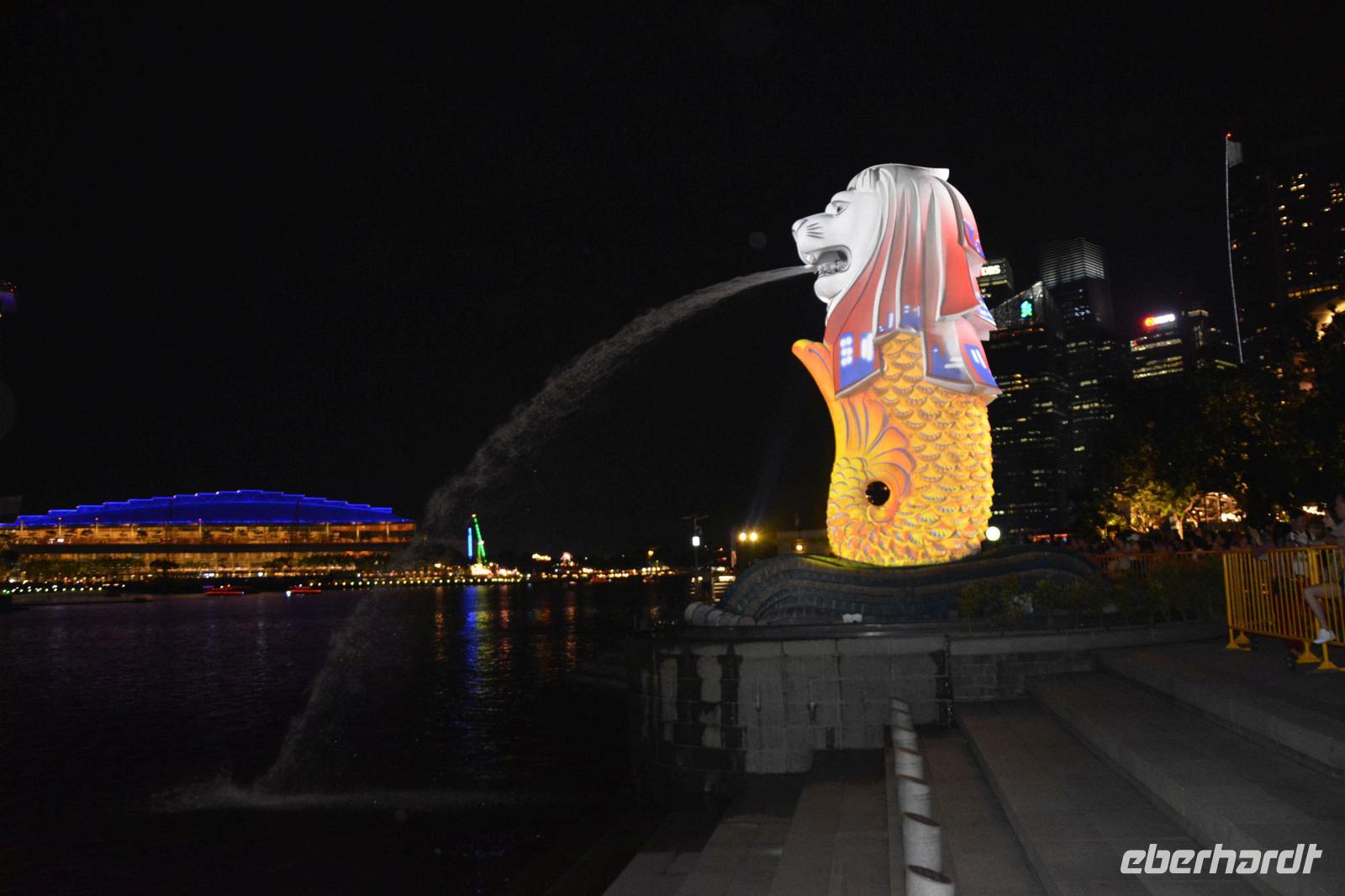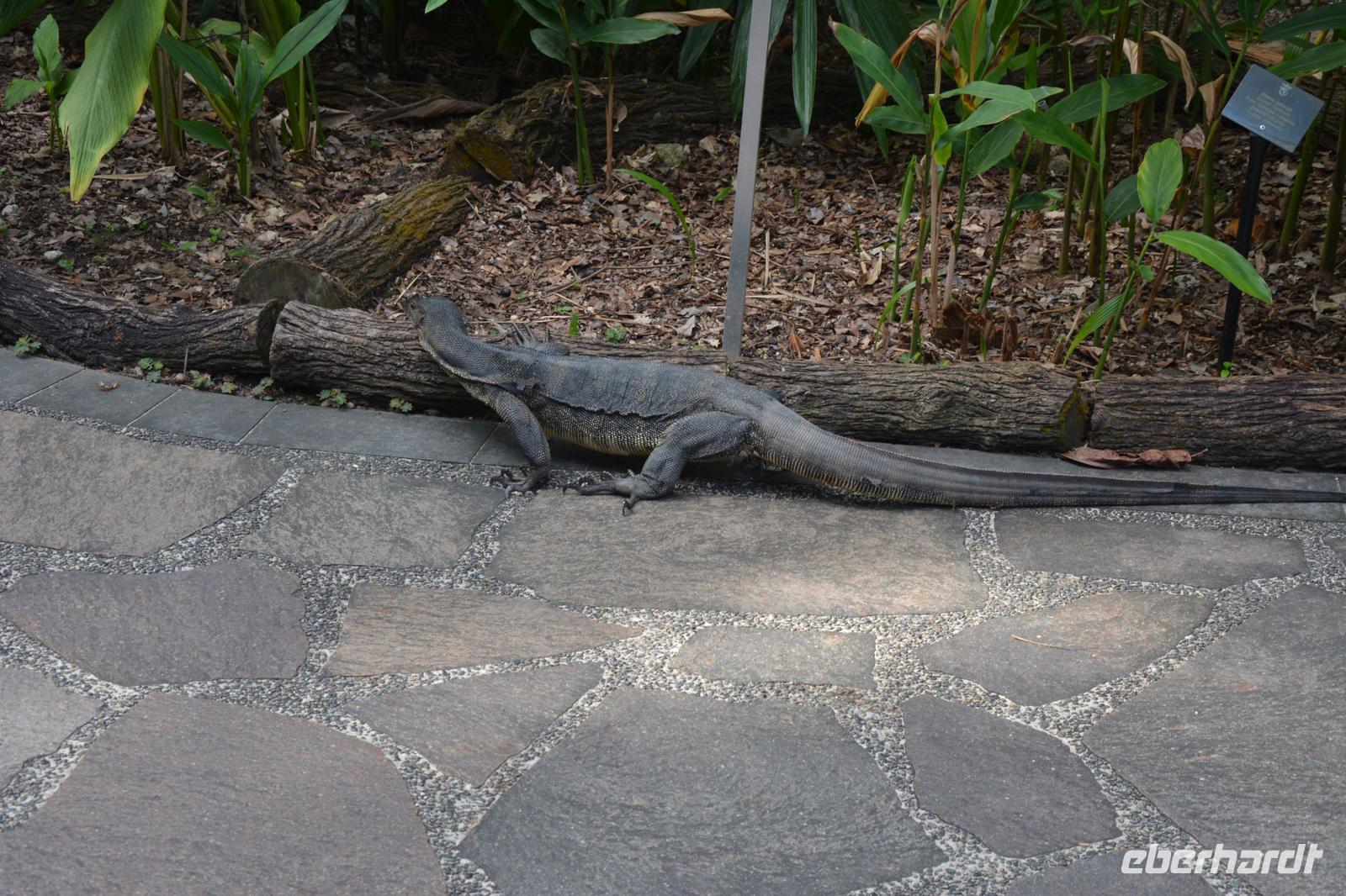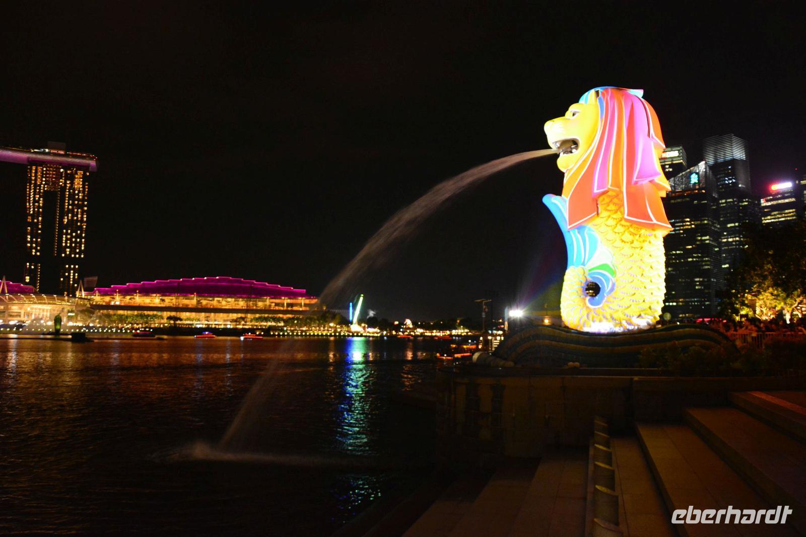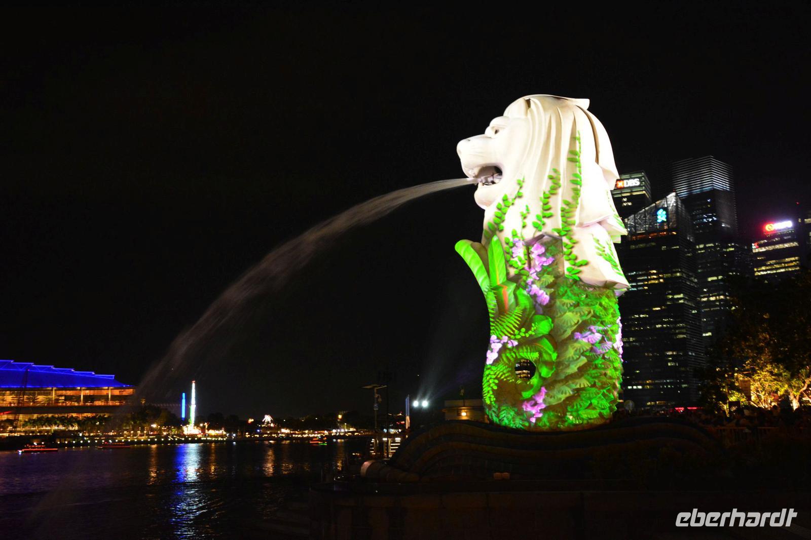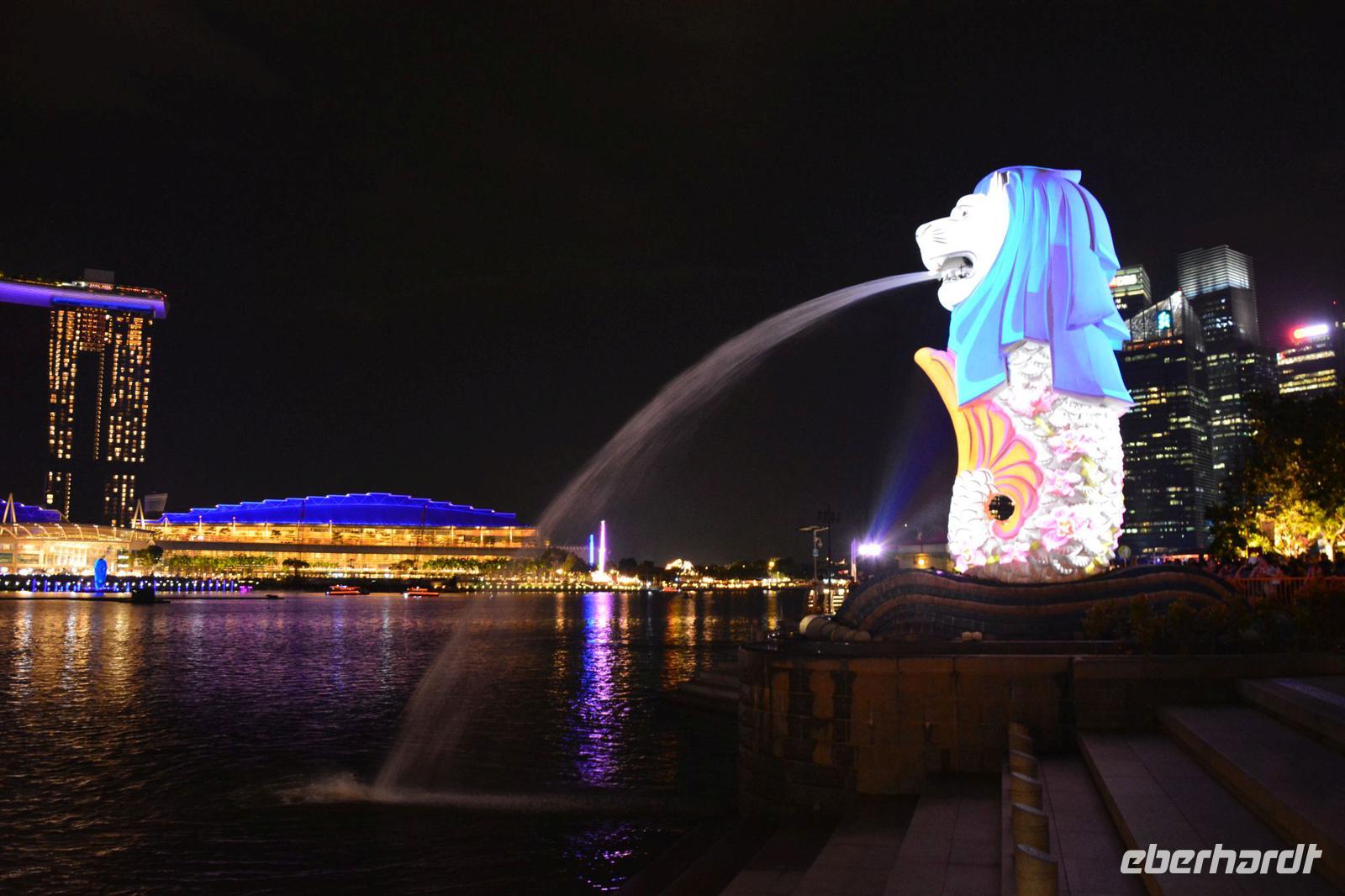 Nach dem Frühstück machten wir uns heute auf Singapur zu erkunden. Von Tan lernten wir über die recht kleine Größe des Stadtstaates. Doch in den Tagen sollten wir sehen, was Singapur so alles zu bieten hat! Unser erstes Ziel des Tages war der Botanische Garten. Im Orchideengarten spazierten wir auf den gepflegten Wegen der wunderschönen Anlage und konnten allerhand Pflanzen und Orchideen in verschiedenen Farben und Formen bewundern. Wir waren sogar im richtigen Moment da, sodass wir einen recht großen Leguan sagen, wie er gemächlich aus dem Gebüsch über den Weg lief und kurze Zeit später auch in so einem wieder verschwand. Nach dem ersten Teil des Botanischen Gartens lernten wir die Stadt kennen. Als erstes führte uns die Fahrt in den Stadtteil Little India. Auf einer der ältesten Straßen, der Serangoon Road steigen wir aus. Dann spazierten wir durch das indische Viertel, vorbei an Händlern, die Gemüse und Obst anboten. Hier lernten wir von uns nich fremden Arten und die verschiedenen Gerüche der angebotenen Waren, Gewürze und Blumengewinden stiegen uns in die Nase. Mit dem Bus ging es anschließend weiter vorbei am bekannten Raffles Hotel, welches aber momentan renoviert wird. Hier wurde in der trotzdem geöffneten Long Bar des Hotels der bekannte Cocktail Singapur Sling erfunden. In der Nähe des Raffles Hotel liegt Singapurs bekannte Orchard Road. Hier lernen wir, dass aufgrund des Platzproblems In Singpaur, viele Geschäfte und ganze Einkaufszentren unterirdisch liegen. Um die Mittagszeit stiegen wir wieder aus dem Bus aus und spazierten zu Singapurs bekanntester Stadtansicht, der Marina Bay. Die Bucht mit dem bekannten Luxushotel Marina Bay Sands, der Statue des Merlion und dem eindrucksvollen Blick auf die Wolkenkratzer des Banken- und Geschäftsviertels sollte uns in den nächsten Tagen zu verschiedenen Tageszeiten und Aussichtspunkten immer wieder beeindrucken. Zum Abschluss stand dann noch Chinatown auf dem Programm. Hier besuchten wir den chinesischer Tempel Thian Hock Keng, erkundeten einen kleinen Teil des Viertels beim Spaziergang zum hinduistischen Tempel Sri Mariamman und weiter zum buddhistischen Tempel.Nach etwas Zeit für individuelle Freizeitgestaltung trafen wir uns abends in unserem Hotel und spazierten entlang des Singapur Flusses zur Marina Bay. Im Dunkeln erstrahlt die Stadt und wir sahen uns eine Lichtershow an, die besonders den Merlion in allerhand Farben und Lichtmustern beleuchten ließ.