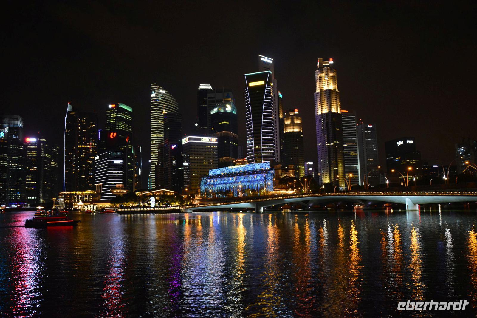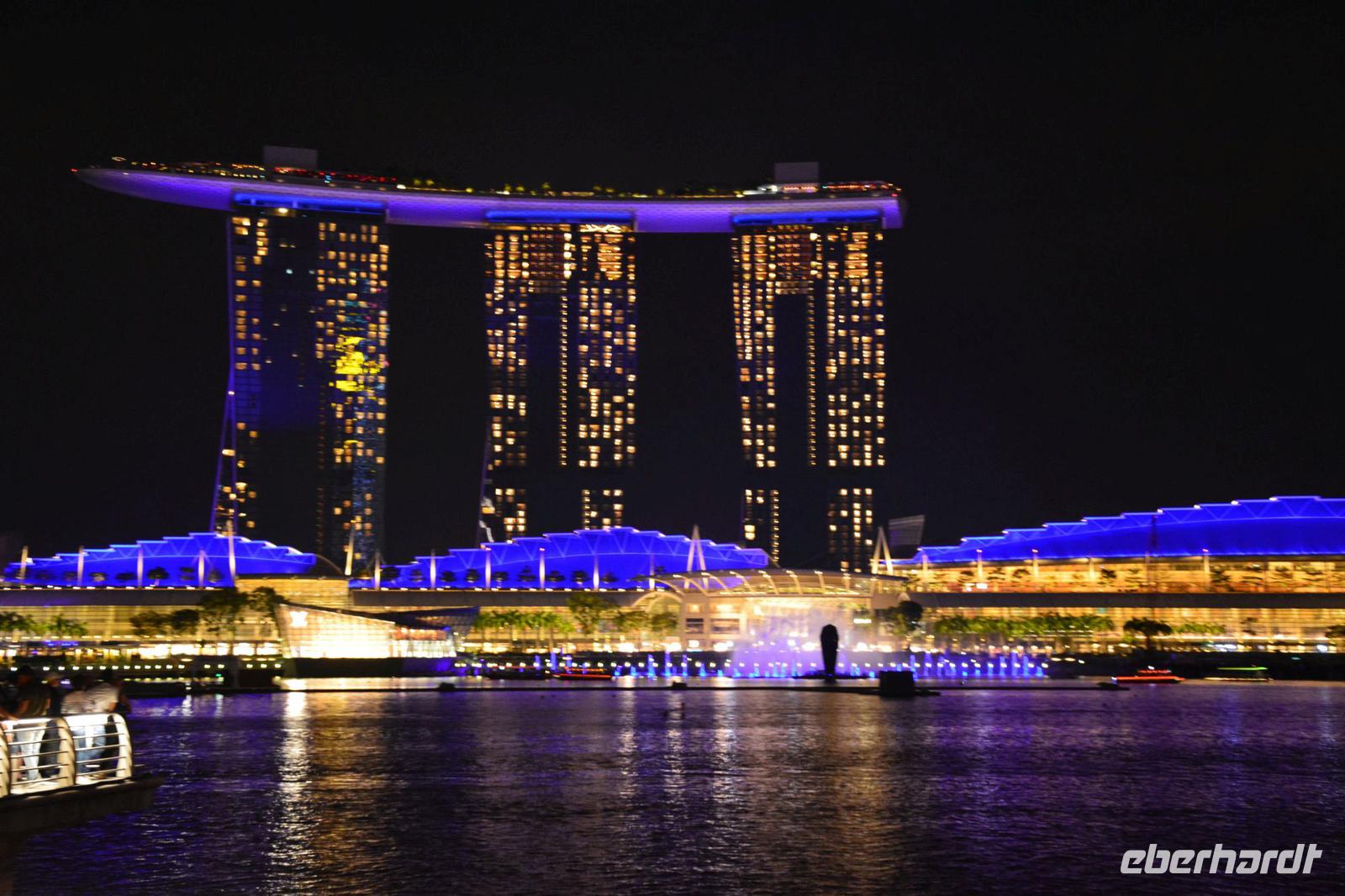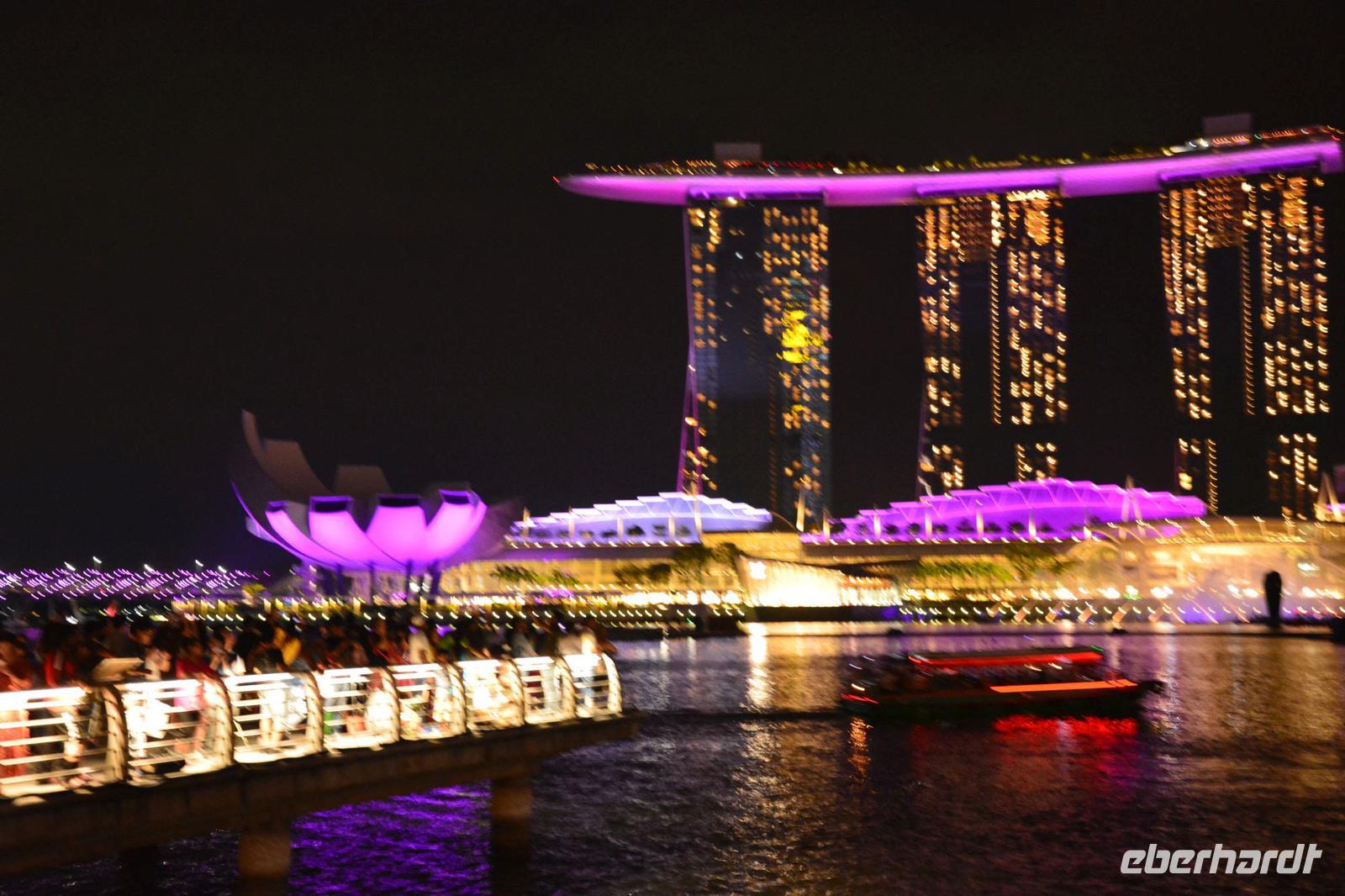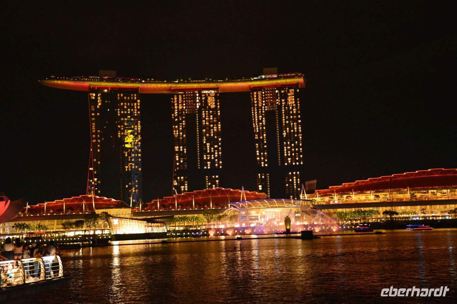 Nach dem Frühstück machten wir uns heute auf Singapur zu erkunden. Von Tan lernten wir über die recht kleine Größe des Stadtstaates. Doch in den Tagen sollten wir sehen, was Singapur so alles zu bieten hat! Unser erstes Ziel des Tages war der Botanische Garten. Im Orchideengarten spazierten wir auf den gepflegten Wegen der wunderschönen Anlage und konnten allerhand Pflanzen und Orchideen in verschiedenen Farben und Formen bewundern. Wir waren sogar im richtigen Moment da, sodass wir einen recht großen Leguan sagen, wie er gemächlich aus dem Gebüsch über den Weg lief und kurze Zeit später auch in so einem wieder verschwand. Nach dem ersten Teil des Botanischen Gartens lernten wir die Stadt kennen. Als erstes führte uns die Fahrt in den Stadtteil Little India. Auf einer der ältesten Straßen, der Serangoon Road steigen wir aus. Dann spazierten wir durch das indische Viertel, vorbei an Händlern, die Gemüse und Obst anboten. Hier lernten wir von uns nich fremden Arten und die verschiedenen Gerüche der angebotenen Waren, Gewürze und Blumengewinden stiegen uns in die Nase. Mit dem Bus ging es anschließend weiter vorbei am bekannten Raffles Hotel, welches aber momentan renoviert wird. Hier wurde in der trotzdem geöffneten Long Bar des Hotels der bekannte Cocktail Singapur Sling erfunden. In der Nähe des Raffles Hotel liegt Singapurs bekannte Orchard Road. Hier lernen wir, dass aufgrund des Platzproblems In Singpaur, viele Geschäfte und ganze Einkaufszentren unterirdisch liegen. Um die Mittagszeit stiegen wir wieder aus dem Bus aus und spazierten zu Singapurs bekanntester Stadtansicht, der Marina Bay. Die Bucht mit dem bekannten Luxushotel Marina Bay Sands, der Statue des Merlion und dem eindrucksvollen Blick auf die Wolkenkratzer des Banken- und Geschäftsviertels sollte uns in den nächsten Tagen zu verschiedenen Tageszeiten und Aussichtspunkten immer wieder beeindrucken. Zum Abschluss stand dann noch Chinatown auf dem Programm. Hier besuchten wir den chinesischer Tempel Thian Hock Keng, erkundeten einen kleinen Teil des Viertels beim Spaziergang zum hinduistischen Tempel Sri Mariamman und weiter zum buddhistischen Tempel.Nach etwas Zeit für individuelle Freizeitgestaltung trafen wir uns abends in unserem Hotel und spazierten entlang des Singapur Flusses zur Marina Bay. Im Dunkeln erstrahlt die Stadt und wir sahen uns eine Lichtershow an, die besonders den Merlion in allerhand Farben und Lichtmustern beleuchten ließ.