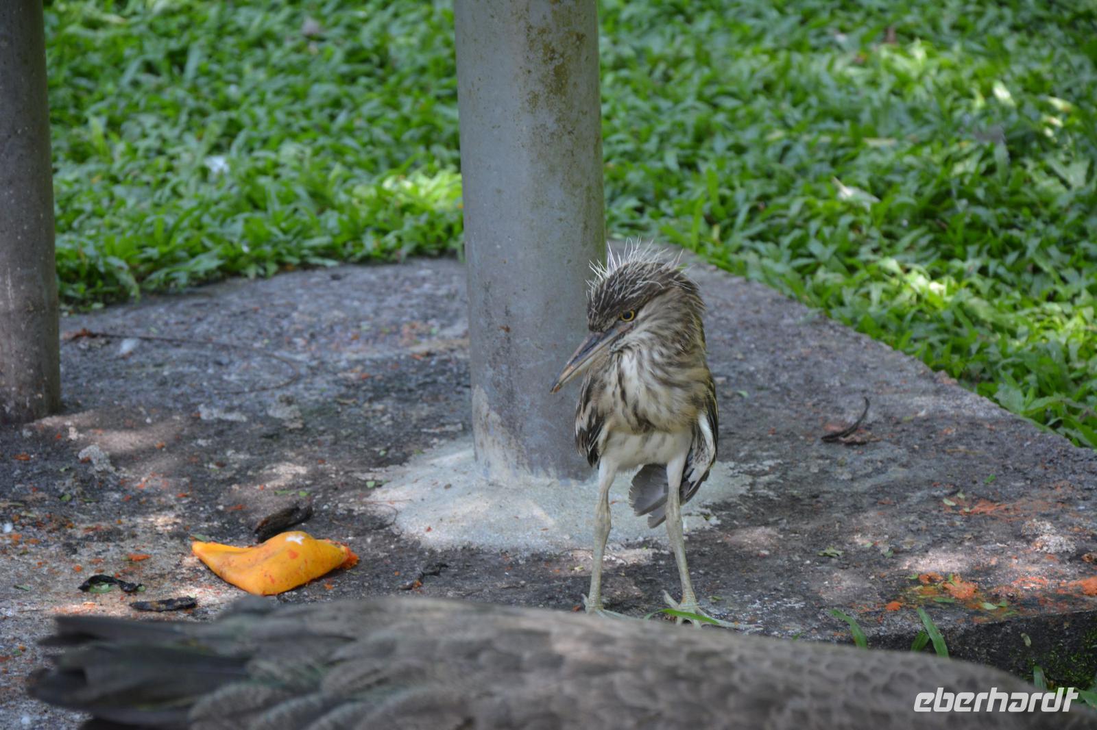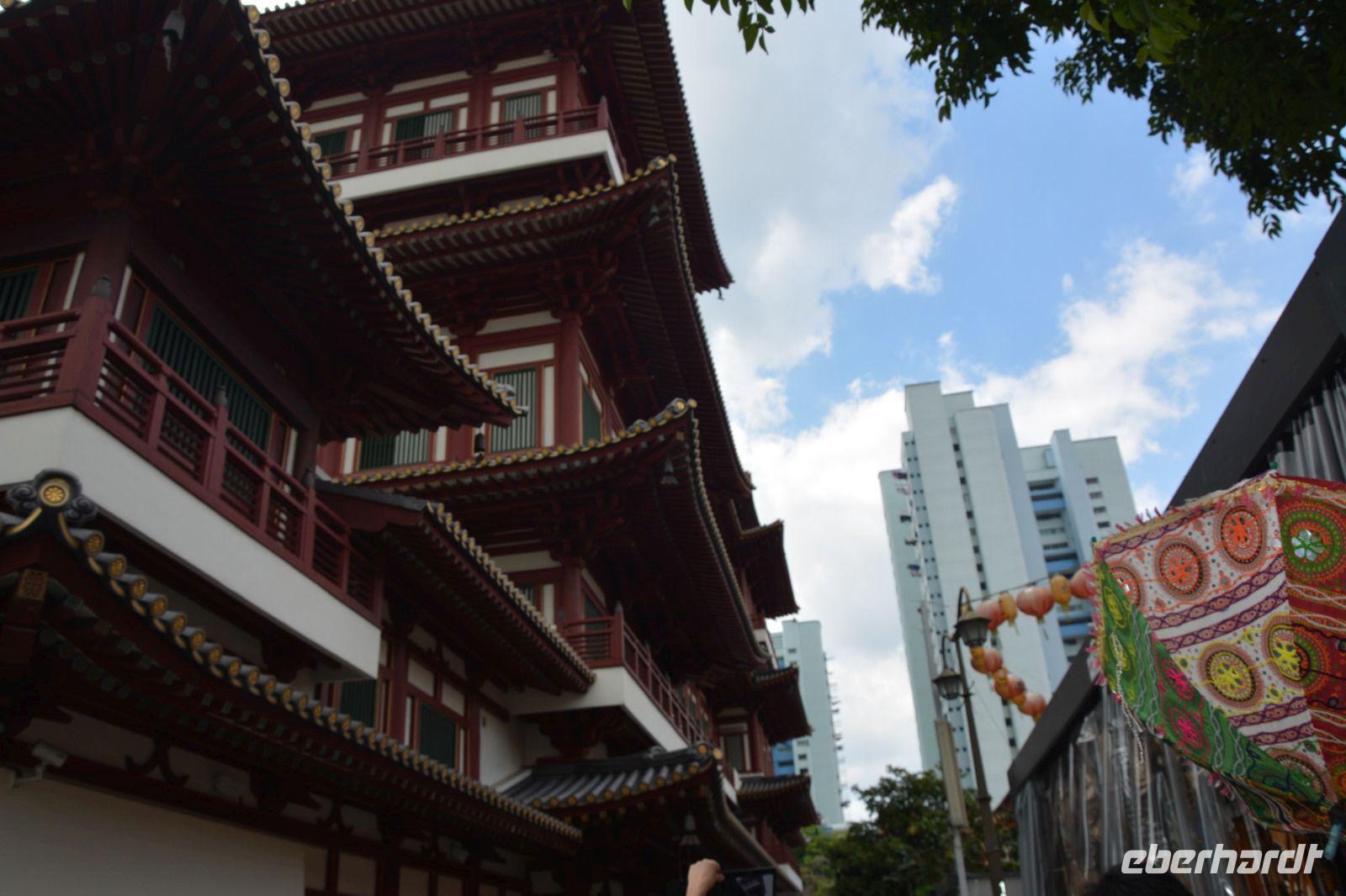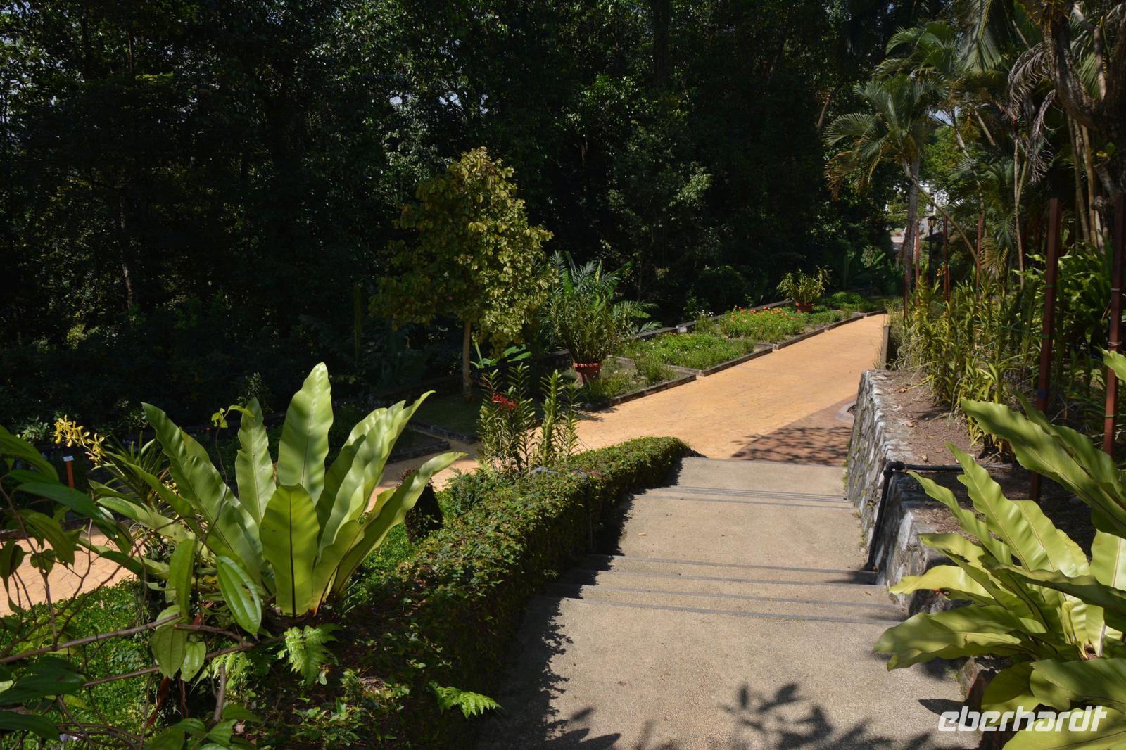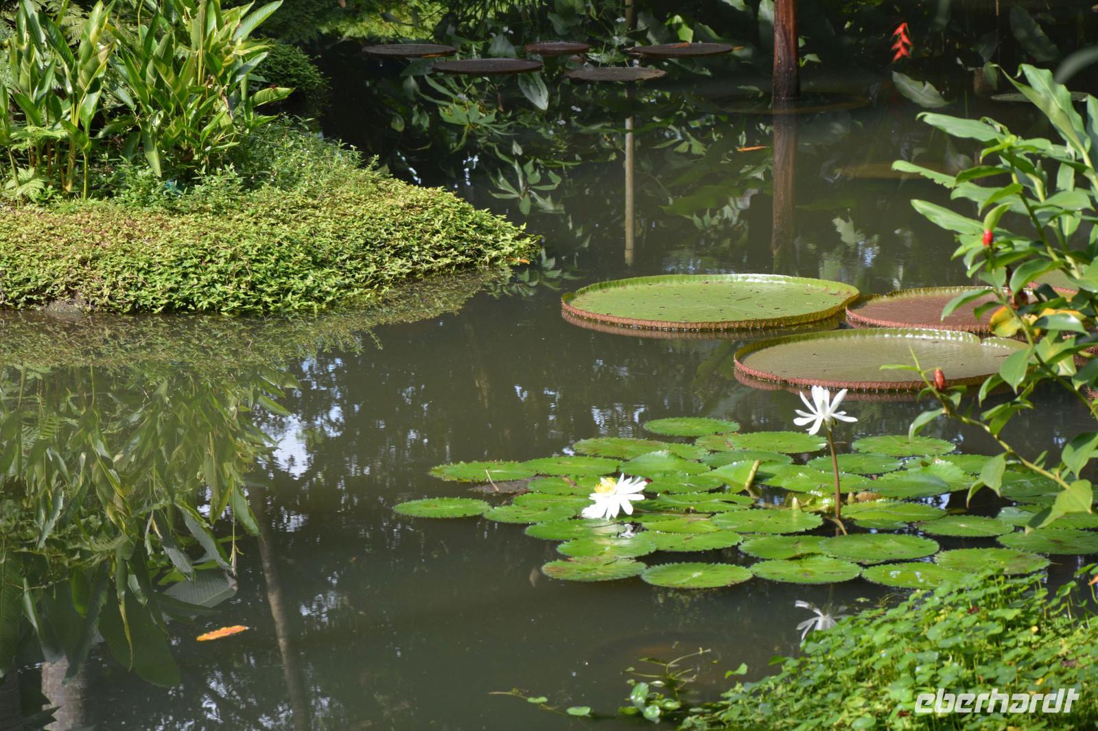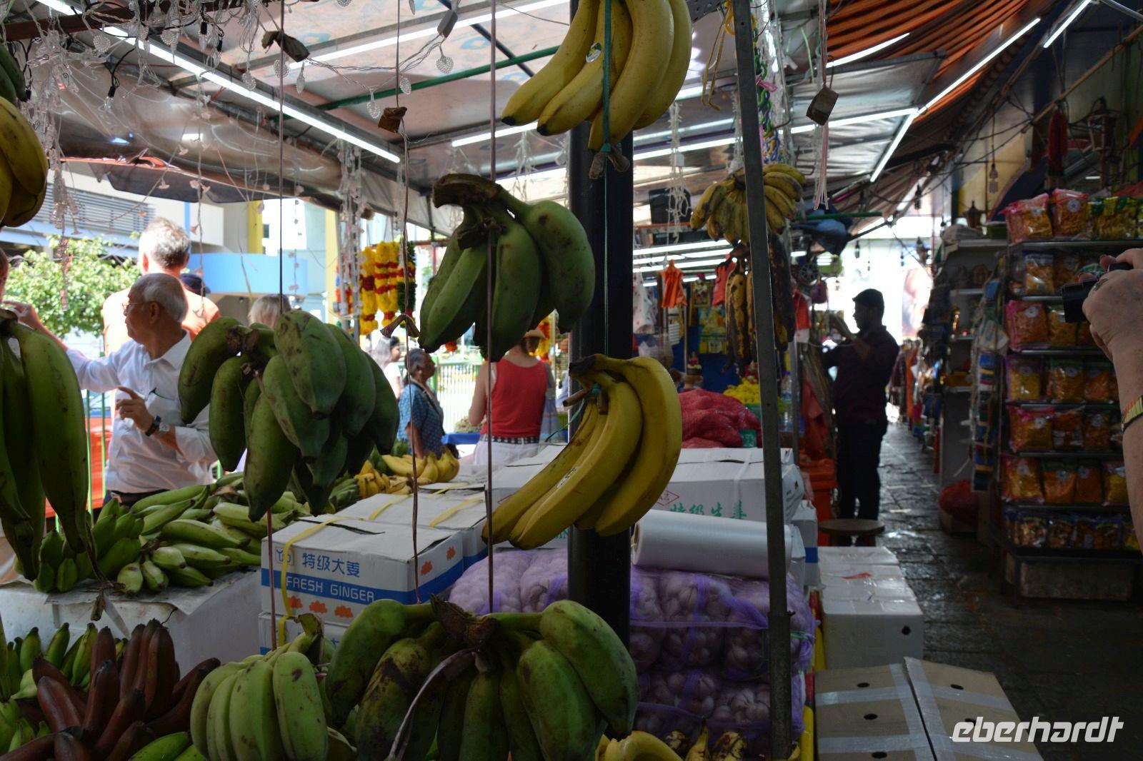 Nach dem Frühstück machten wir uns heute auf Singapur zu erkunden. Von Tan lernten wir über die recht kleine Größe des Stadtstaates. Doch in den Tagen sollten wir sehen, was Singapur so alles zu bieten hat! Unser erstes Ziel des Tages war der Botanische Garten. Im Orchideengarten spazierten wir auf den gepflegten Wegen der wunderschönen Anlage und konnten allerhand Pflanzen und Orchideen in verschiedenen Farben und Formen bewundern. Wir waren sogar im richtigen Moment da, sodass wir einen recht großen Leguan sagen, wie er gemächlich aus dem Gebüsch über den Weg lief und kurze Zeit später auch in so einem wieder verschwand. Nach dem ersten Teil des Botanischen Gartens lernten wir die Stadt kennen. Als erstes führte uns die Fahrt in den Stadtteil Little India. Auf einer der ältesten Straßen, der Serangoon Road steigen wir aus. Dann spazierten wir durch das indische Viertel, vorbei an Händlern, die Gemüse und Obst anboten. Hier lernten wir von uns nich fremden Arten und die verschiedenen Gerüche der angebotenen Waren, Gewürze und Blumengewinden stiegen uns in die Nase. Mit dem Bus ging es anschließend weiter vorbei am bekannten Raffles Hotel, welches aber momentan renoviert wird. Hier wurde in der trotzdem geöffneten Long Bar des Hotels der bekannte Cocktail Singapur Sling erfunden. In der Nähe des Raffles Hotel liegt Singapurs bekannte Orchard Road. Hier lernen wir, dass aufgrund des Platzproblems In Singpaur, viele Geschäfte und ganze Einkaufszentren unterirdisch liegen. Um die Mittagszeit stiegen wir wieder aus dem Bus aus und spazierten zu Singapurs bekanntester Stadtansicht, der Marina Bay. Die Bucht mit dem bekannten Luxushotel Marina Bay Sands, der Statue des Merlion und dem eindrucksvollen Blick auf die Wolkenkratzer des Banken- und Geschäftsviertels sollte uns in den nächsten Tagen zu verschiedenen Tageszeiten und Aussichtspunkten immer wieder beeindrucken. Zum Abschluss stand dann noch Chinatown auf dem Programm. Hier besuchten wir den chinesischer Tempel Thian Hock Keng, erkundeten einen kleinen Teil des Viertels beim Spaziergang zum hinduistischen Tempel Sri Mariamman und weiter zum buddhistischen Tempel.Nach etwas Zeit für individuelle Freizeitgestaltung trafen wir uns abends in unserem Hotel und spazierten entlang des Singapur Flusses zur Marina Bay. Im Dunkeln erstrahlt die Stadt und wir sahen uns eine Lichtershow an, die besonders den Merlion in allerhand Farben und Lichtmustern beleuchten ließ.