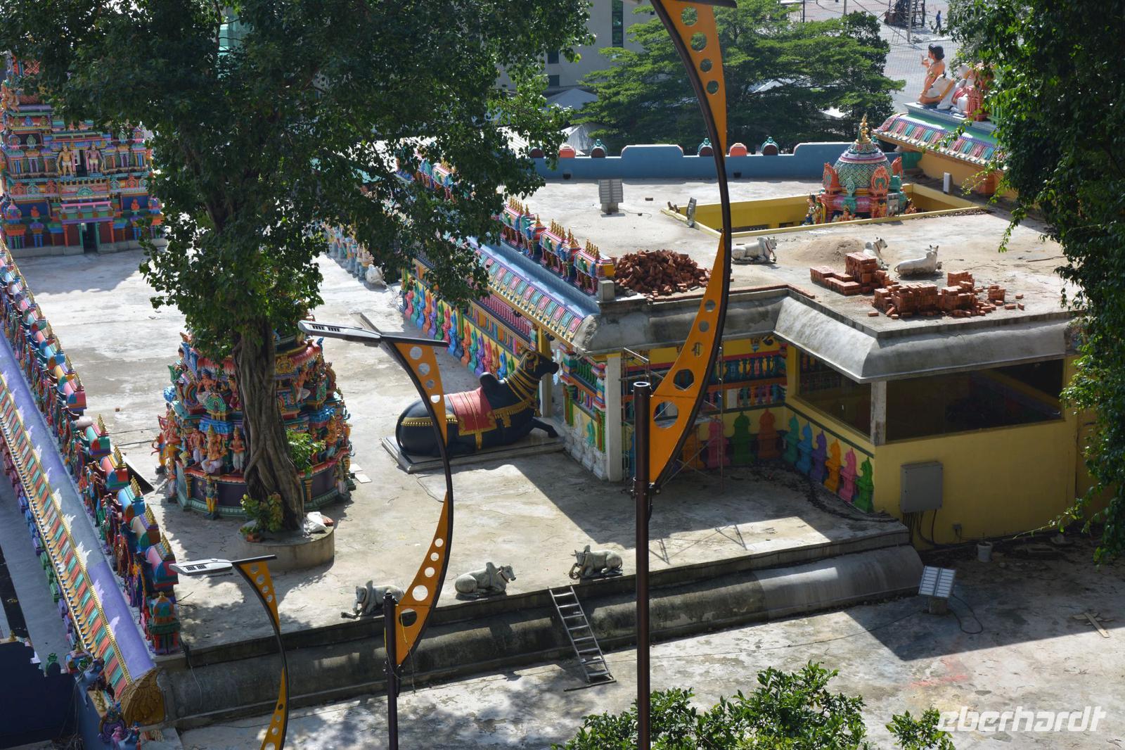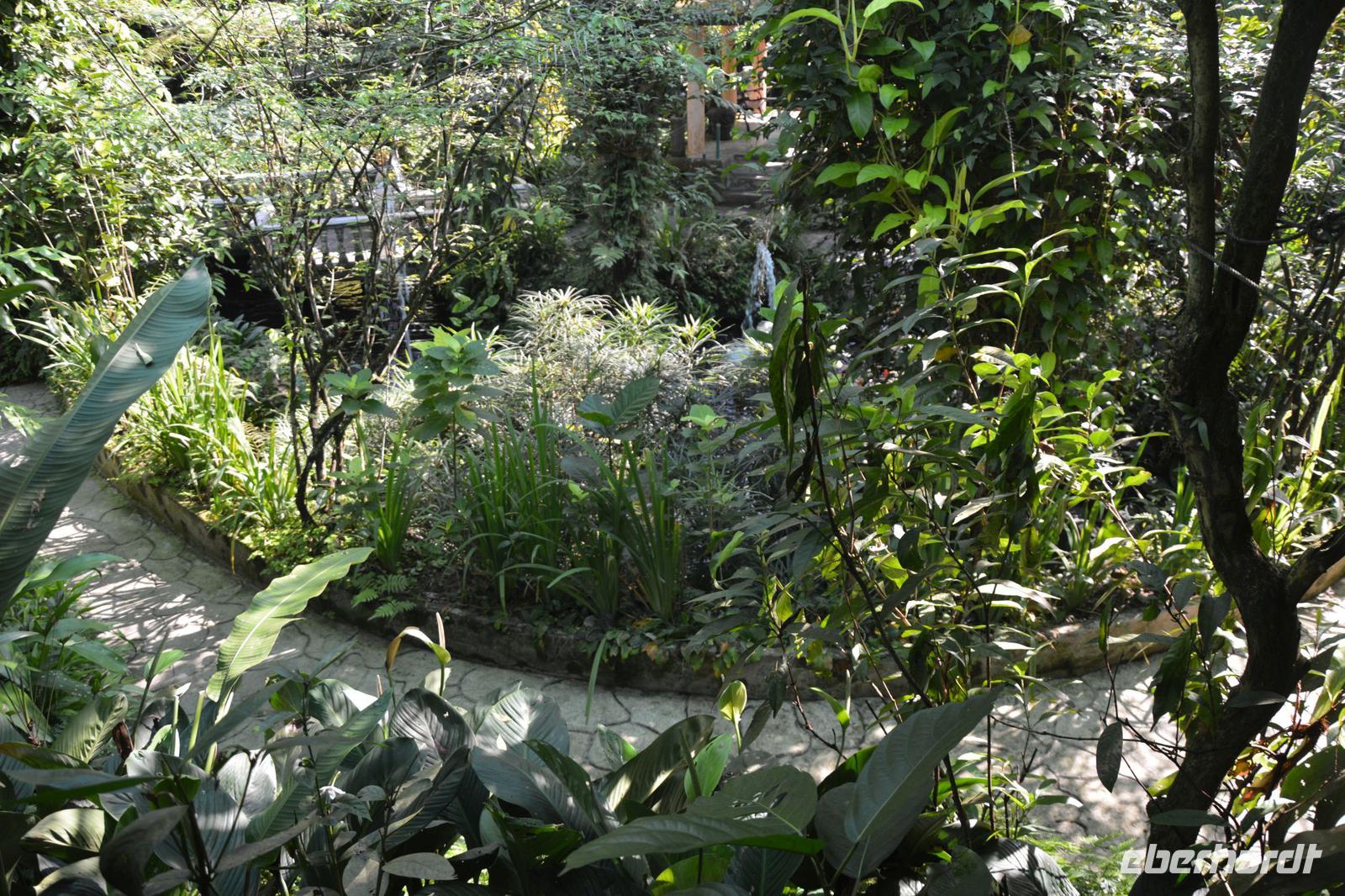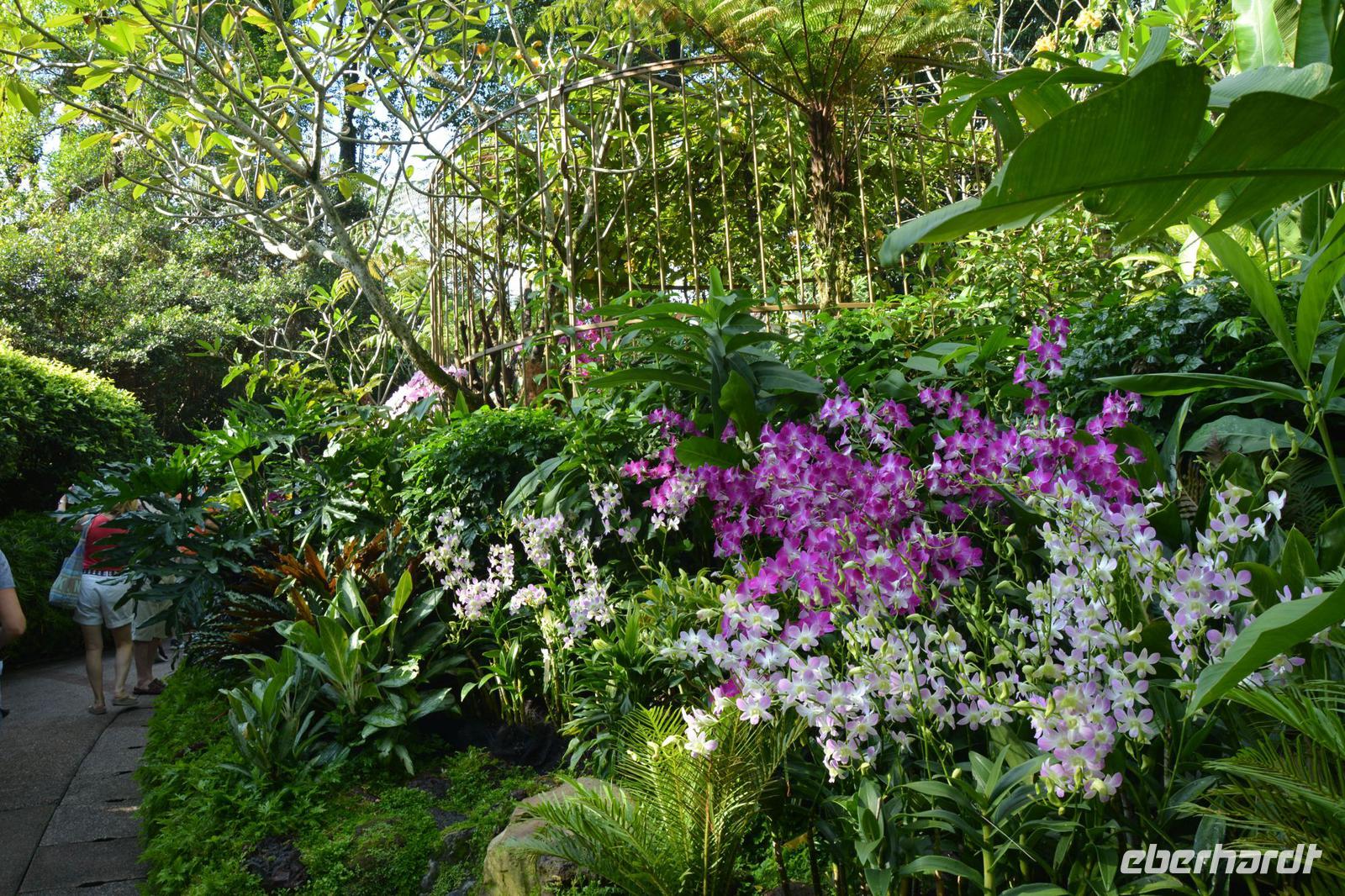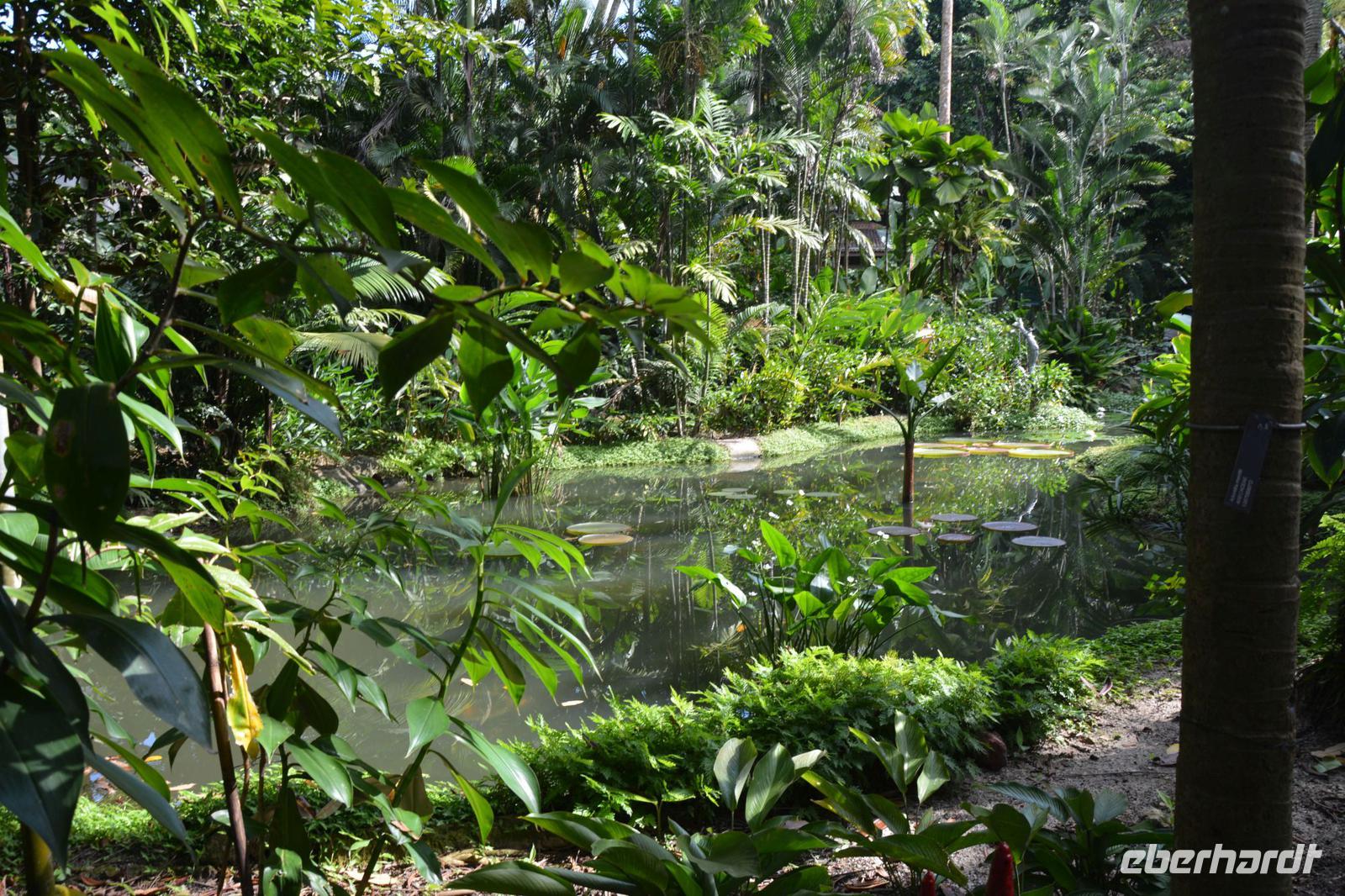 Nach dem Frühstück machten wir uns heute auf Singapur zu erkunden. Von Tan lernten wir über die recht kleine Größe des Stadtstaates. Doch in den Tagen sollten wir sehen, was Singapur so alles zu bieten hat! Unser erstes Ziel des Tages war der Botanische Garten. Im Orchideengarten spazierten wir auf den gepflegten Wegen der wunderschönen Anlage und konnten allerhand Pflanzen und Orchideen in verschiedenen Farben und Formen bewundern. Wir waren sogar im richtigen Moment da, sodass wir einen recht großen Leguan sagen, wie er gemächlich aus dem Gebüsch über den Weg lief und kurze Zeit später auch in so einem wieder verschwand. Nach dem ersten Teil des Botanischen Gartens lernten wir die Stadt kennen. Als erstes führte uns die Fahrt in den Stadtteil Little India. Auf einer der ältesten Straßen, der Serangoon Road steigen wir aus. Dann spazierten wir durch das indische Viertel, vorbei an Händlern, die Gemüse und Obst anboten. Hier lernten wir von uns nich fremden Arten und die verschiedenen Gerüche der angebotenen Waren, Gewürze und Blumengewinden stiegen uns in die Nase. Mit dem Bus ging es anschließend weiter vorbei am bekannten Raffles Hotel, welches aber momentan renoviert wird. Hier wurde in der trotzdem geöffneten Long Bar des Hotels der bekannte Cocktail Singapur Sling erfunden. In der Nähe des Raffles Hotel liegt Singapurs bekannte Orchard Road. Hier lernen wir, dass aufgrund des Platzproblems In Singpaur, viele Geschäfte und ganze Einkaufszentren unterirdisch liegen. Um die Mittagszeit stiegen wir wieder aus dem Bus aus und spazierten zu Singapurs bekanntester Stadtansicht, der Marina Bay. Die Bucht mit dem bekannten Luxushotel Marina Bay Sands, der Statue des Merlion und dem eindrucksvollen Blick auf die Wolkenkratzer des Banken- und Geschäftsviertels sollte uns in den nächsten Tagen zu verschiedenen Tageszeiten und Aussichtspunkten immer wieder beeindrucken. Zum Abschluss stand dann noch Chinatown auf dem Programm. Hier besuchten wir den chinesischer Tempel Thian Hock Keng, erkundeten einen kleinen Teil des Viertels beim Spaziergang zum hinduistischen Tempel Sri Mariamman und weiter zum buddhistischen Tempel.Nach etwas Zeit für individuelle Freizeitgestaltung trafen wir uns abends in unserem Hotel und spazierten entlang des Singapur Flusses zur Marina Bay. Im Dunkeln erstrahlt die Stadt und wir sahen uns eine Lichtershow an, die besonders den Merlion in allerhand Farben und Lichtmustern beleuchten ließ.